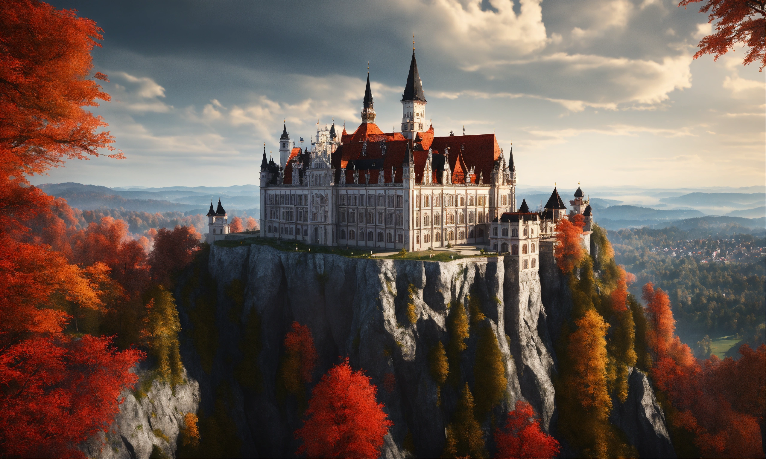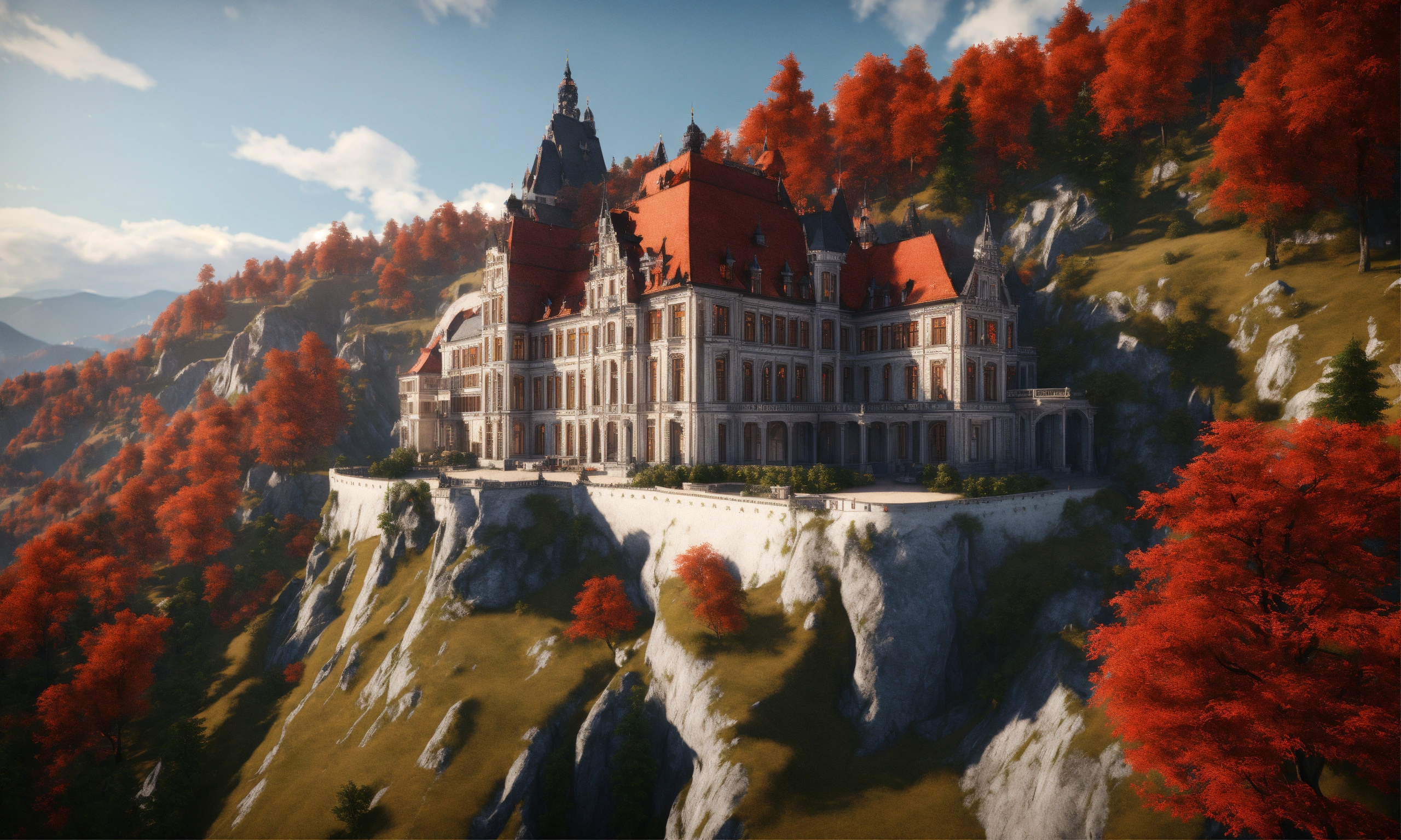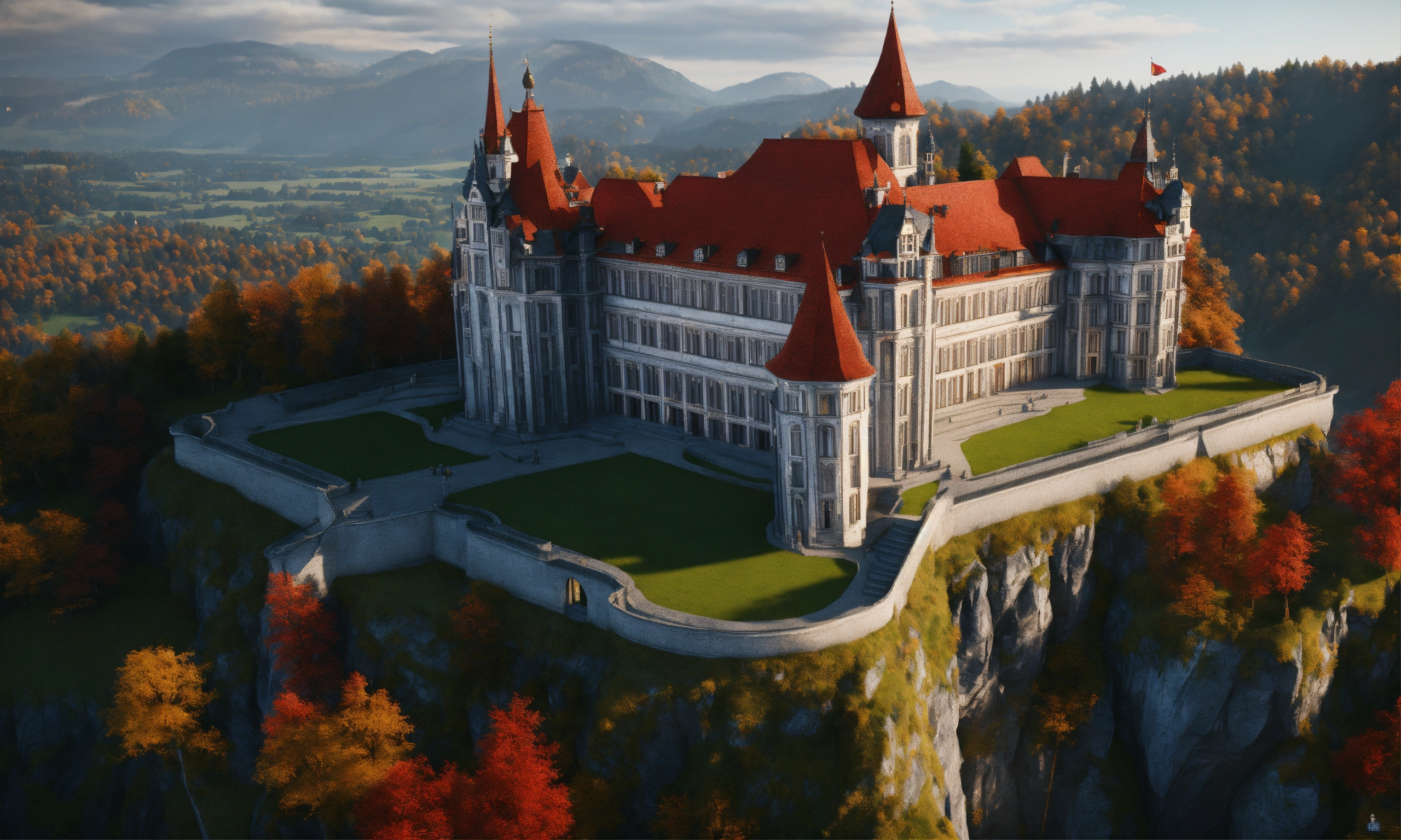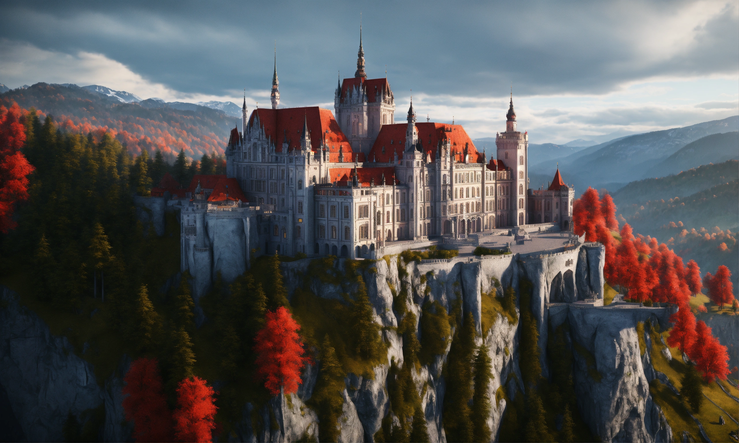 Full image of a massive silver and black royal palace with a red roof on a cliff overlooking bavaria, german architecture, highly detailed, unreal engine, 8d