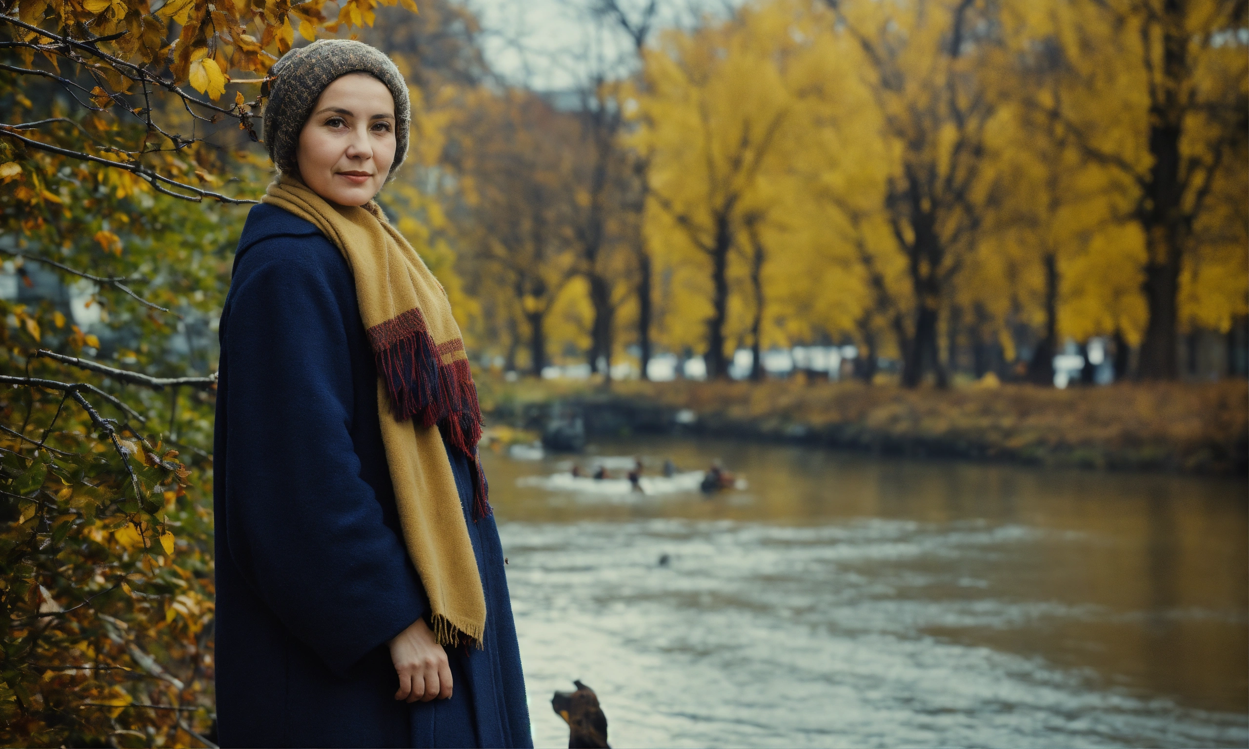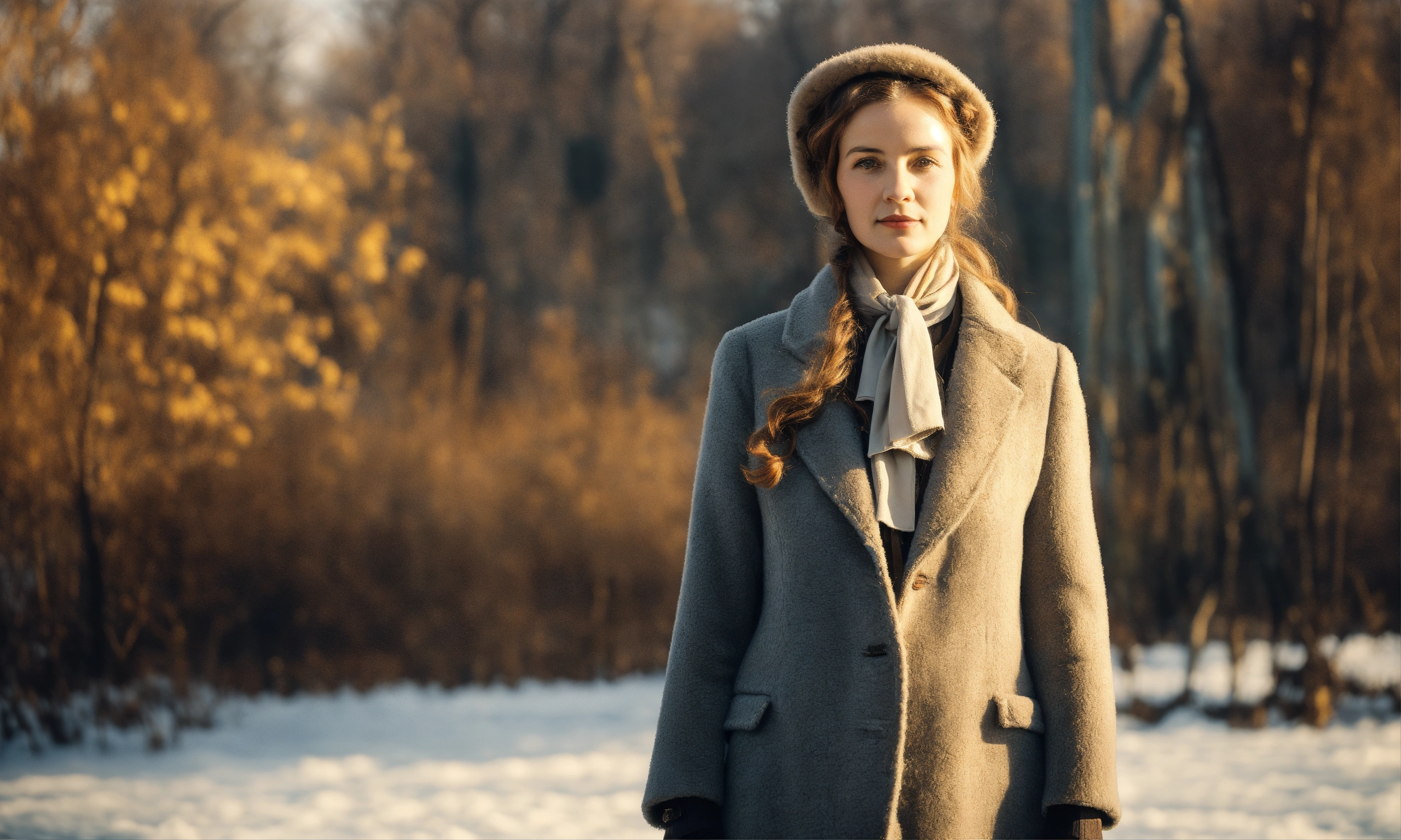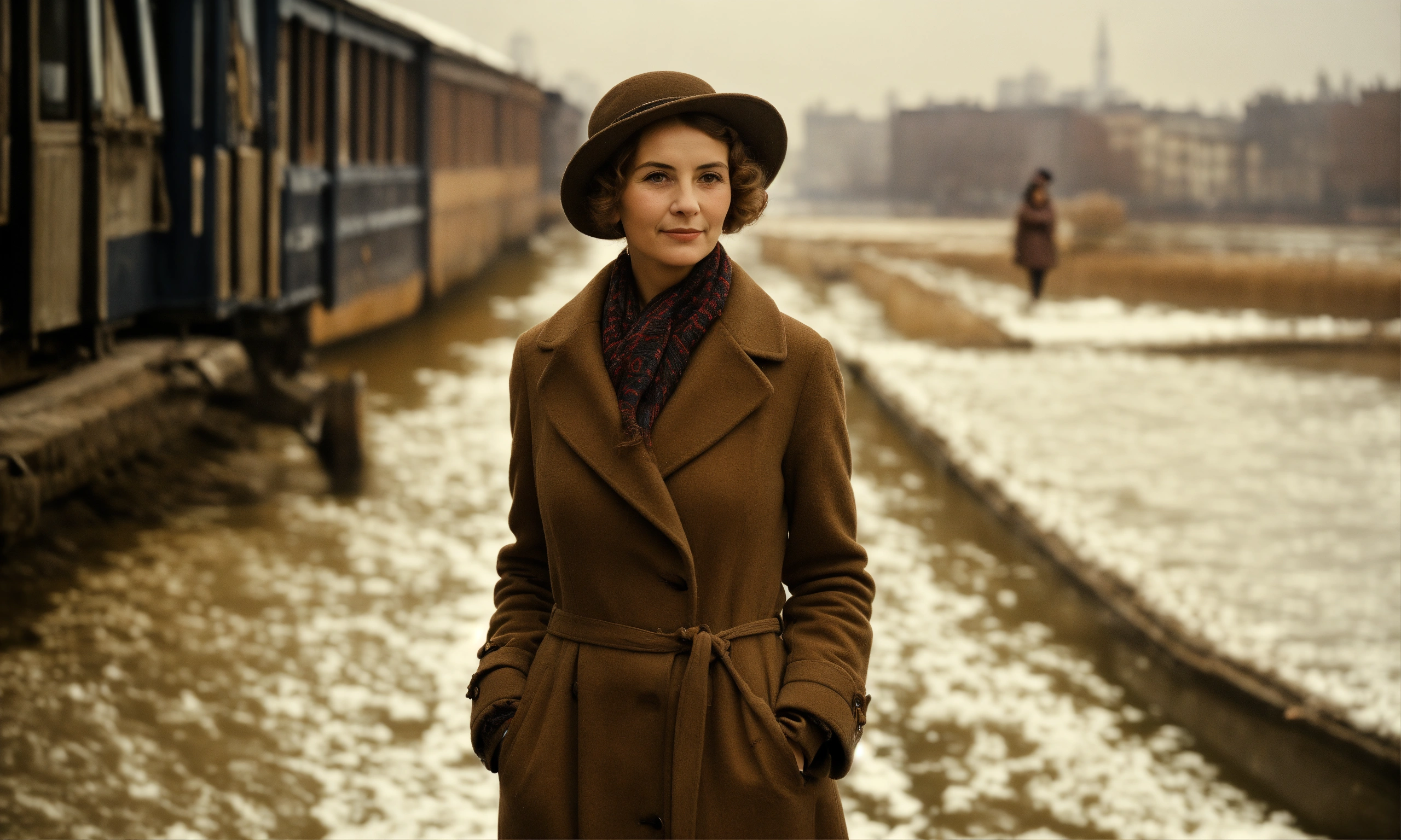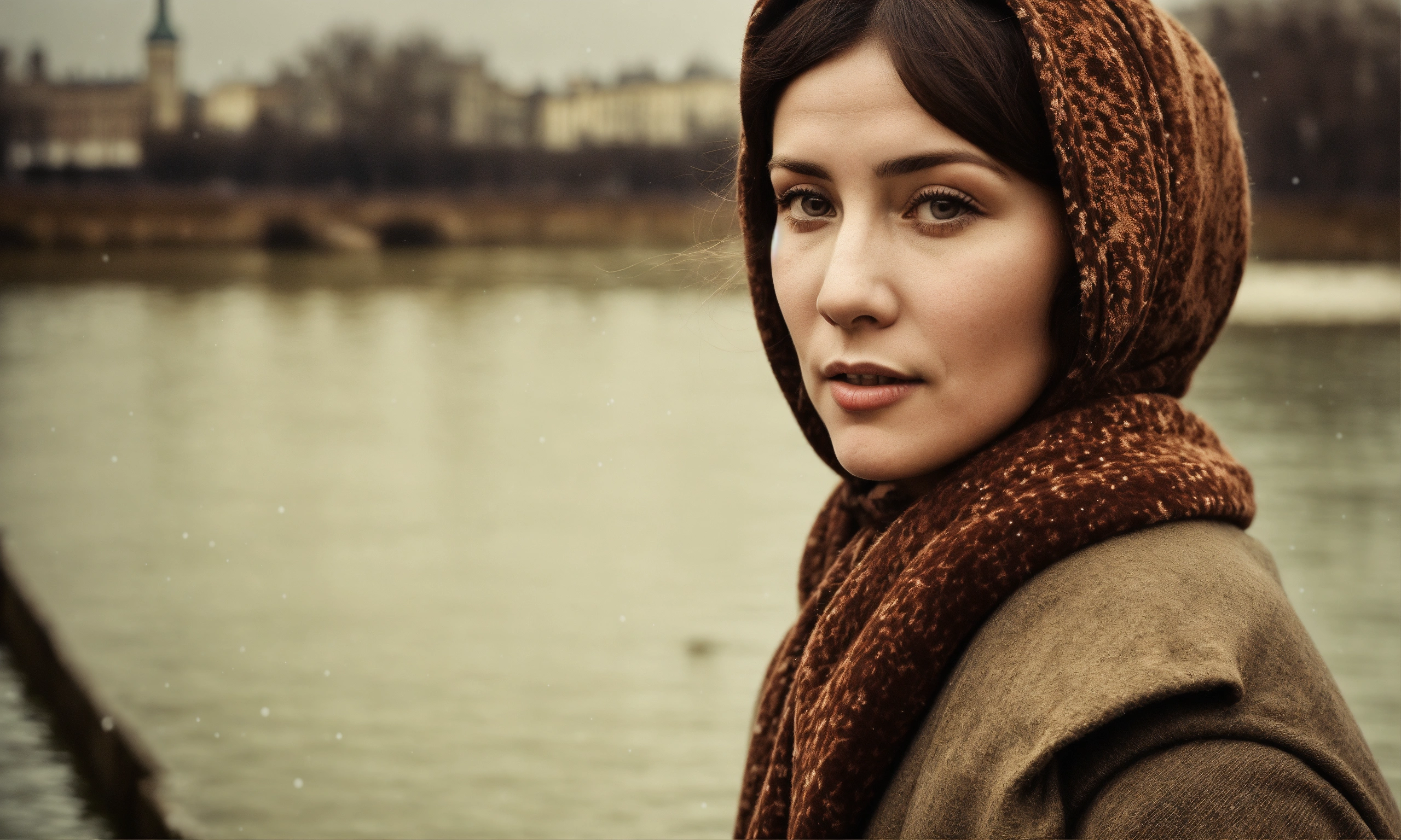 Warszawa 1920-1930, europian poor fit woman age 25, looks at the camera at full height, old-fashioned, the woman exudes kindness, calmness and ambition. she has a beard. warszawa 1920-1930, winter. retro style full haight. white skin, in a river.