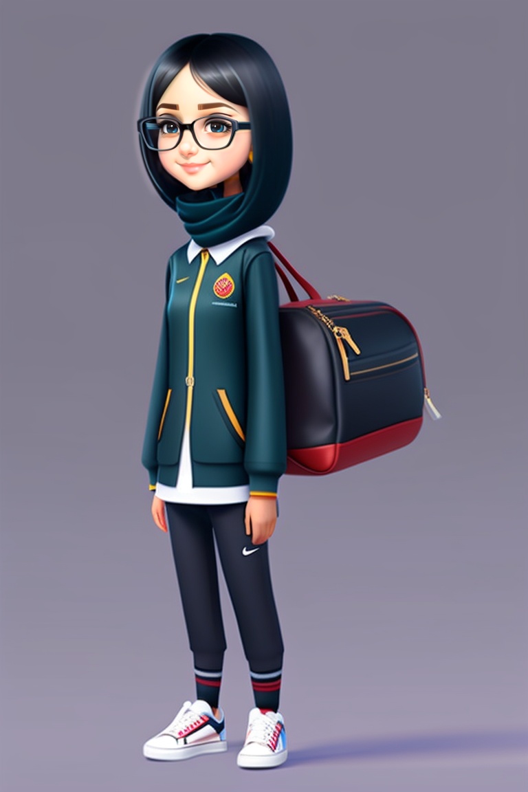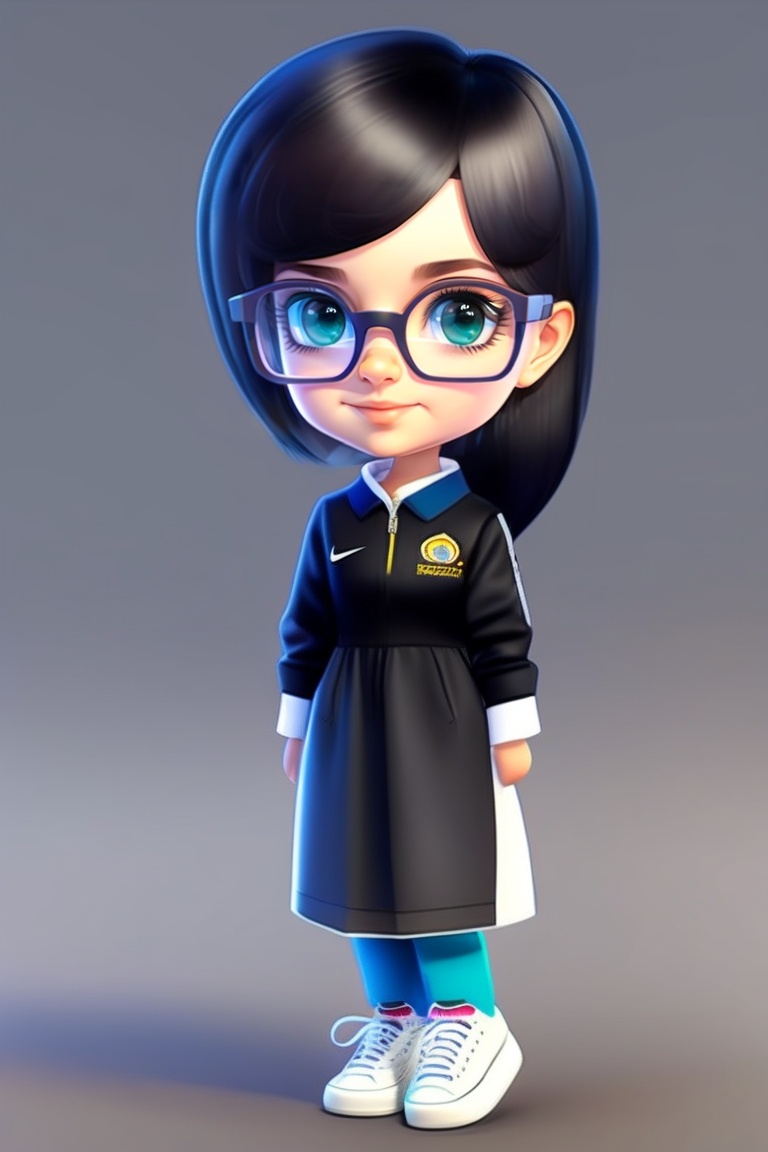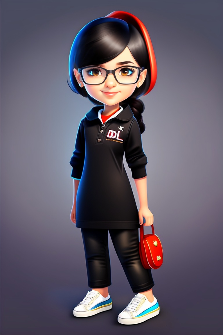 Full body 2d round eyeglasses cartoon girl with ponytail black hair, full body, realistic, cute, in black shalwar kameez and dupatta and with white sport shoes