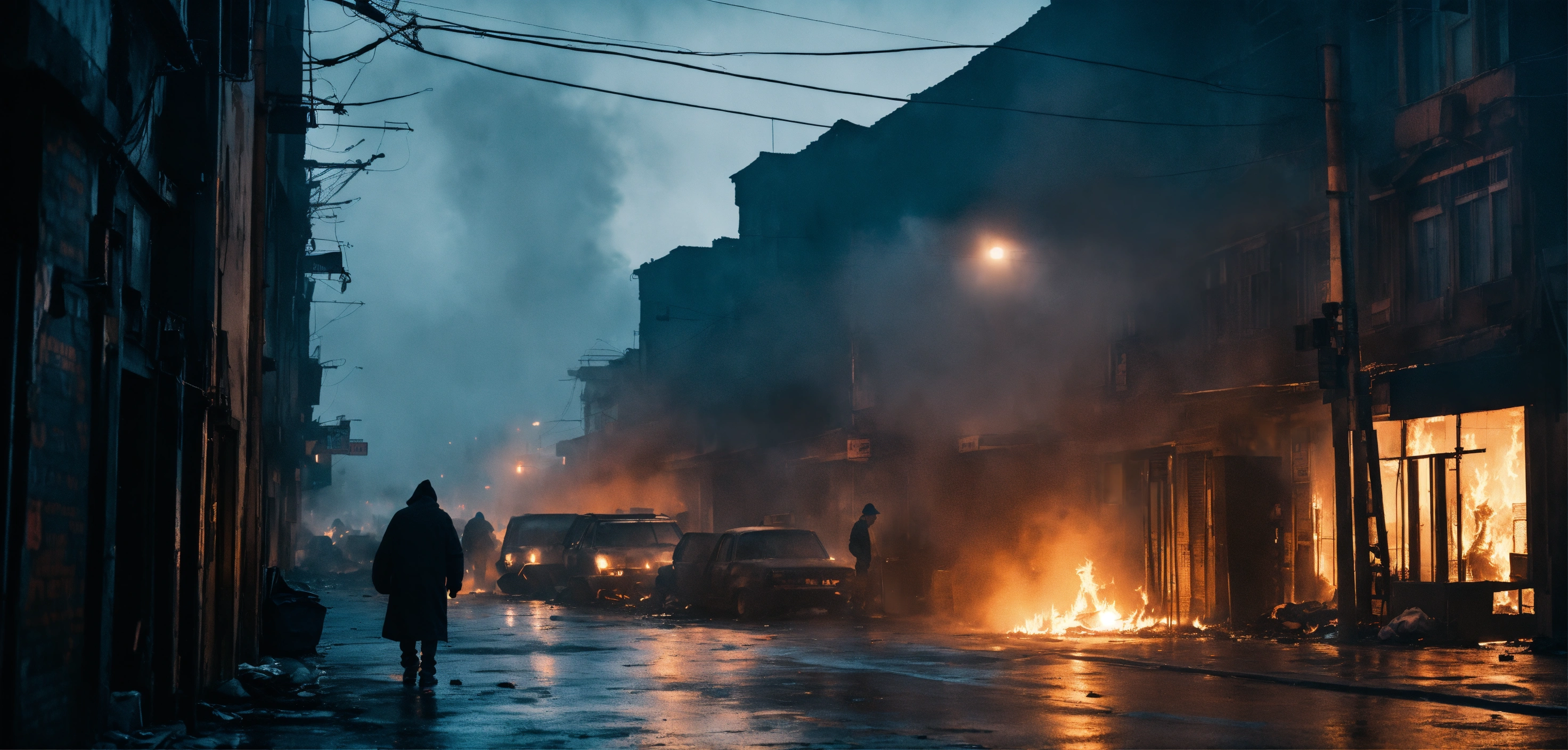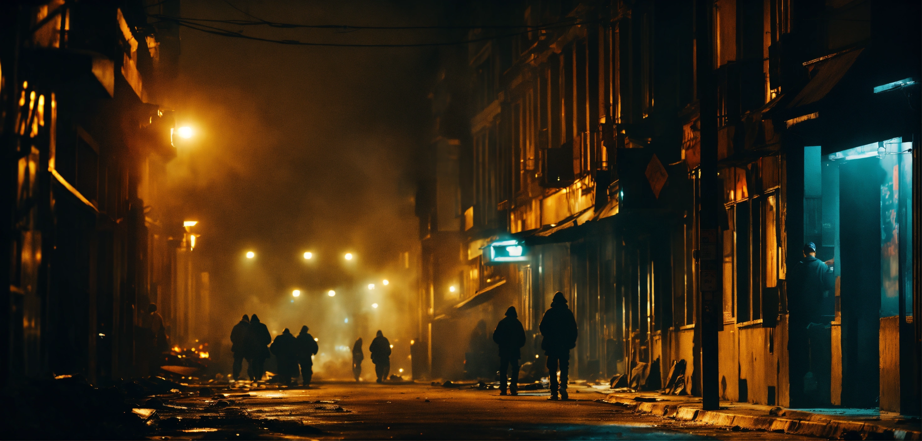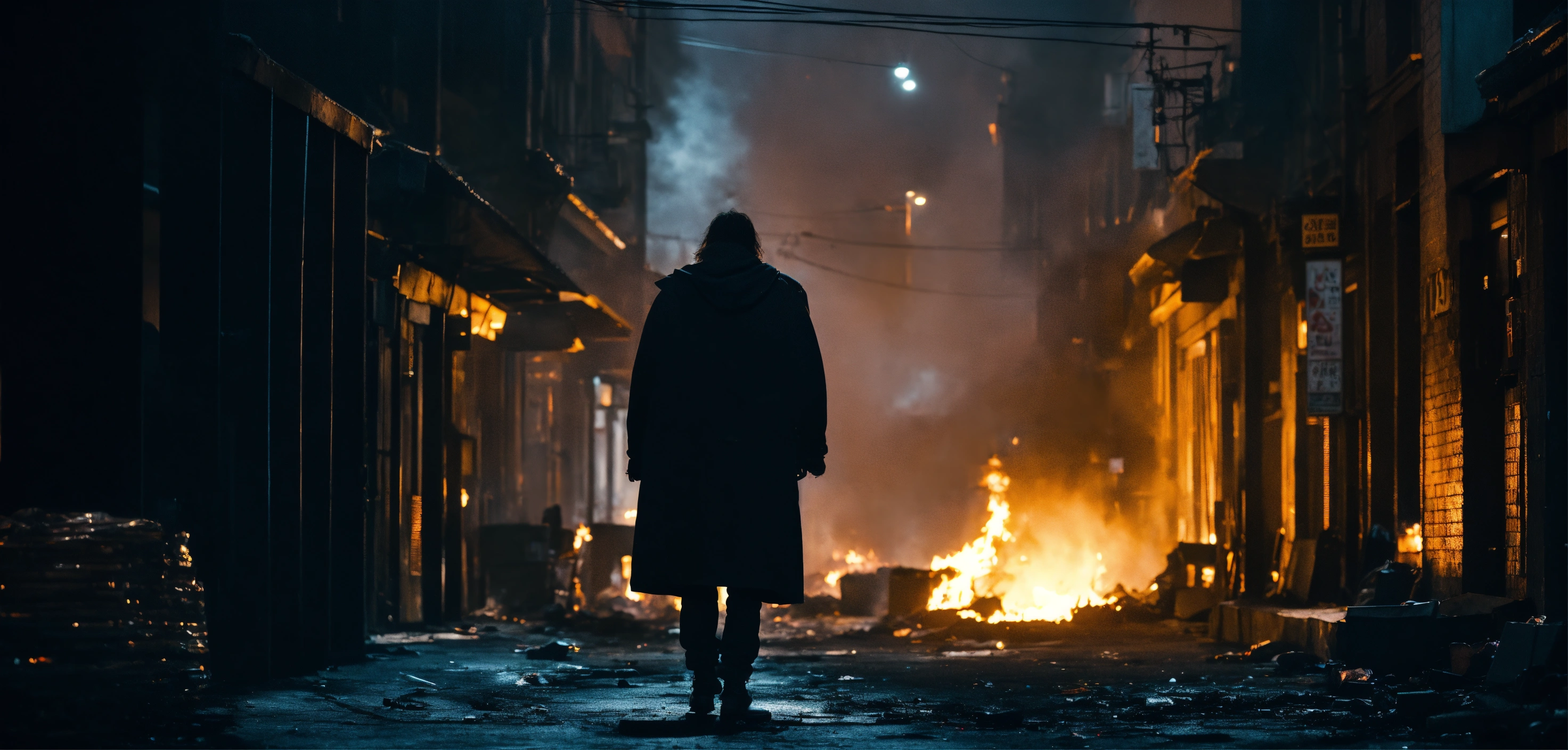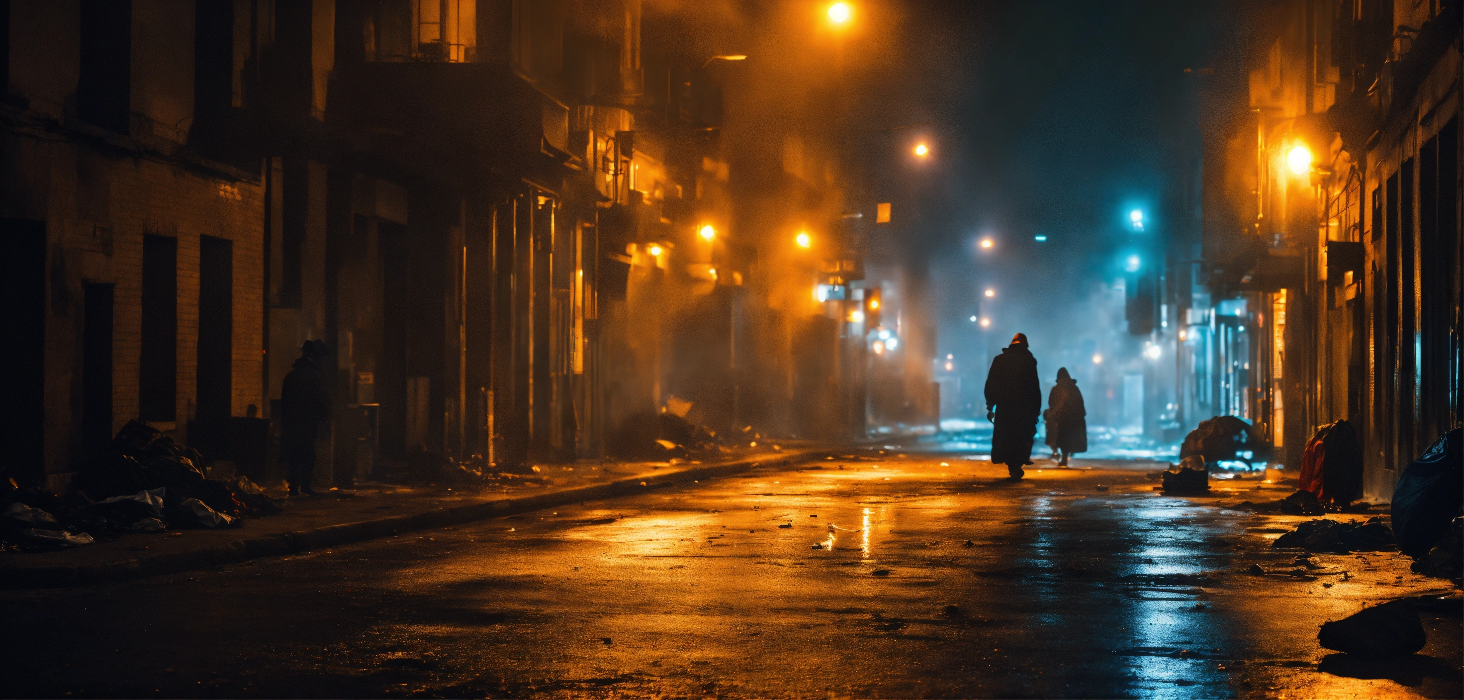Cinematic look, backlit, heavy haze, dark urban dirty city side street by night, burning, homeless people, dim light, underworld movie style