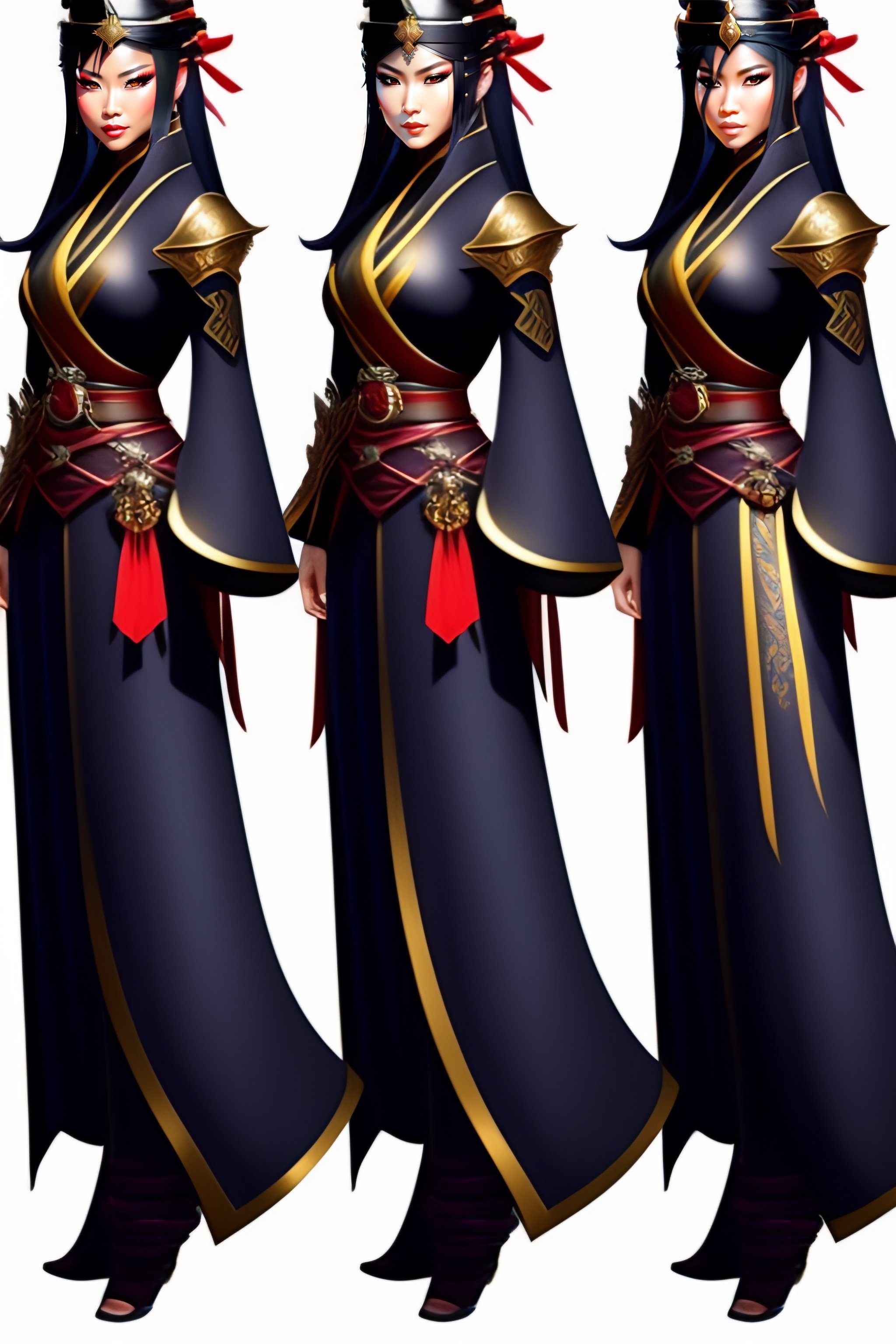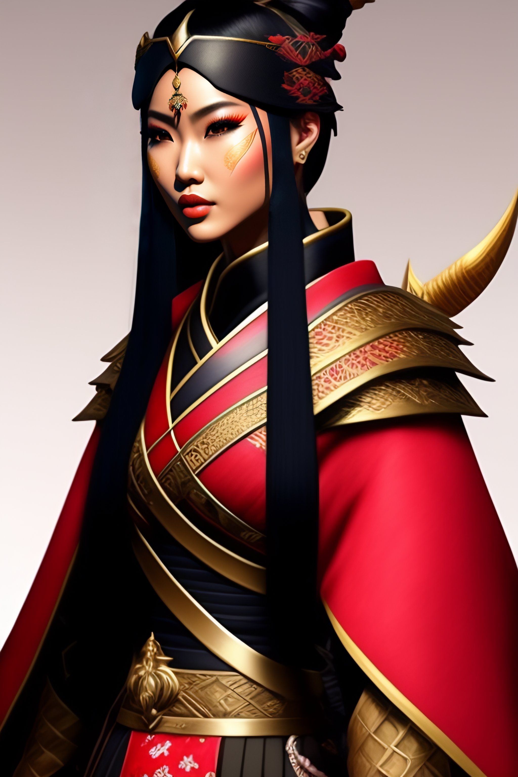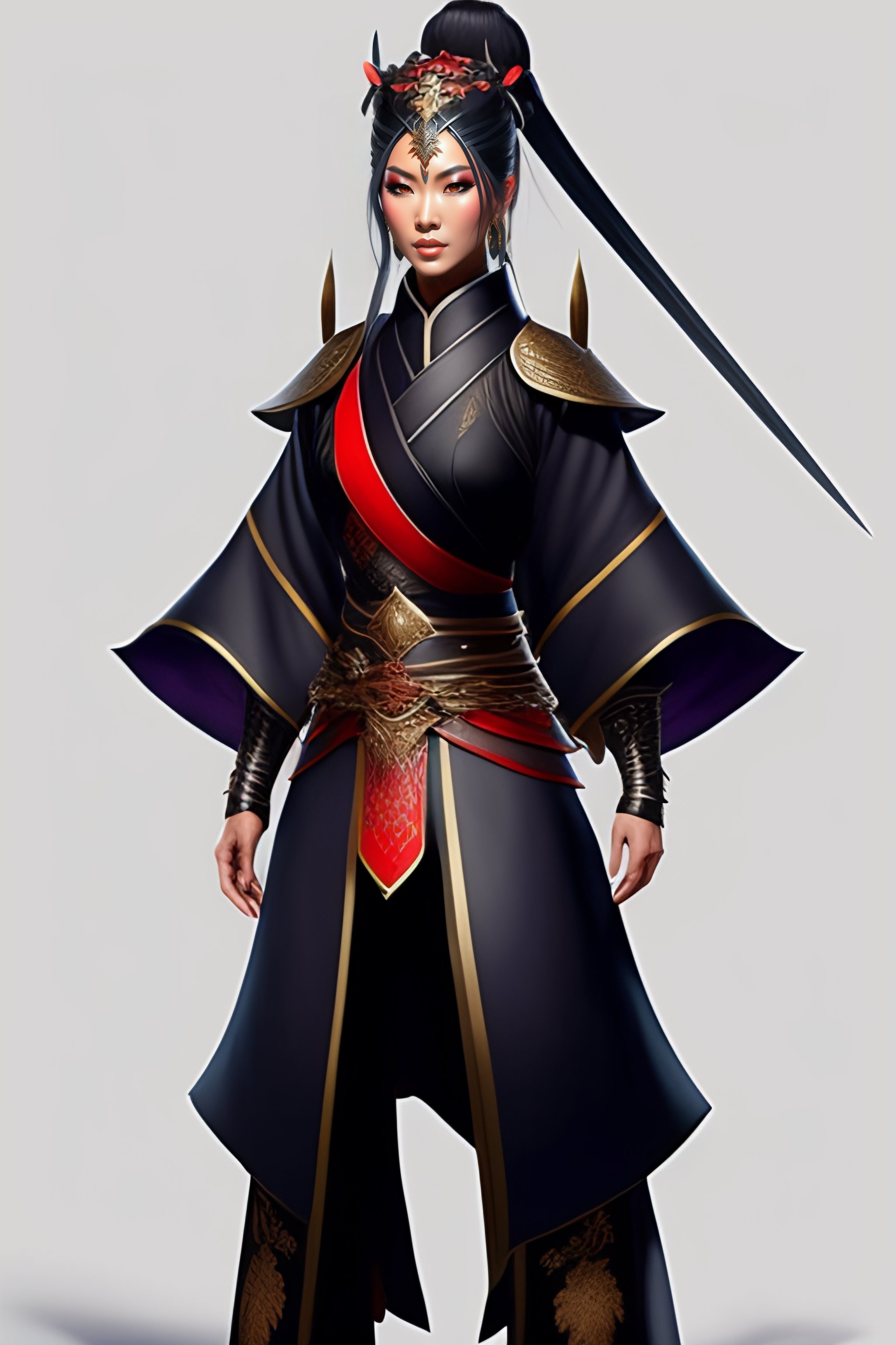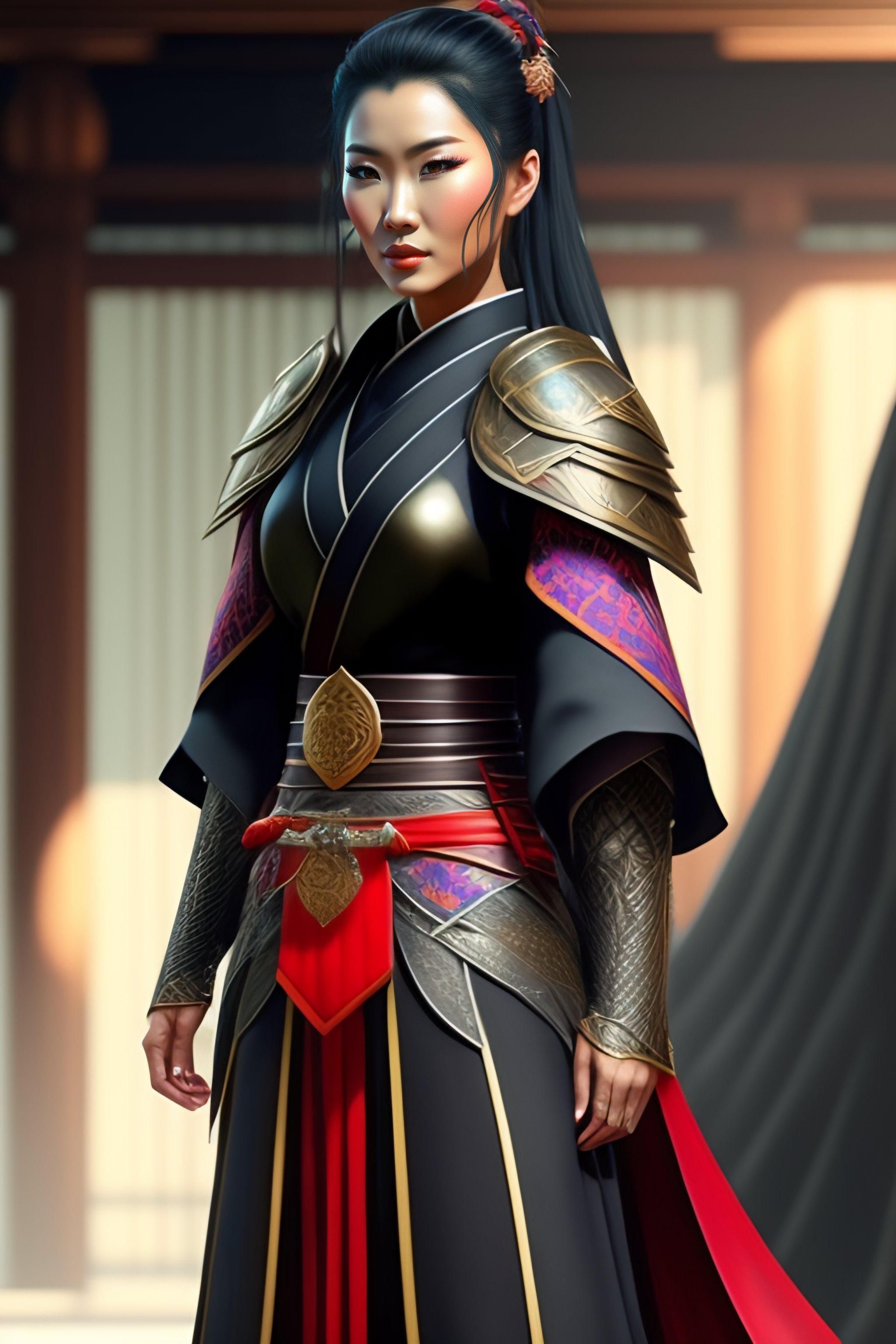 Concept art of a beautiful ninja woman, fantasy, samurai armor, kimono, trousers just below the knee with pleats, a full height, hyper realistic style
