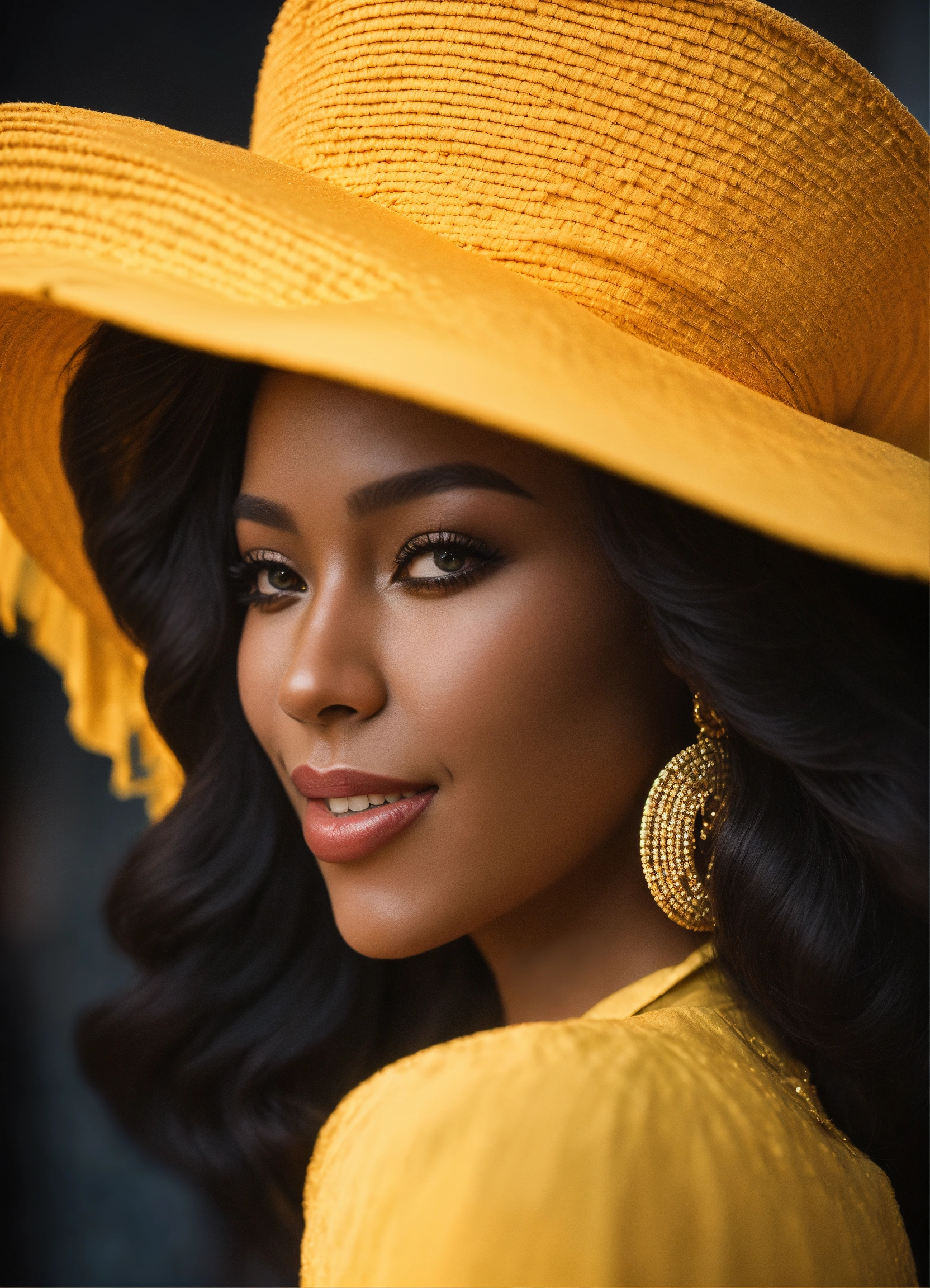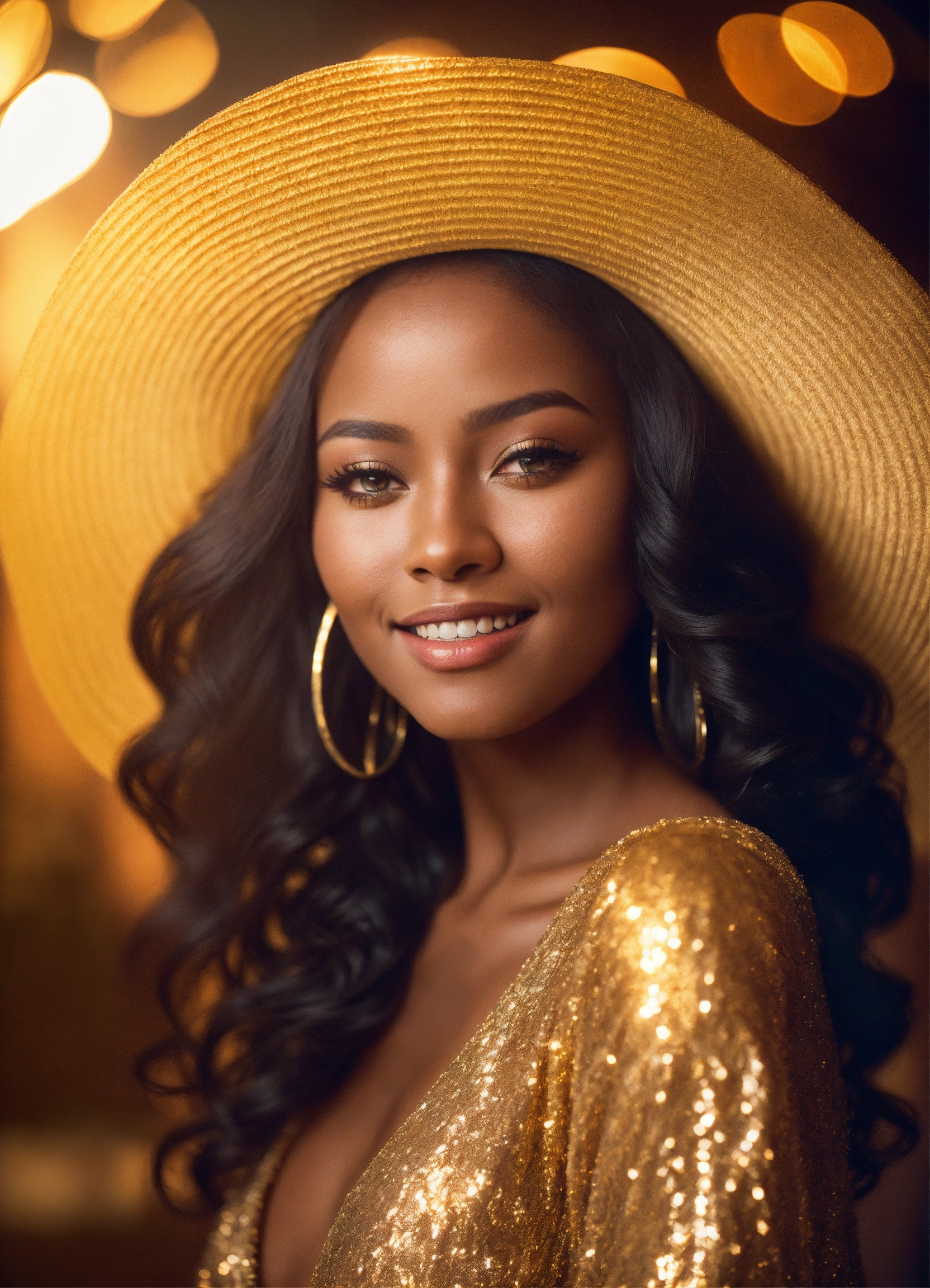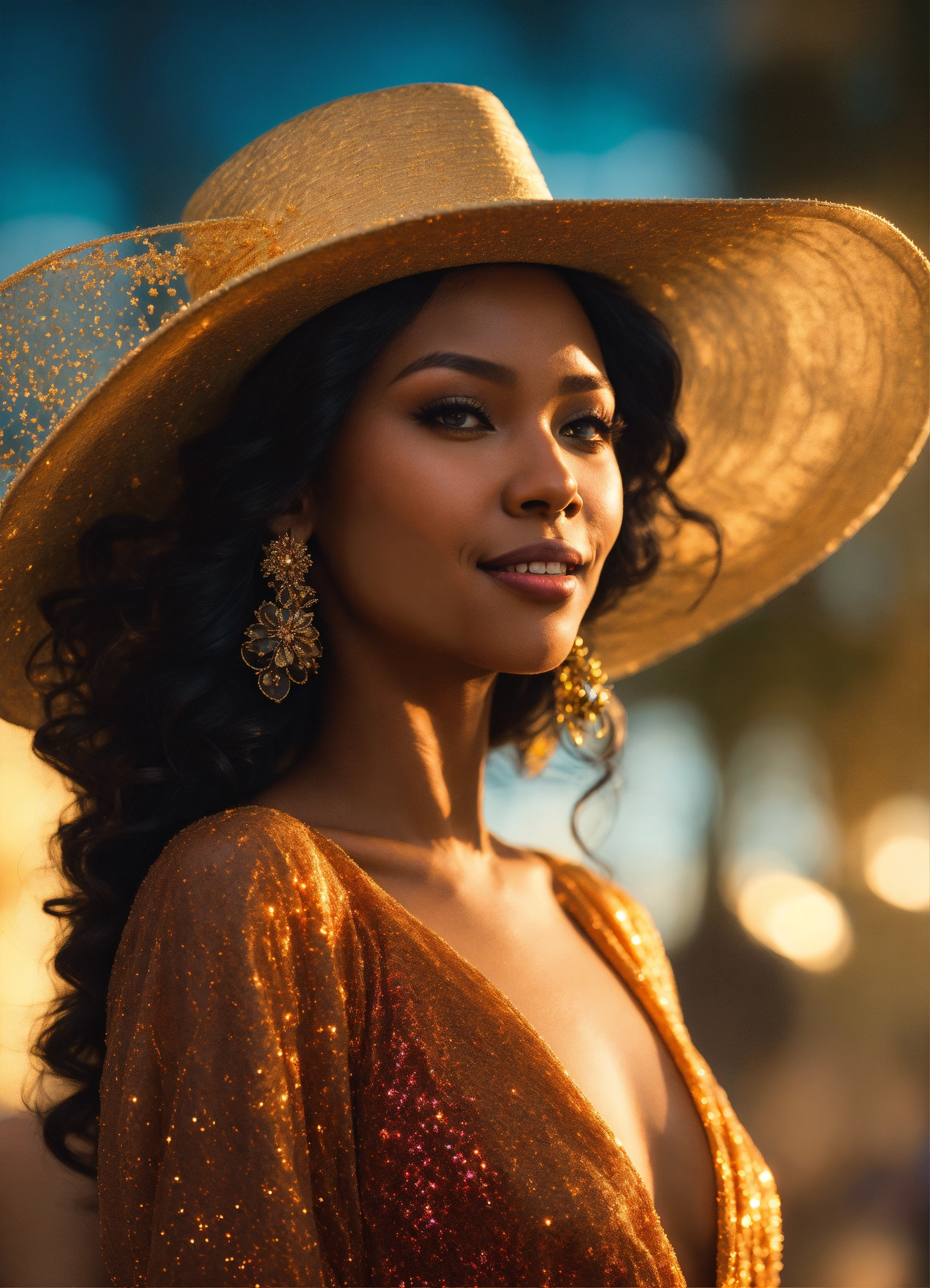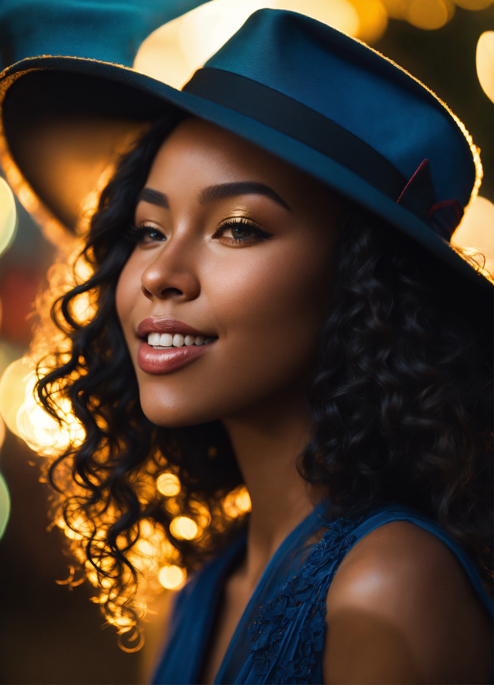 Portrait photograph of a stunning and extraordinary ebony black woman, with a captivating smile, luxurious flowing hair, and an elegant fashionable hat, high resolution, highly detailed, depth of field, professionally color graded, 8k, art by miles aldridge and anne-louis girodet and derek gores and ruth bernhard cinematic lighting, soft and warm, highlighting the woman's natural beauty, backlighting, golden hour close-up, full-frame camera, shallow depth of field, bokeh trending on instagram, trending on artstation, professional photograph