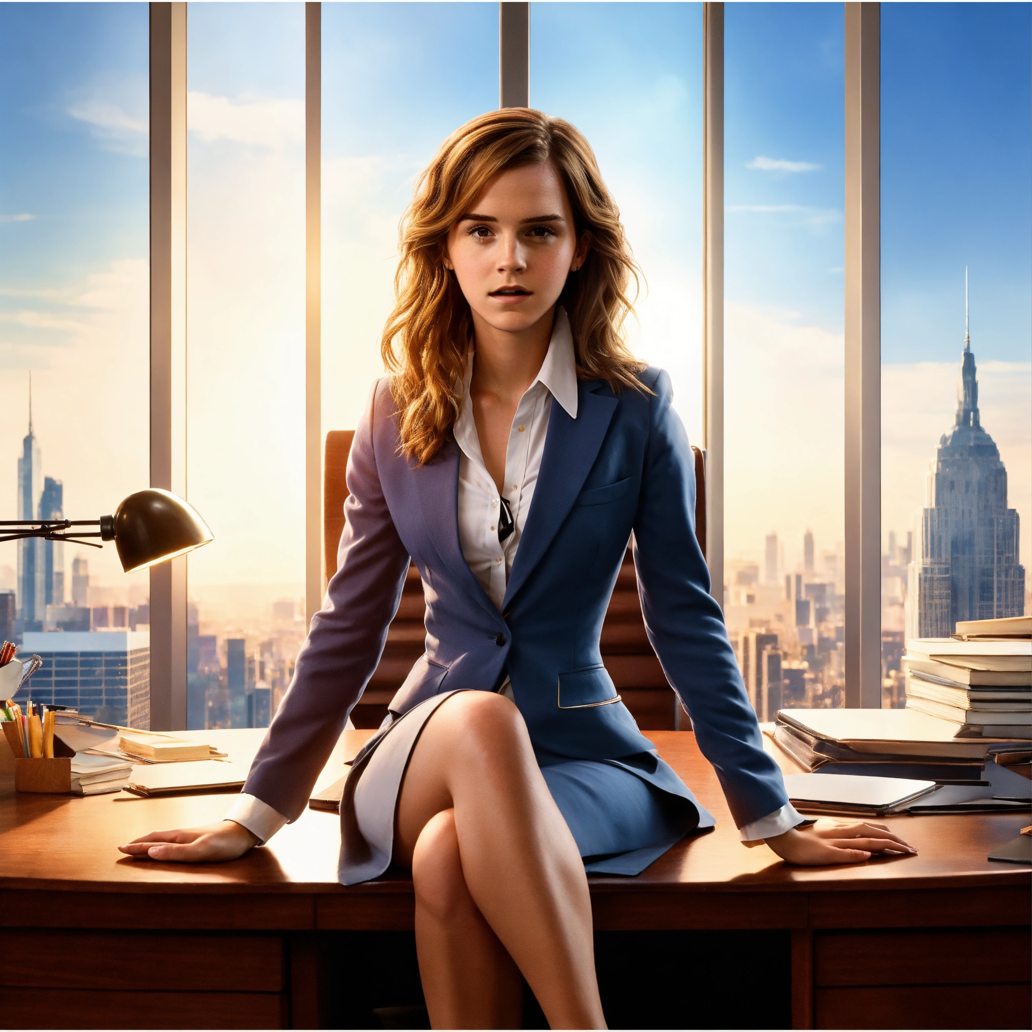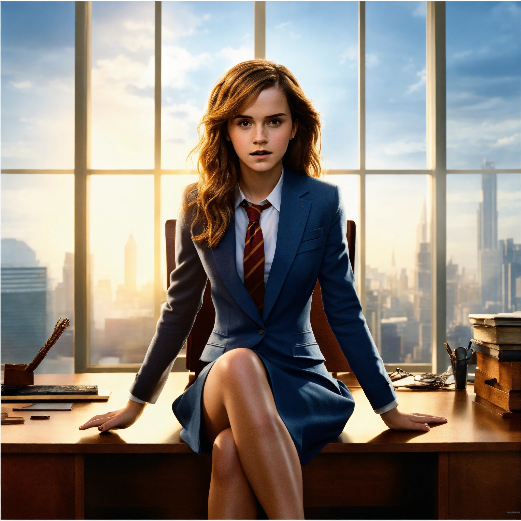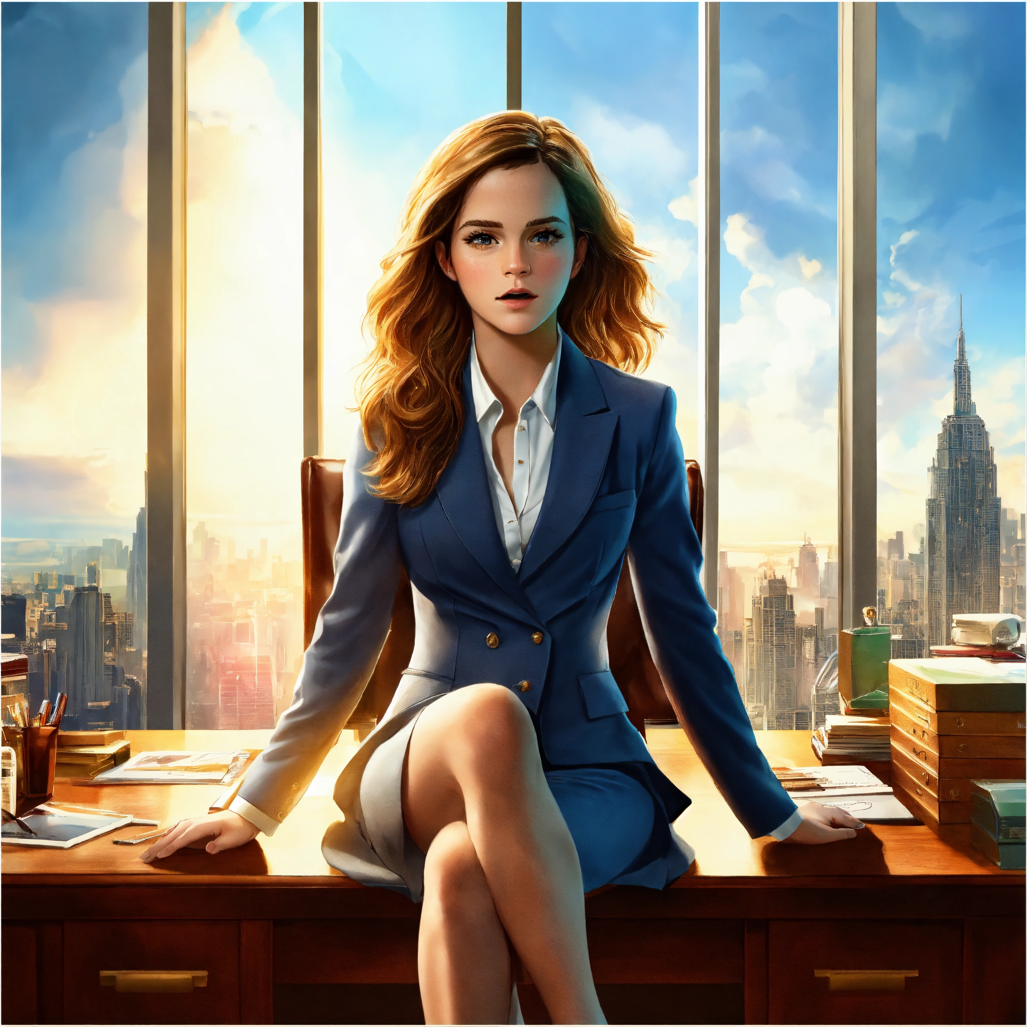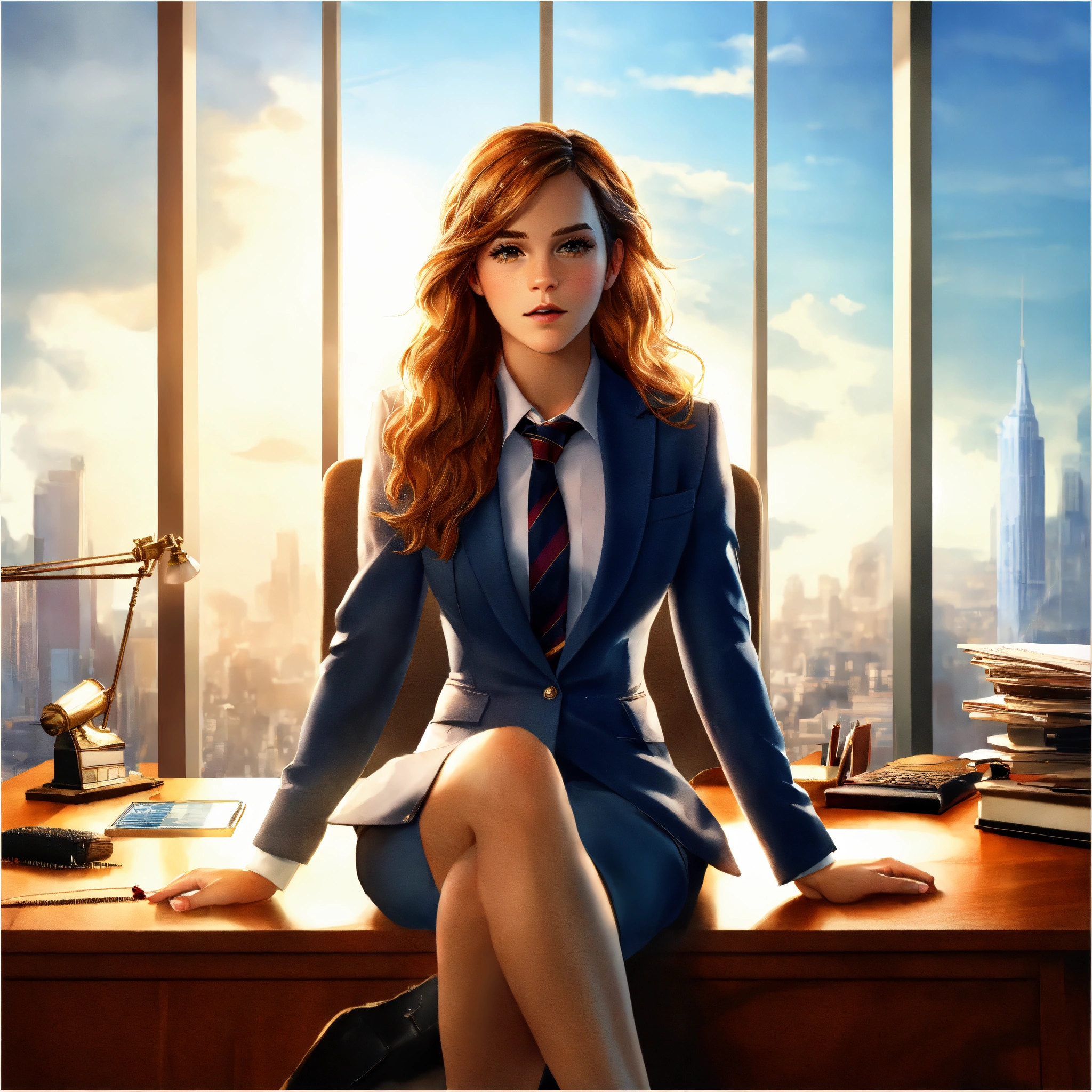 Masterpiece, highest quality, emma watson as hermione granger in a business dress sitting on a mahogany desk in the middle of a modern office. 8k resolution. digital art, high quality, realistic.