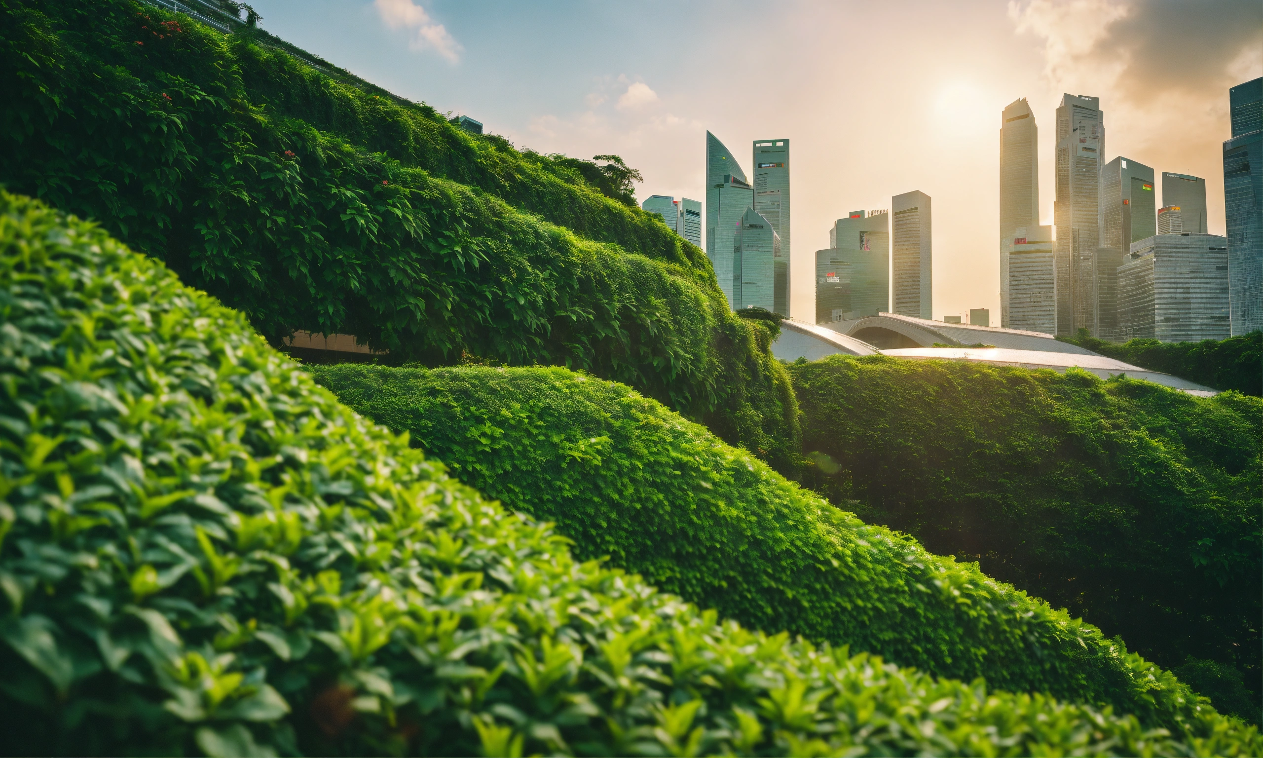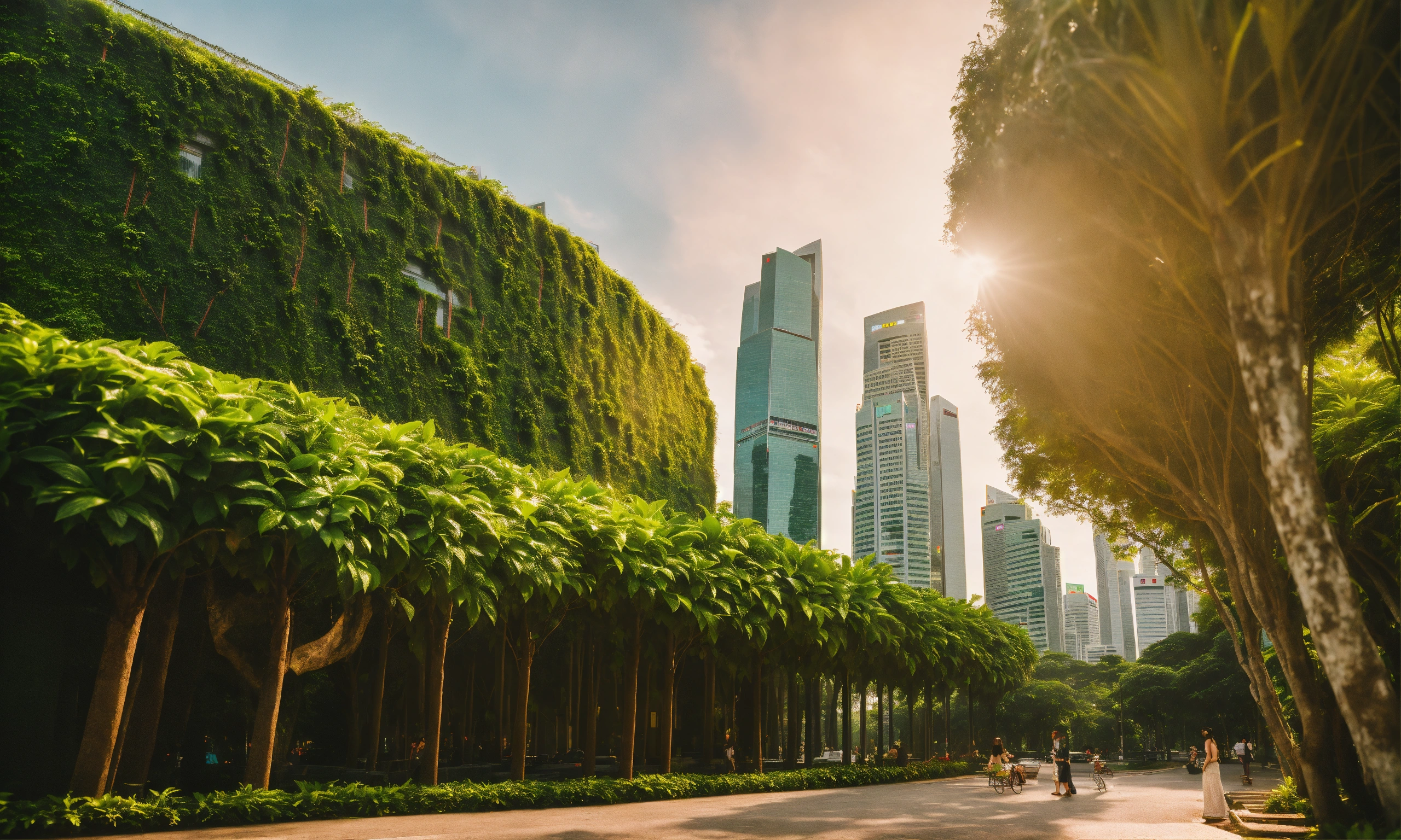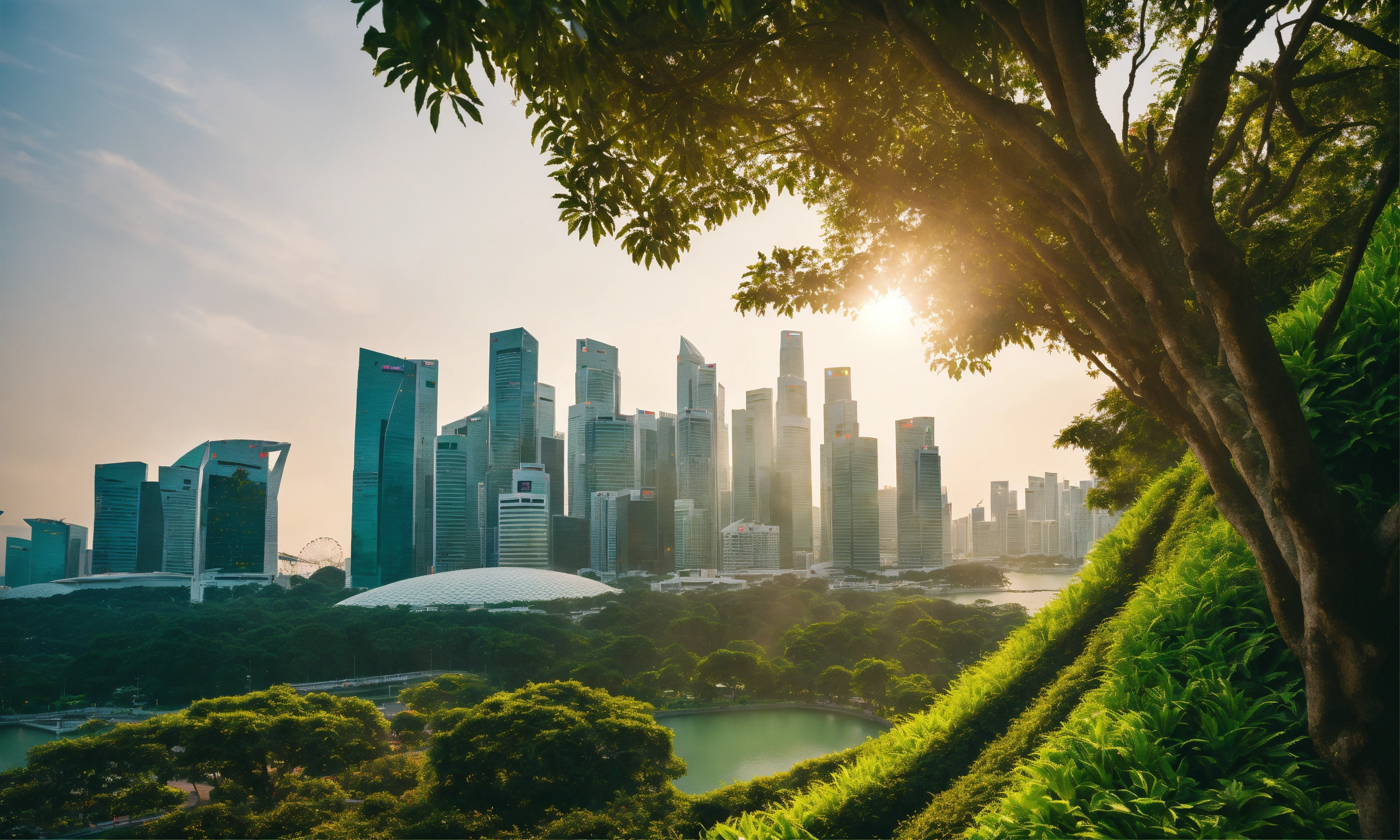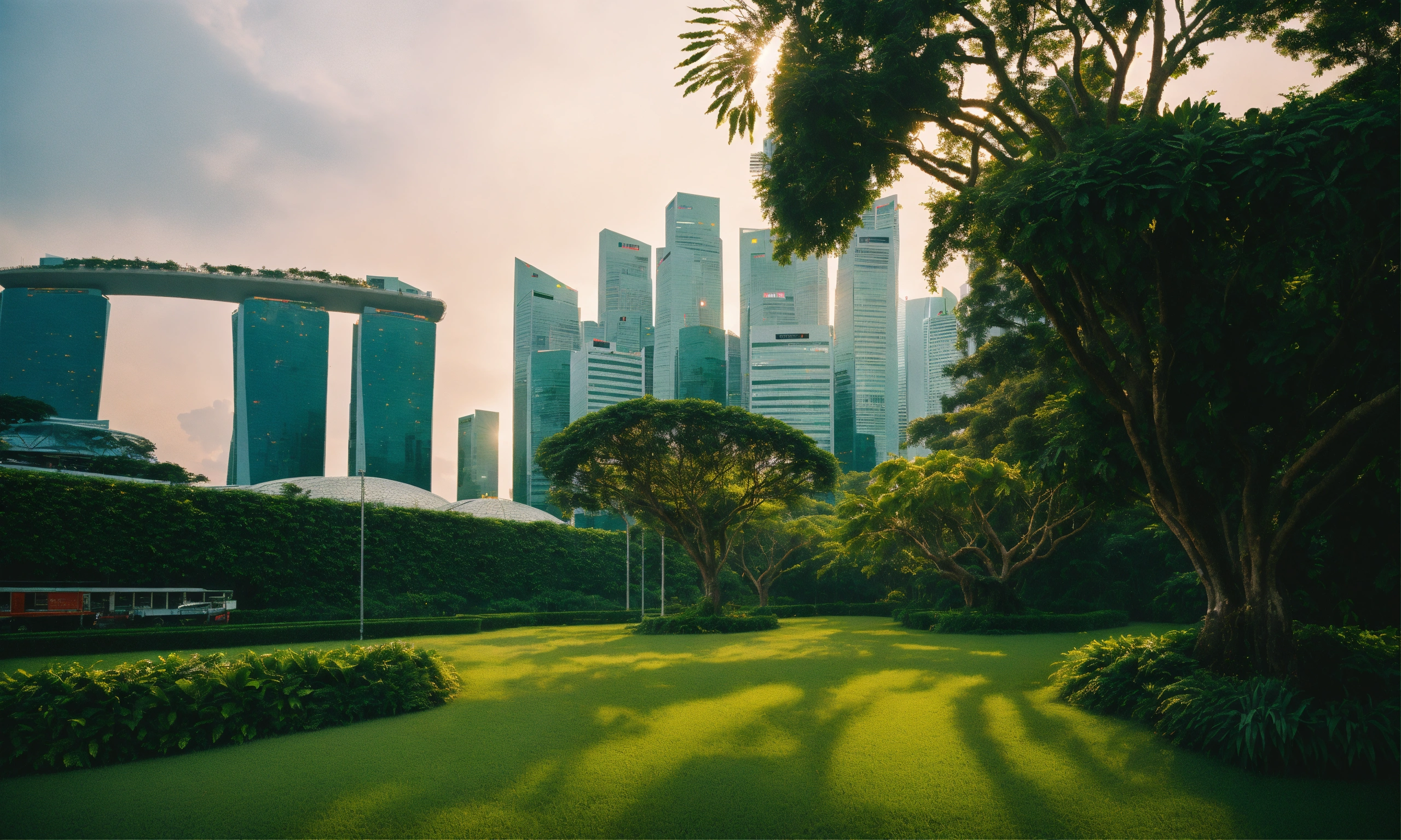 Morning sun, ultra-realistic, cinematic quality, wide-angle shot capturing singapore's cityscape, skyscrapers with greenwalls, super trees, 50mm camera for sharpness and clarity, portra 400 film to capture the rich contrasts and warm tones.