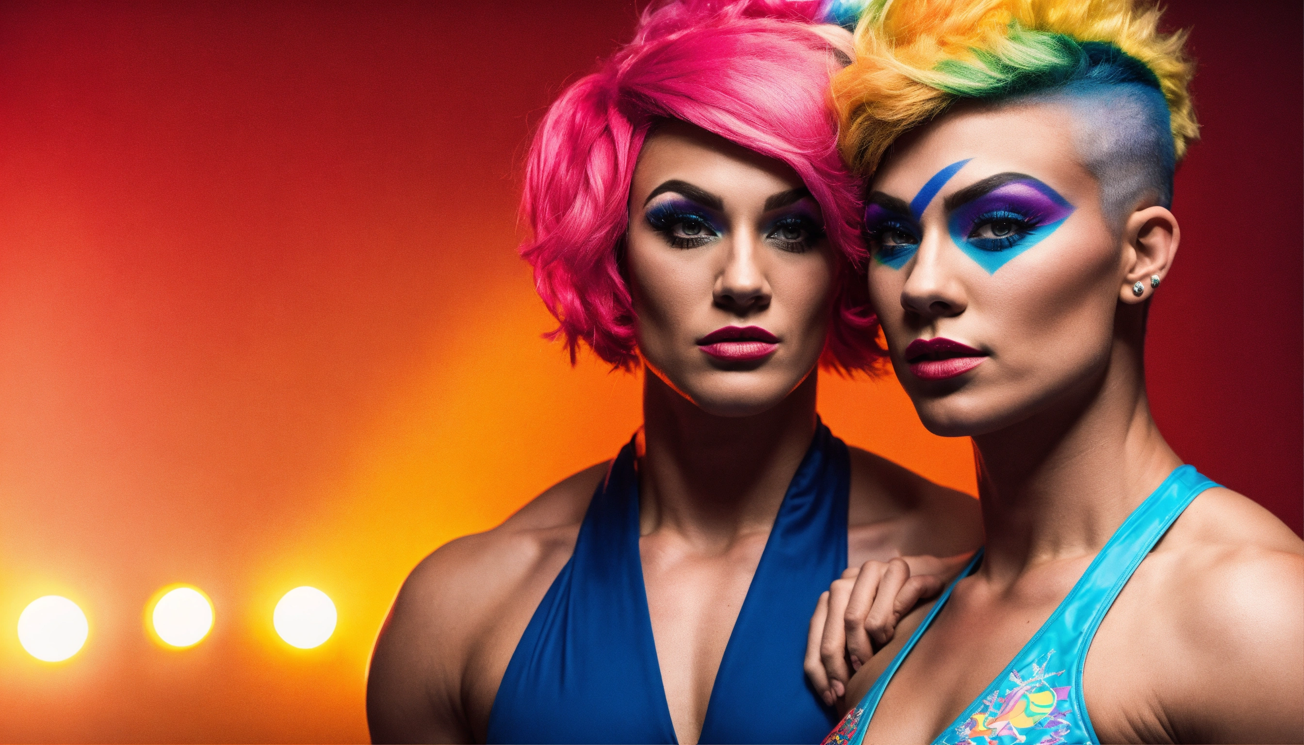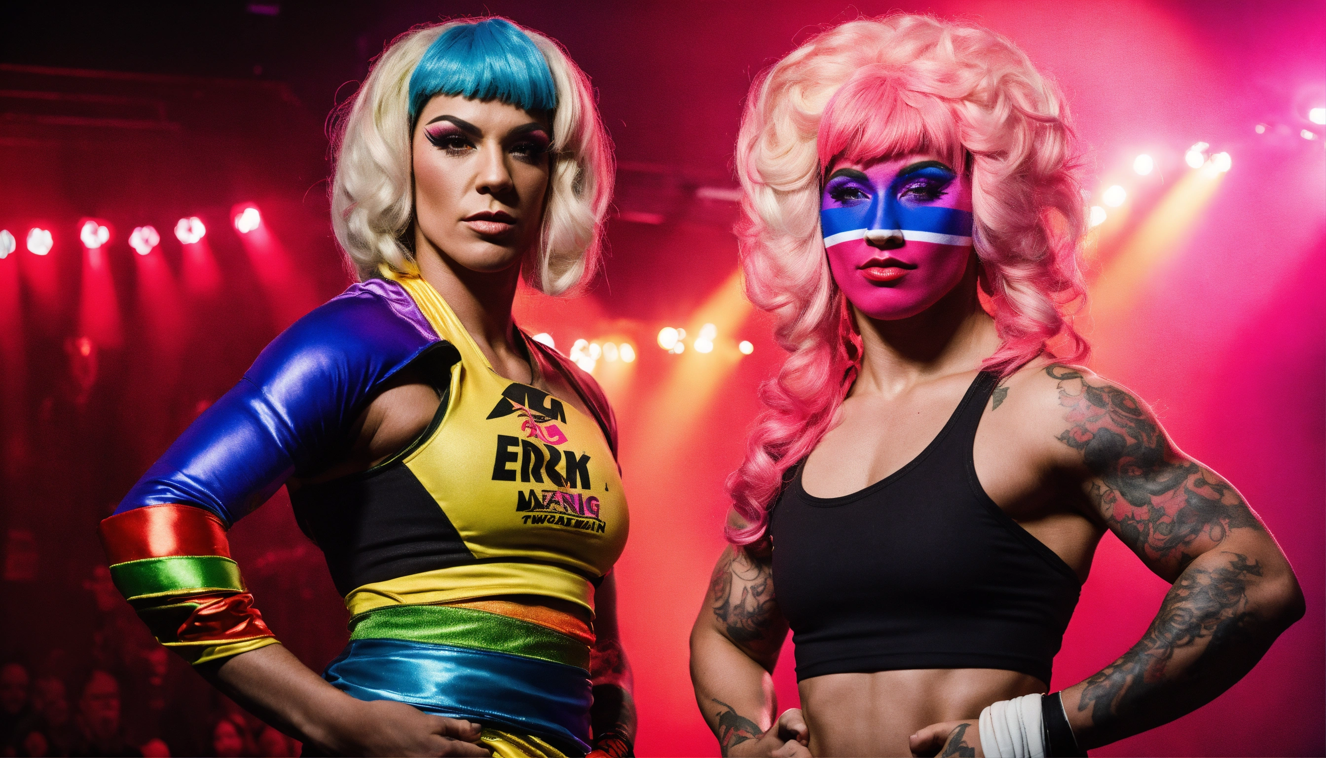 Create a photo of two lgbtq mma fighters dressed in drag