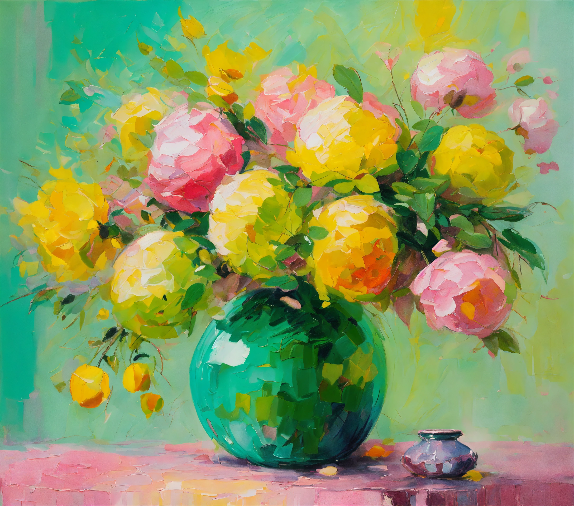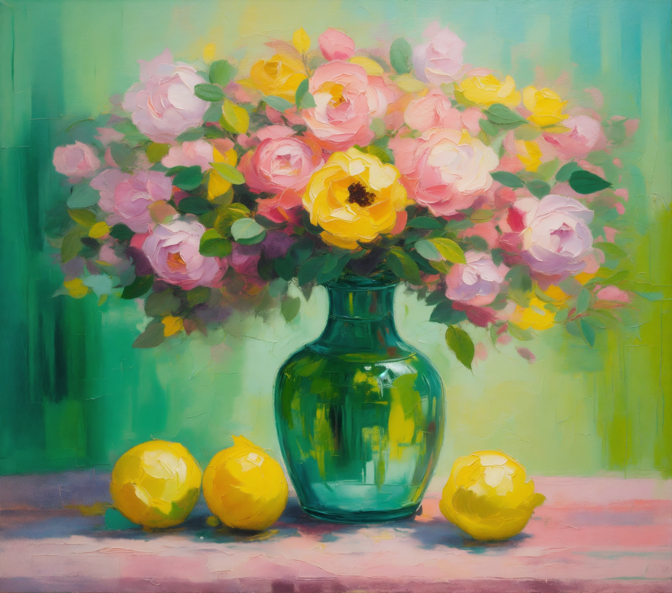 Abstract impressionistic oil painting of beautiful still life, pastel background, green, yellow, pink