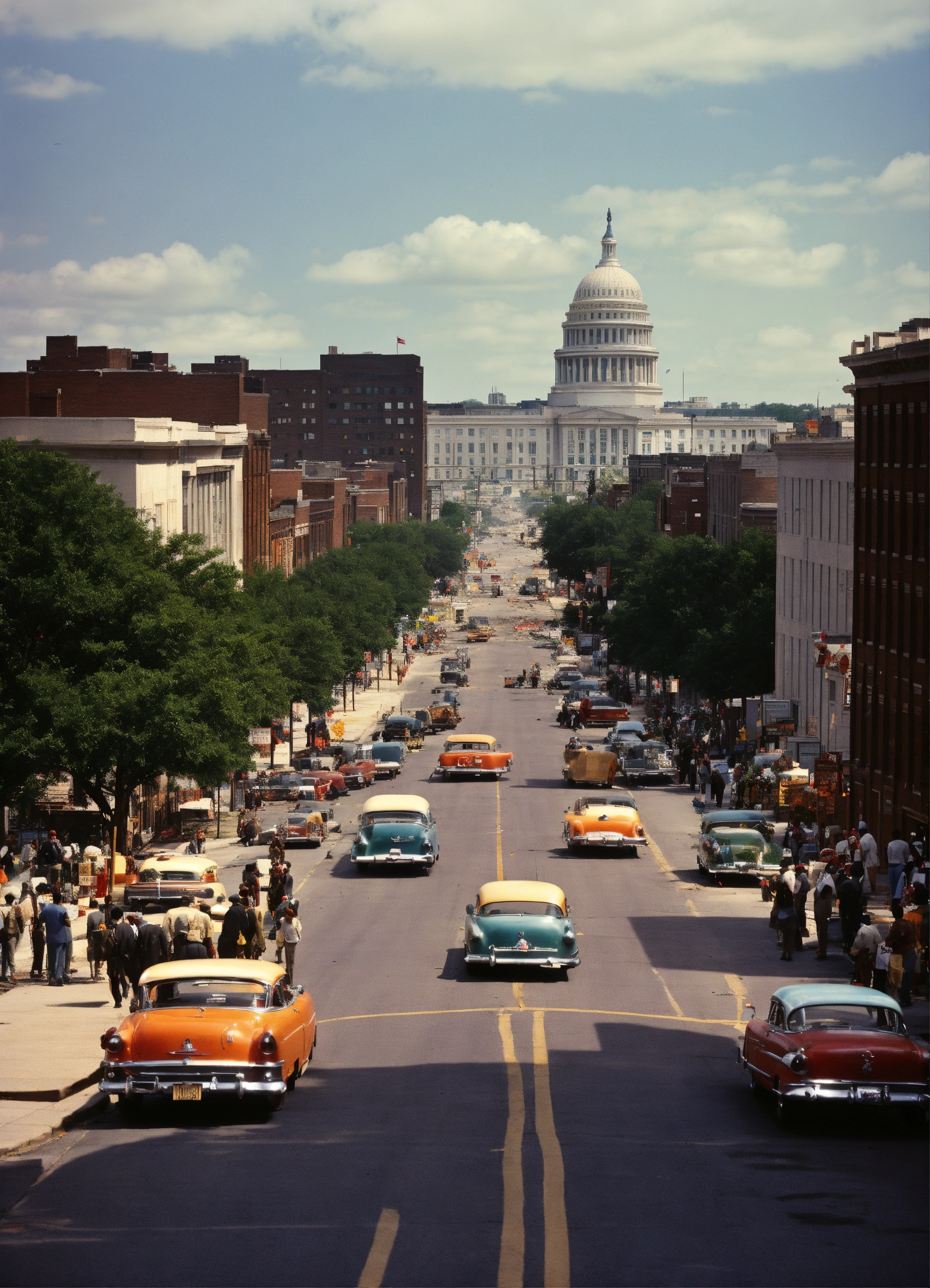 Washington dc street view 4x realistic shot, 1950s civil rights movement and urban renewal two big things happening at this time were (the civil rights movement) and (urban renewal) in the 1950s post-war era, it was peaceful and prosperous but a nation without any enemy it breads insurrection and so this marked the beginning of the civil rights movement. because the movement helped lead to social changes in the city. the urban renewal projects aimed to modernize the city, resulting in the demolition of some historic neighborhoods. (mainly black neighborhoods)