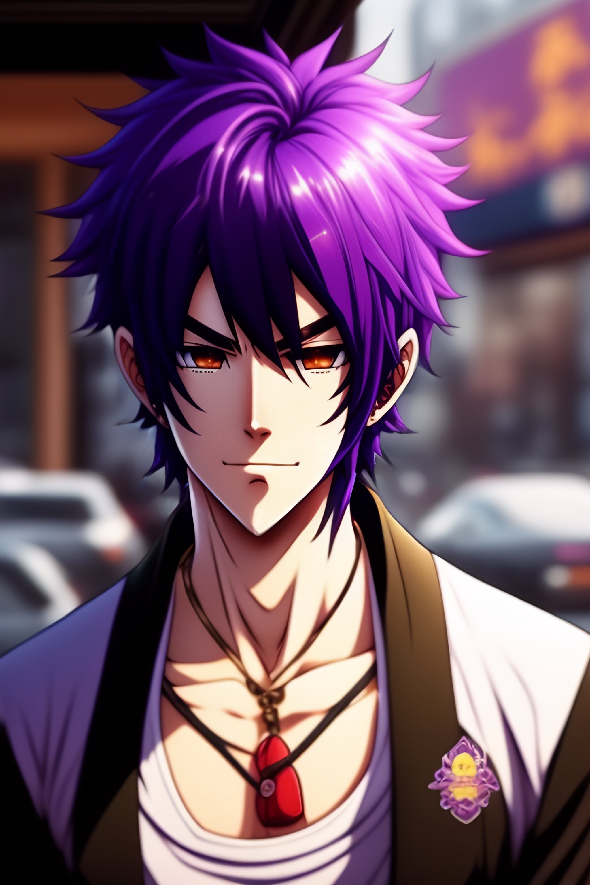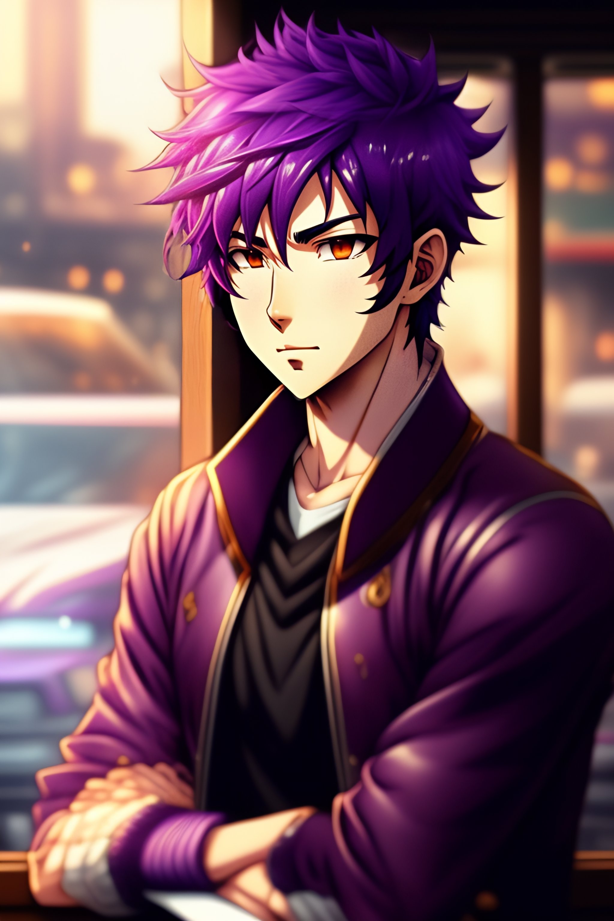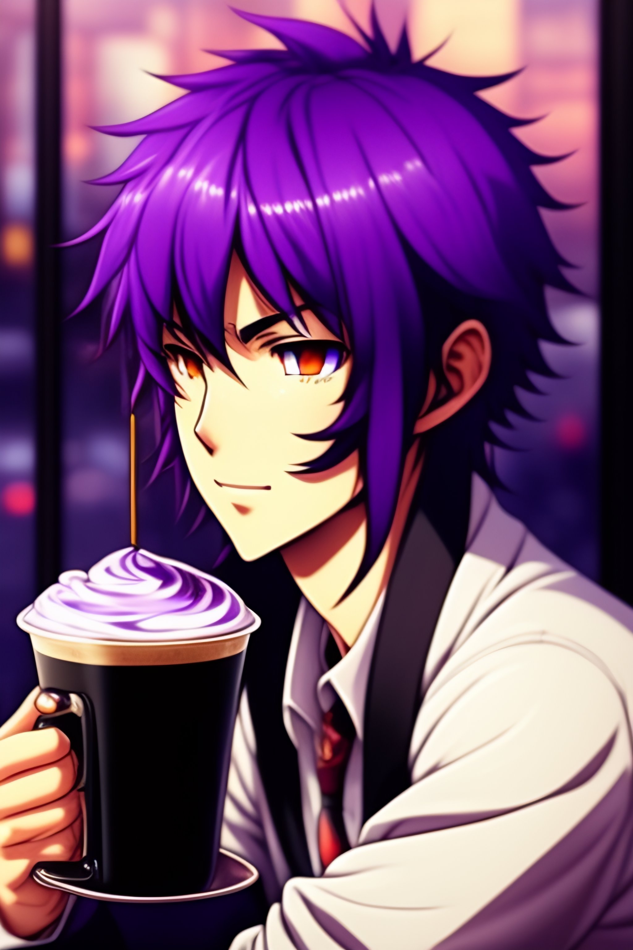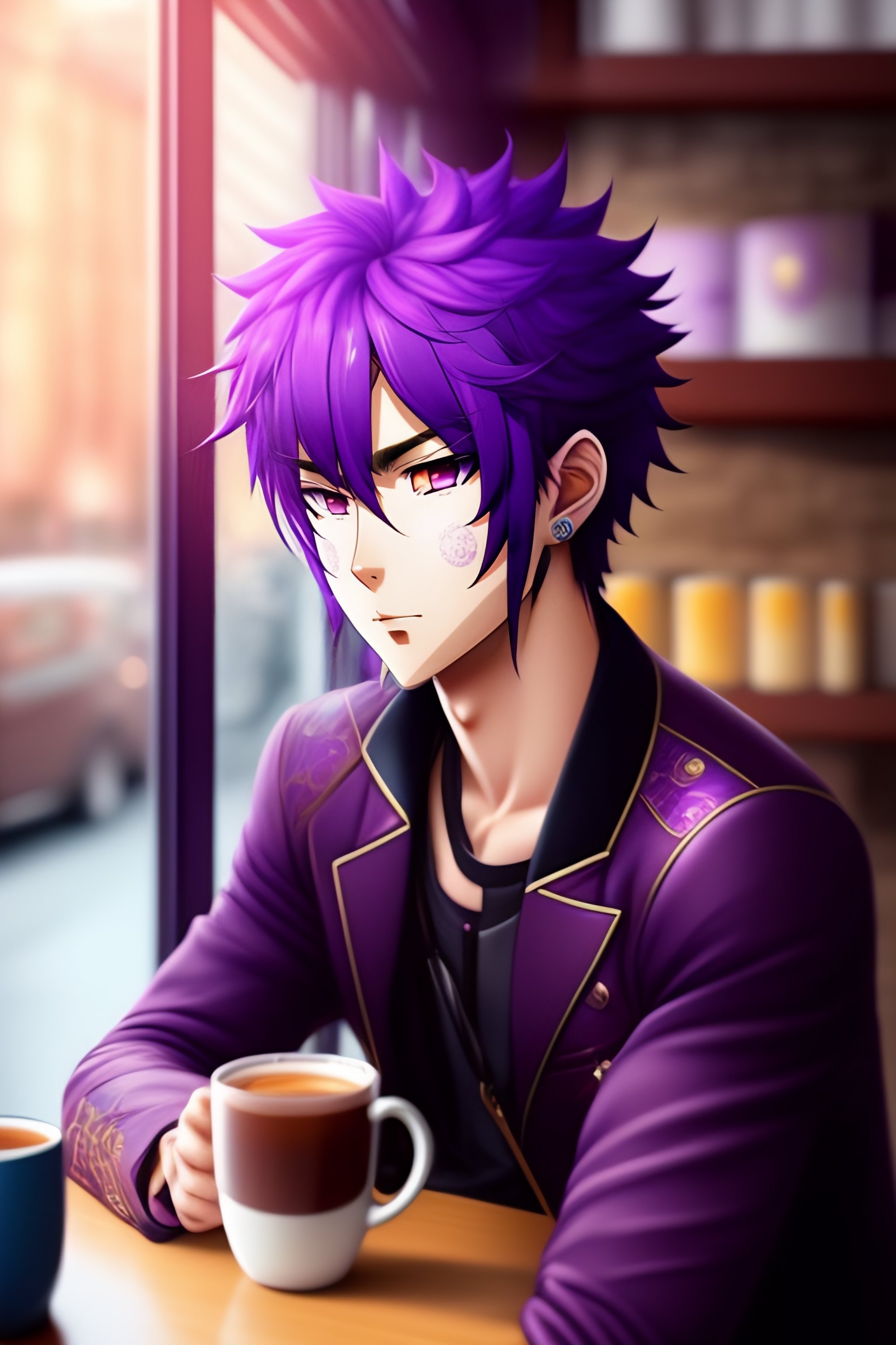 Purple hair anime guy in a coffee shop