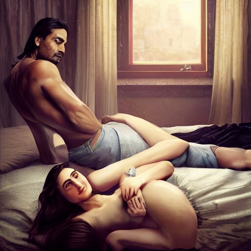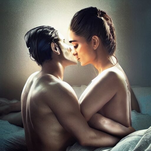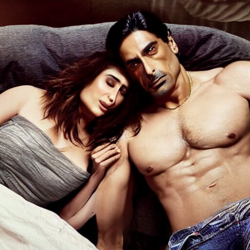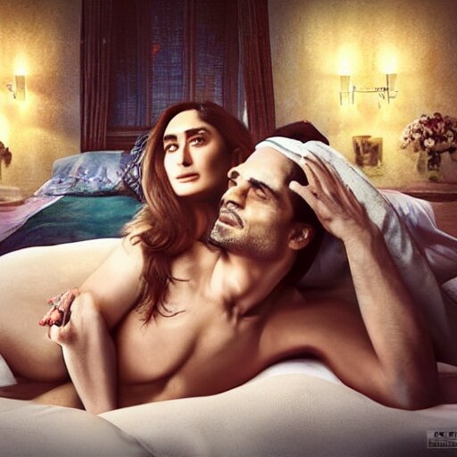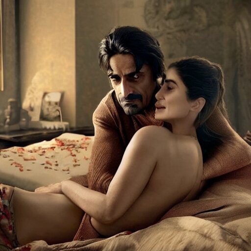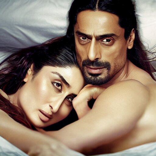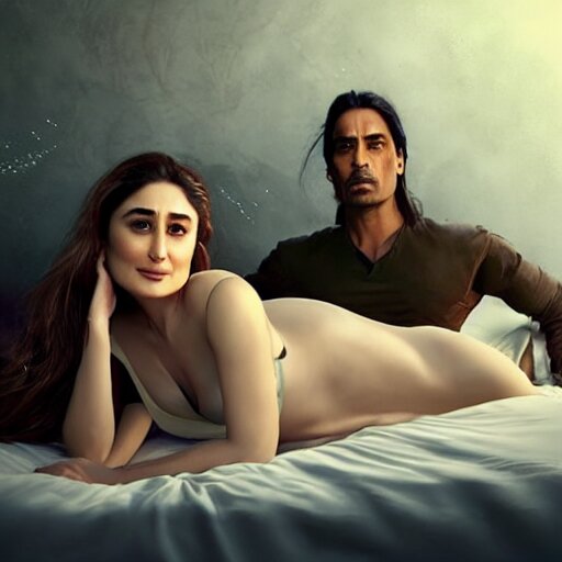 Kareena kapoor with arjun rampal in the bed, au naturel, hyper detailed, digital art, trending in artstation, cinematic lighting, studio quality, smooth render, unreal engine 5 rendered, octane rendered, art style by klimt and nixeu and ian sprigger and wlop and krenz cushart.
