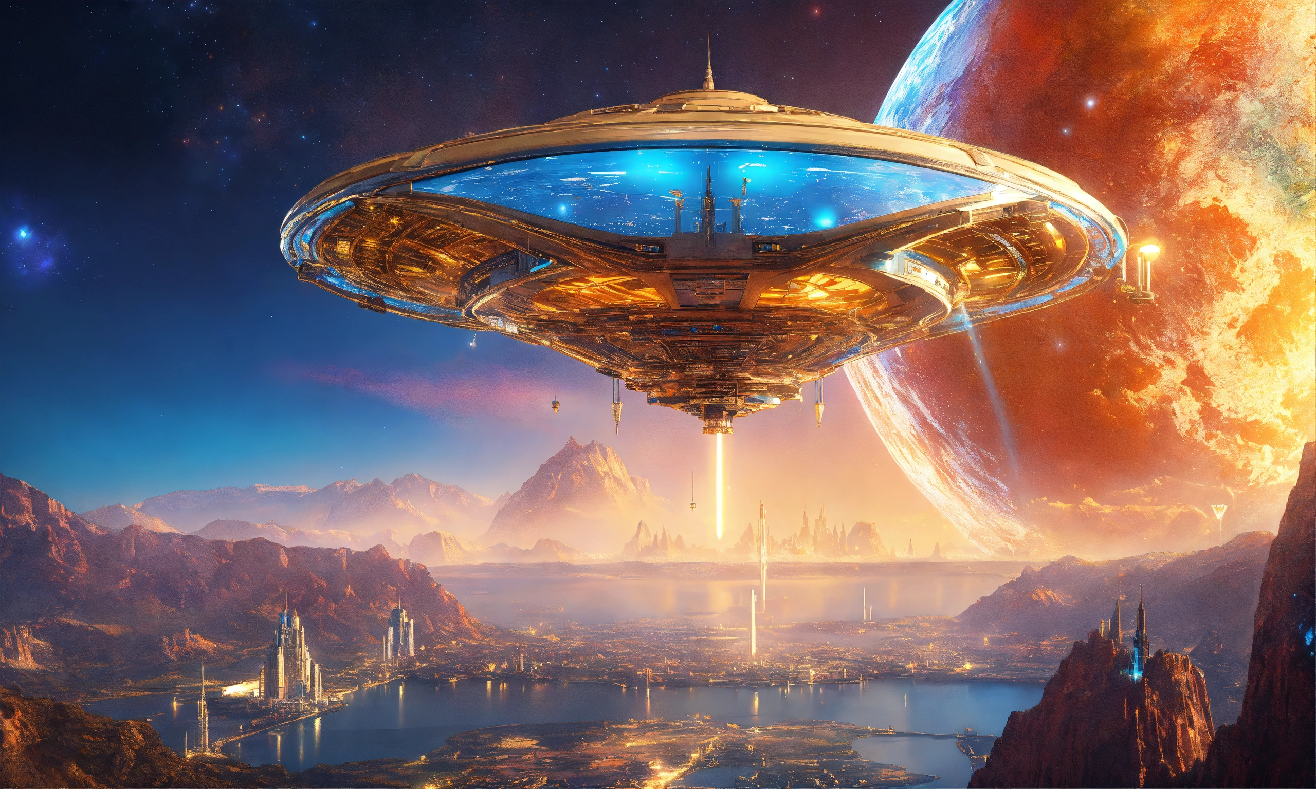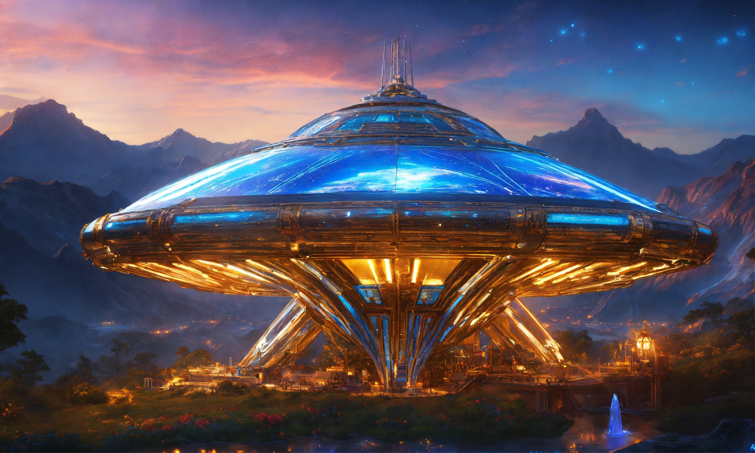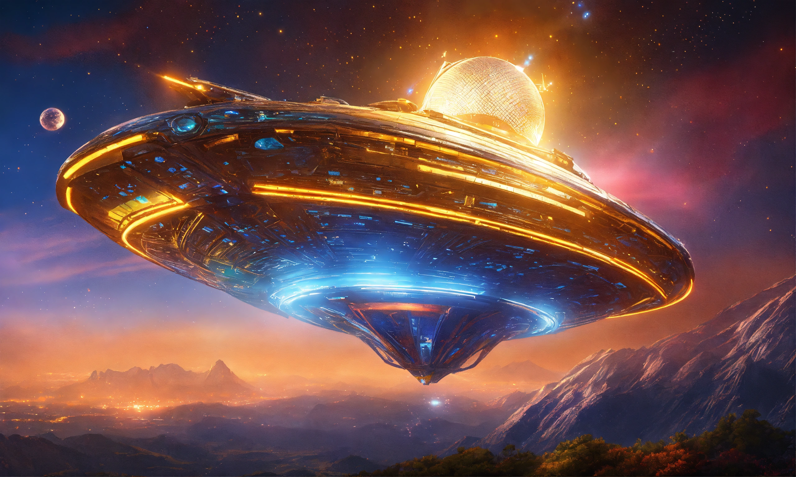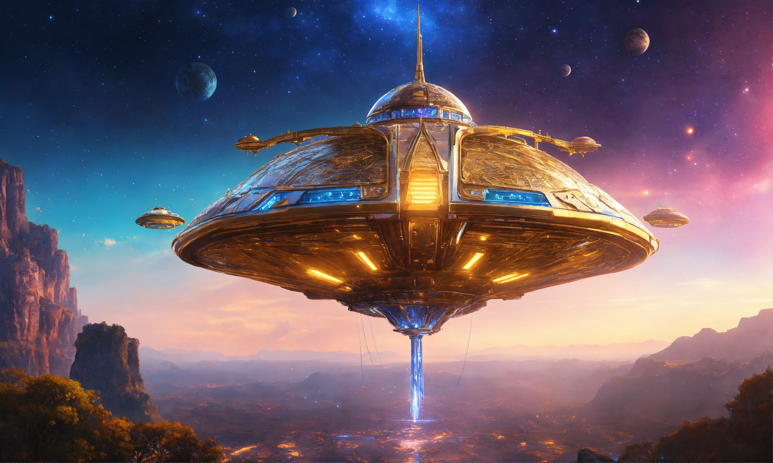 Futuristic spaceship, alien design, flying in starry space, vibrant metallic colors, vibrant colors, metal chrome, sky blue, golden and white, neon, digital art, 16k, realistic, futuristic galactic photorealistic technological, art by, hildebrandt, in the style of, artstation disney pinterest, crepuscular rays neon lamp ultraviolet, chrome, spaceship, space, metallic, highly detailed intricate scenery fine details octane hyper realistic unreal engine intricate details 16k, beautiful princess of the stars smiling blonde with blue eyes of the stars with rich color clothes and precious stones with gold fabrics and silks of soft colors, brocade, very sharp images 16k and environment of flowers, waterfalls and mountains