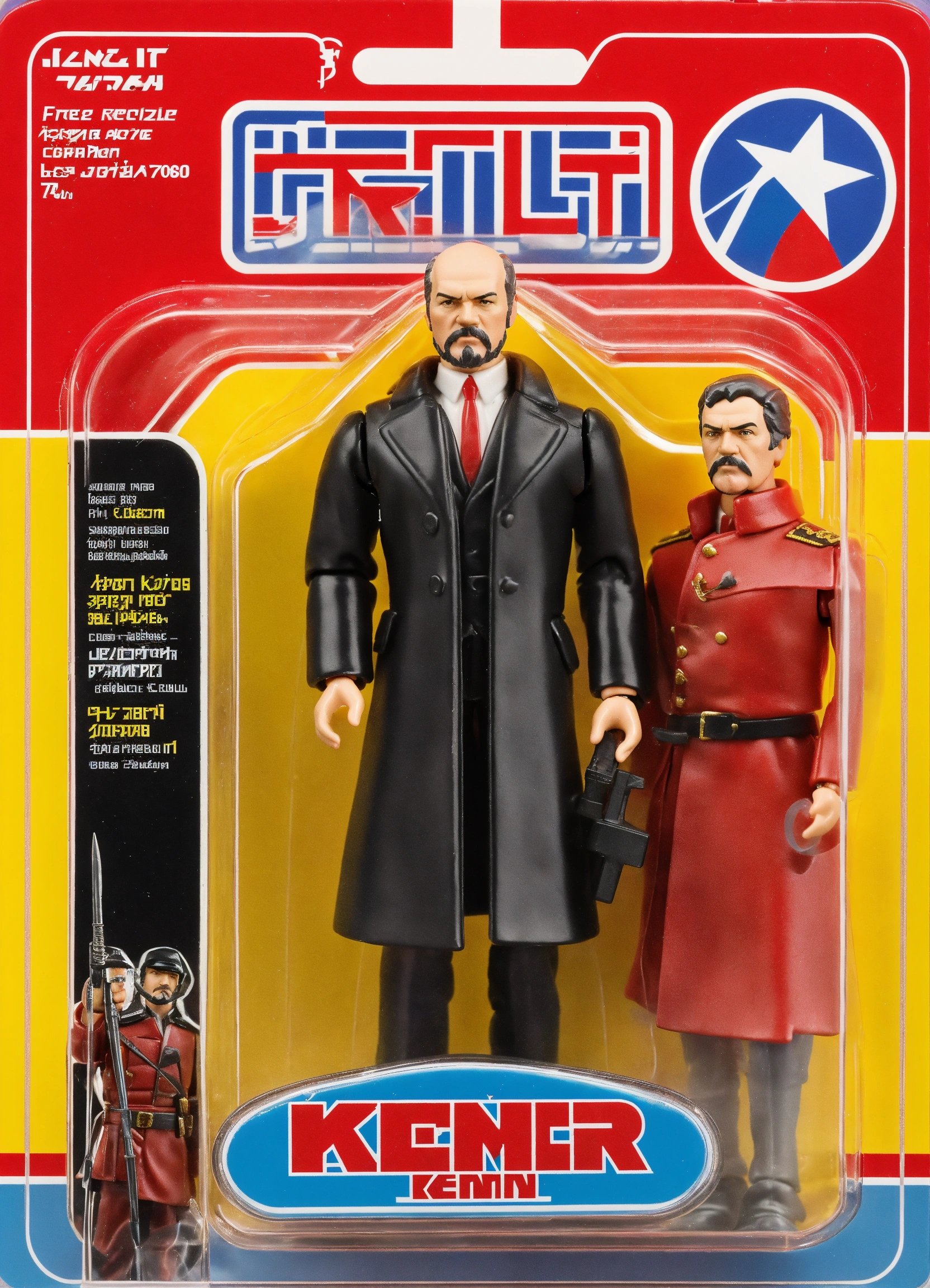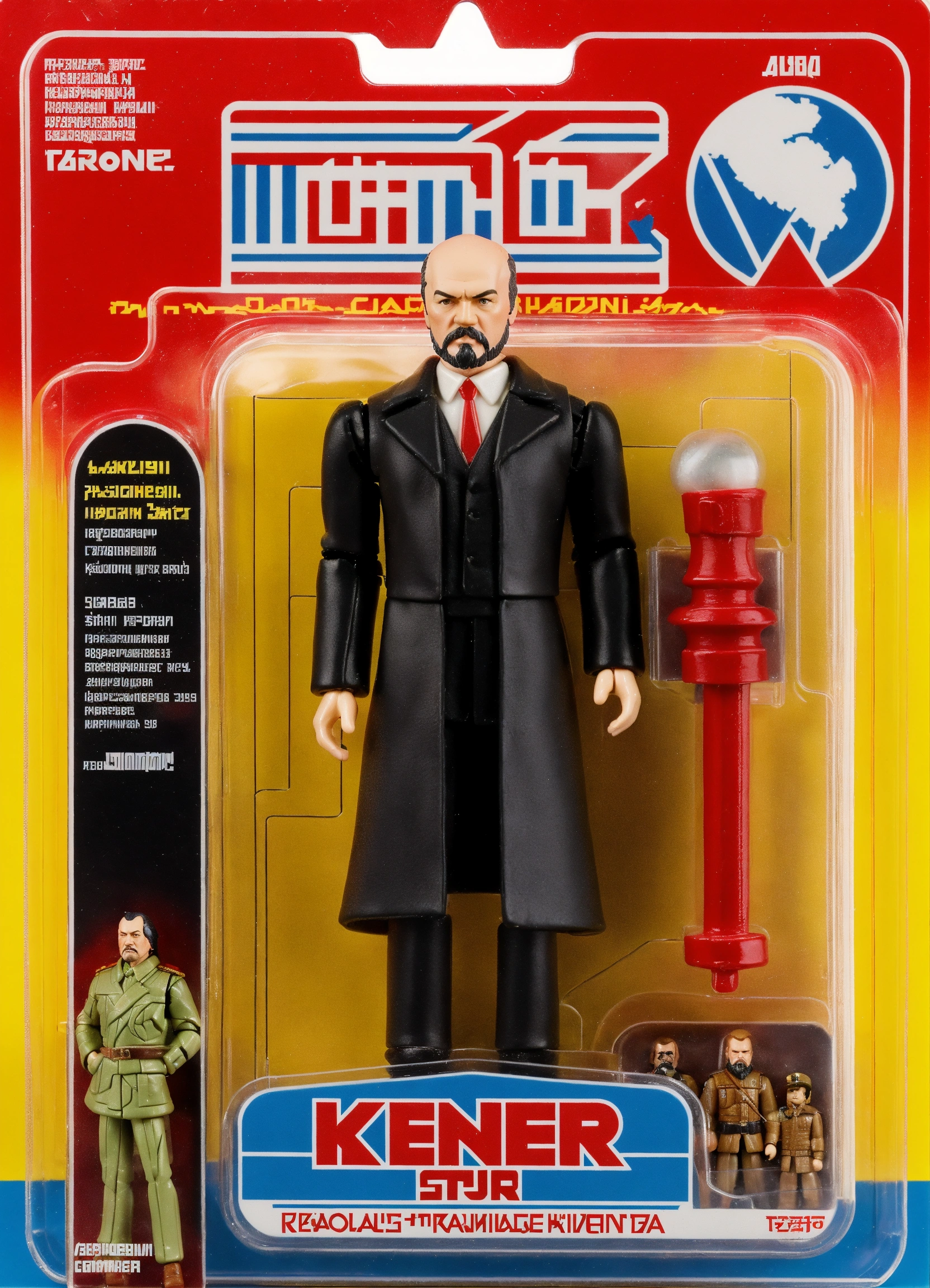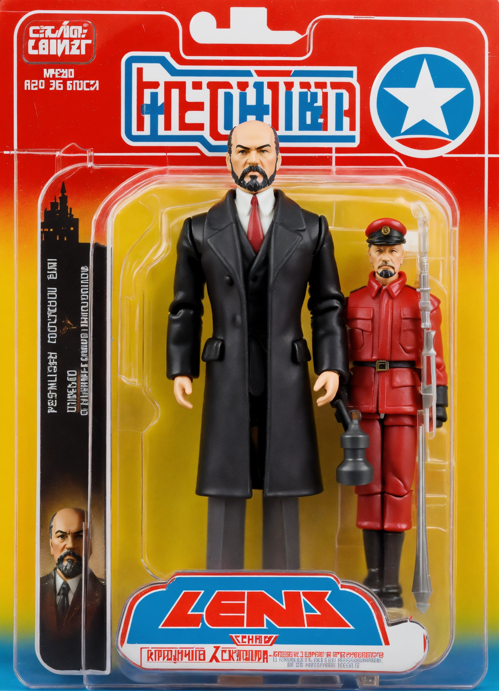 Create a kenner-style action figure or a super 7 reaction figure based on the iconic revolutionary russian leader vladimir lenin. the figure should capture the retro aesthetic reminiscent of classic '70s and '80s kenner action figures, with meticulous attention to fine details such as black clothes, black coat, white shirt, distinctive hairstyle and sickle and hammer as accessories. stay true to the high-quality craftsmanship and attention to detail characteristic of kenner's action figures from the '70s and '80s. additionally, design packaging in the style of either kenner or super 7 reaction packaging, the image for the packaging should have the red flag of the communist party.