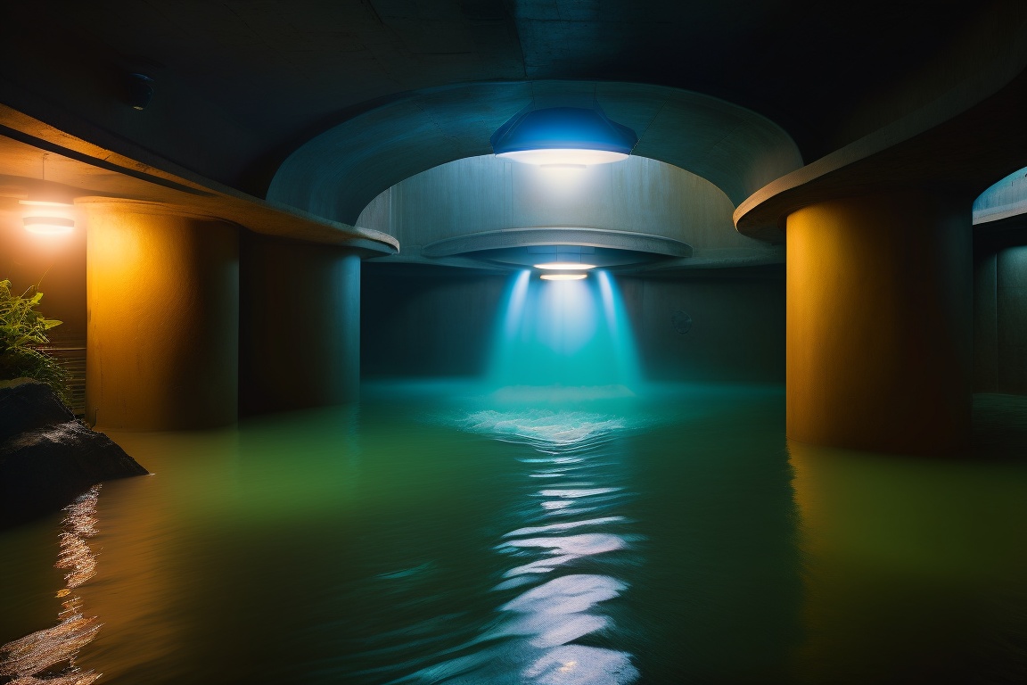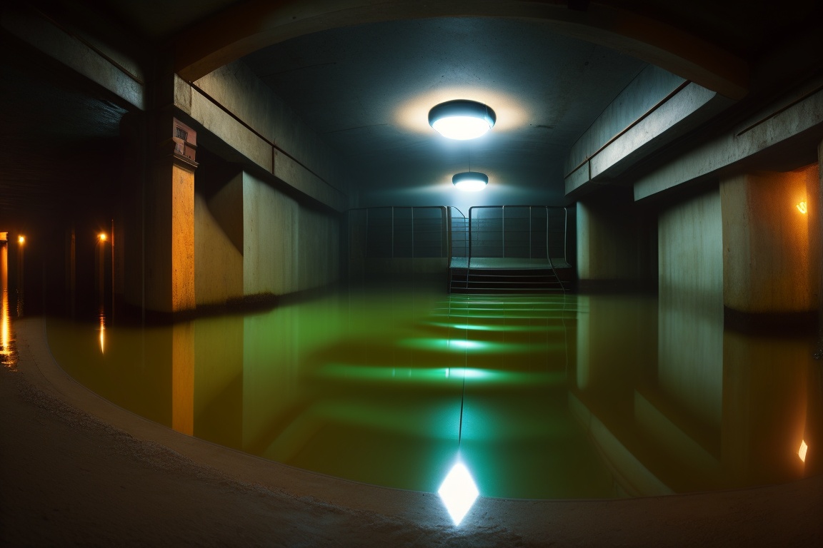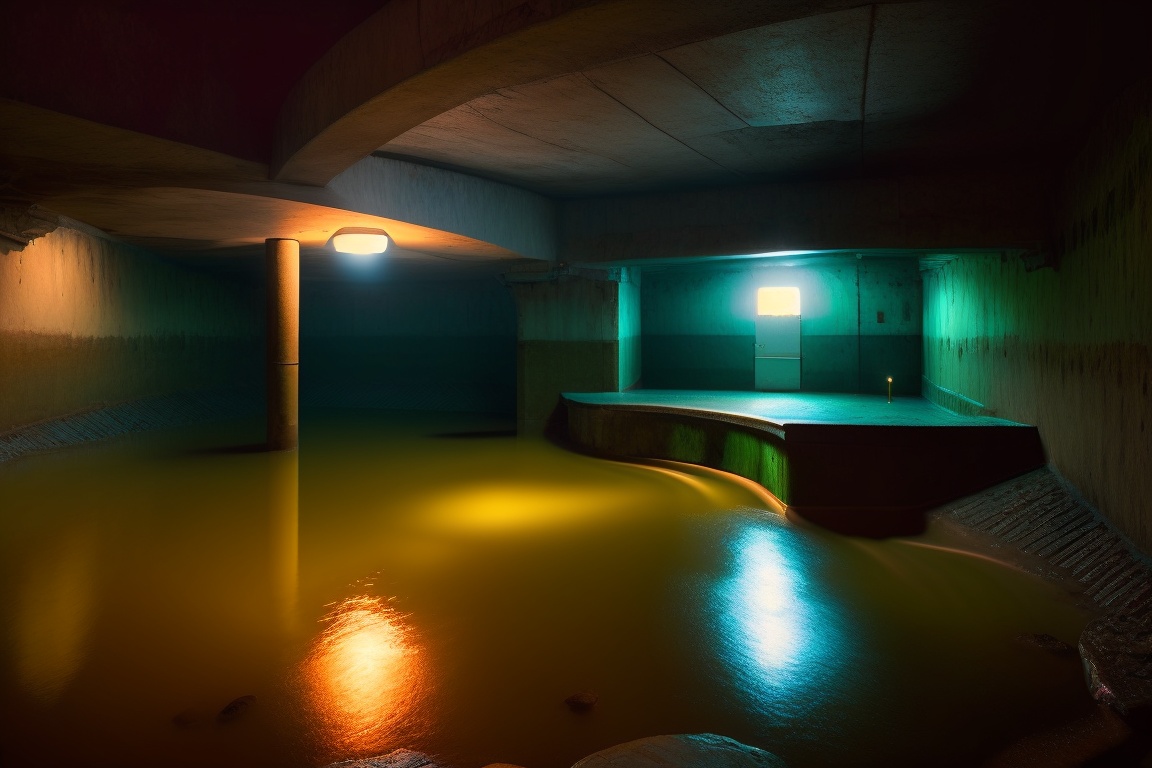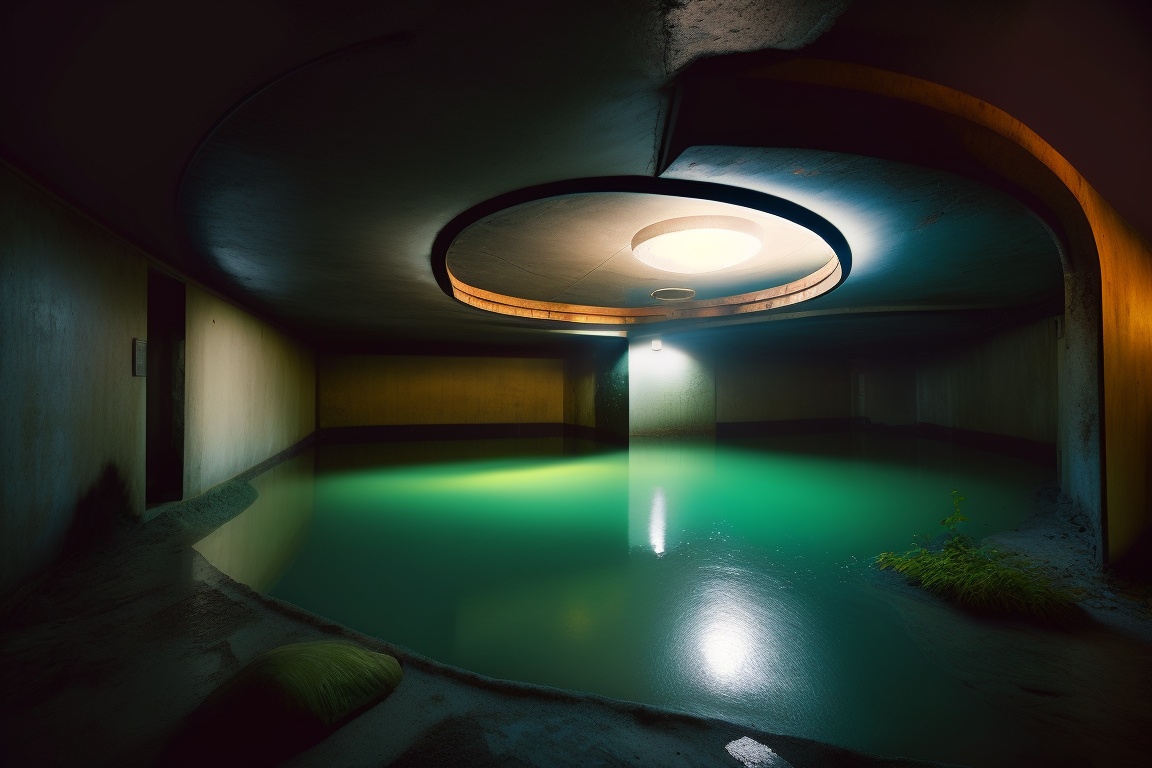 Bunker, flooded abandoned underground waterpark, liminal space, dark, eerie, creepy, dark lighting, liminal