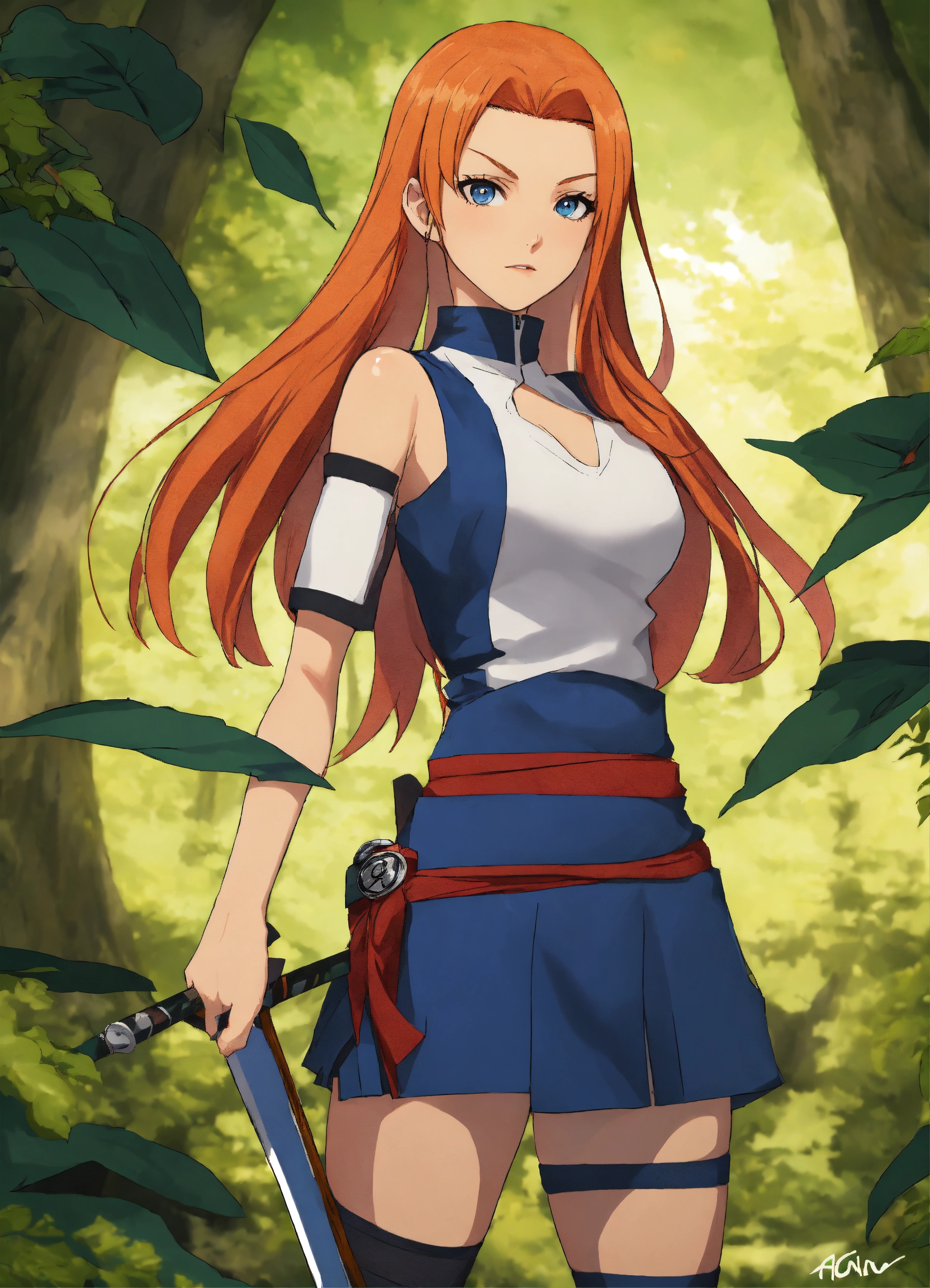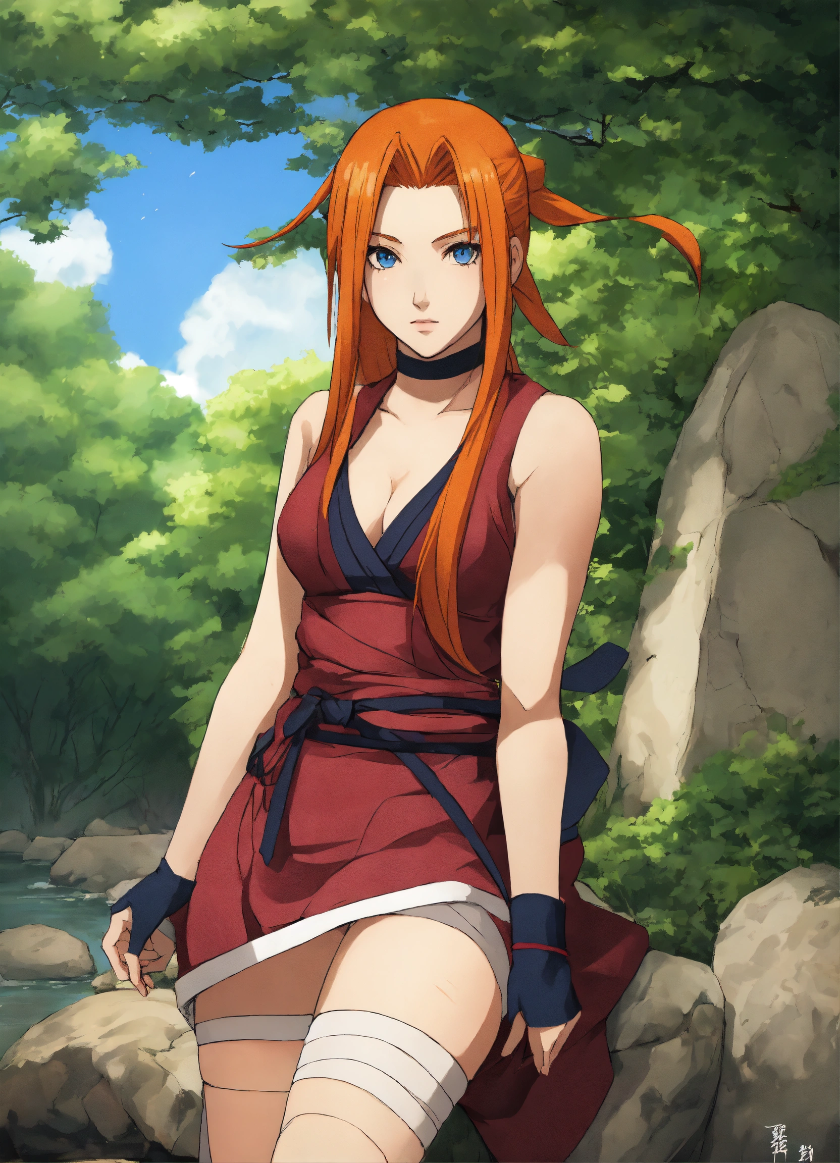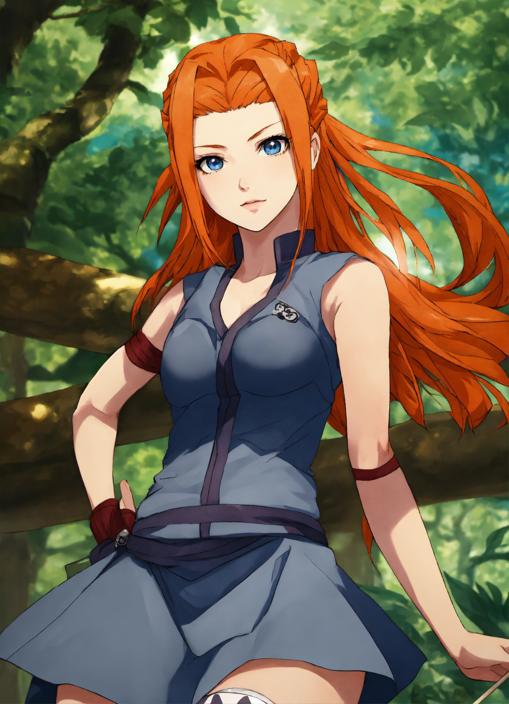 Naruto-style art, masashi kishimoto art, anime, naruto manga, naruto anime, original character, ginger hair, blue eyes, pretty woman, kunoichi, shinobi, konoha, ginger long hair, ginger hair, blue eyes, beautiful girl, beautiful young woman in naruto style art, feminine, fishnets, village hidden in the leaves headband, short dress, fishnets, kunoichi attire, feminine kunoichi attire, naruto headband, fishnets tights on legs, flattering kunoichi fishnets, long hair down and flowing, full body, full fishnets on her legs, full fishnet tights, wearing full fishnet tights on her legs, full fishnet tights on legs, jōnin vest, jōnin green flak vest, long dress with slits up both thighs