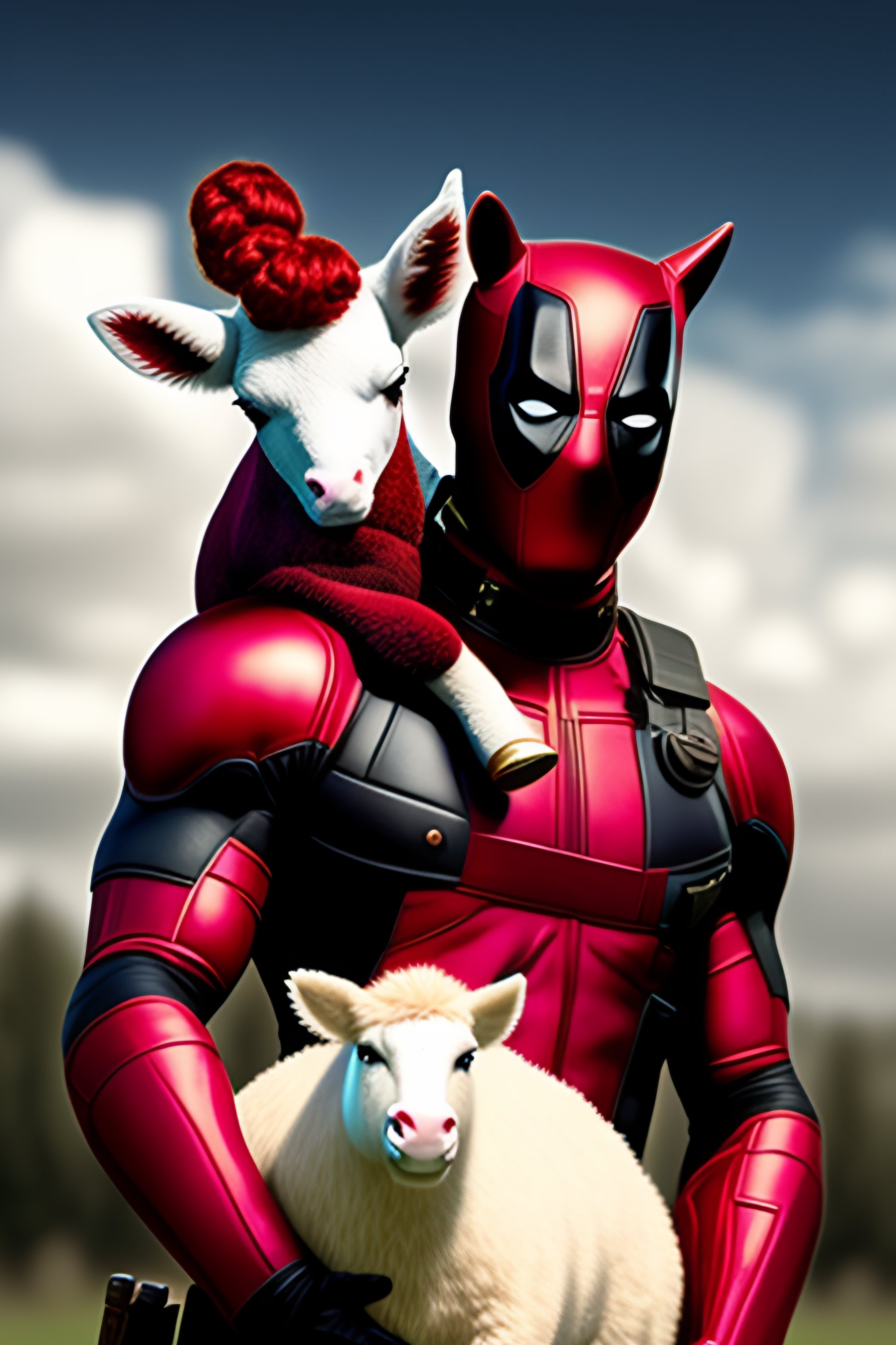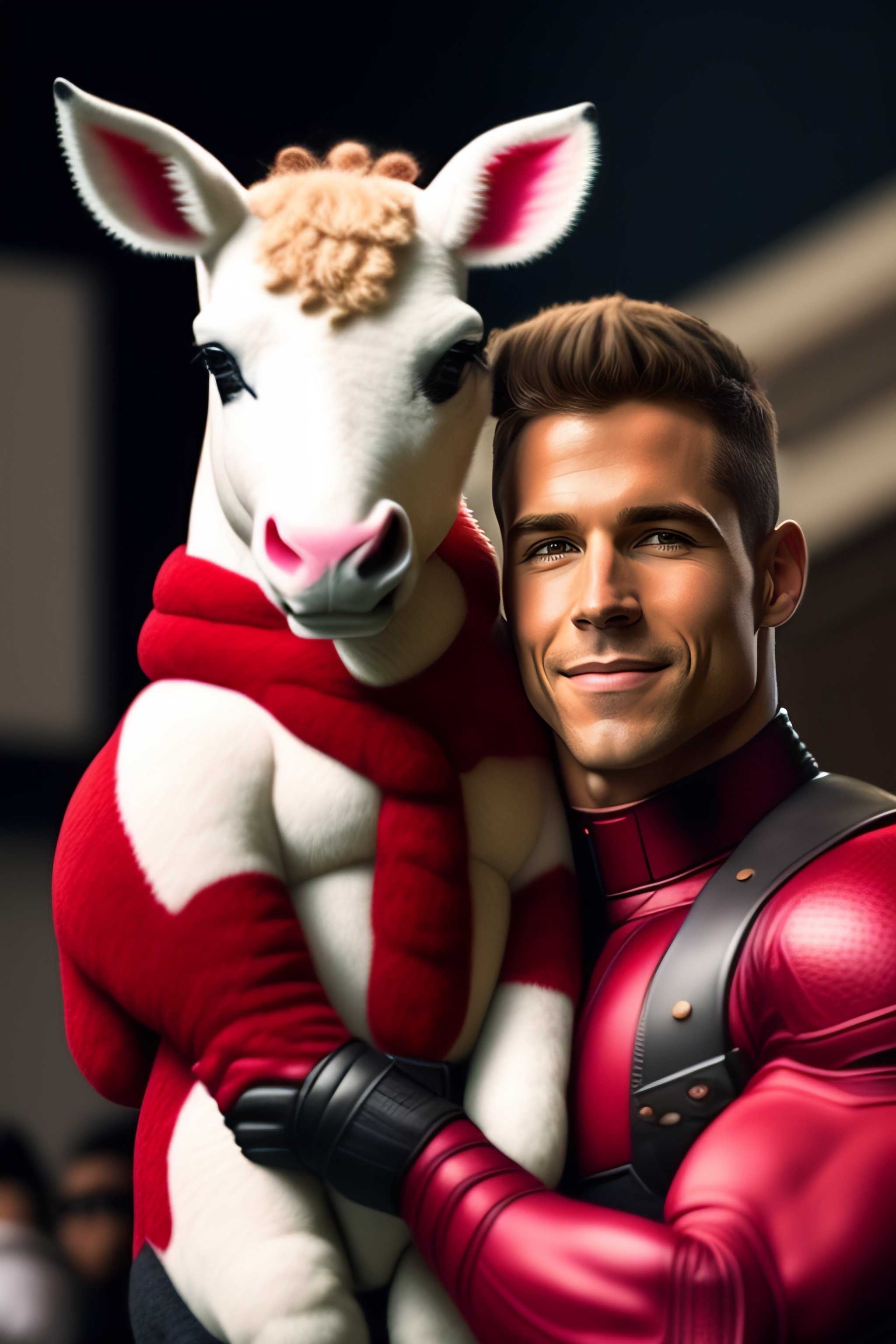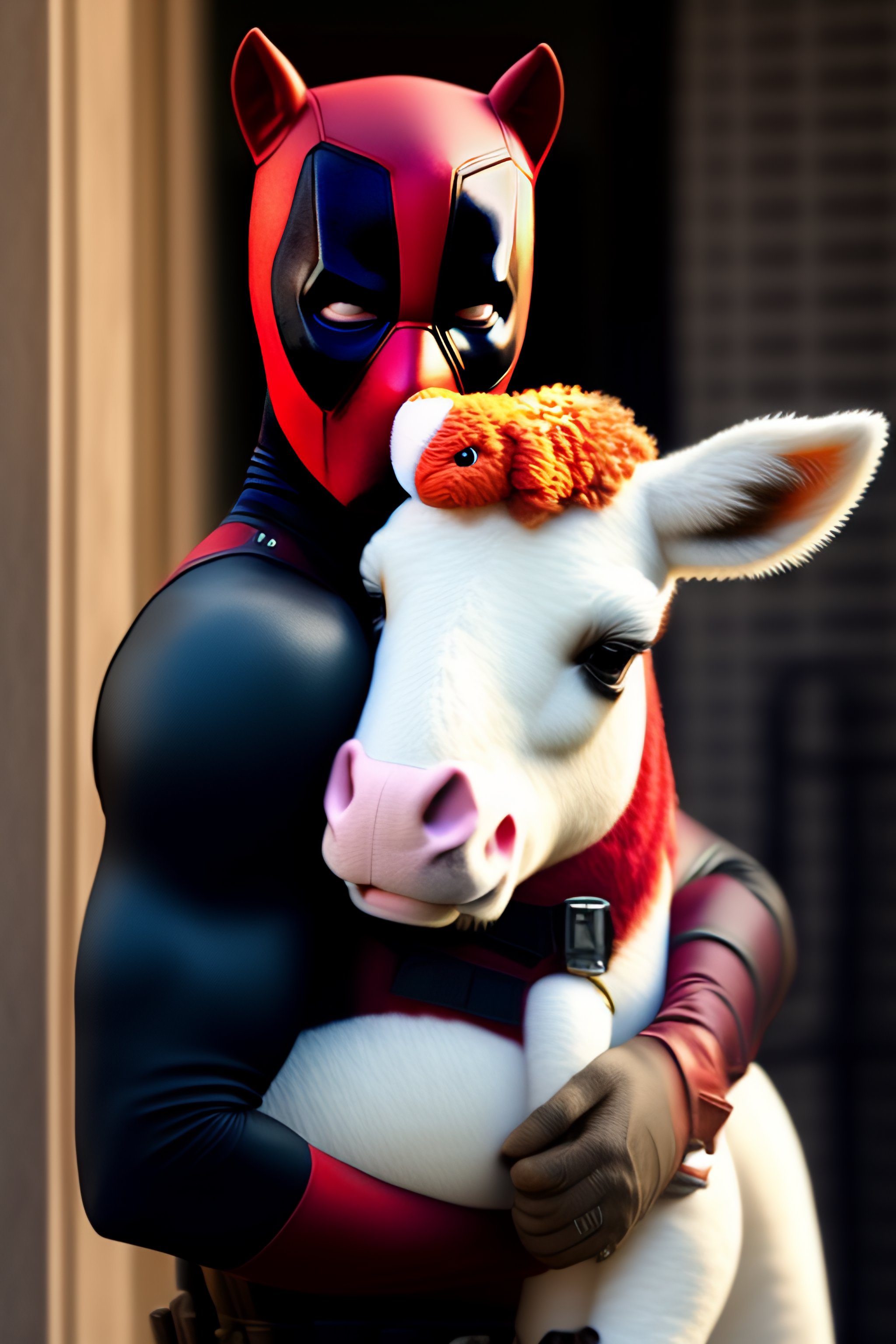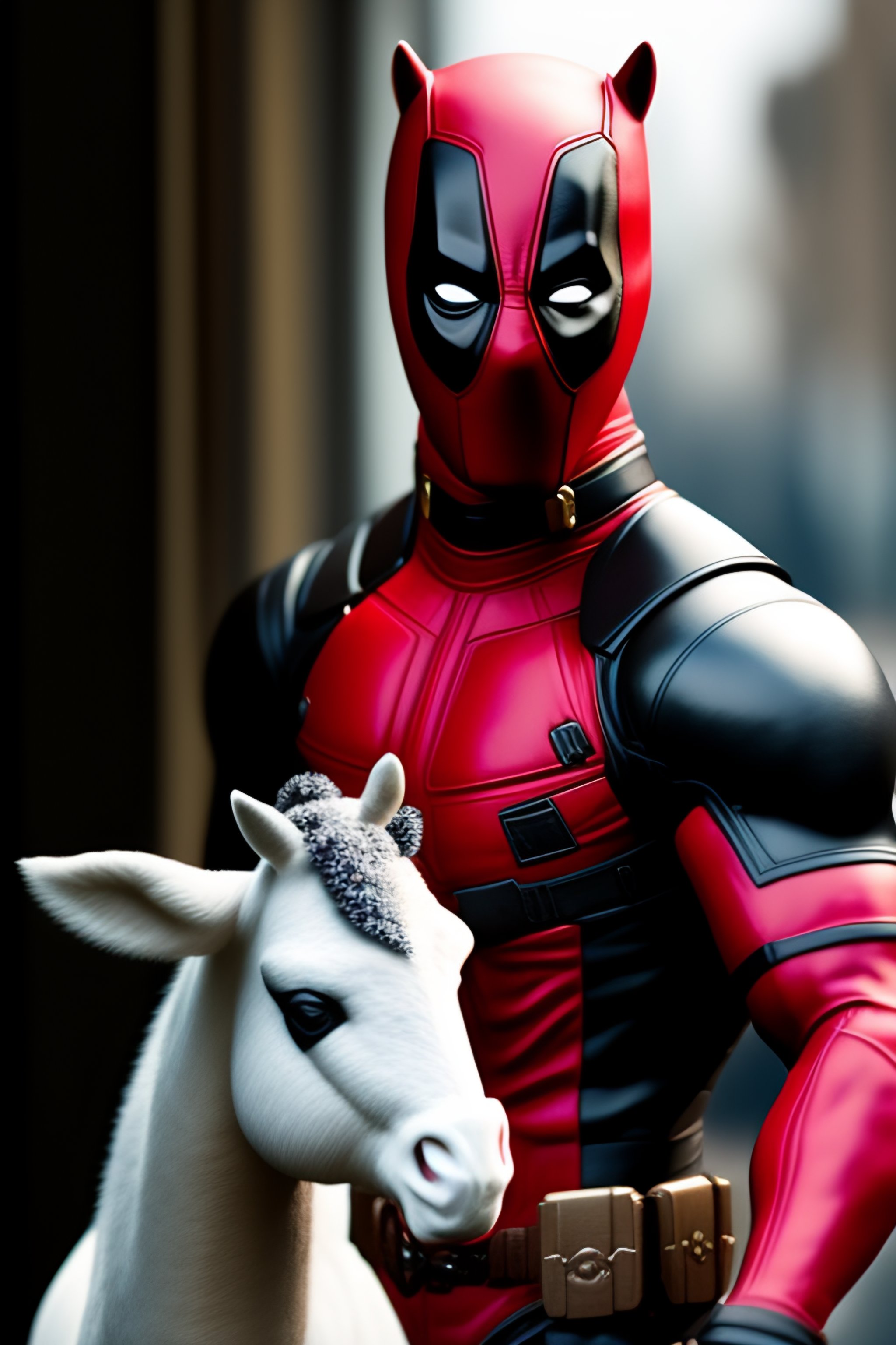 Deadpool holding a stuffed unicorn