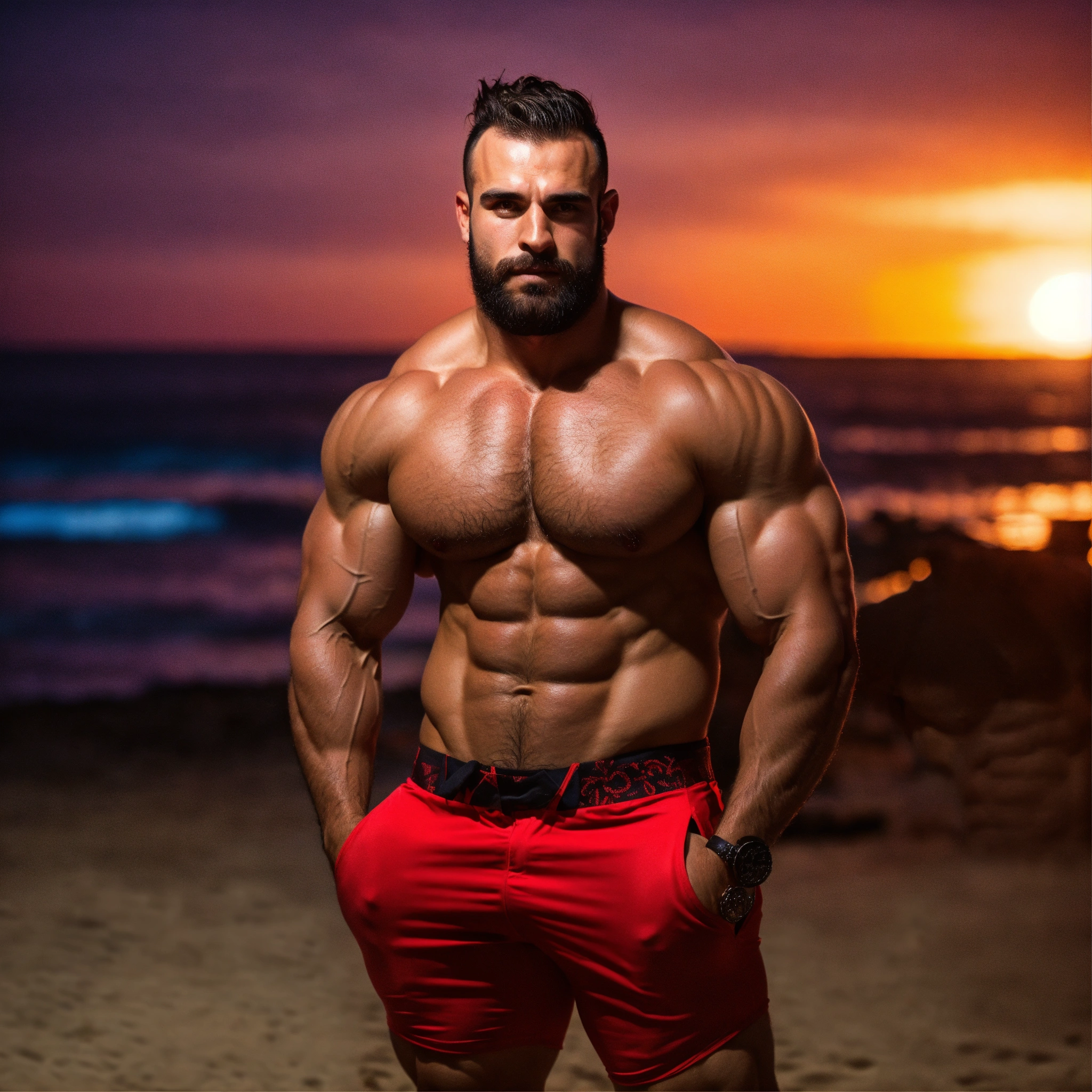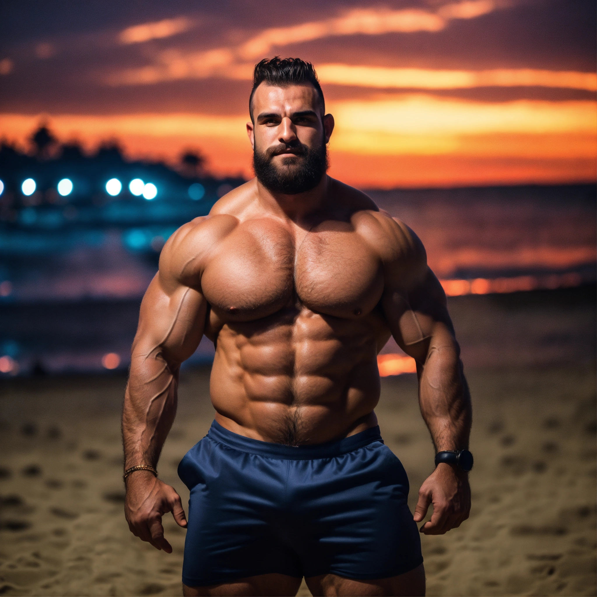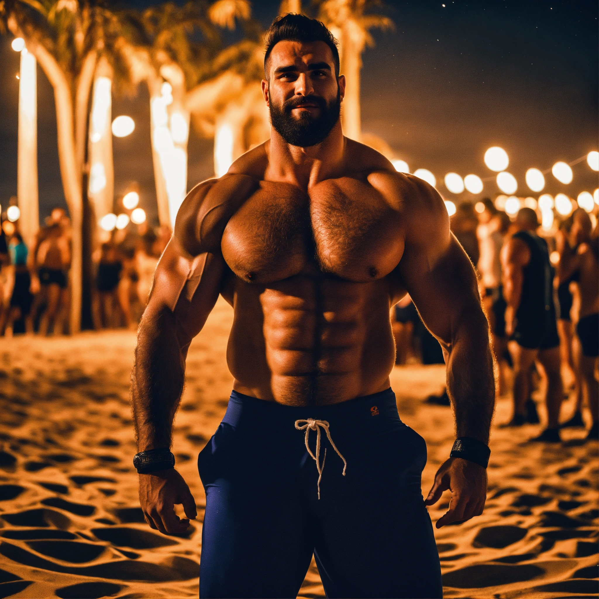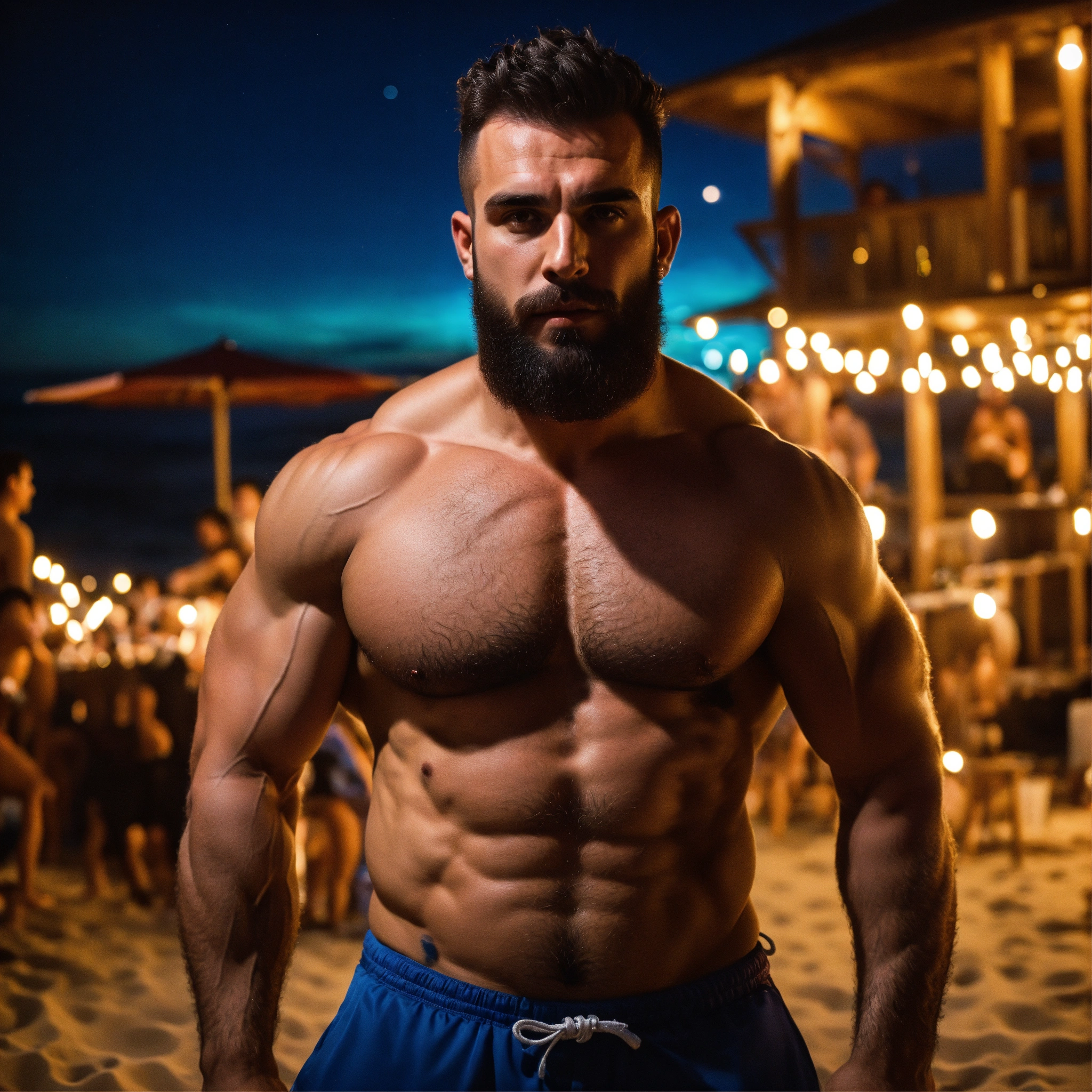 30-year-old hairy albanian man with big muscles, big bodybuilder, body like a wrestler, at a party on the beach at night