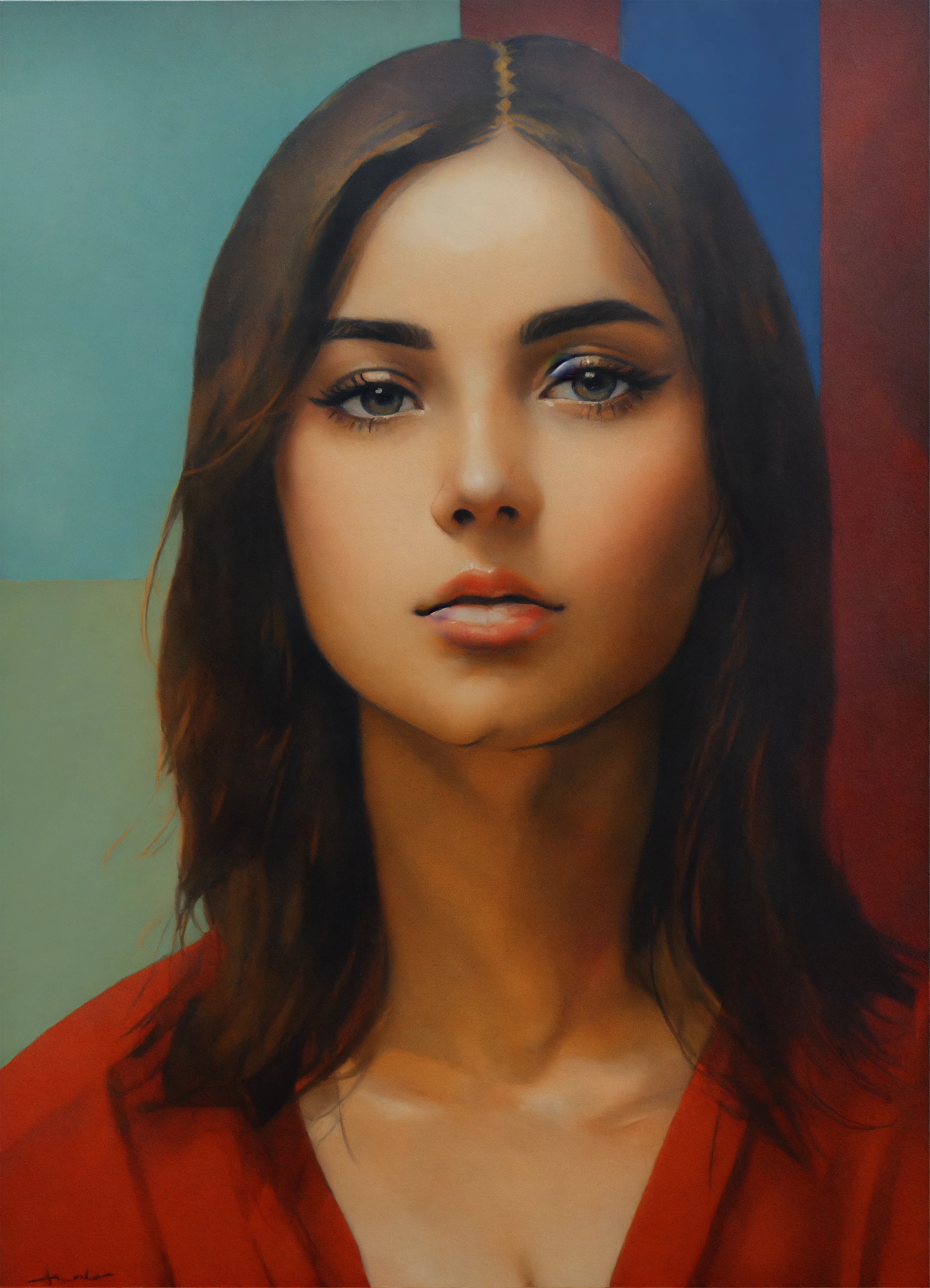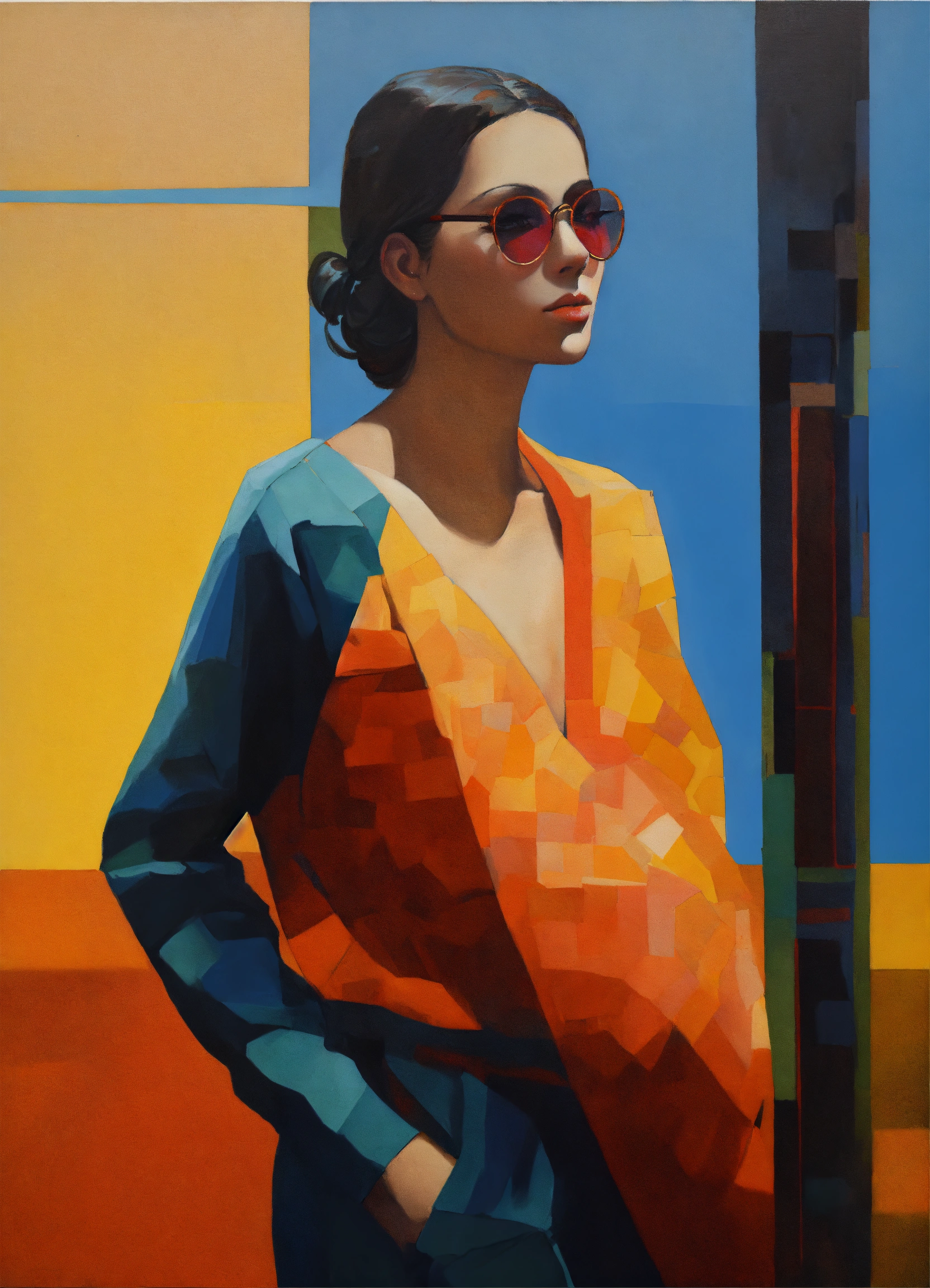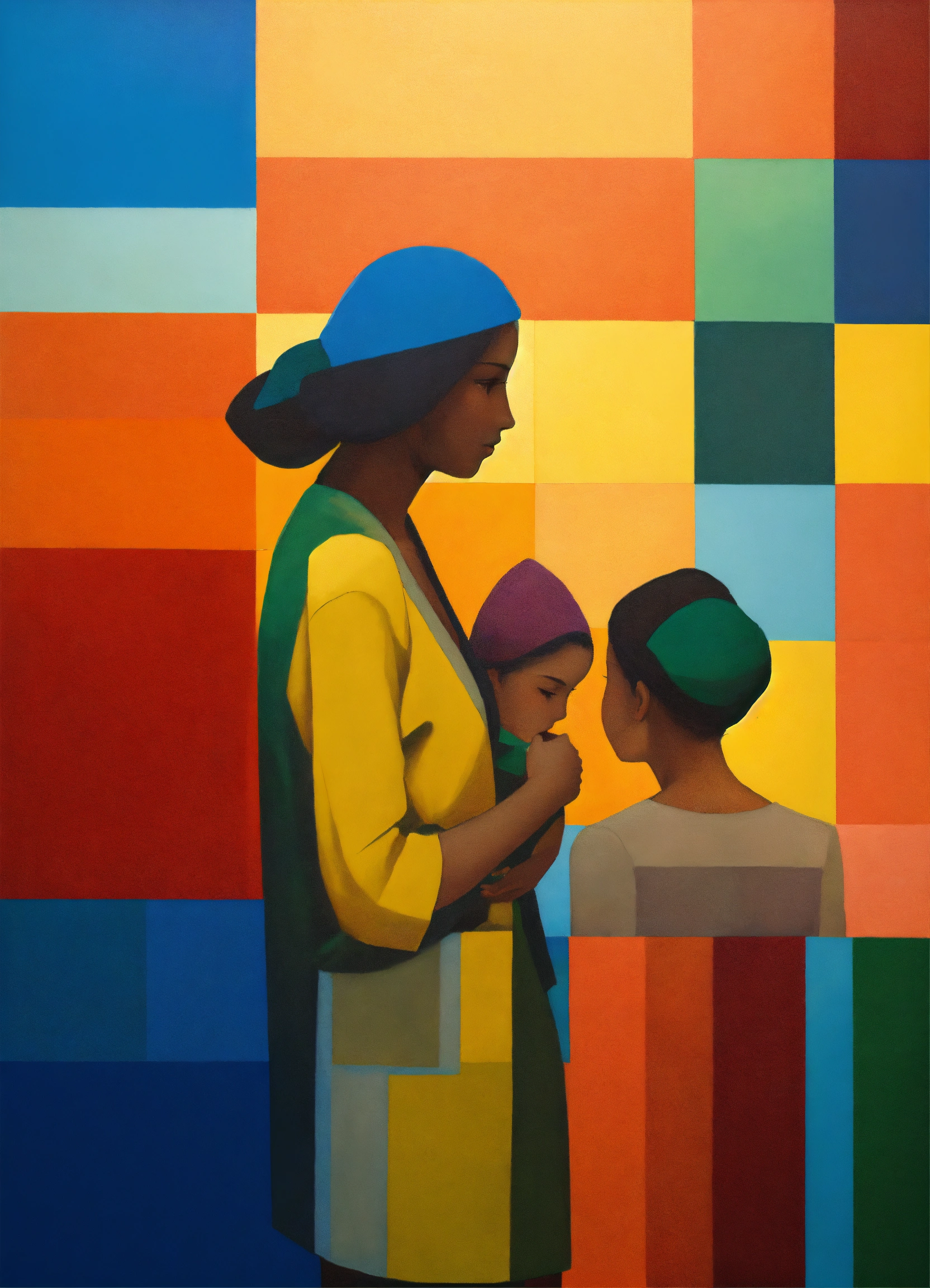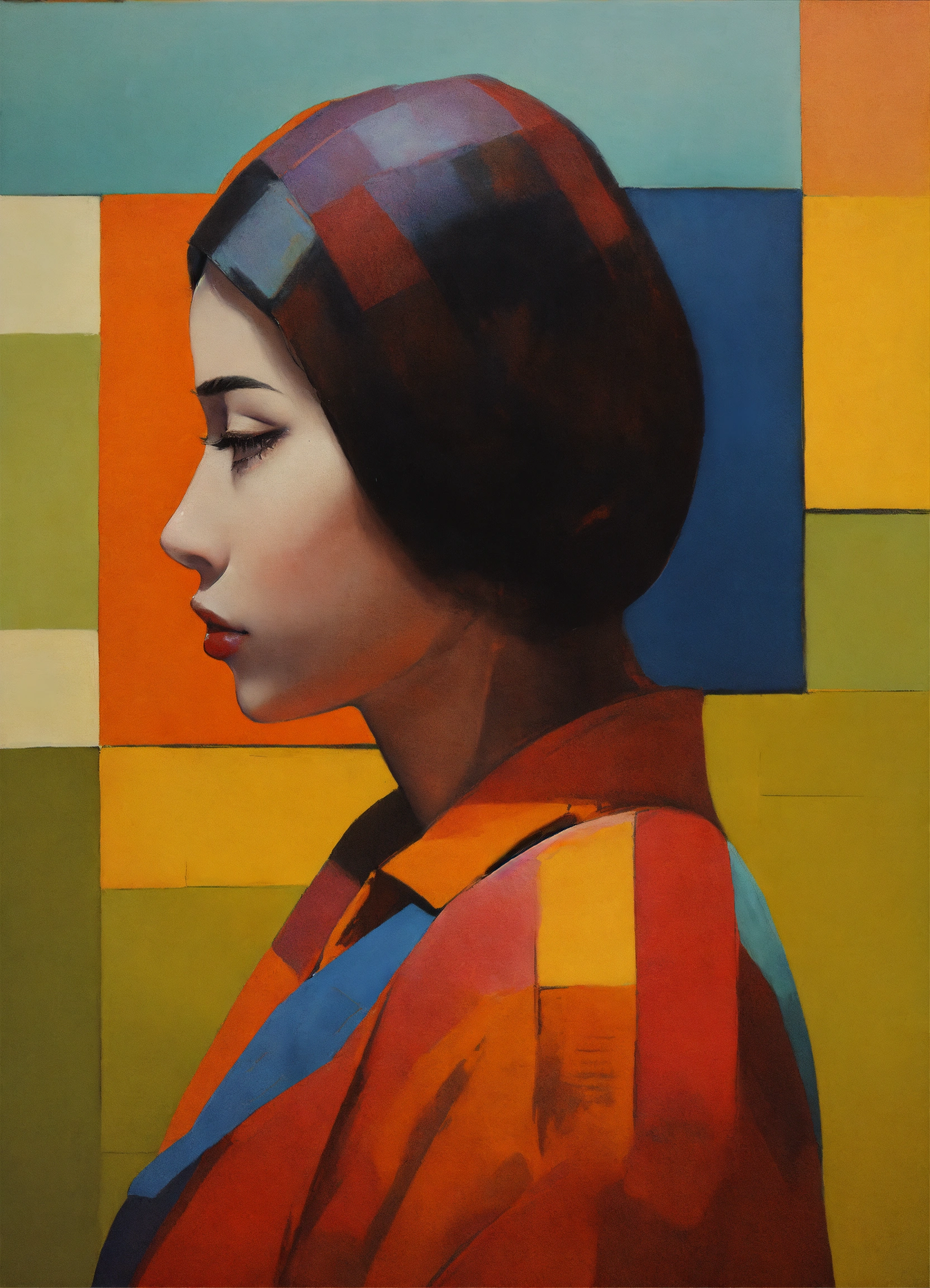 Una pintura al oleo geeometrica, de rostros de mujeres de distintas nacionalidades, solo siluetas y colores, muy minimalista