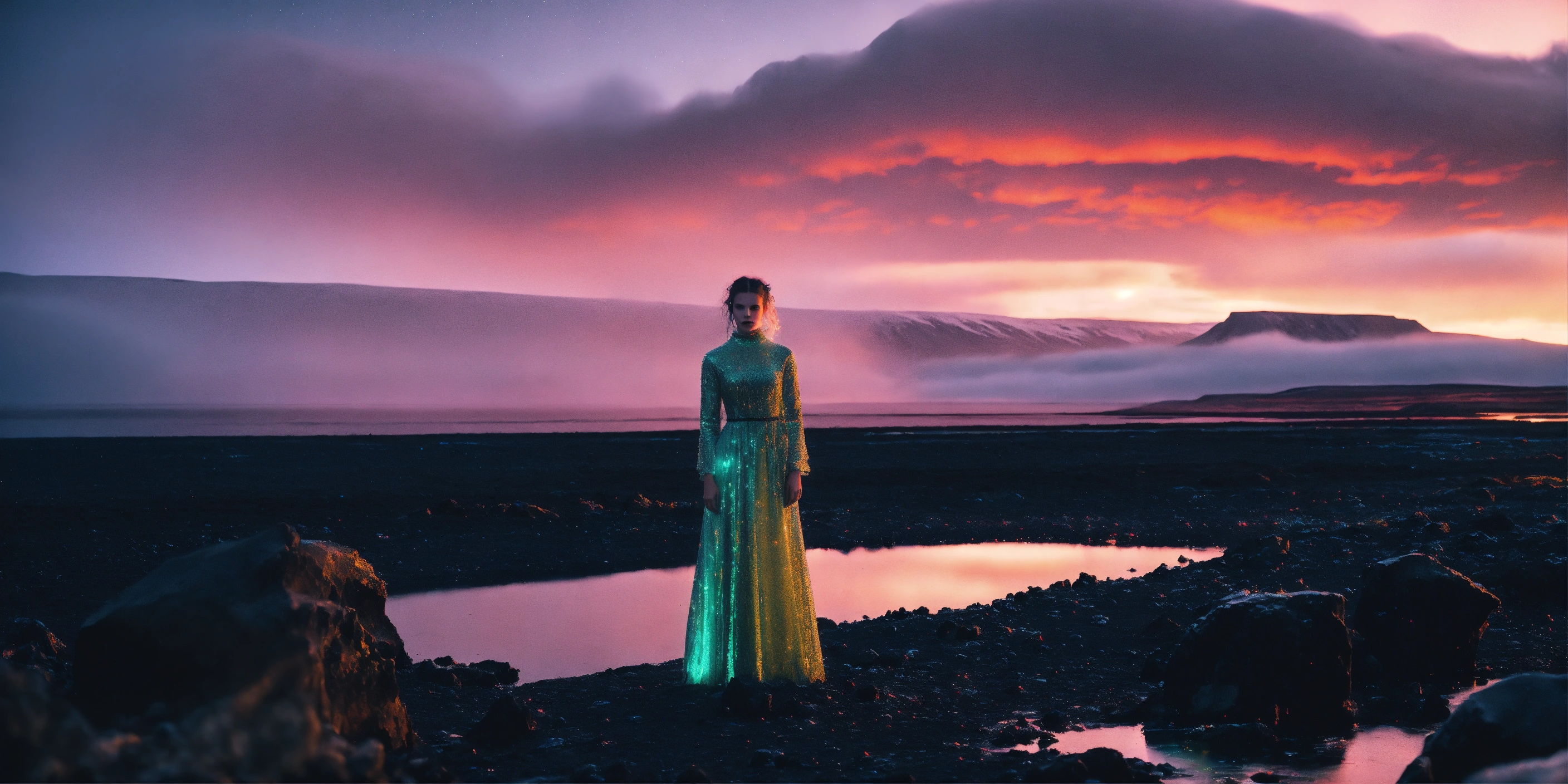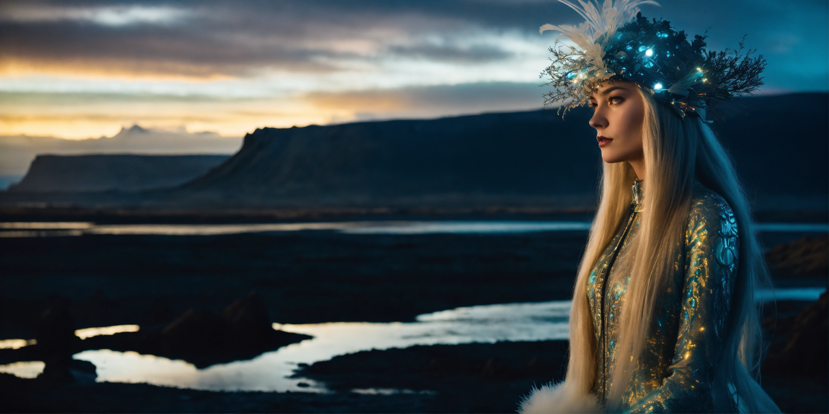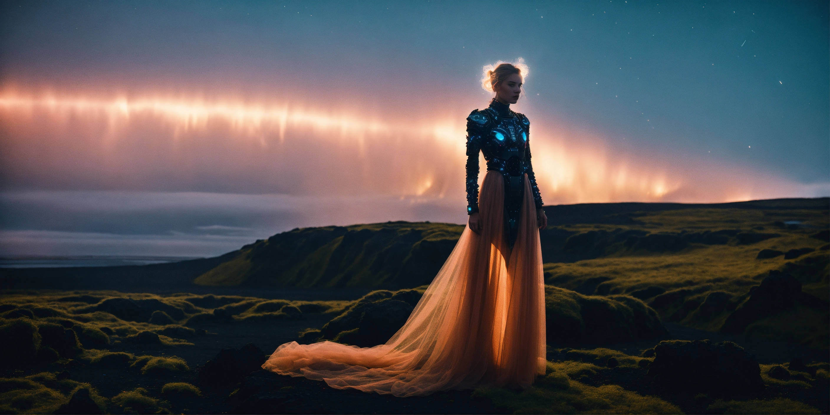 A supermodel showing a mesmerizing fusion of baroque-inspired designs in the mystical landscapes of iceland. luminous, nanotech, bioluminescence, cybernetic, mystical. the depths of night, amidst iceland's ethereal landscapes. dark and broody with a hint of futurism. captured by evangeline noir.