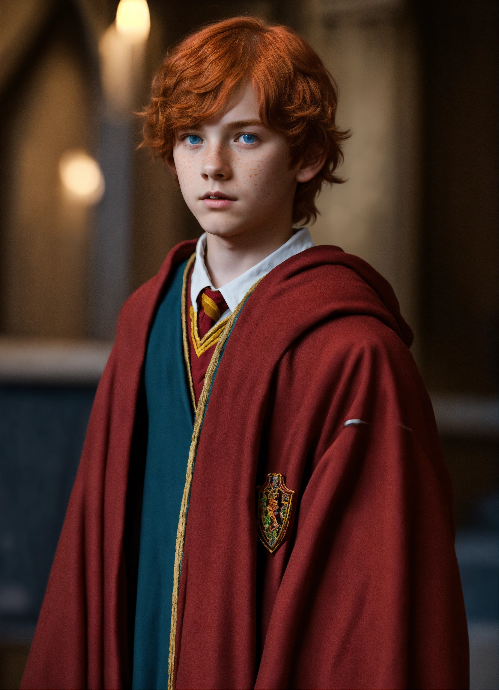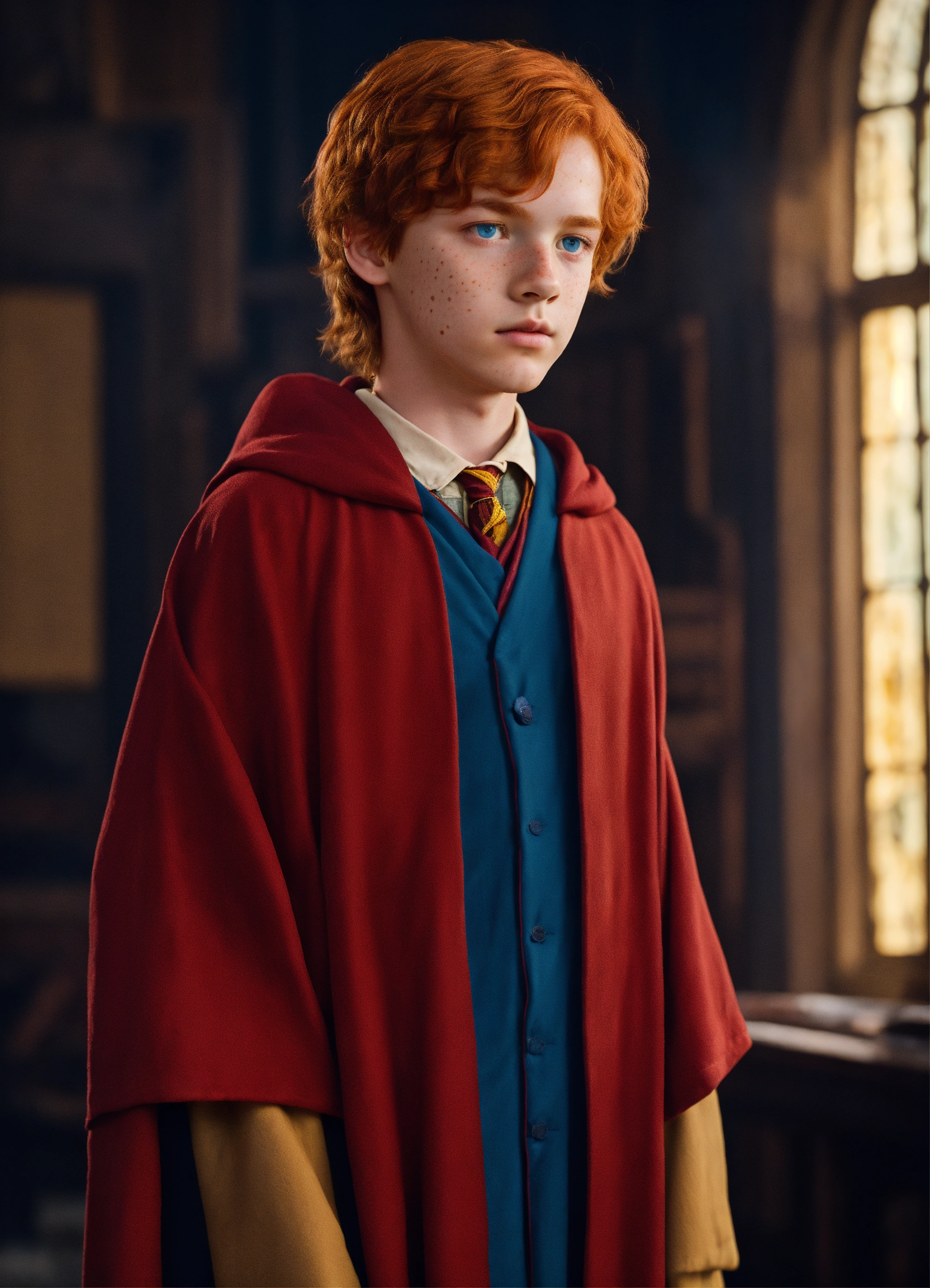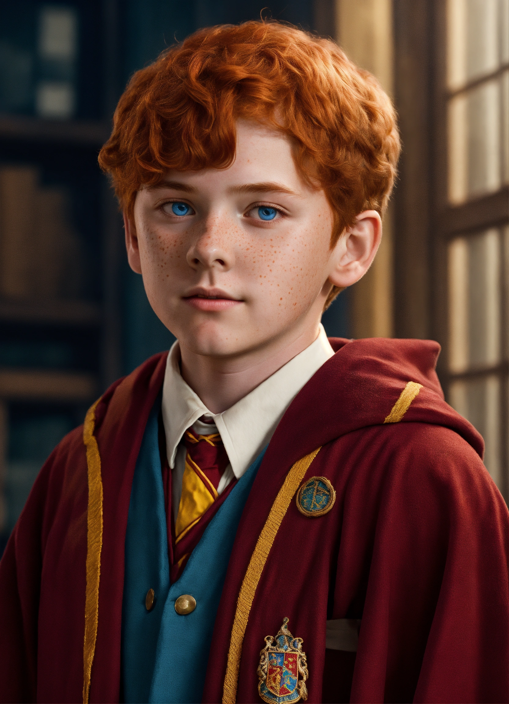 11-year-old male, red hair, freckles, blue eyes, long nose, tall lanky, gryffindor robes, facing camera, facing forward, realistic