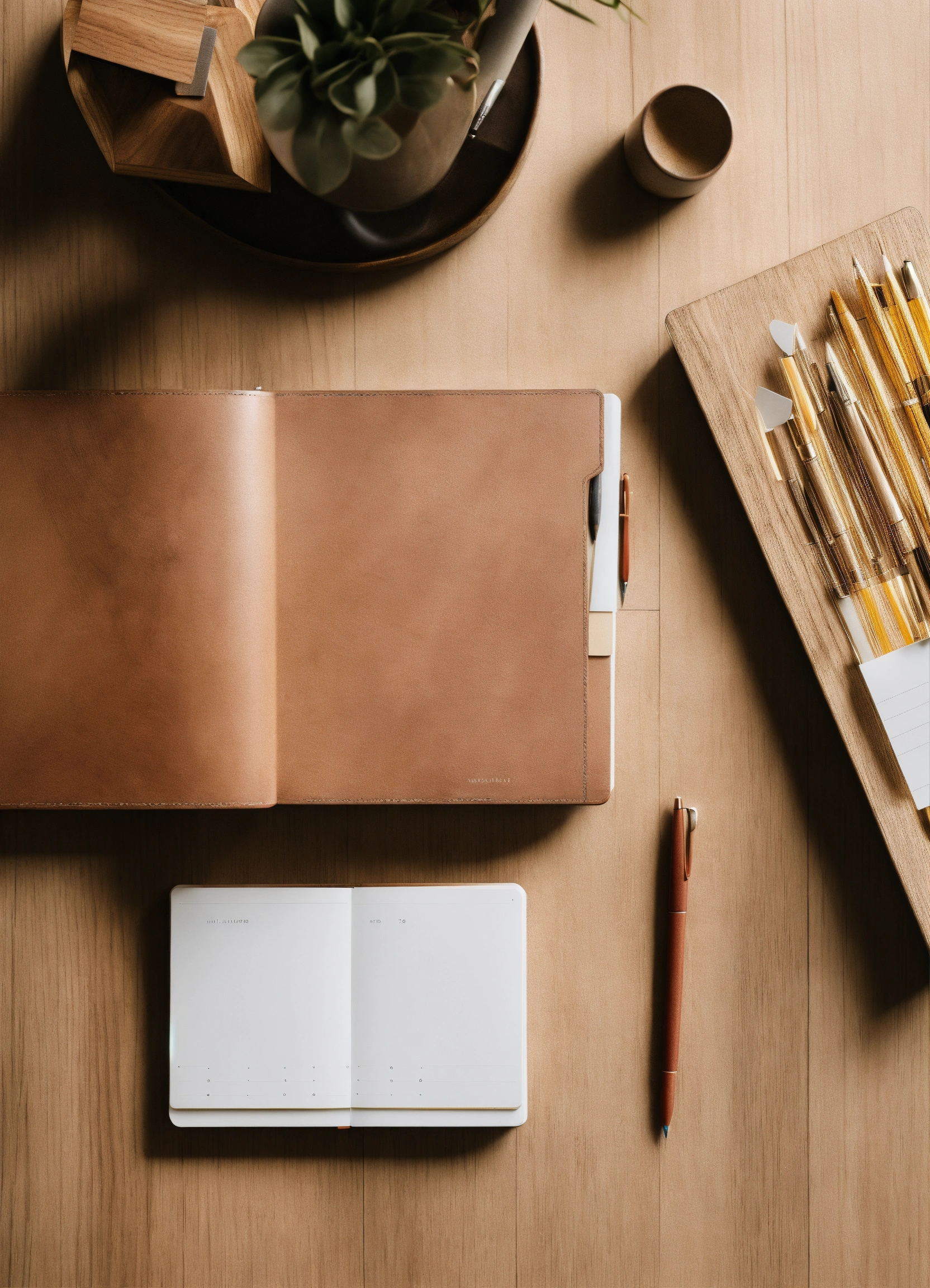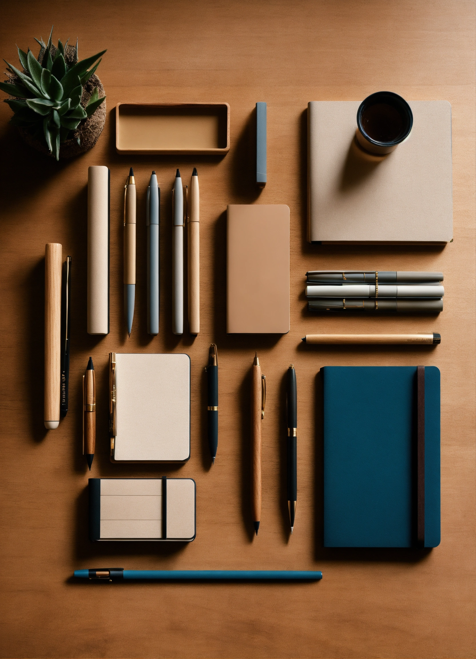 Minimalistic stationery scene, unbranded, variety of pens, notebooks, desk organizer, natural wood desk, overhead shot, style of michael anastassiades, neutral color palette1.7, soft shadows, high resolution, detailed textures, high quality