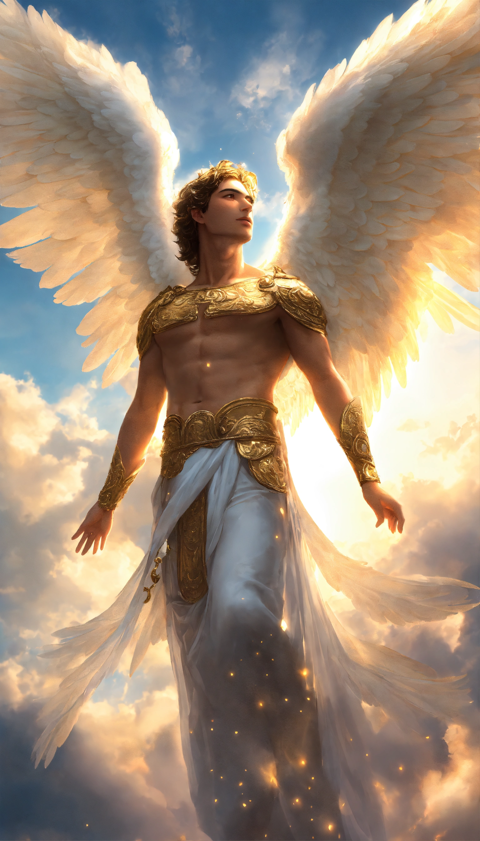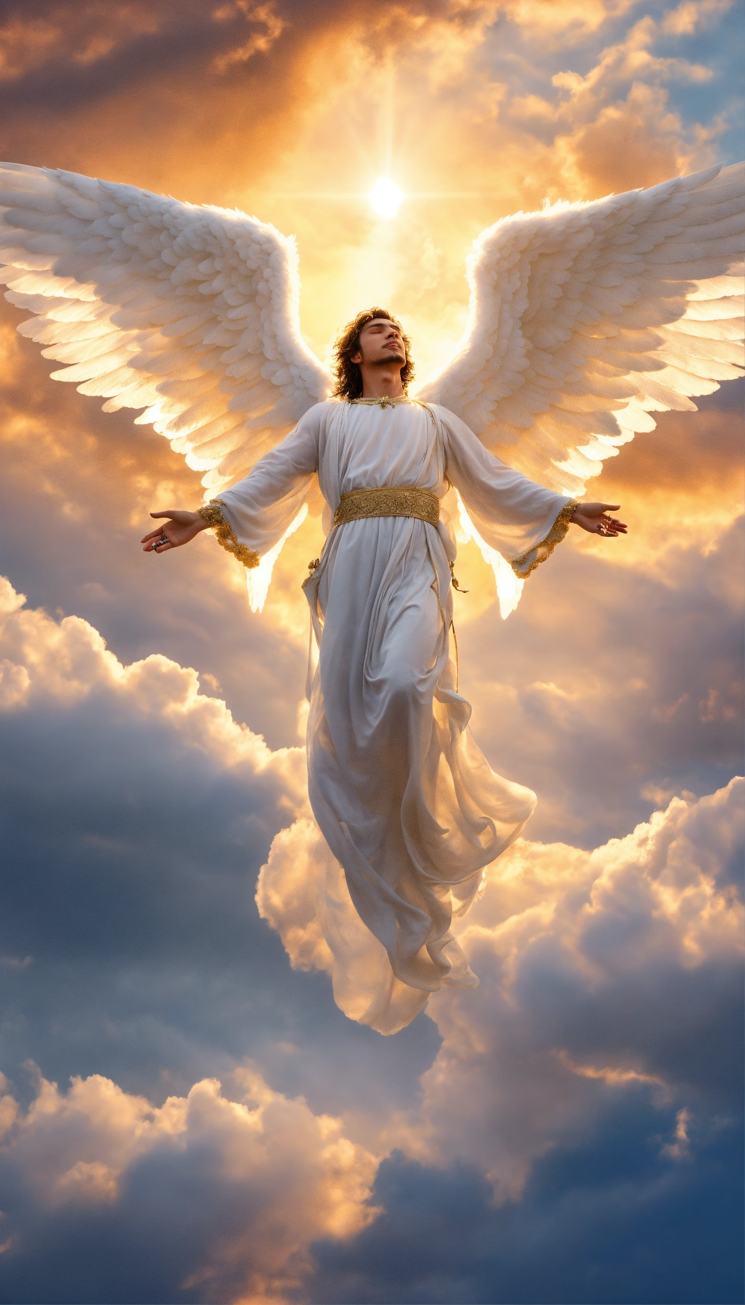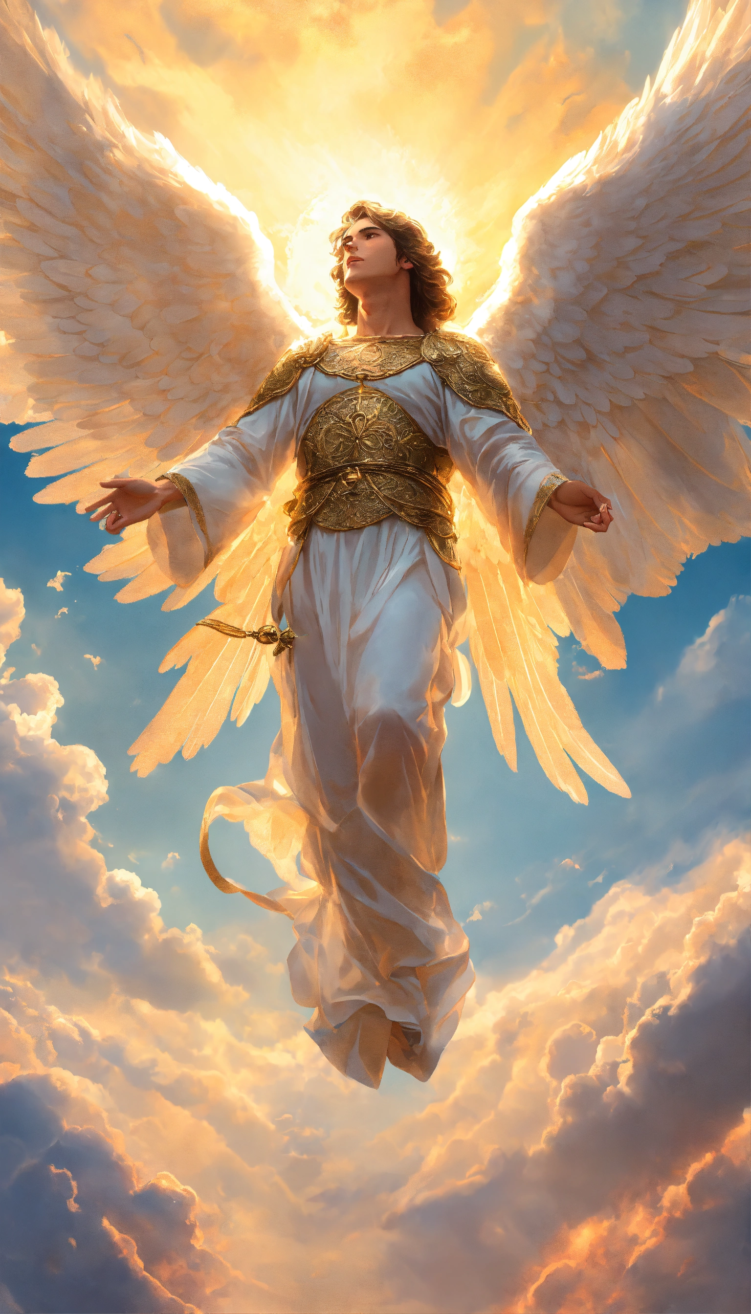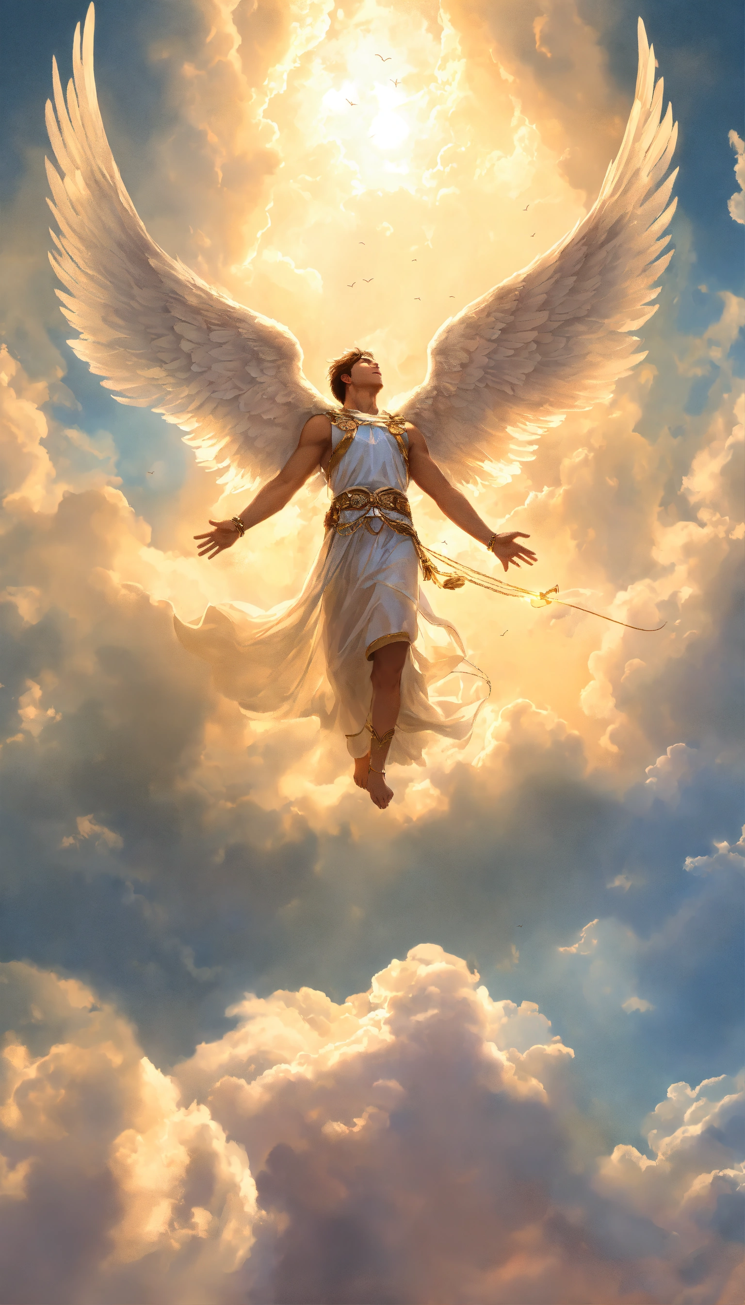 An angel with his wings spread comes in the sky above the clouds