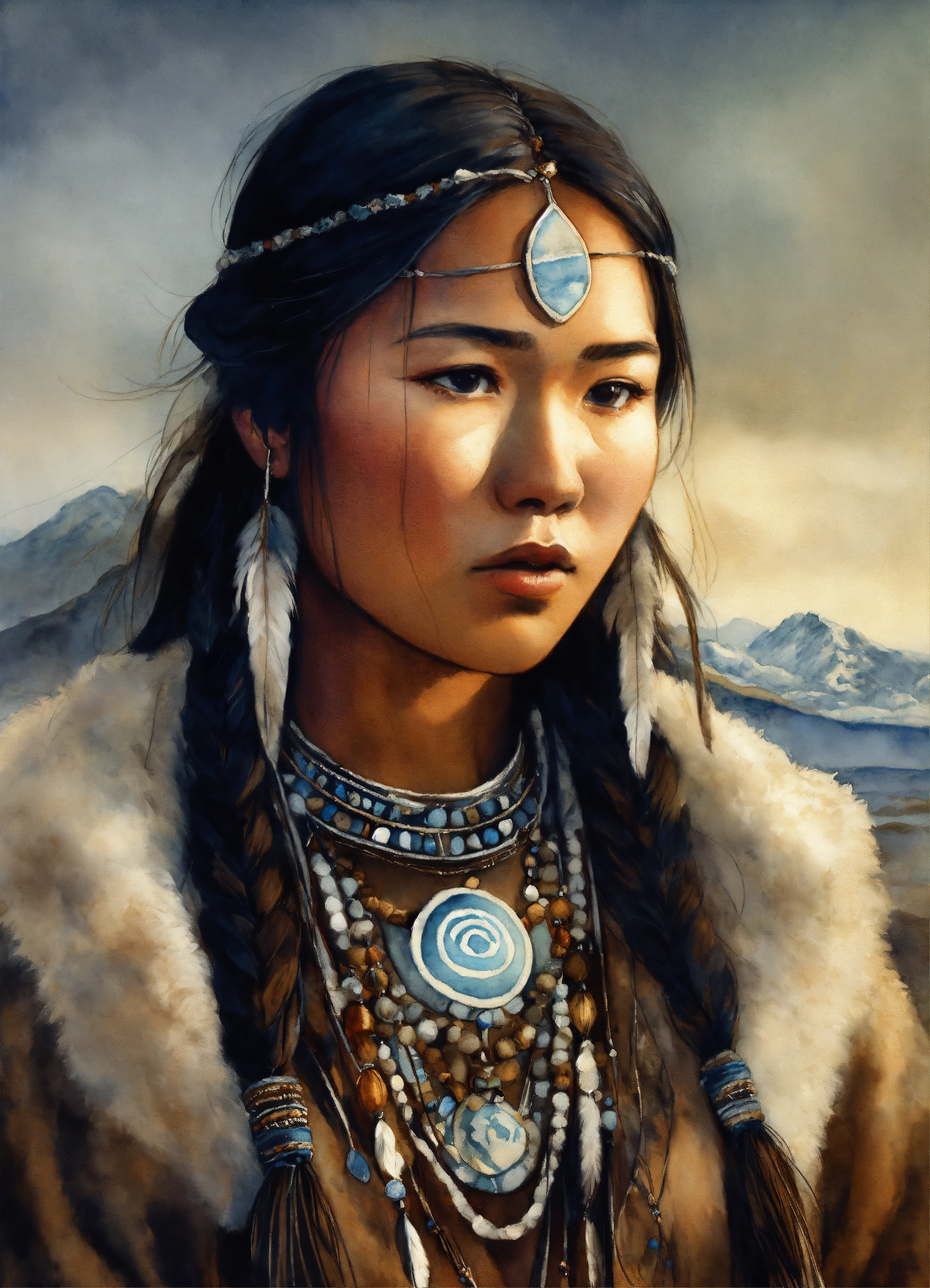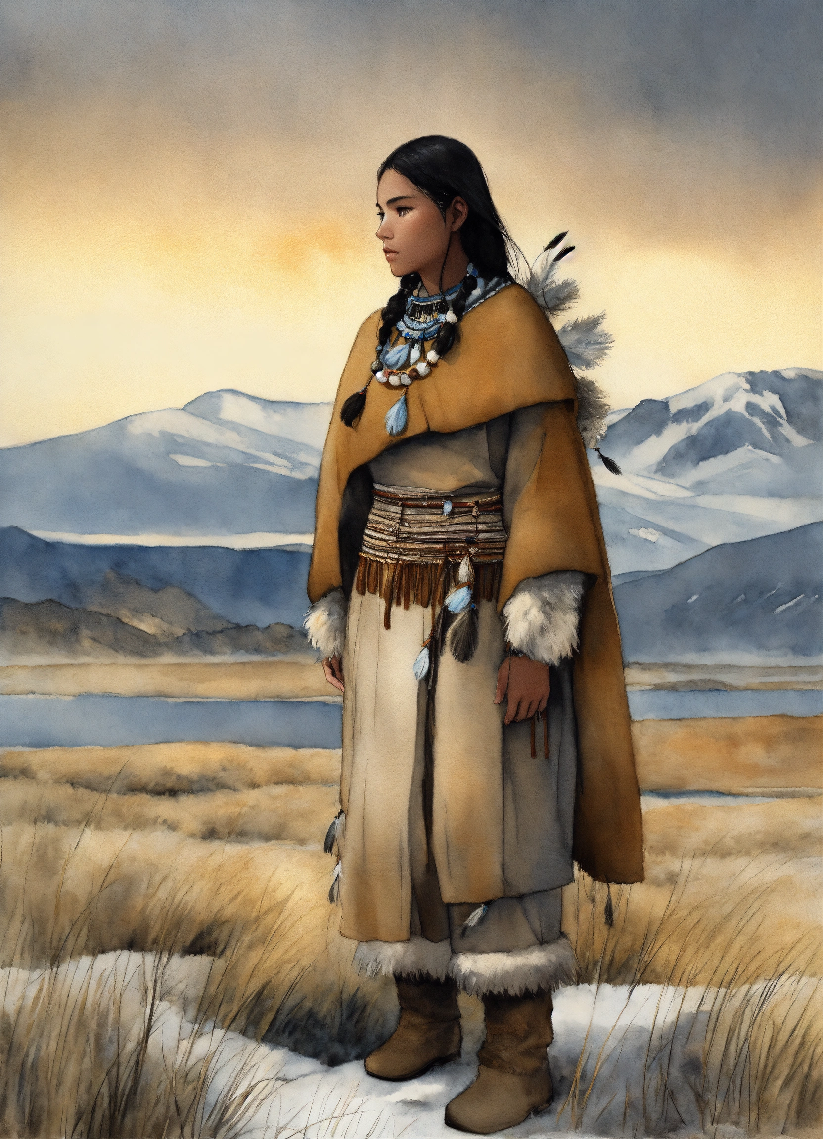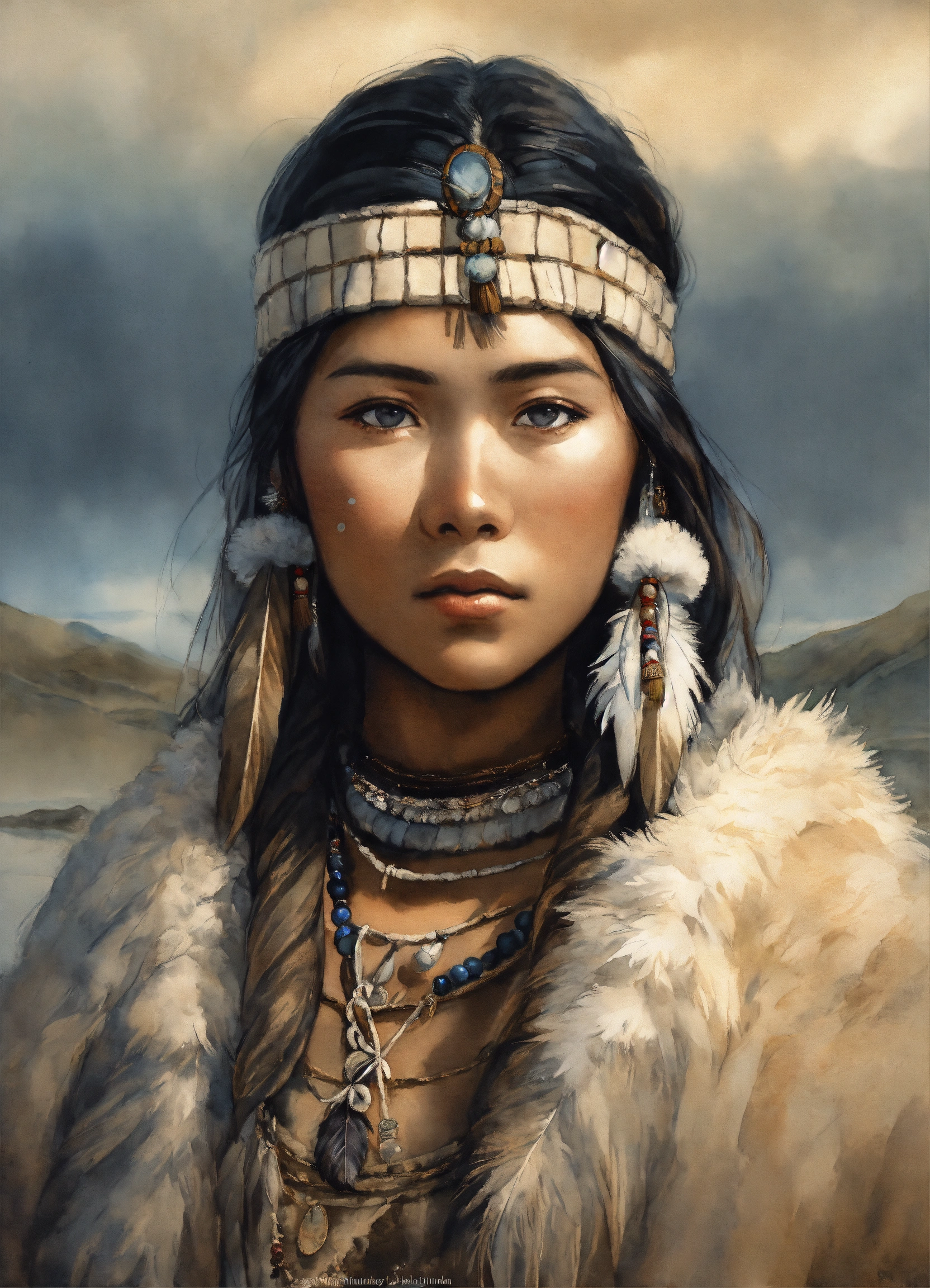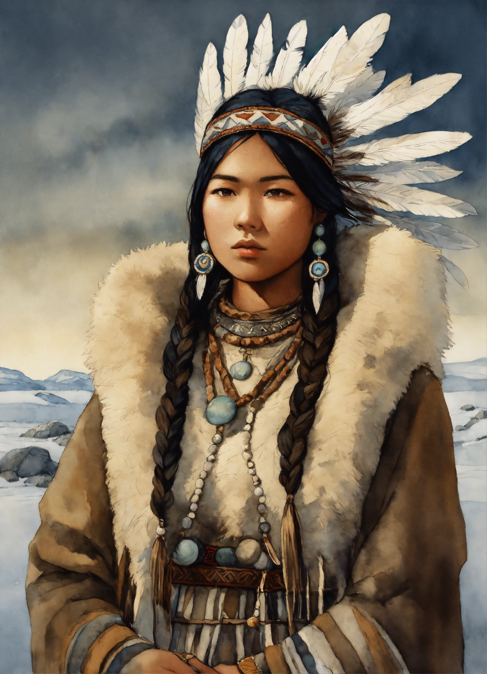 Illustration of an inuit woman, young, 18 years old, beautiful, native american phenotype, wearing stone age clothing made from natural fabrics like linen, cotton, or furs, adorned with feathers, beads and shells, stading on the tundra steppe landscape, watercolors, gloomy and depressing ambient, dramatic lighting, high detailed, artwork by tom björklund