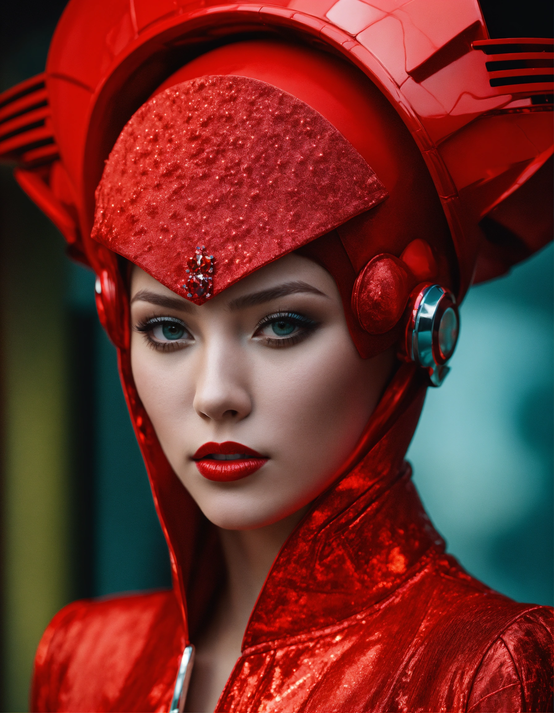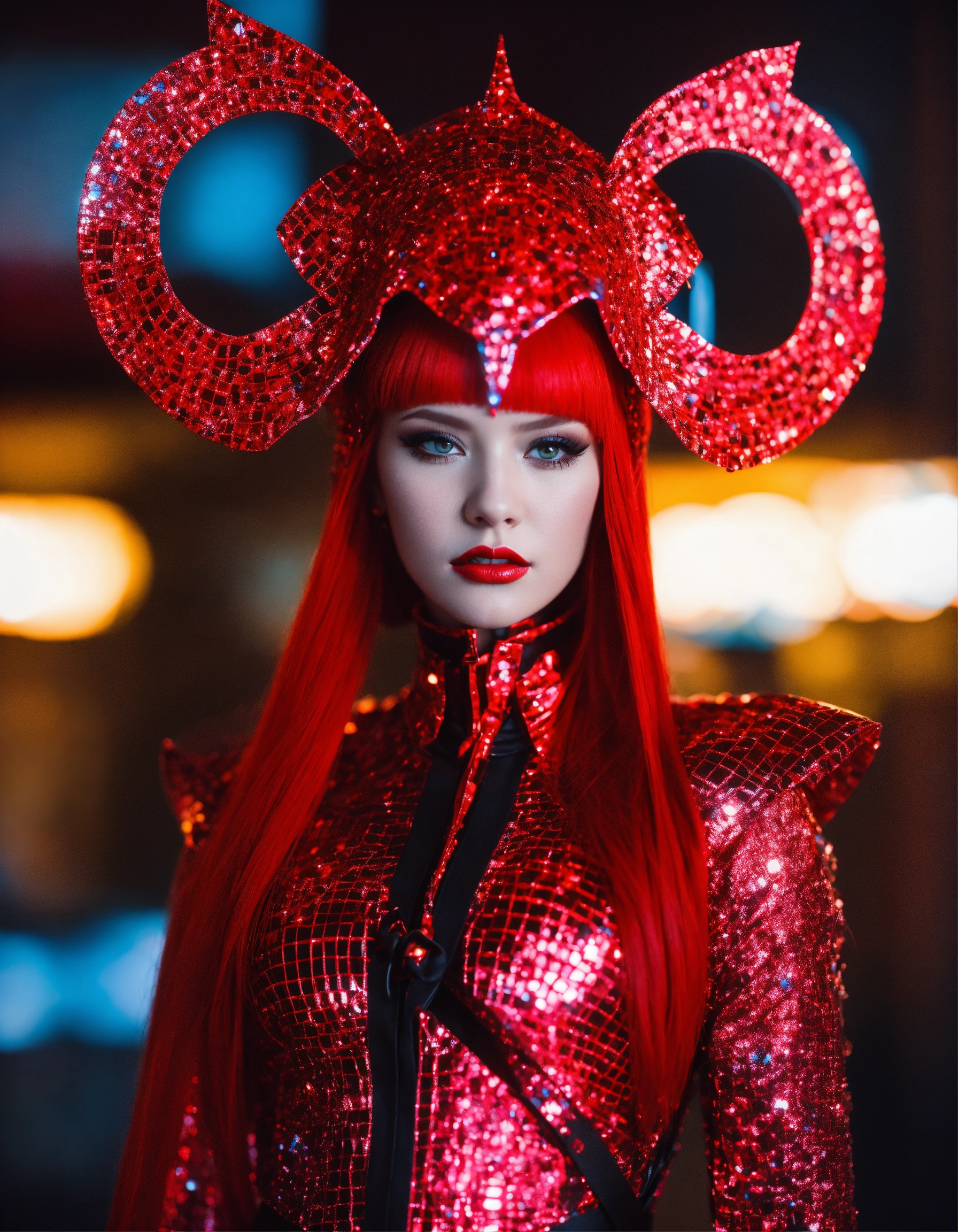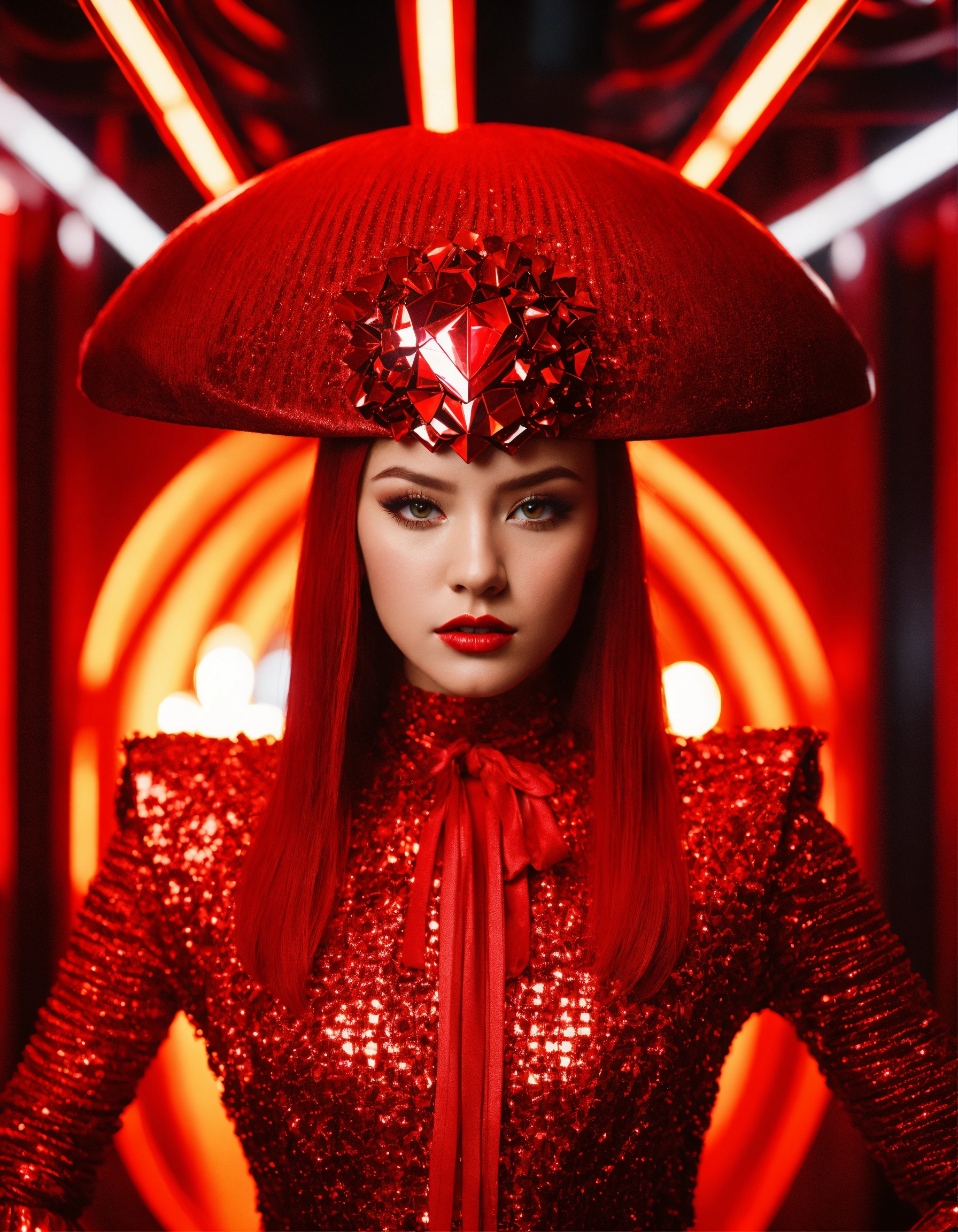 A beautiful redhead female pop artist all red sleek futuristic outfit, with huge headpiece center piece, clean makeup, with depth of field, fantastical edgy and regal themed outfit, captured in vivid colors, embodying the essence of fantasy, minimalist, film grain, elegant, beautiful, highly detailed, sharp focus, studio photography, xf iq 4, 150 mp, 50 mm, iso 200, 1/1 60 s, realistic, natural light, octane render, adobe lightroom, rule of thirds, symmetrical balance, depth layering, polarizing filter, sense of depth, ai enhanced