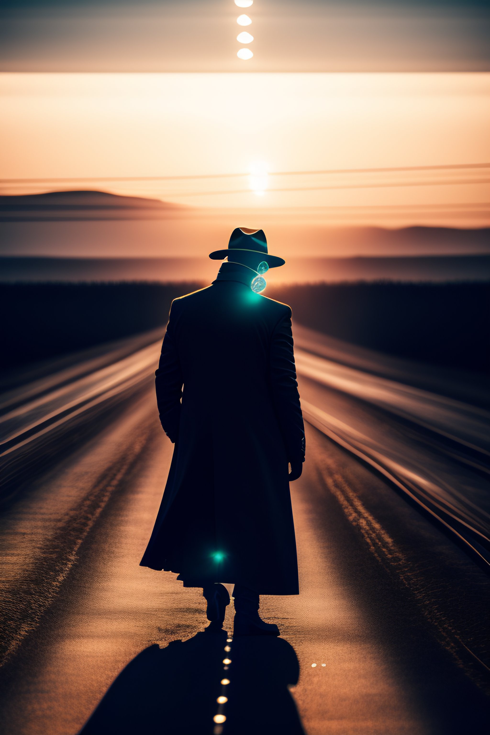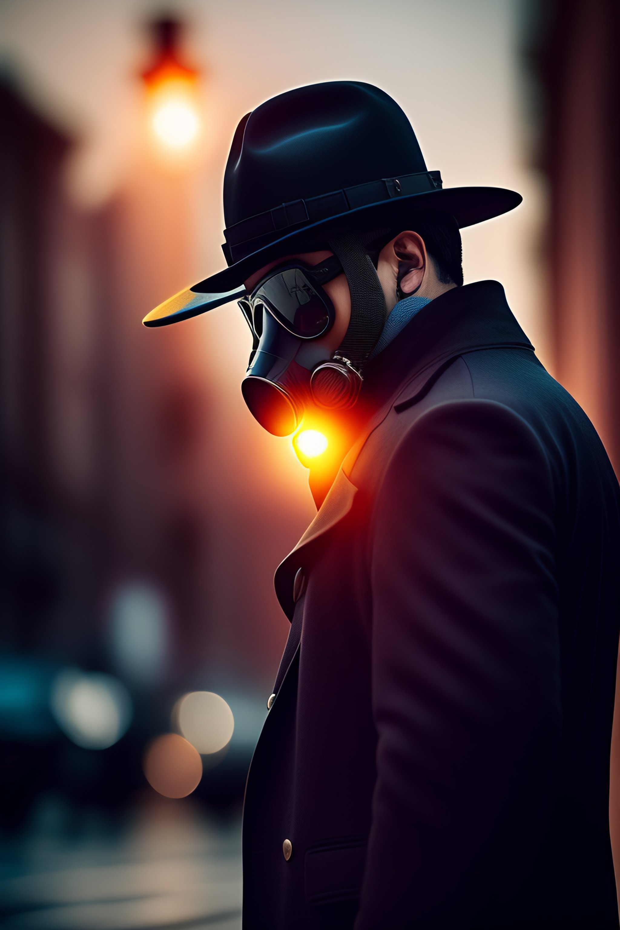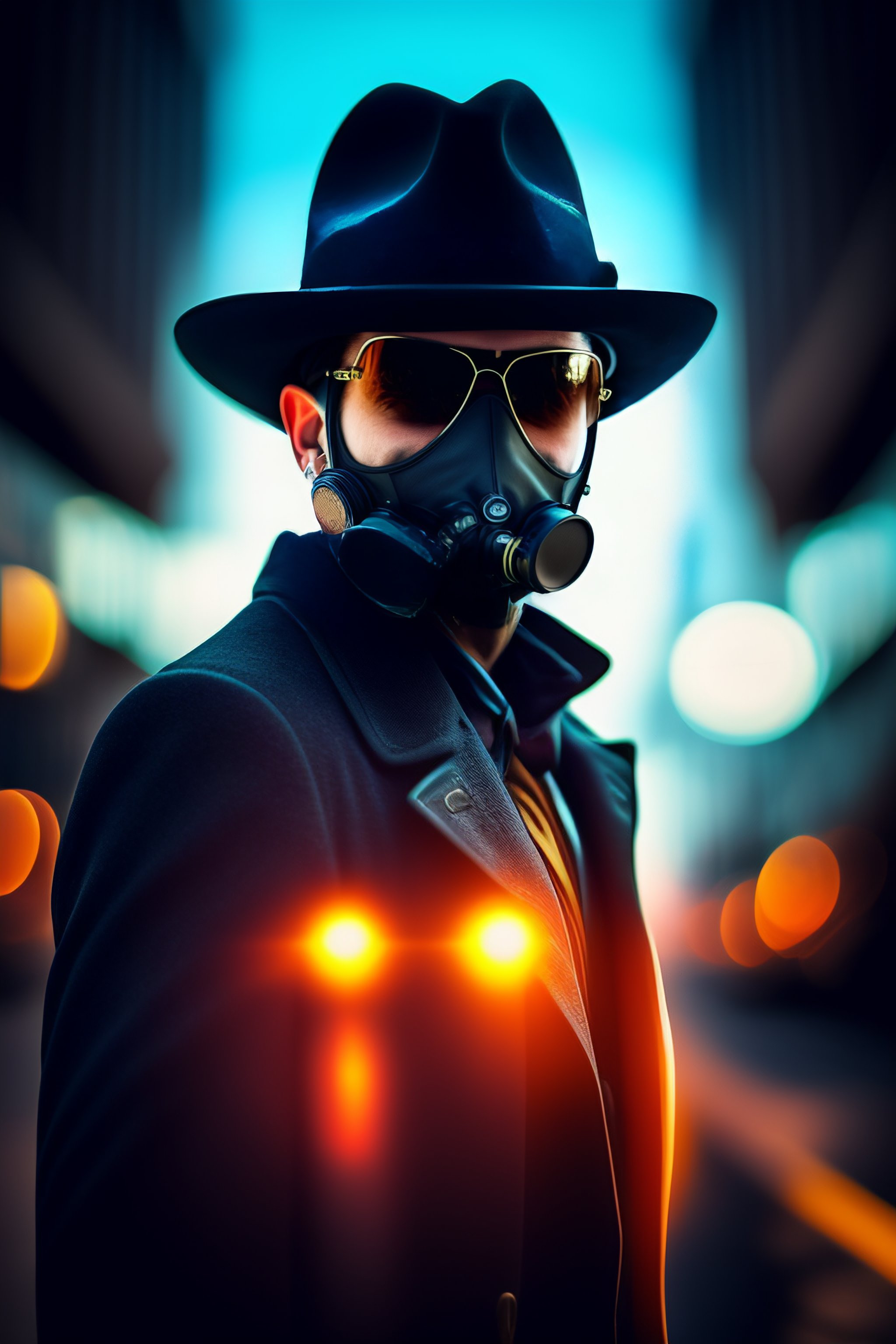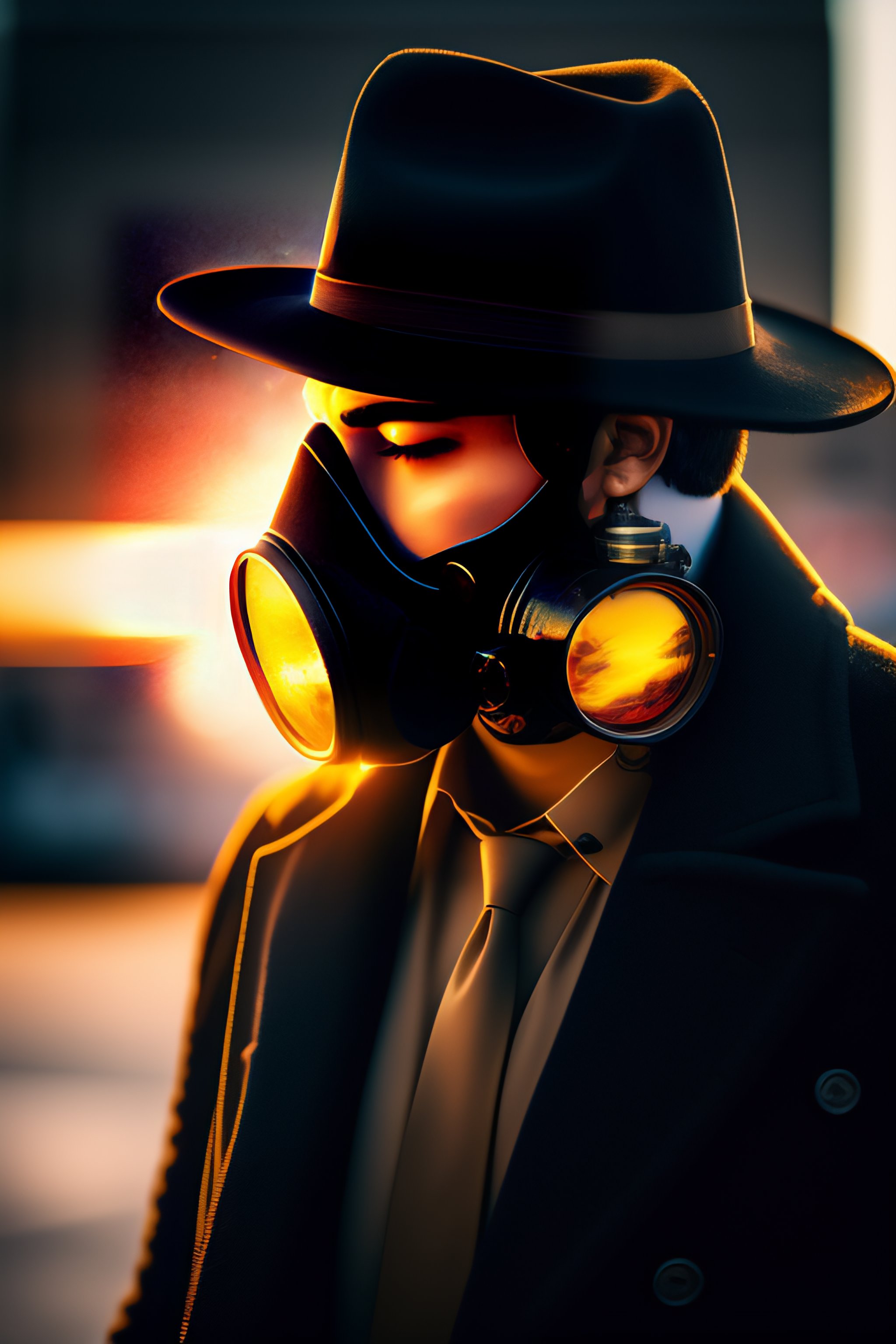 A man wearing a fedora hat, sunglasses, trenchcoat and a gas mask, a character portrait by fred a. precht, reddit contest winner, neoism, darksynth, sabattier filter, anamorphic lens flare