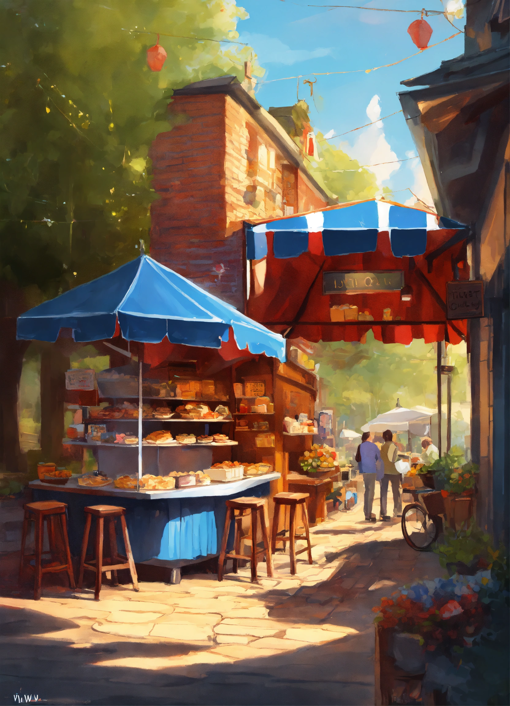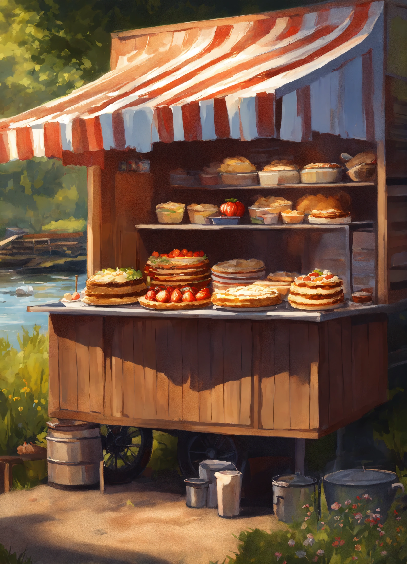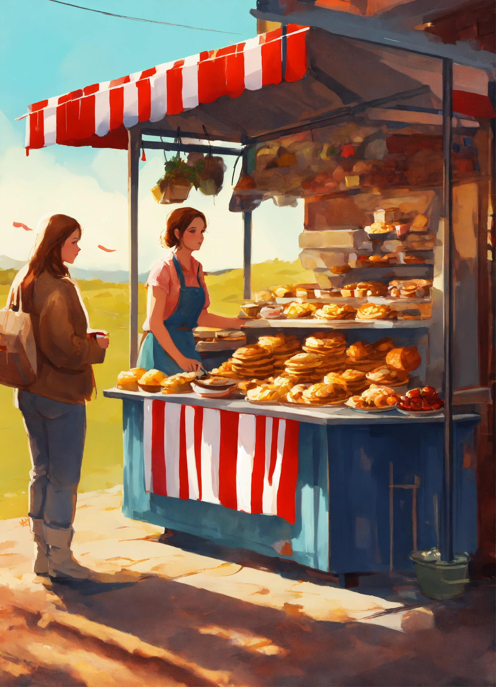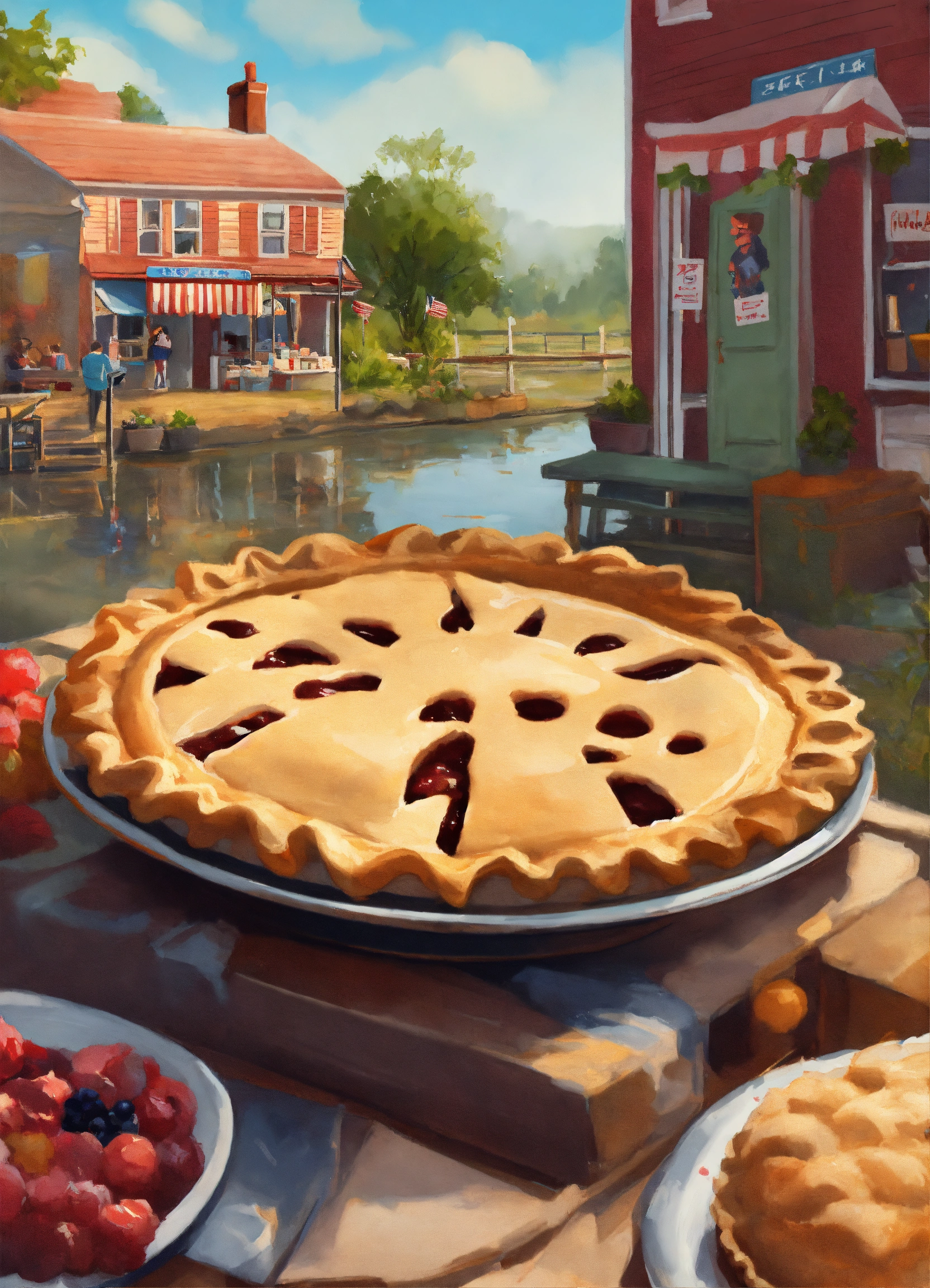 American, digital painting, gorgeous, sharp focus, illustration, intricate, friendly, cozy, day, pie stall, wilow creek