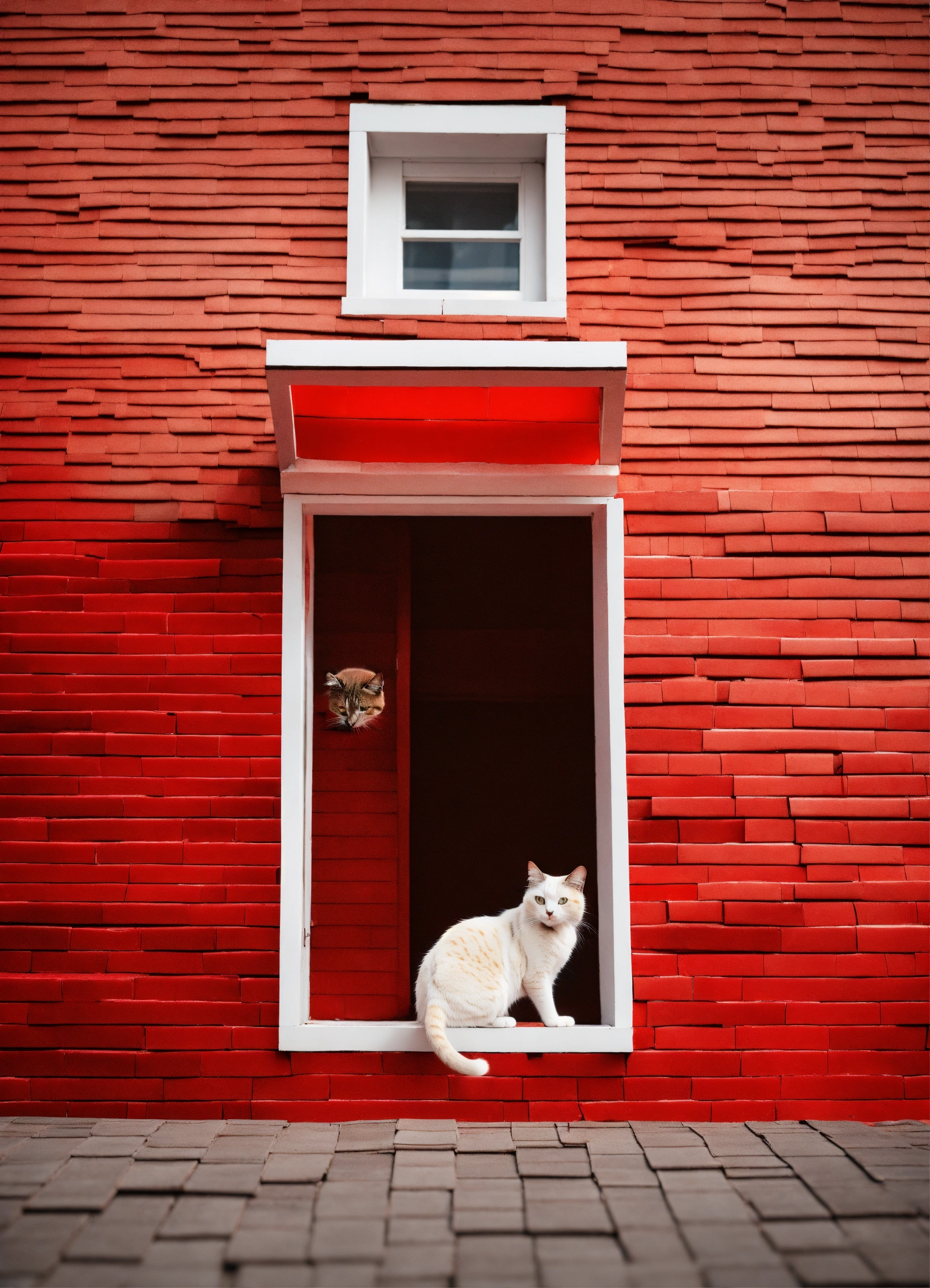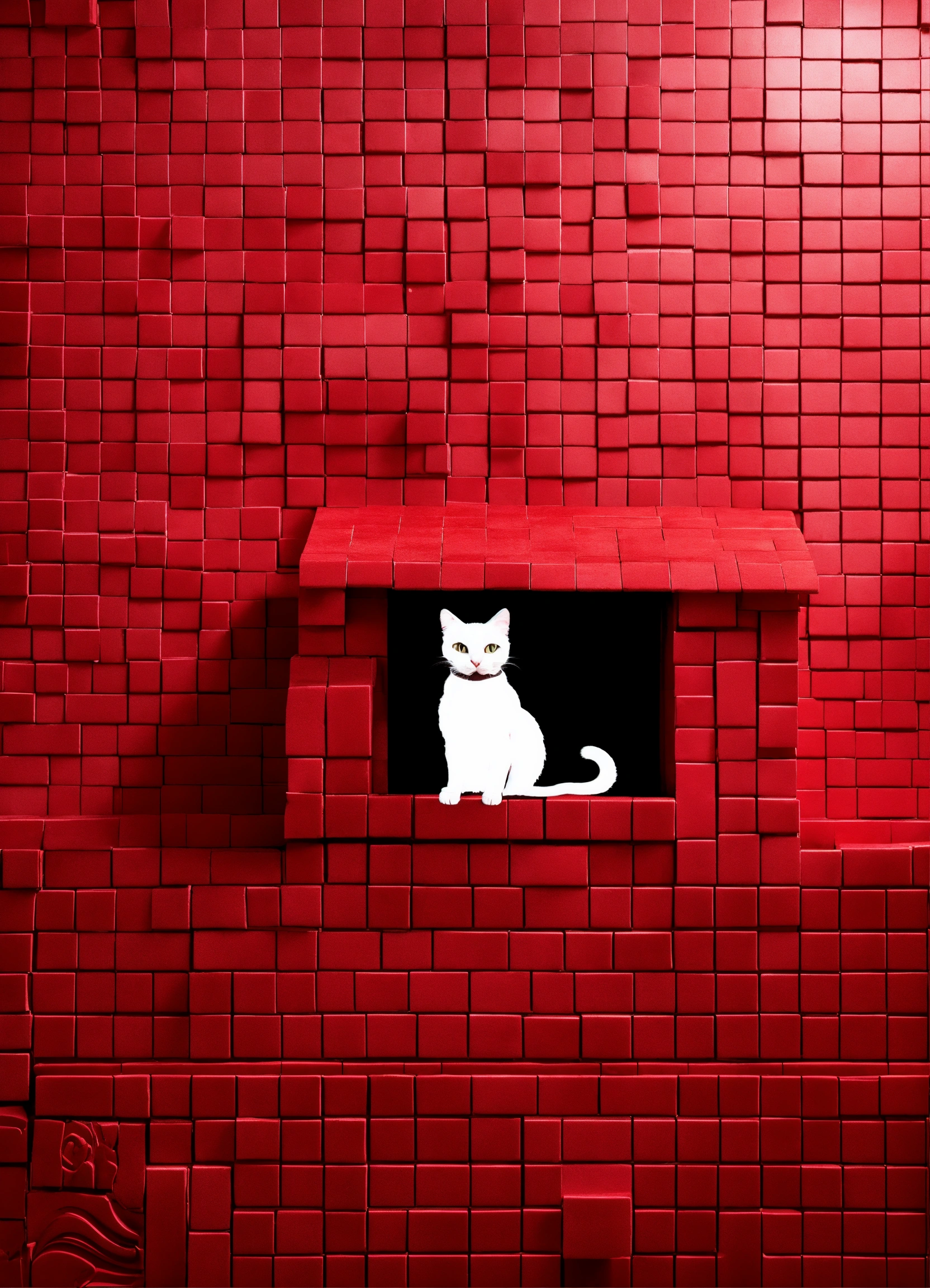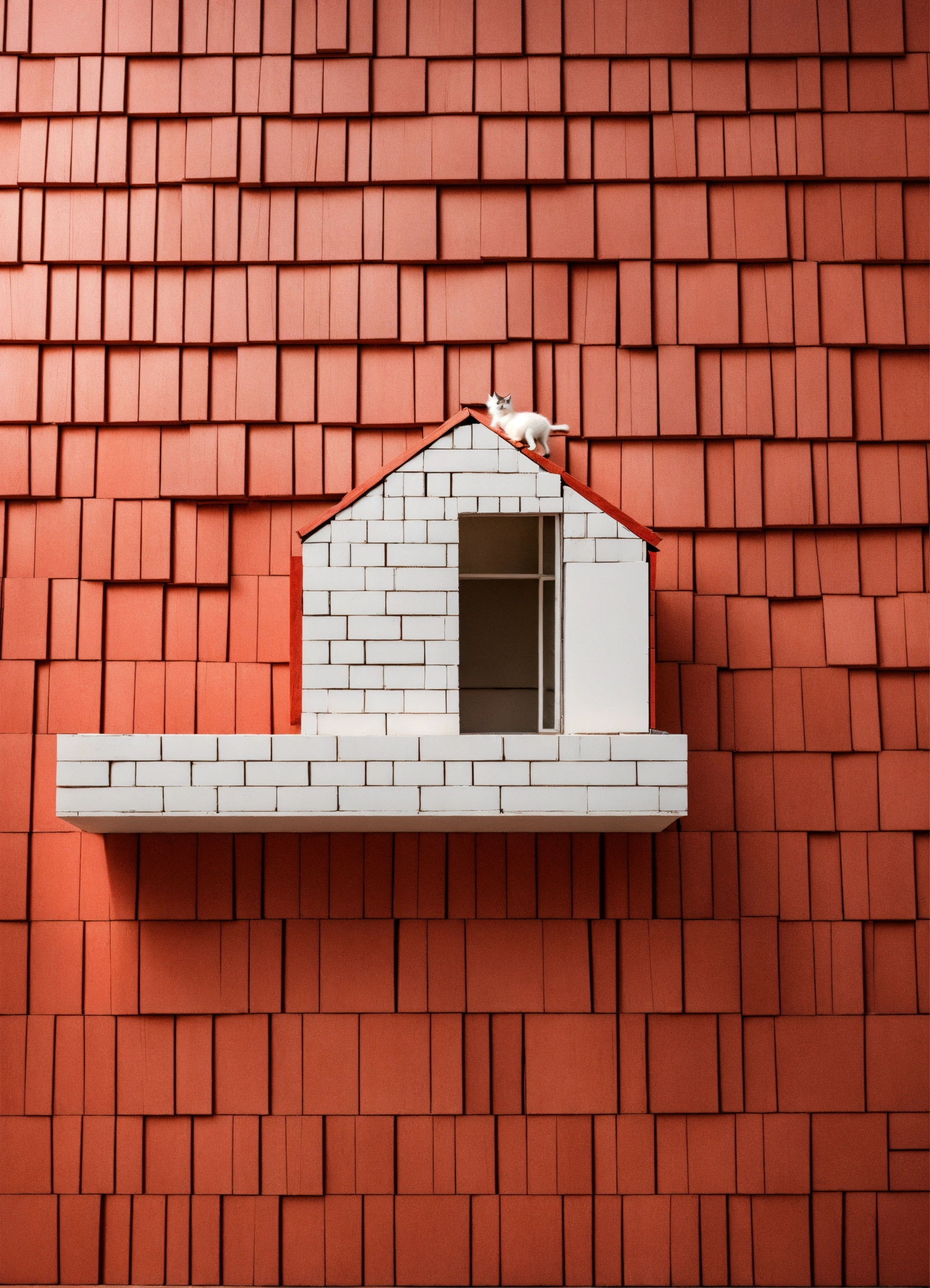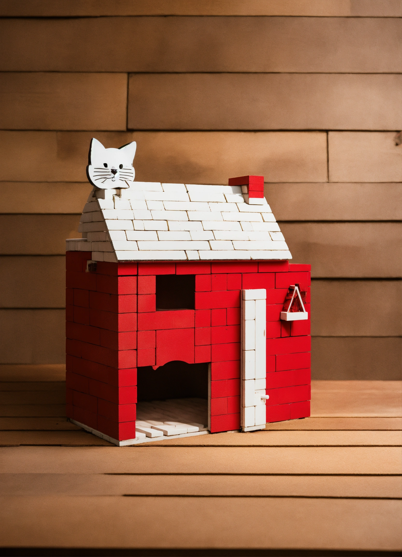 White bricks background, against this background there is a house for a cat, very stylish, made of plywood with dereveco logo, the small logo is applied with laser on the right side of the roof, inside lies a red cat with a white chest