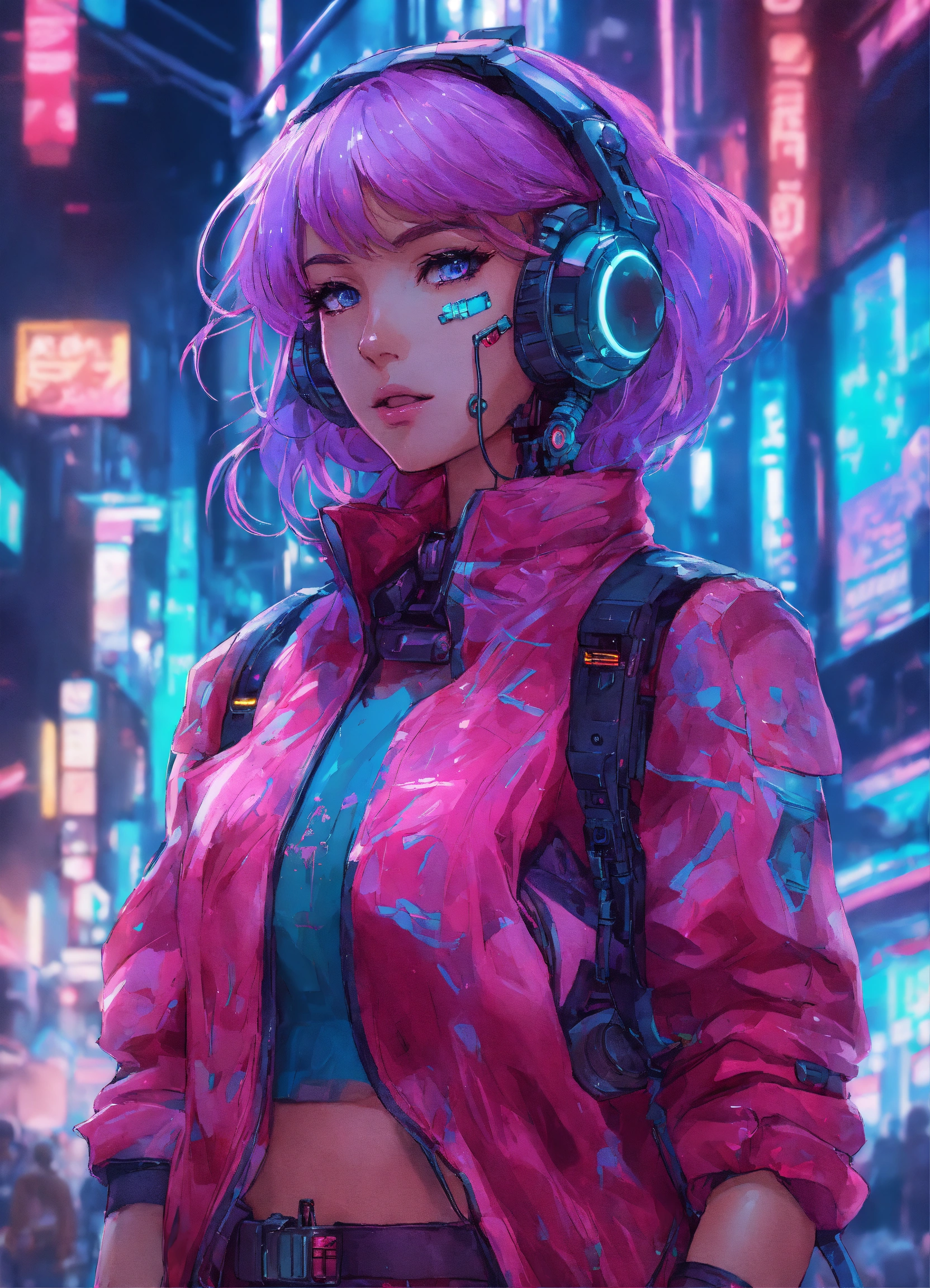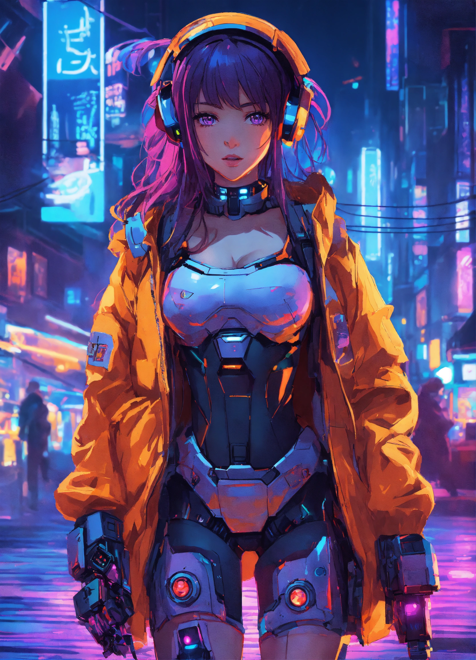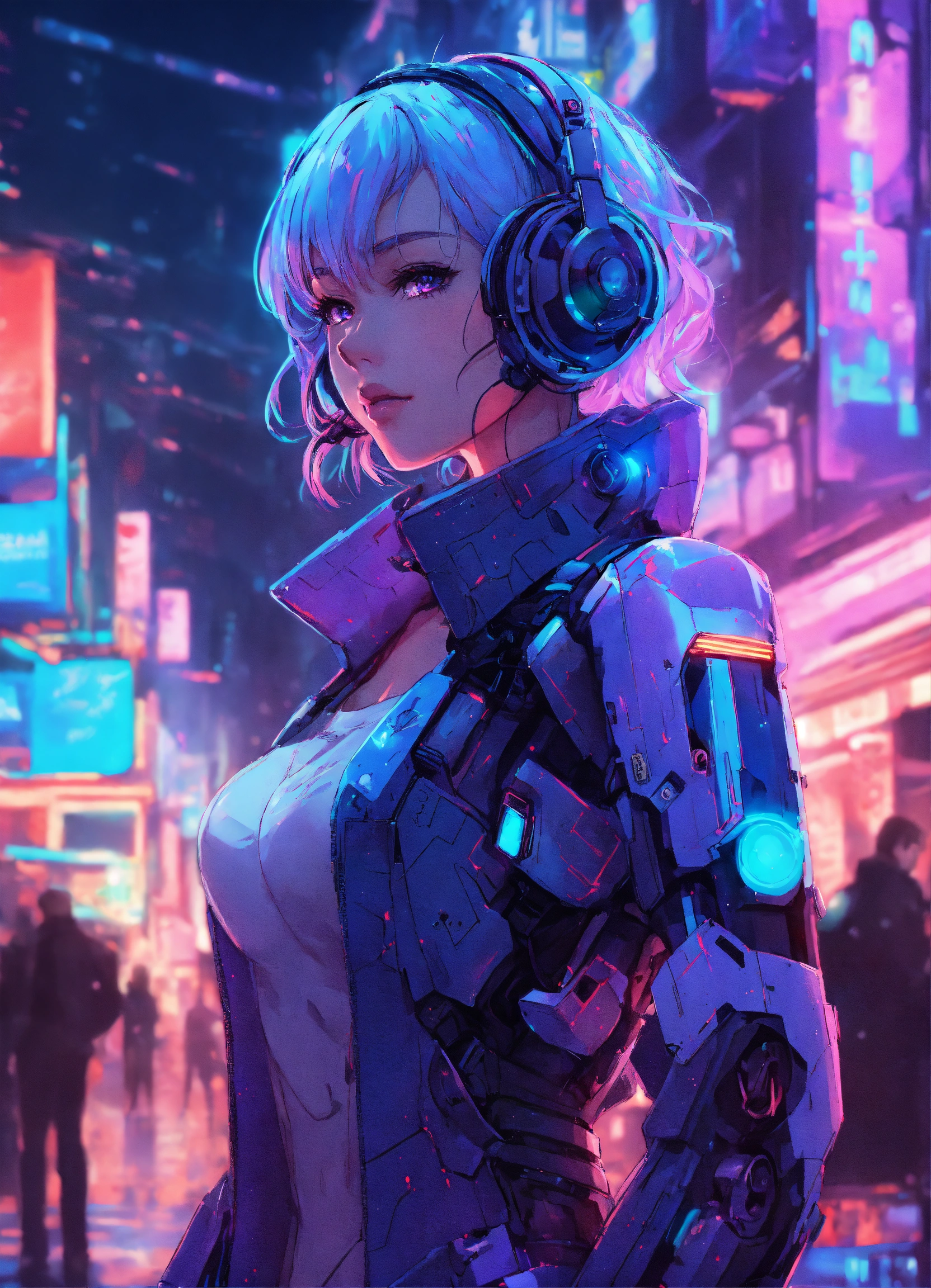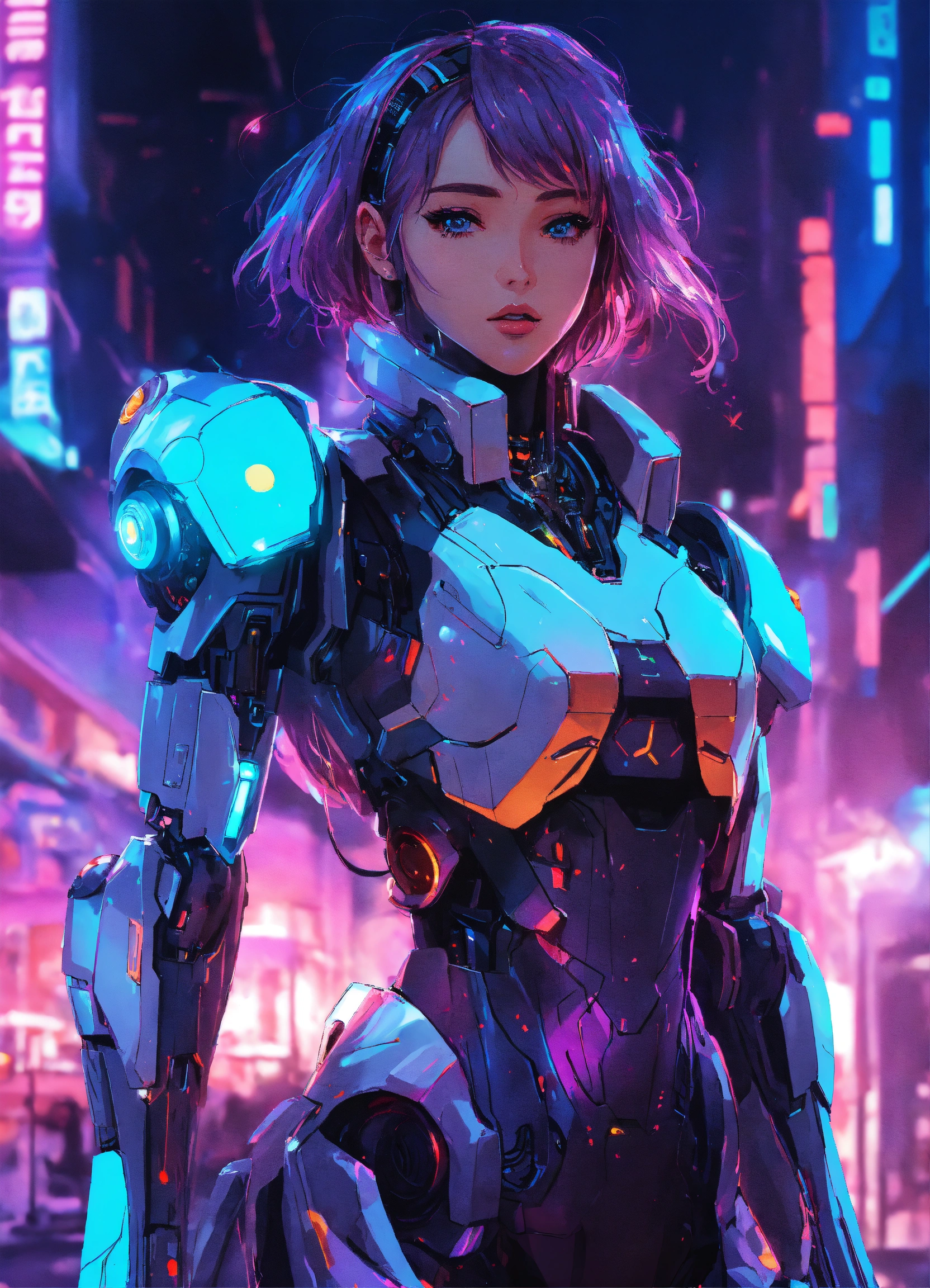 In a detailed anime style with beautiful, exquisite artwork, illuminate a scene featuring a robotic girl. use vibrant neon tones. the background should encompass a cyberpunk theme, lit with blue and purple lights.