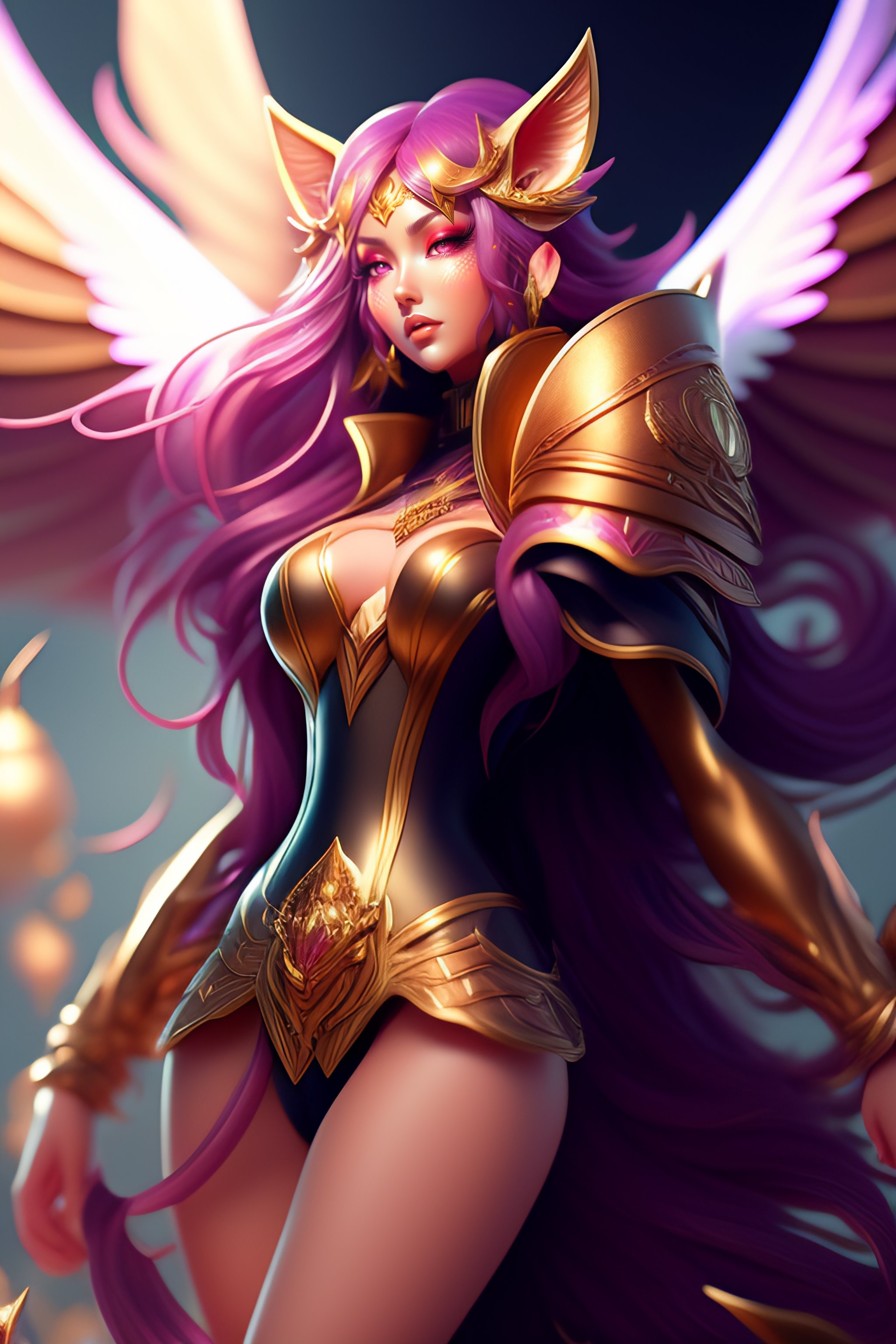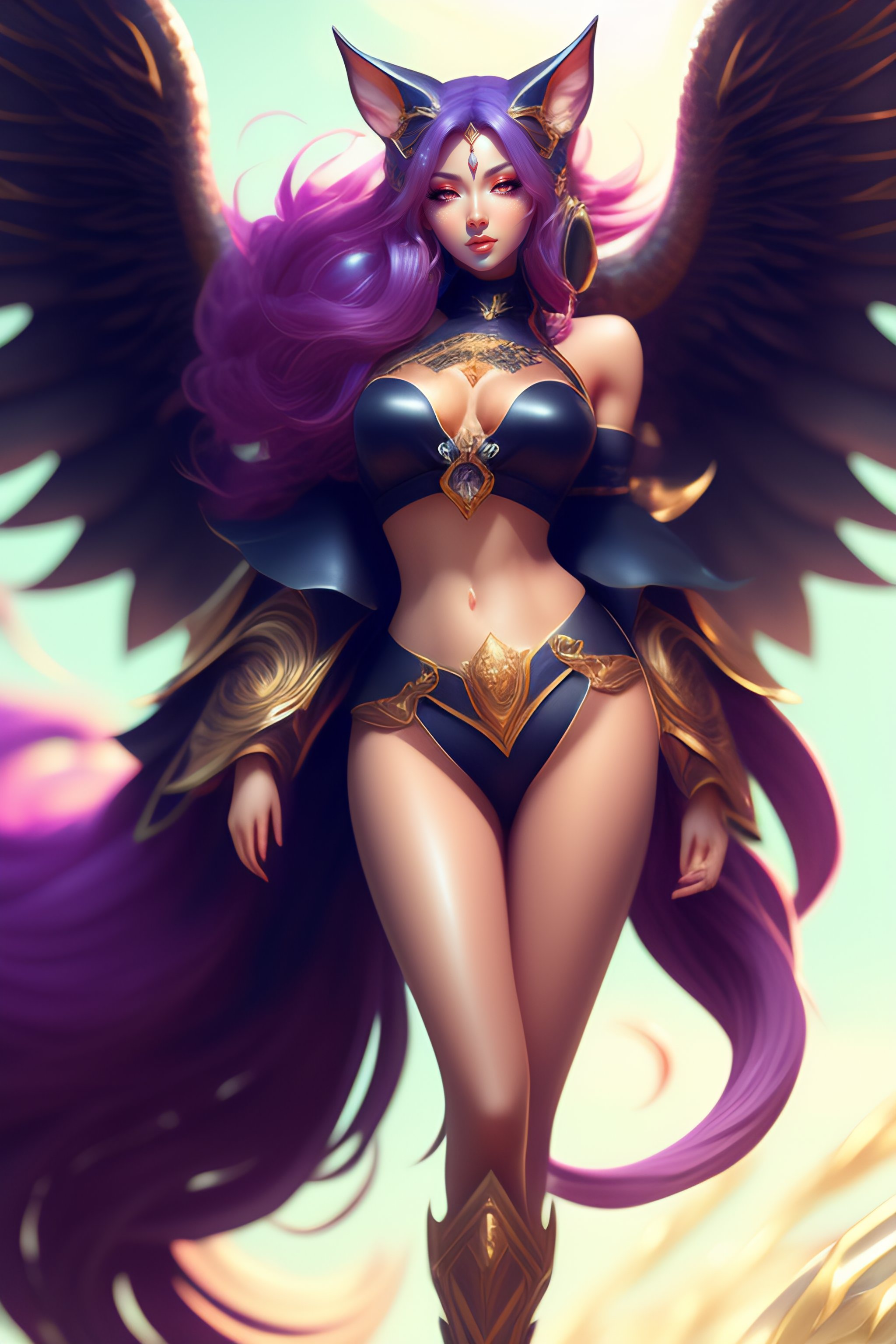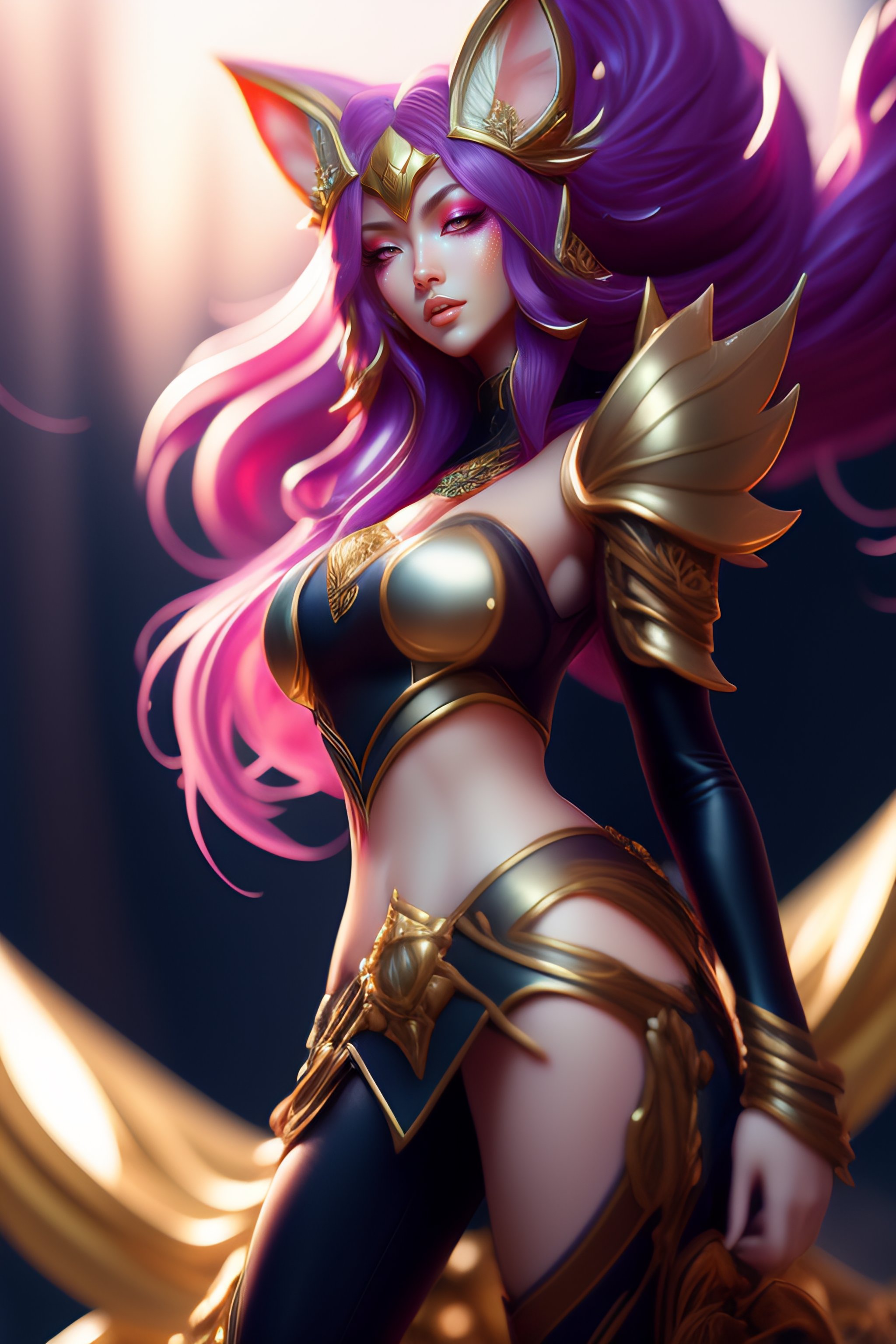 Portrait of a beautiful full body ahri from league of legends, dynamic pose, full body shot, fantasy, front light, intricate, smooth legs, thigh highs, high heels, highly detailed, digital painting, artstation, concept art, smooth, sharp focus, illustration, art by simon bisley and greg rutkowski and alphonse mucha, 8 k, spaceship bridge on background