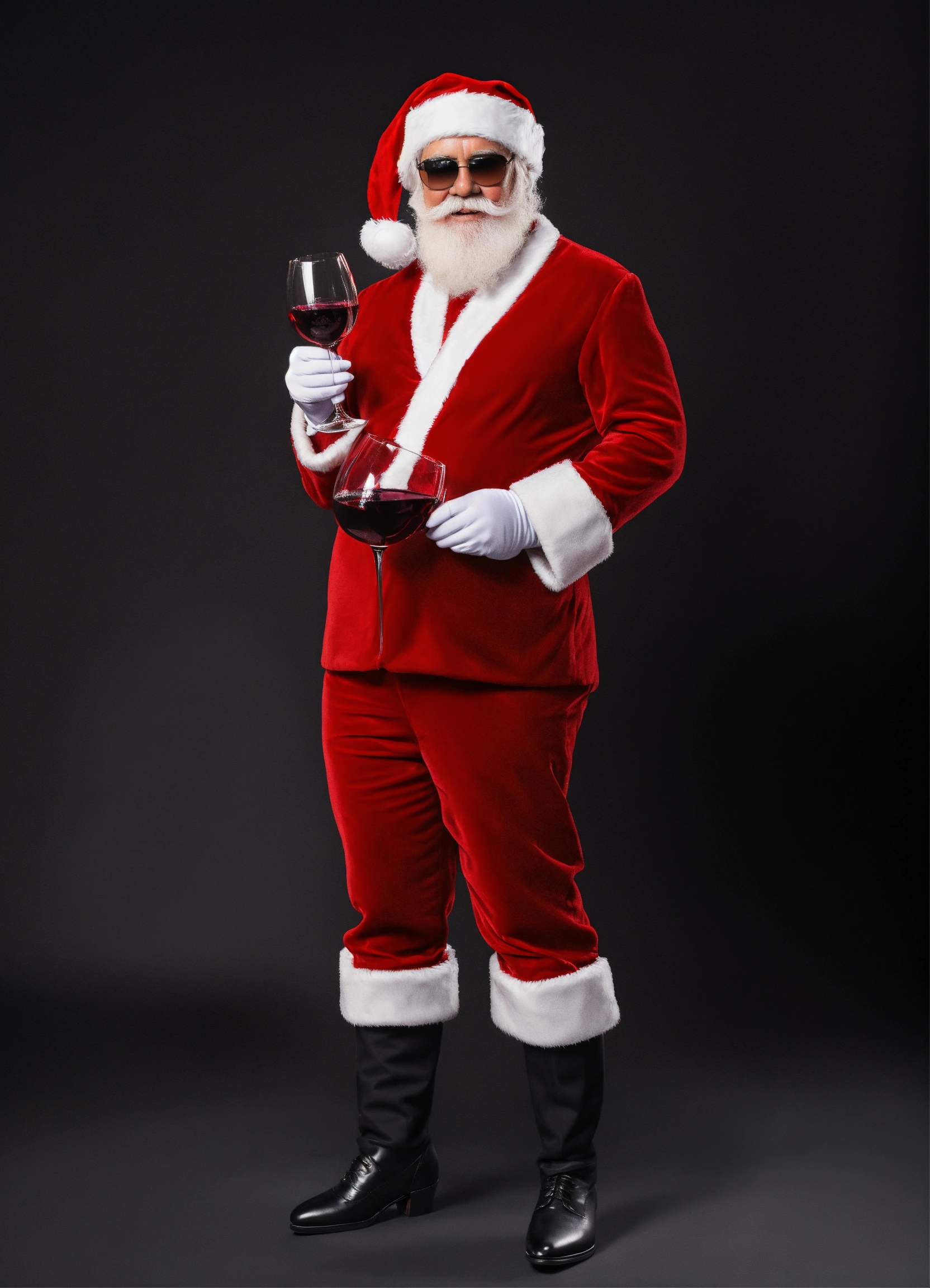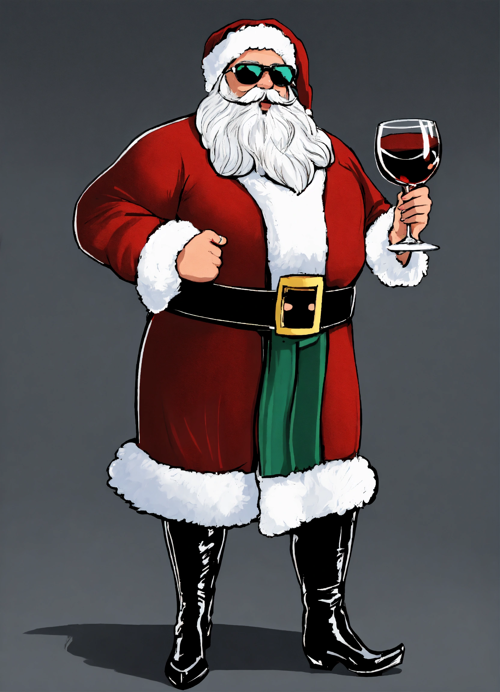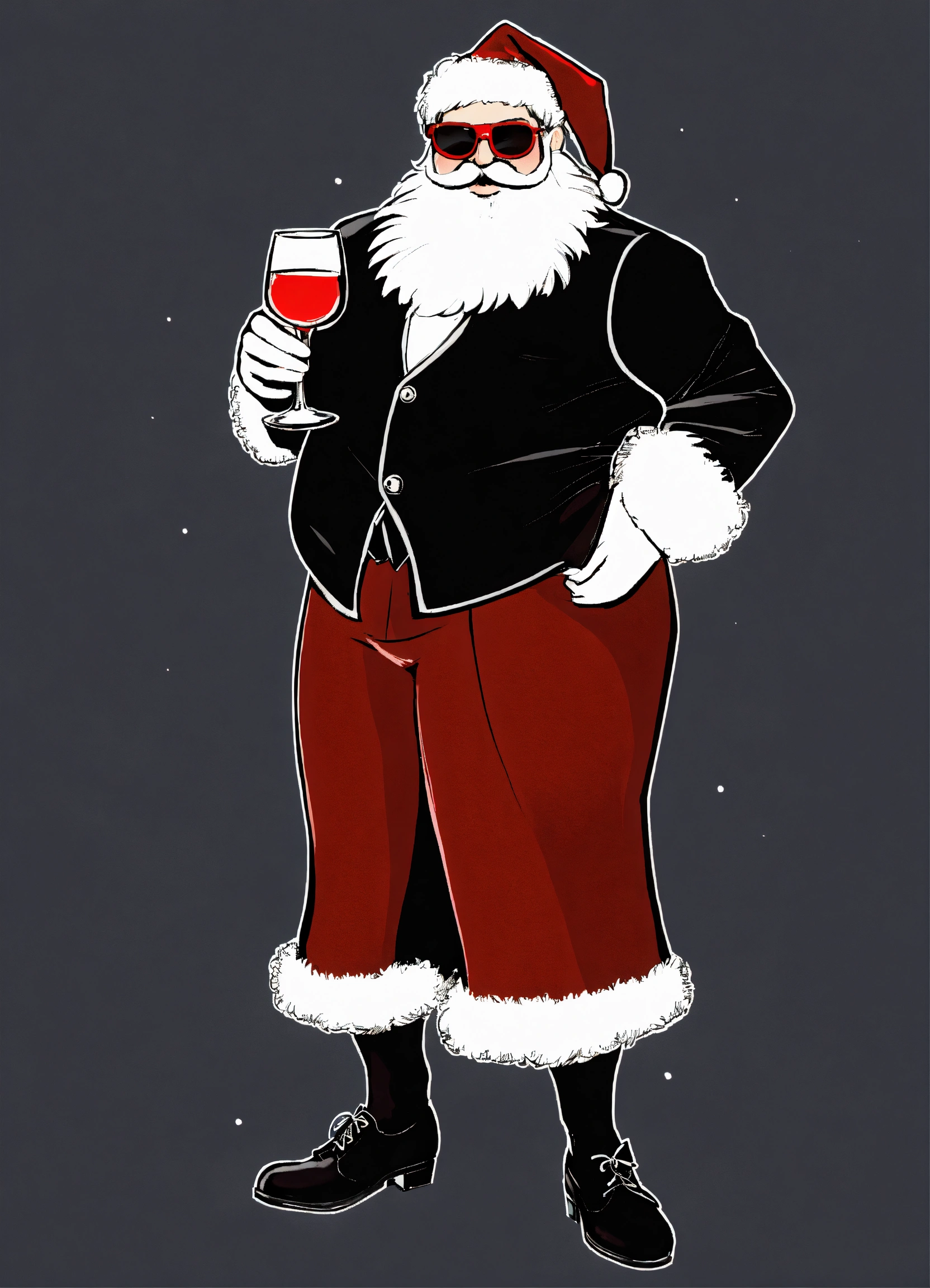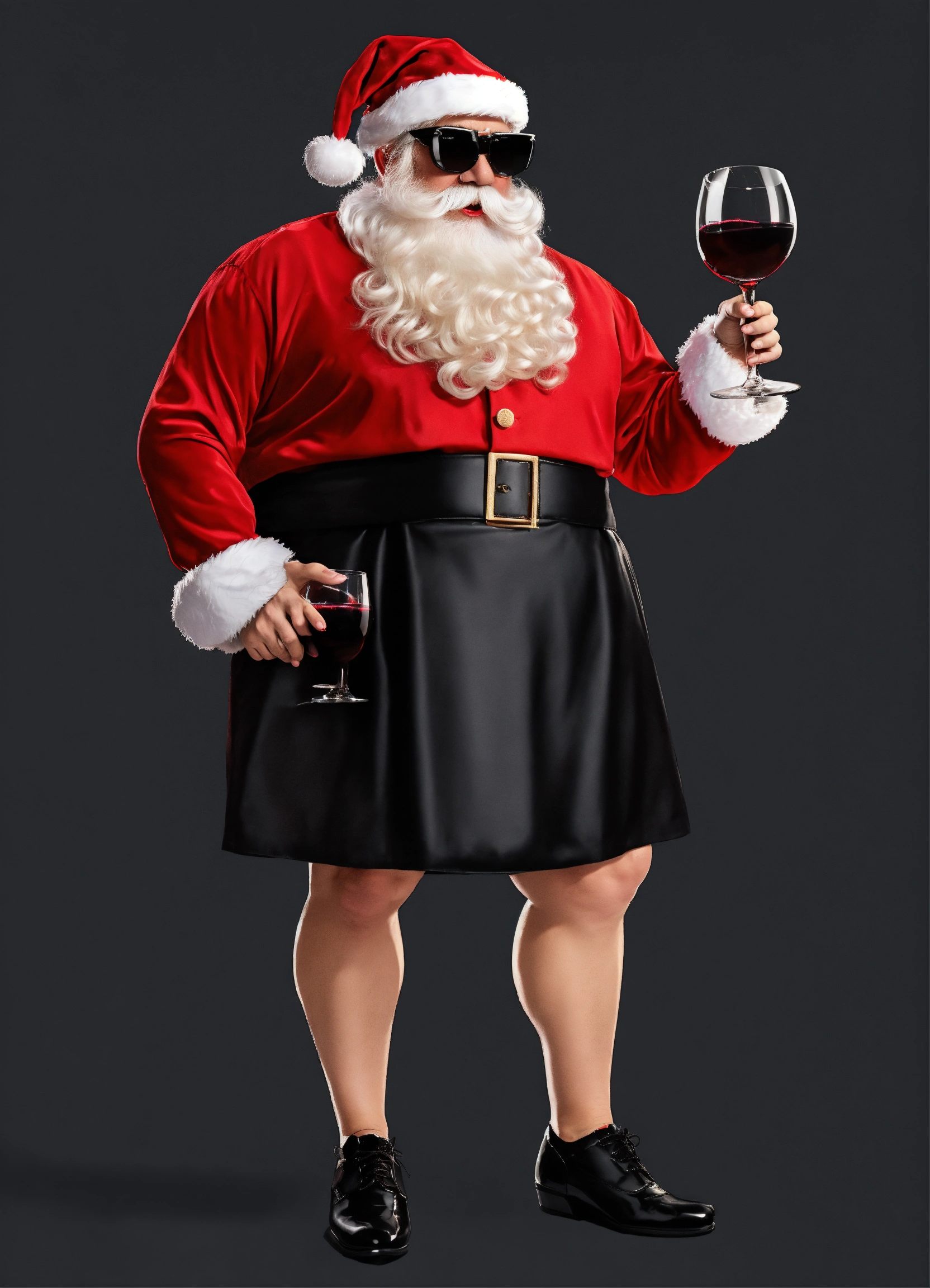 Santa as a man in a mini skirt wearing high heels and sunglasses, holding two glasses of red wine, full shot, plain black background suitable for a png, cartoon style