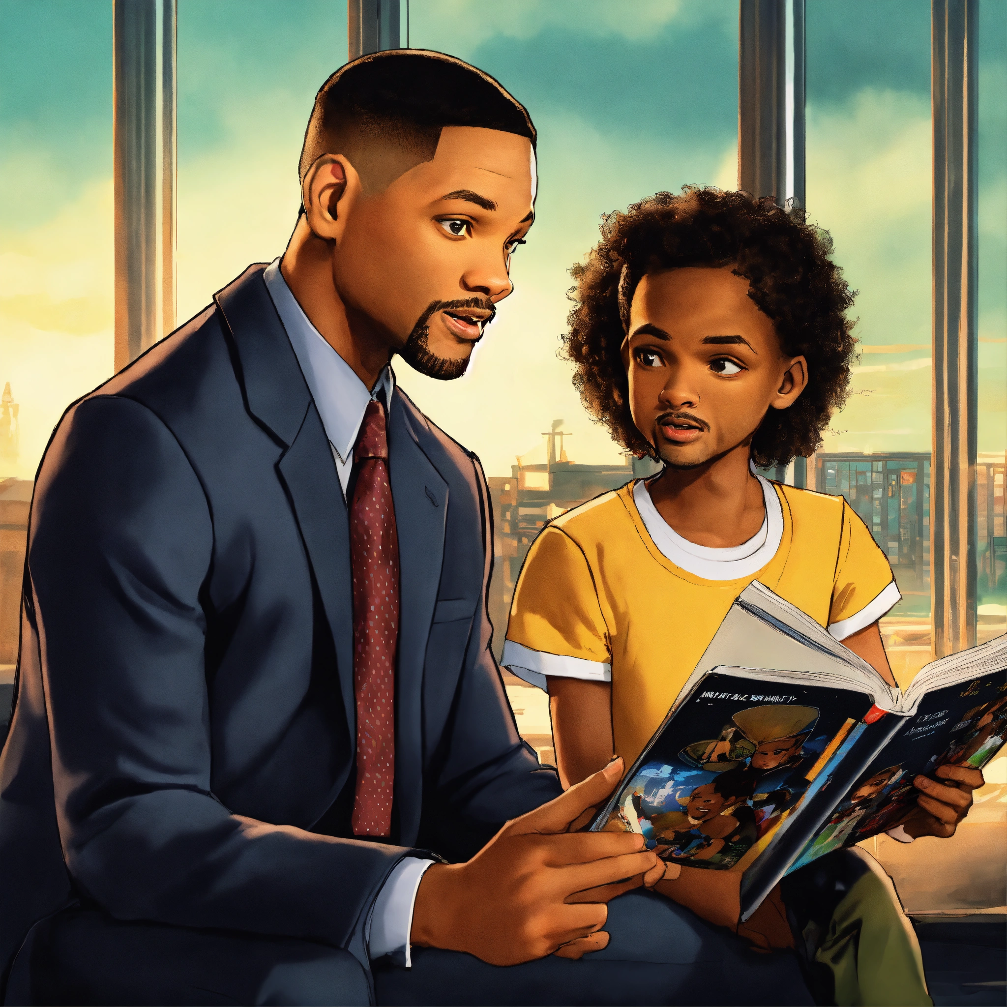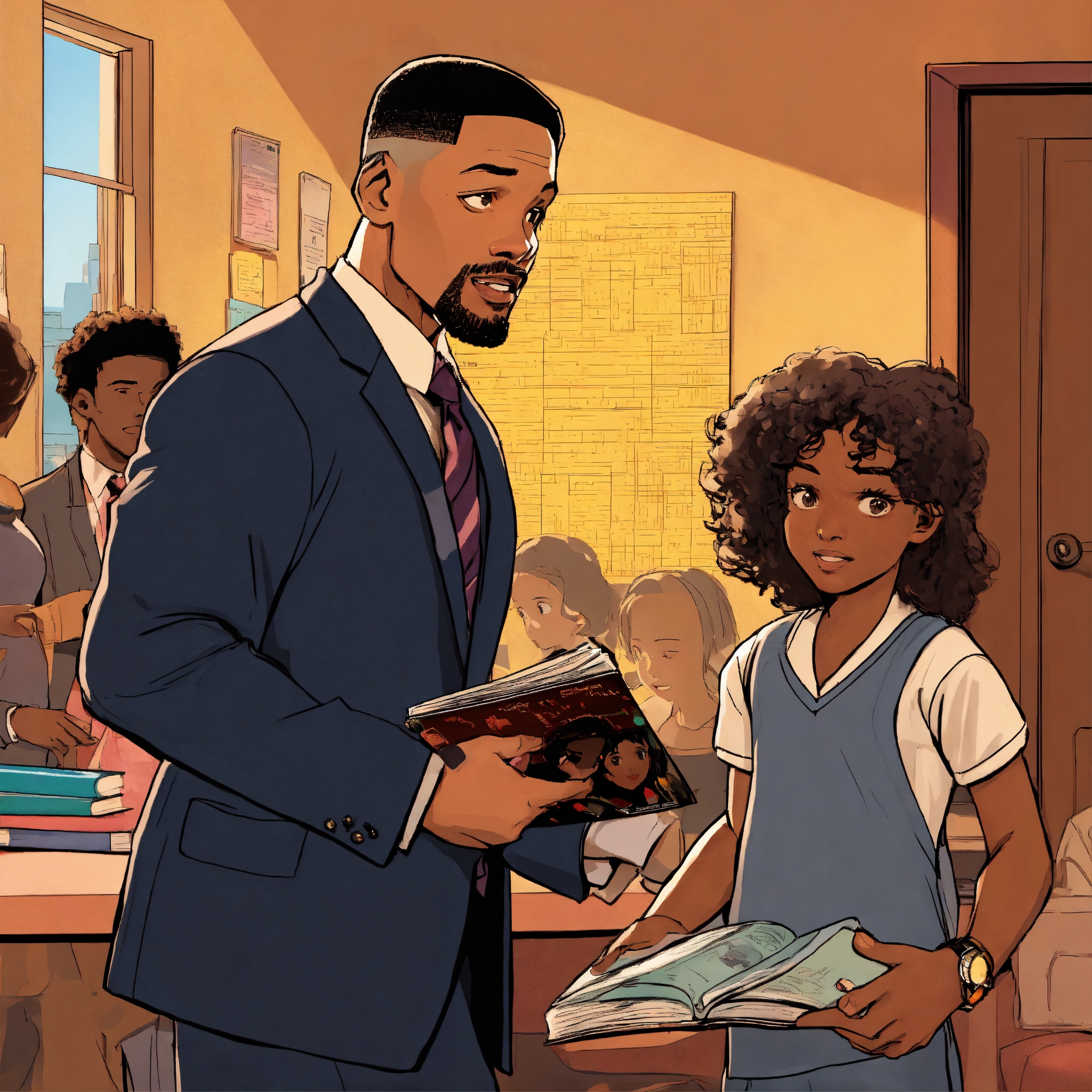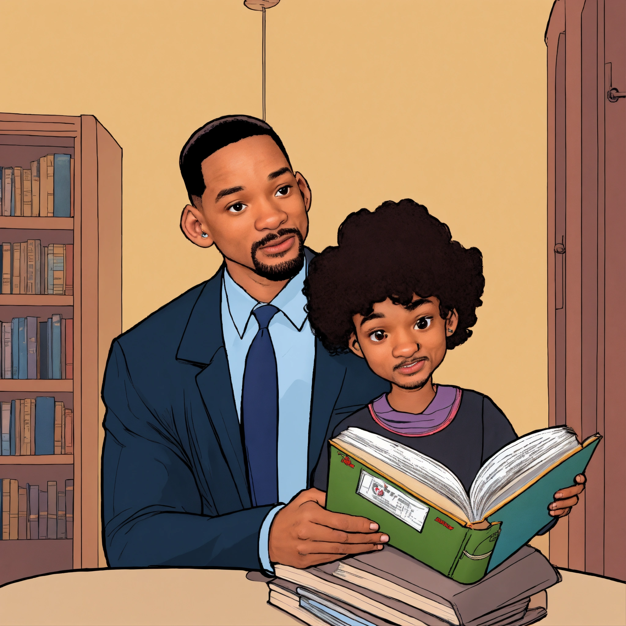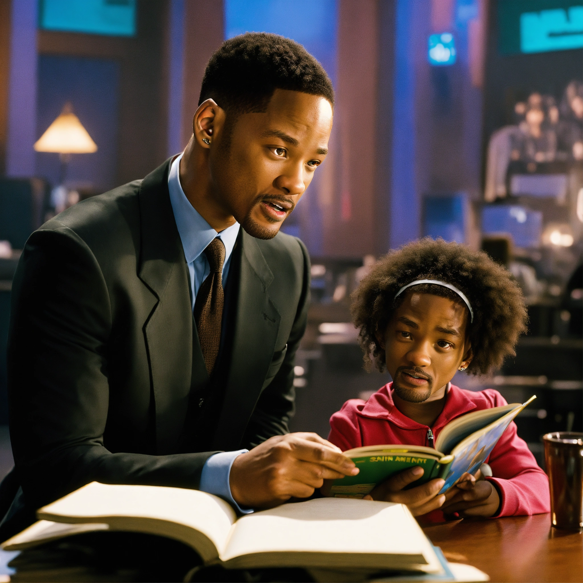 Young will smith as agent j, the shot from movie man in black, he is at an interview at the agency, looking suspiciously at a little girl, she is holding a textbook on quantum physics in her hands, cartooned