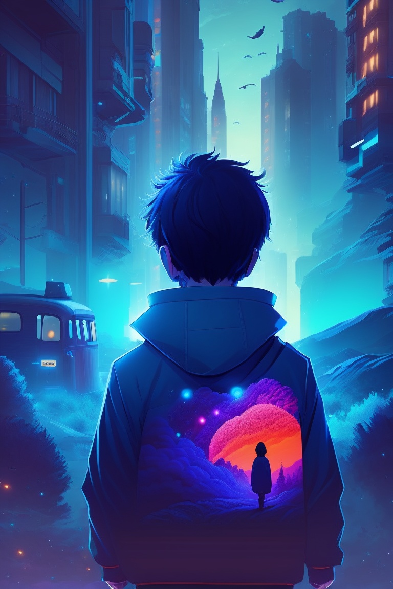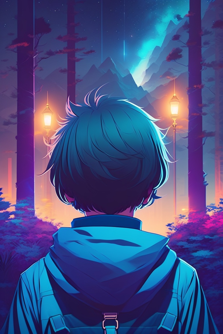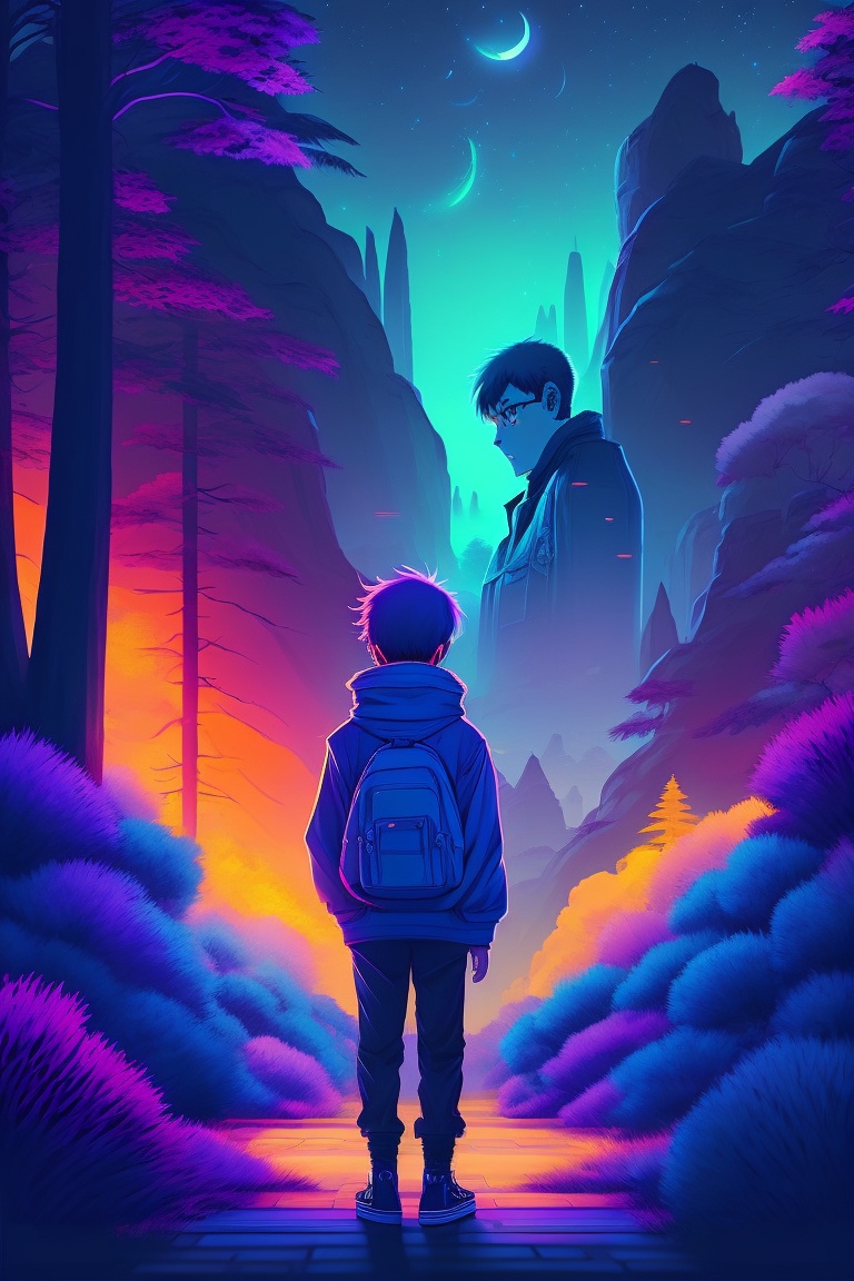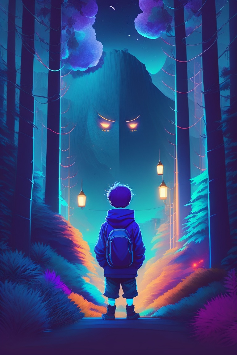 70s art, anime style, manga, studio ghibli, young boy from behind, facing 5 scary evil giants, night background, vibrants colors