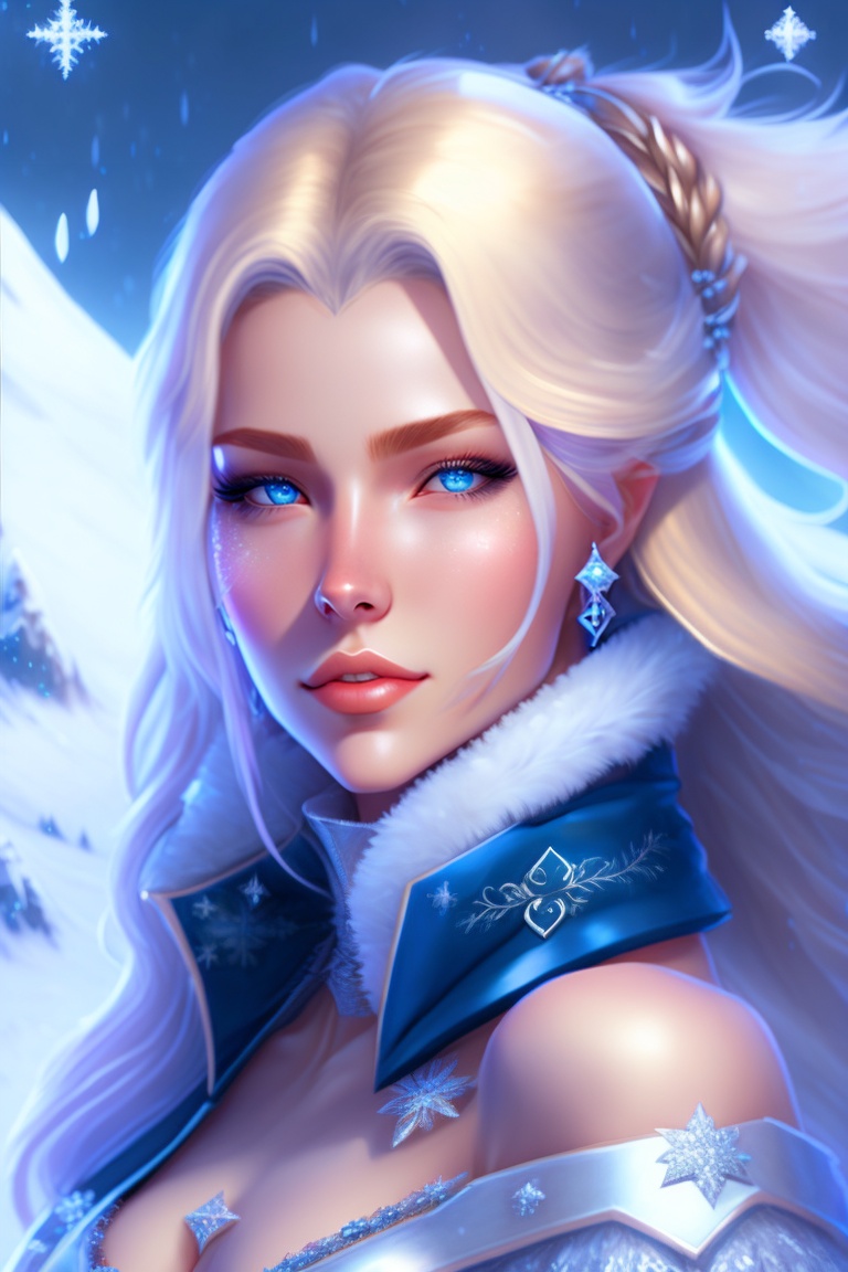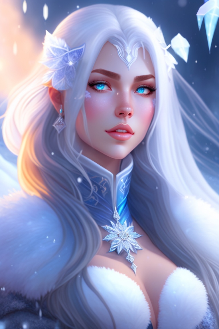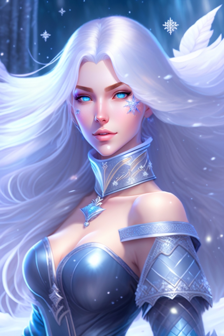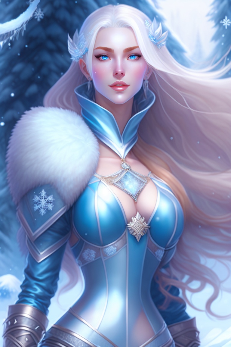 Auril, the frostmaiden, appears in an alluring human form as a stunning vixen. her figure is alluring, with supple curves and flawless, snow-white skin. her captivating eyes are a piercing icy blue, drawing others into her gaze. her long, flowing hair shines like silver and pale blue snowflakes. she wears a form-fitting attire adorned with frost-like patterns that accentuate her enticing features. her alluring attire hints at danger, with sharp icicle accents. in her presence, there is a mix of frigid majesty and potential cruelty, reflecting her power over winter's cold embrace. greg rutkowski art, anime art
