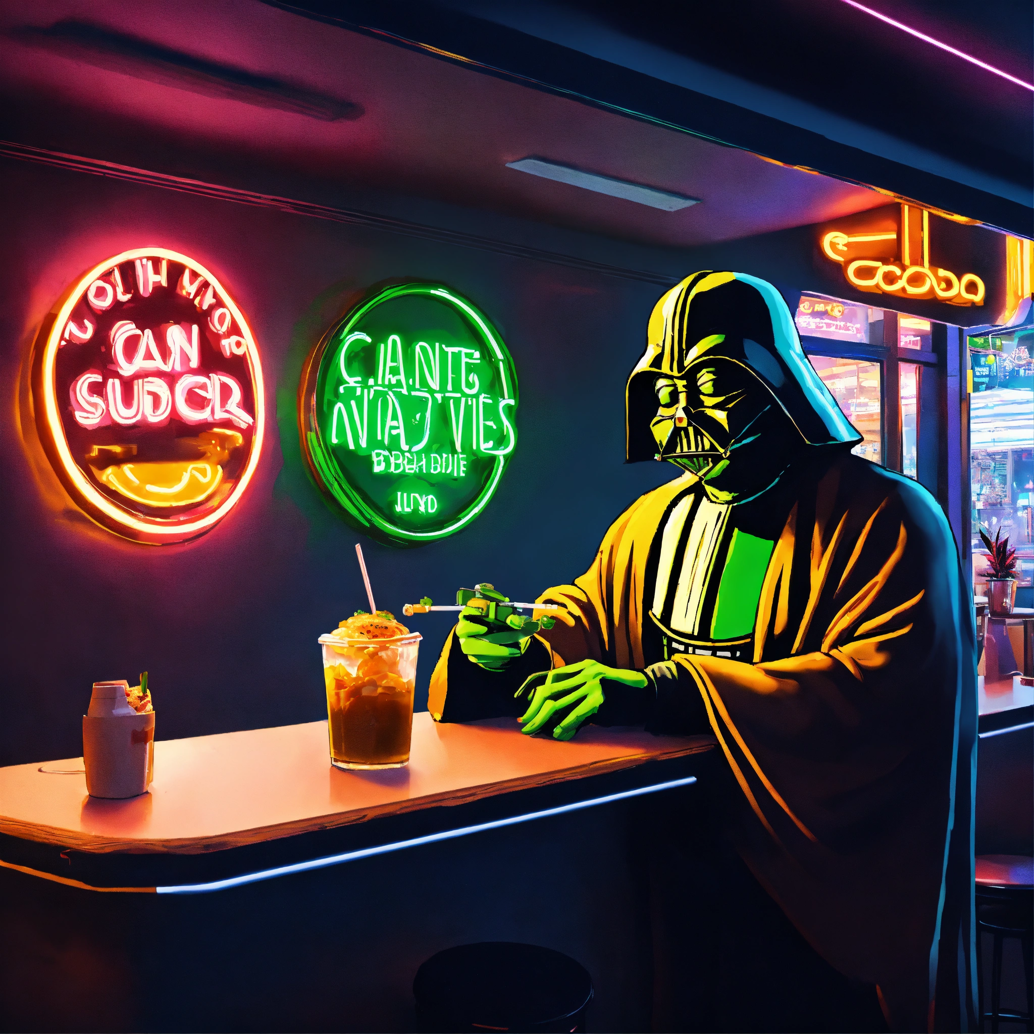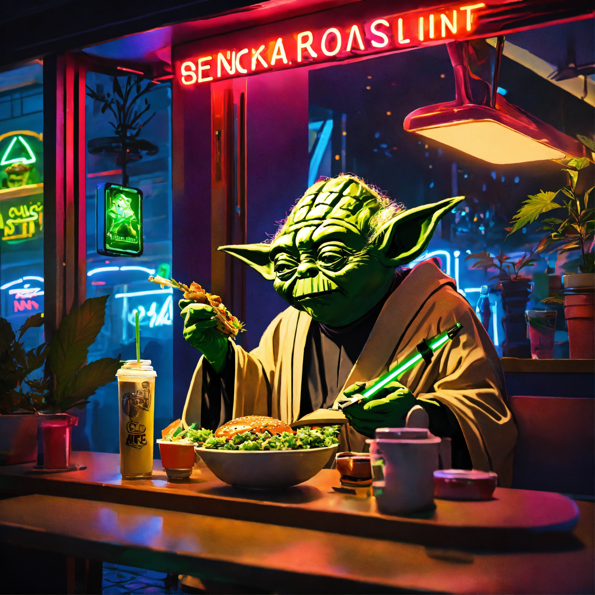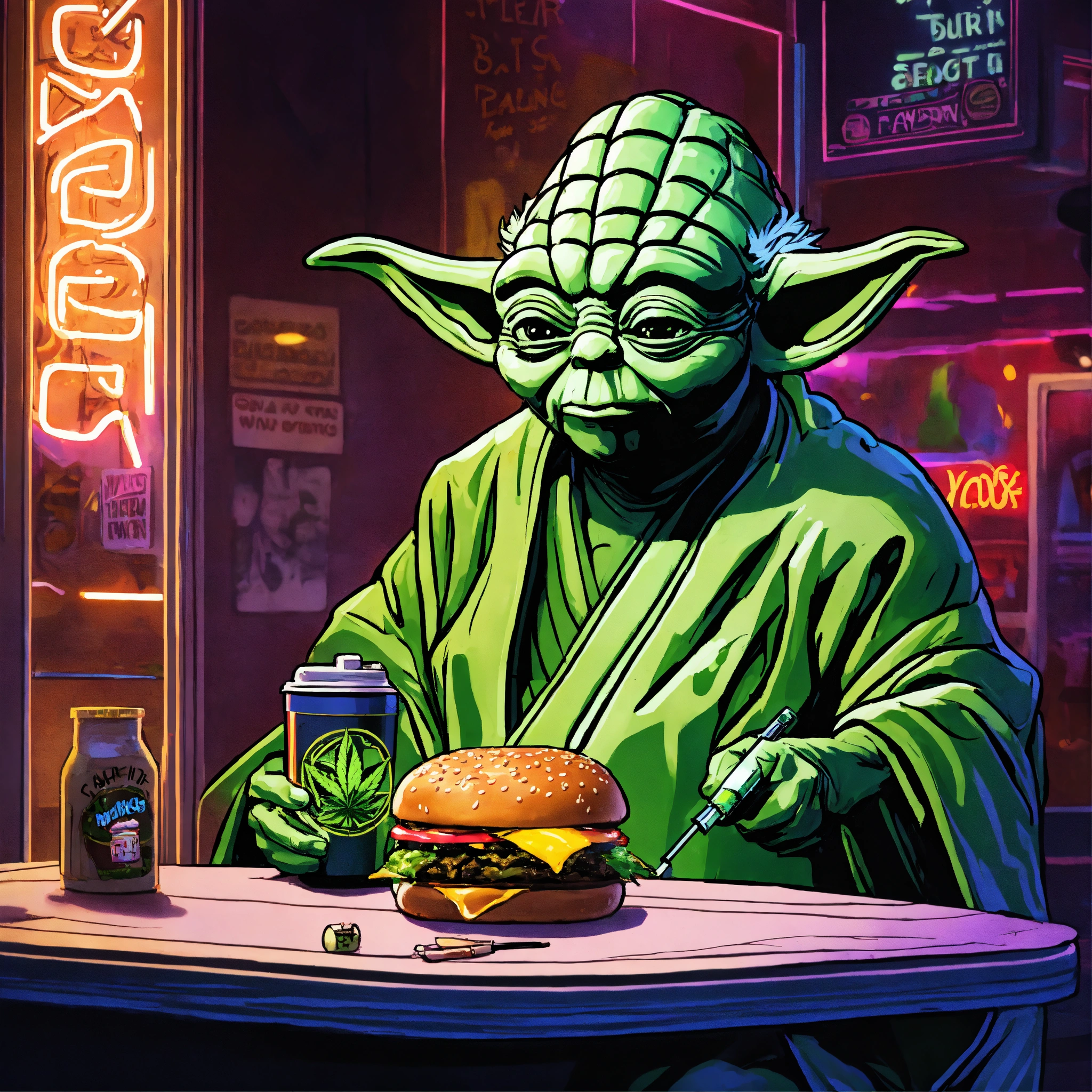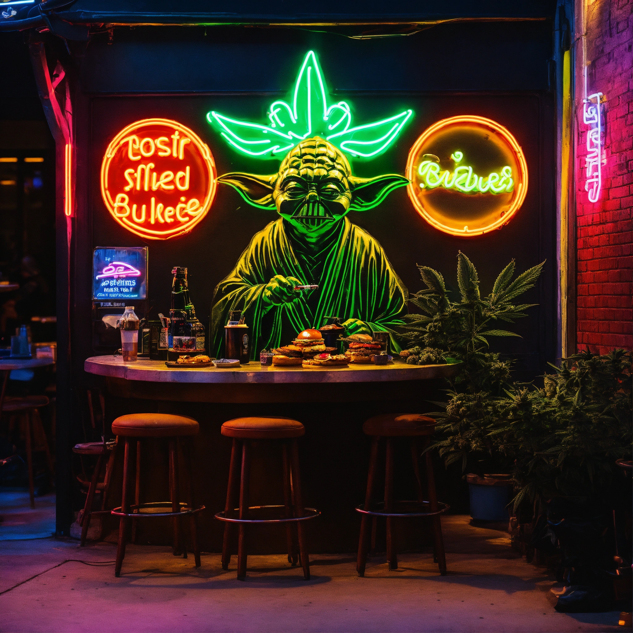 A rounded neon sign with master yoda and darth vader smokes a big cannabis joint and eats a fine burger in a cafe
