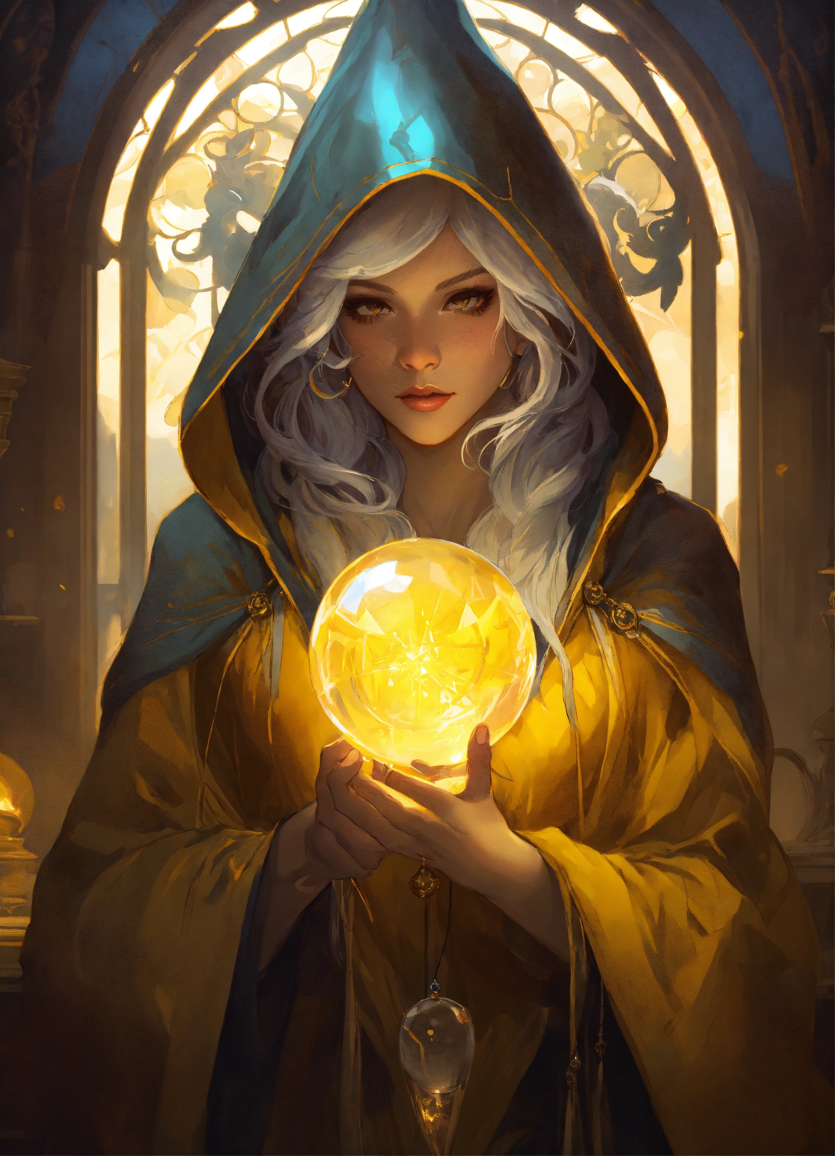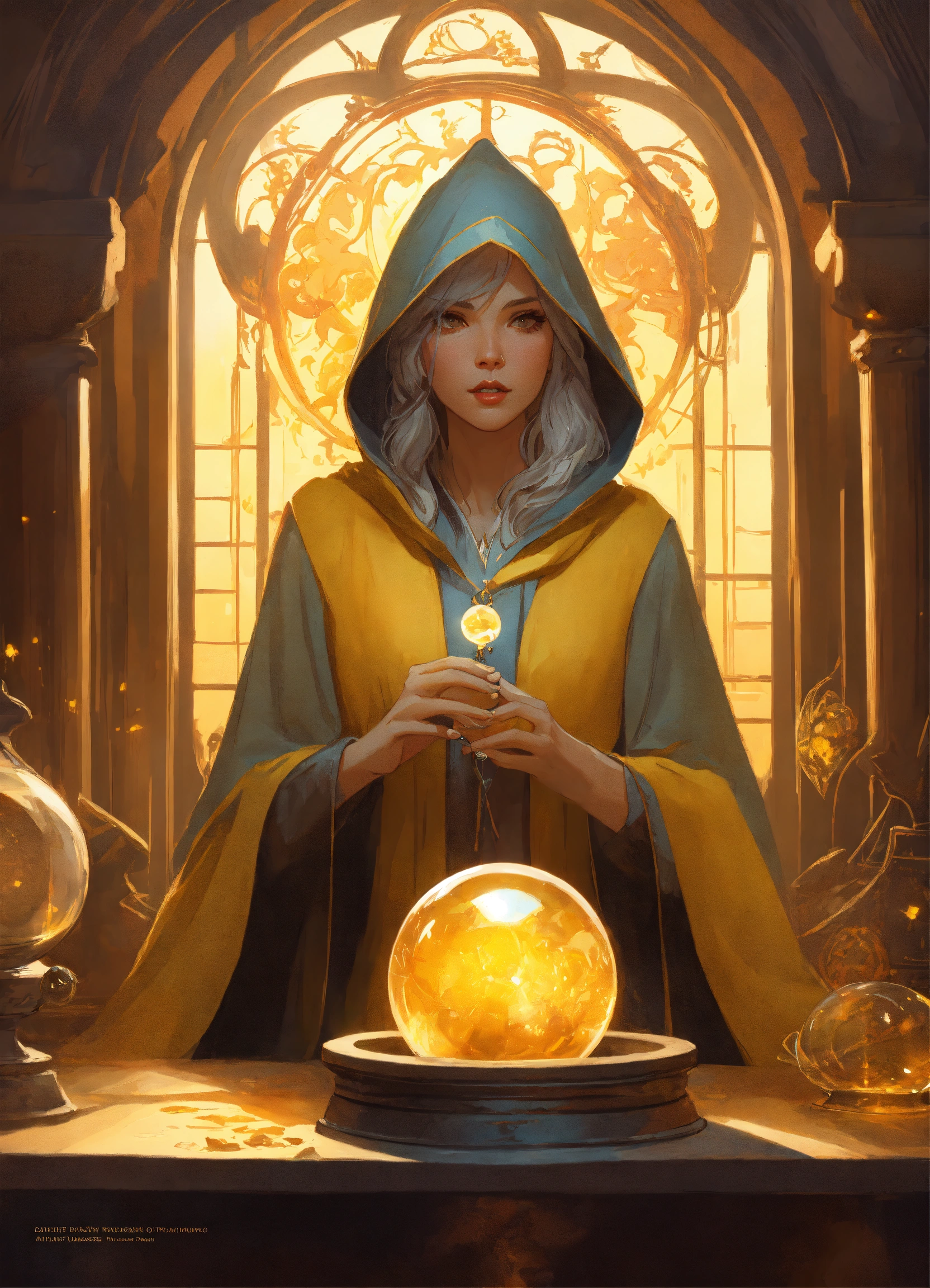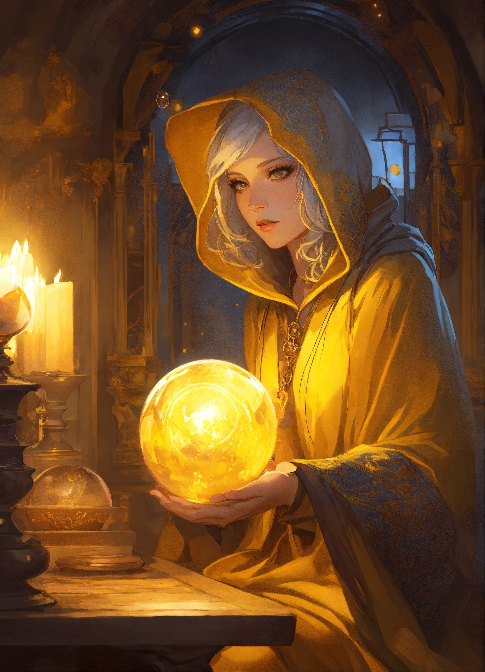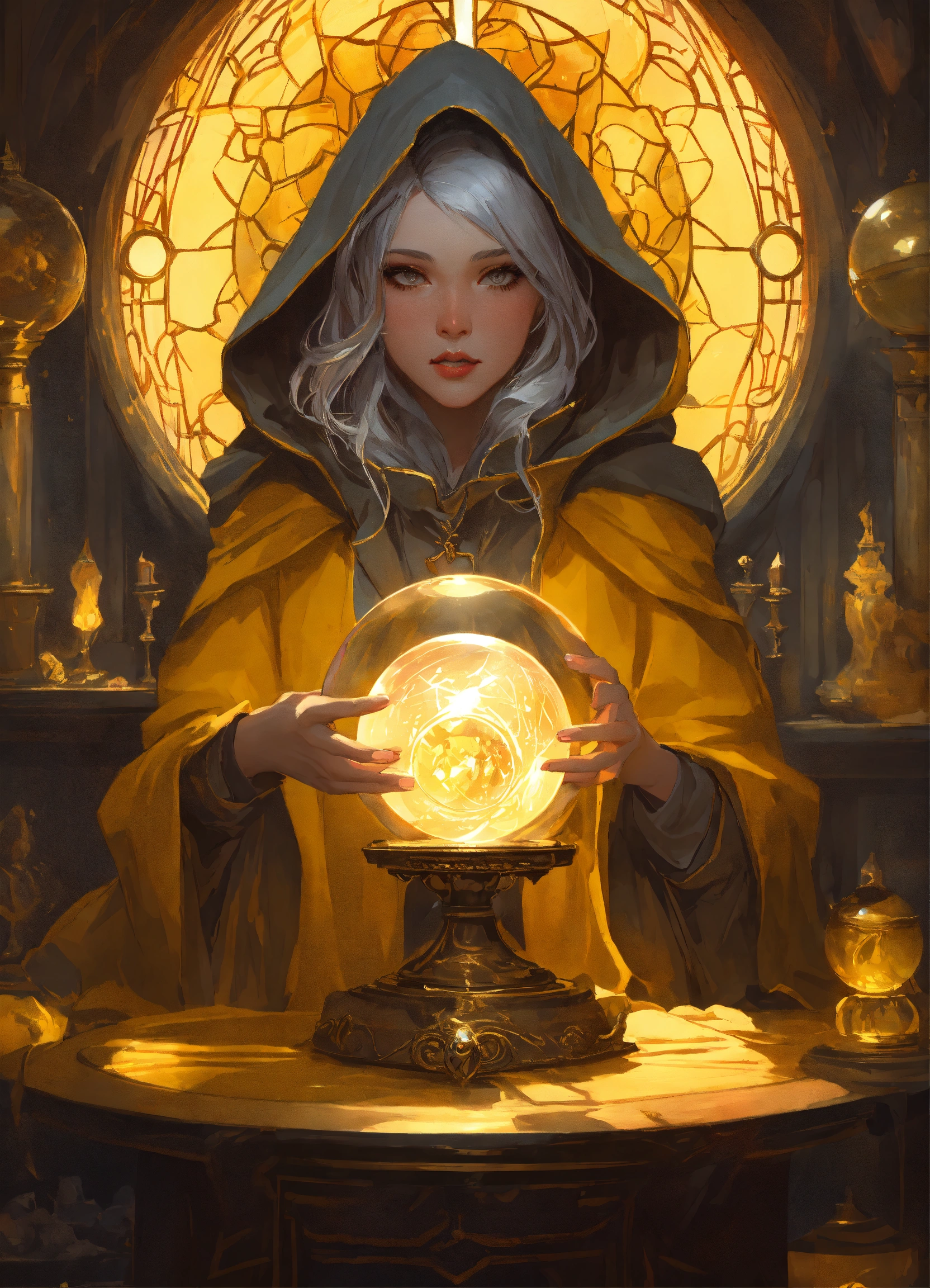 Hooded old aged mage future seer witch adivination room crystal ball, dark yellow clothes, gray hair, old aged, art by artgerm and greg rutkowski and alphonse mucha and loish and wlop, artstation, illustration