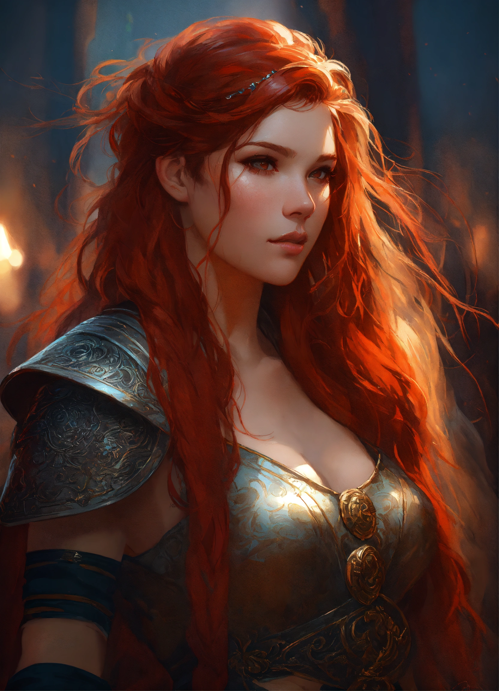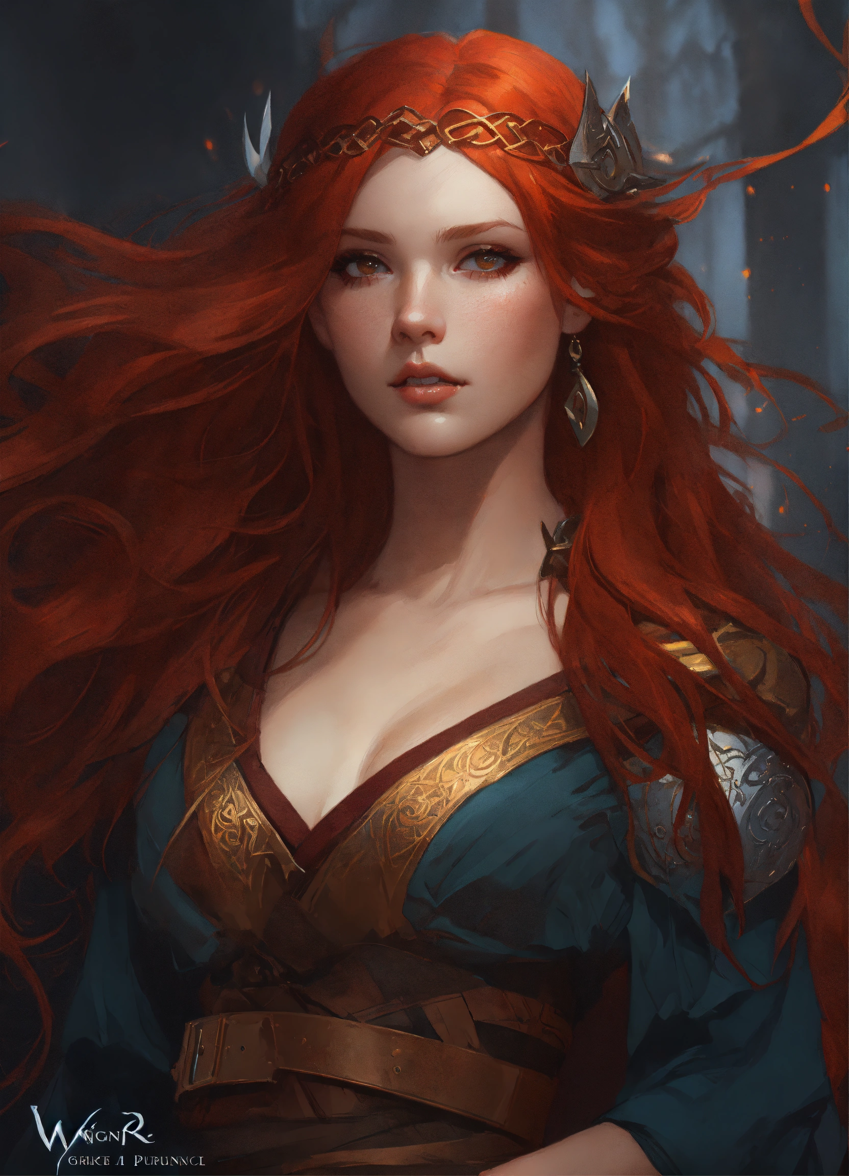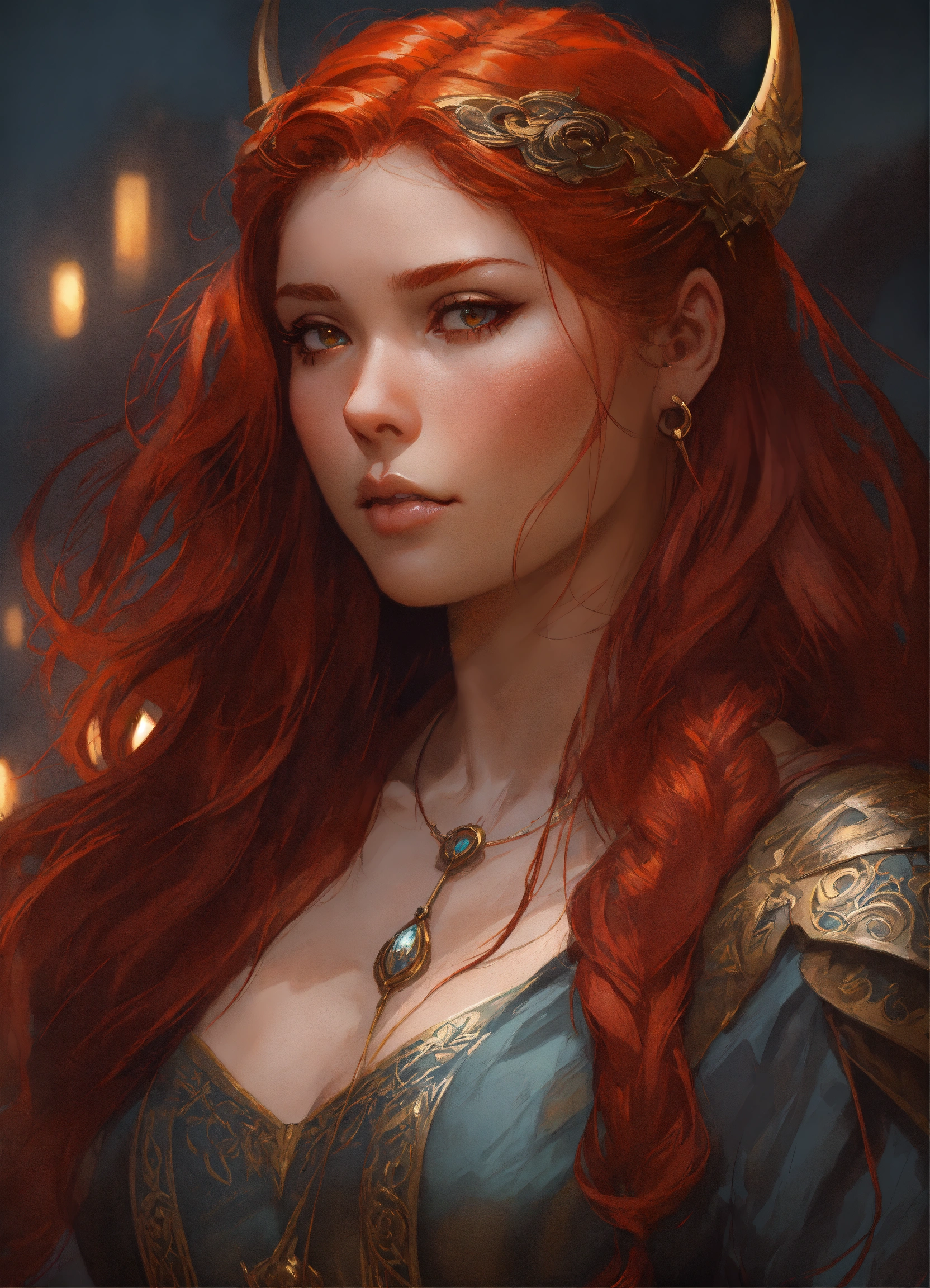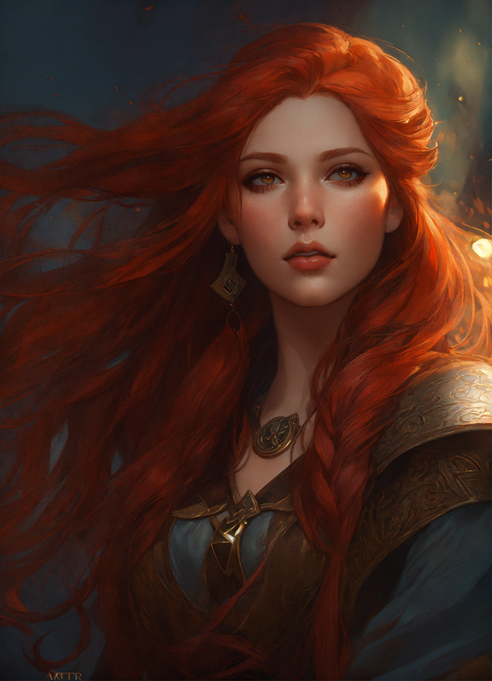 Beautiful, red hair, viking girl, long hair, dark pin-up style hair, dark light night, intricate, elegant, sharp focus, illustration, highly detailed, digital painting, concept art, matte, art by wlop and artgerm and greg rutkowski and alphonse mucha, masterpiece, fantasy