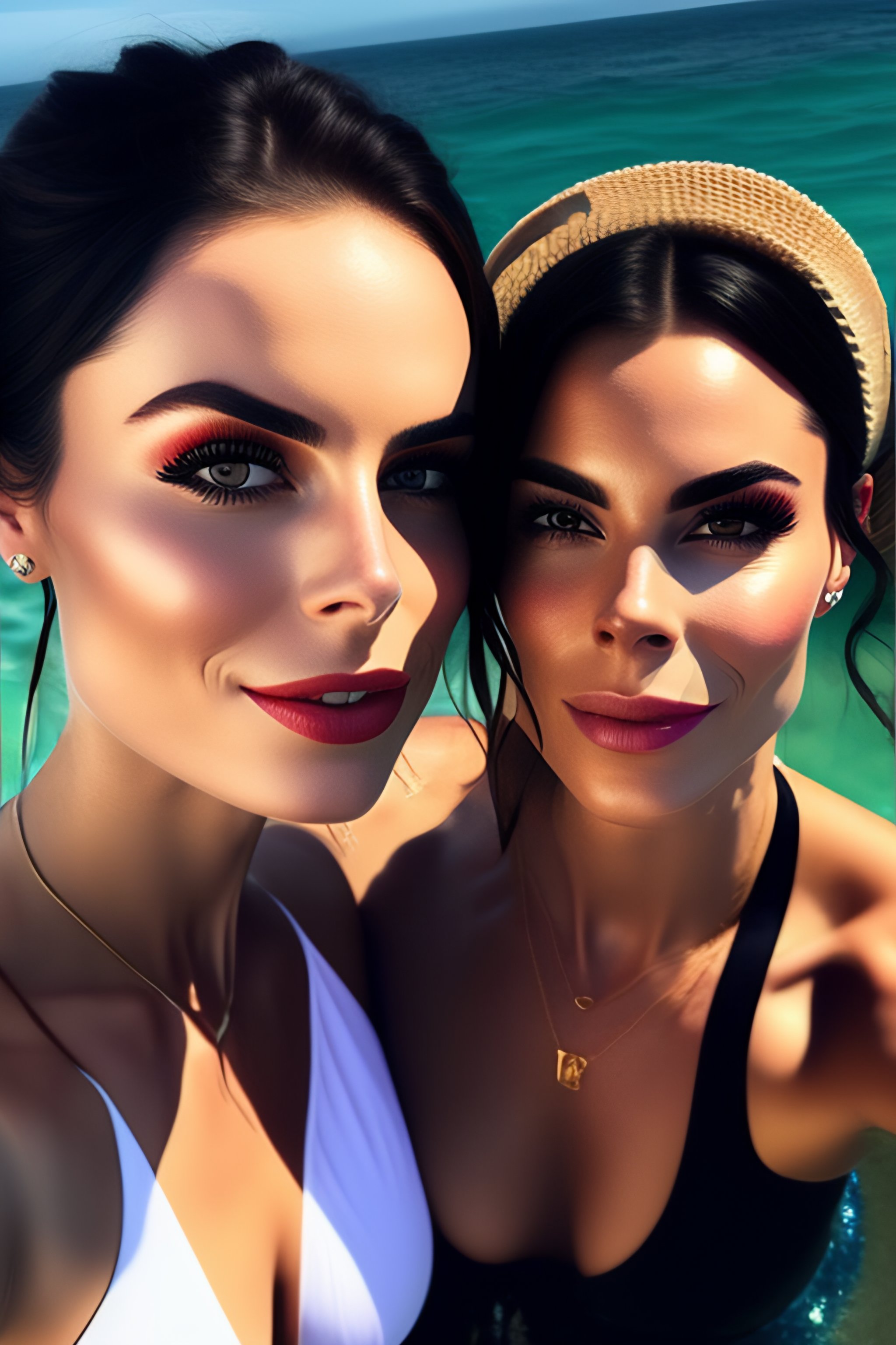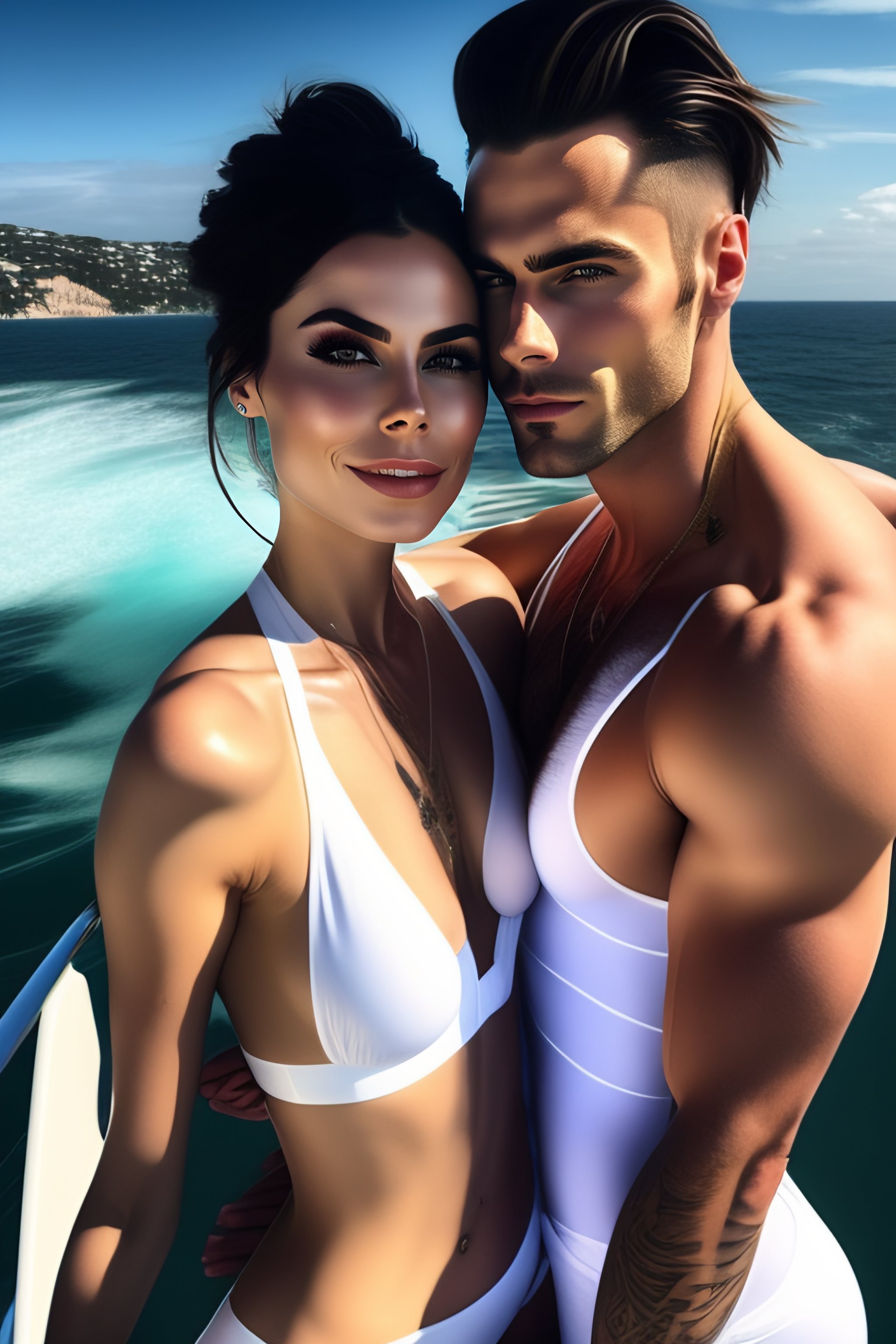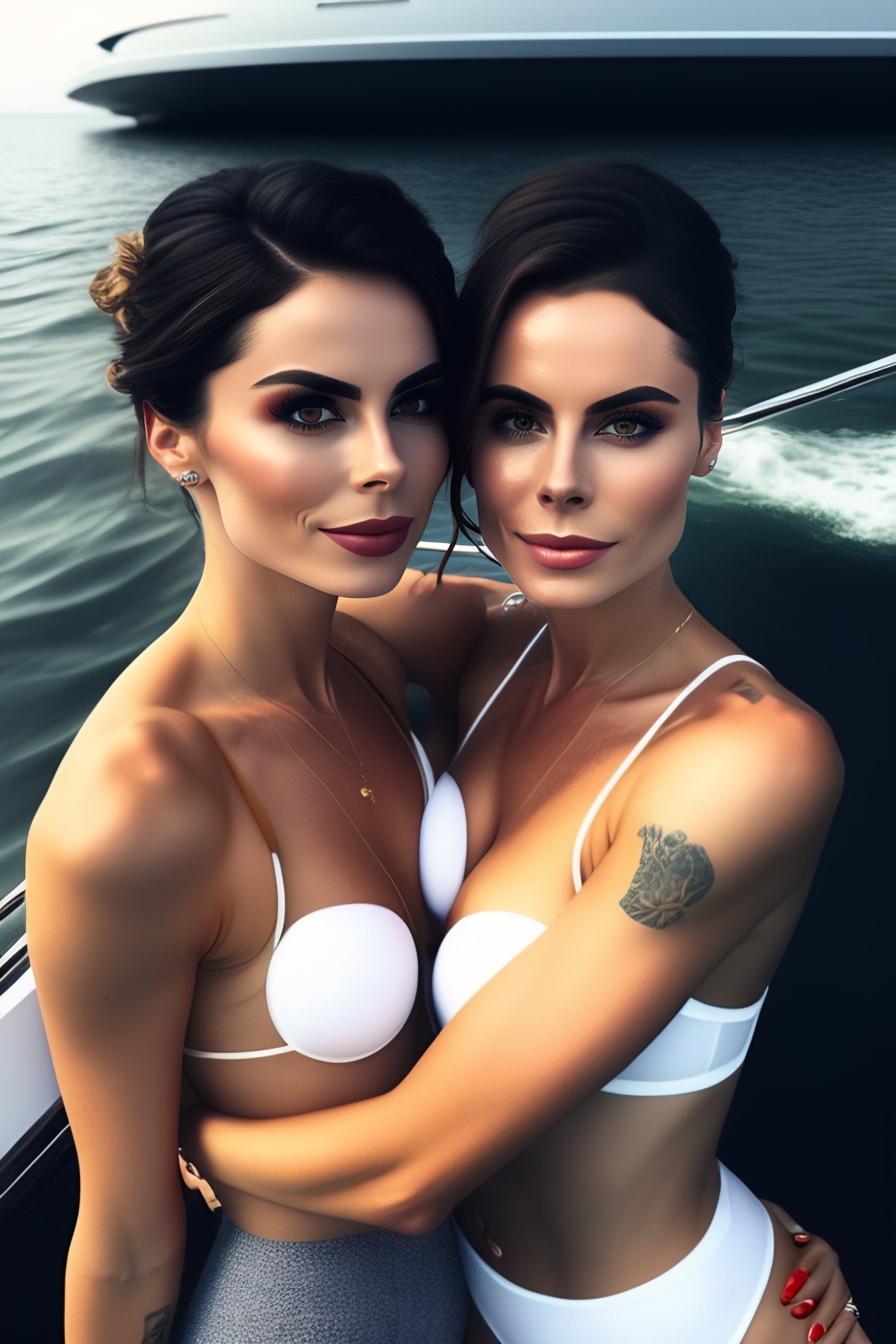 (((lena meyer-landrut))) and (((lena meyer-landrut)), ((identical twins)), on a (yacht), ((white bikini)), hugging, kissing, romantic, cozy, warm