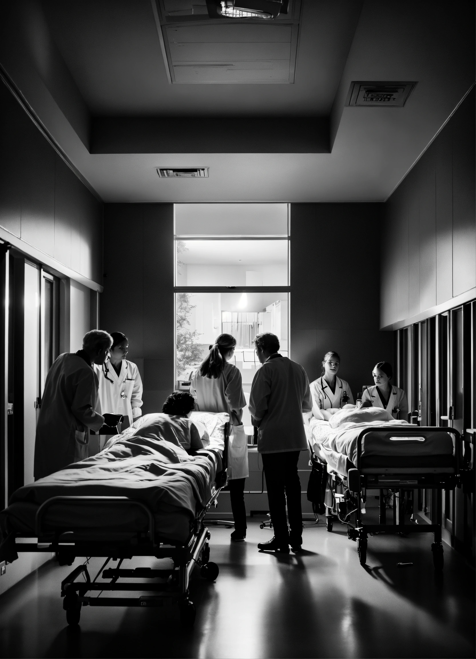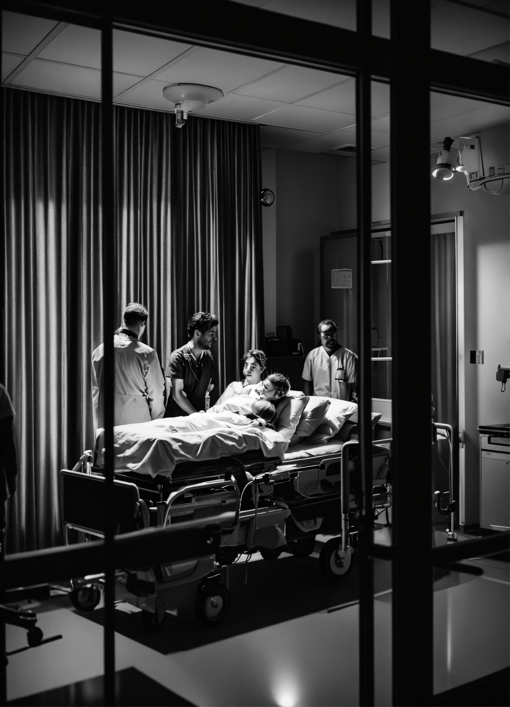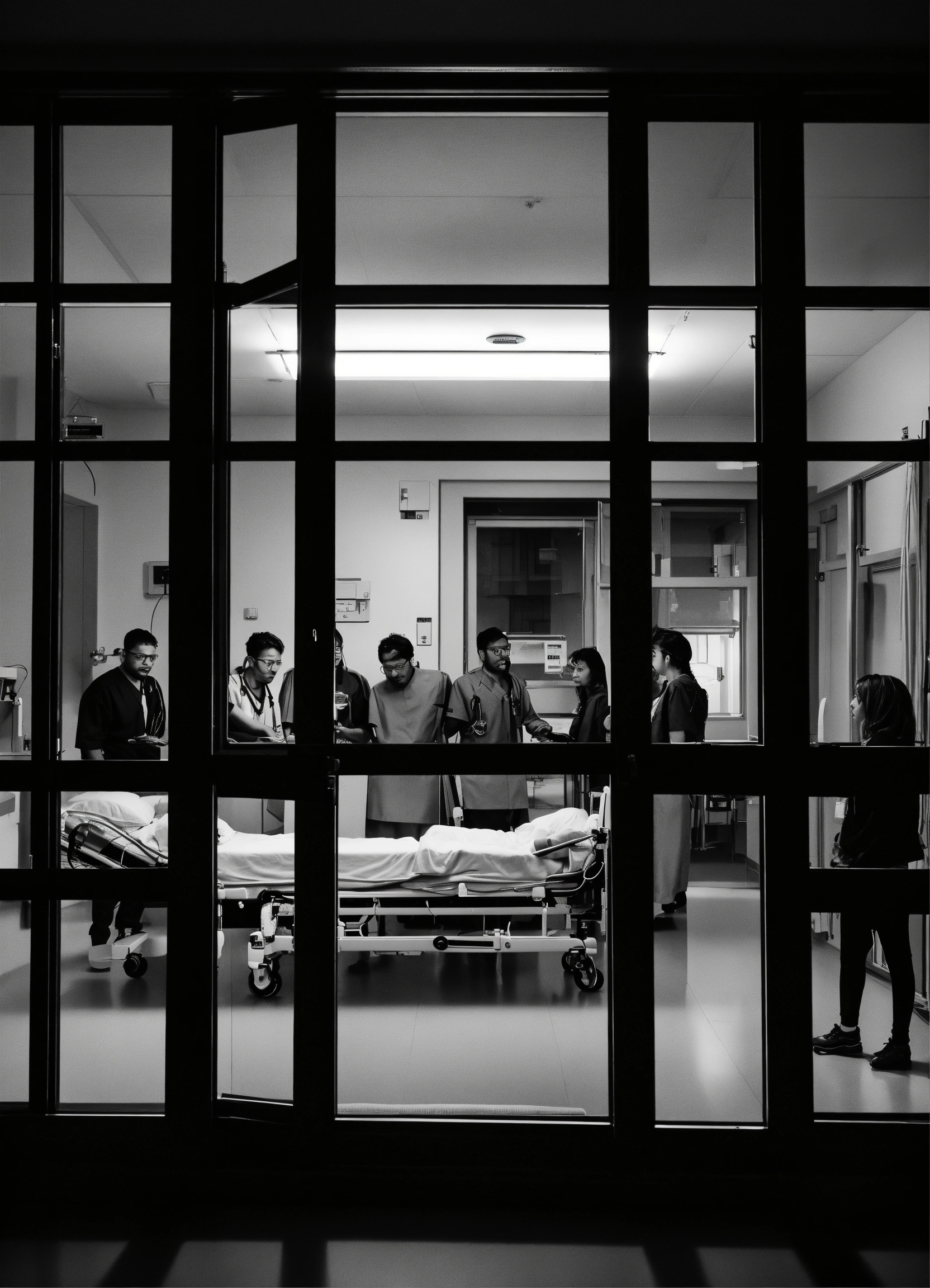 Group of friends looking through wide window at a patient in a medical bed, in a hospital, night ambiance, very low luminosity, cinematic, black and white.