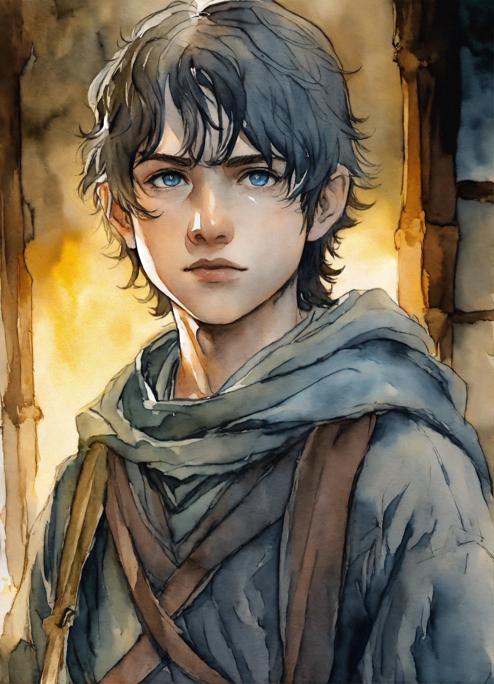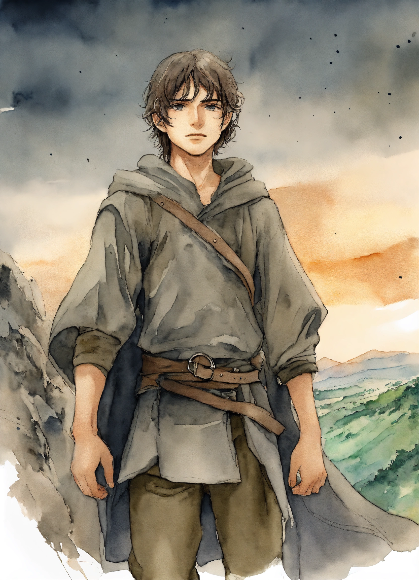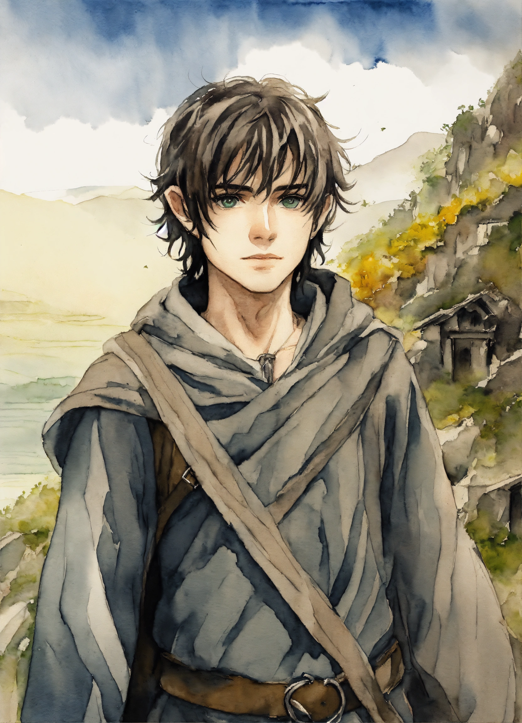 The boy estel from lotr with grey clothes in vagabond manga drawing art style, watercolor, with rivendel at the background