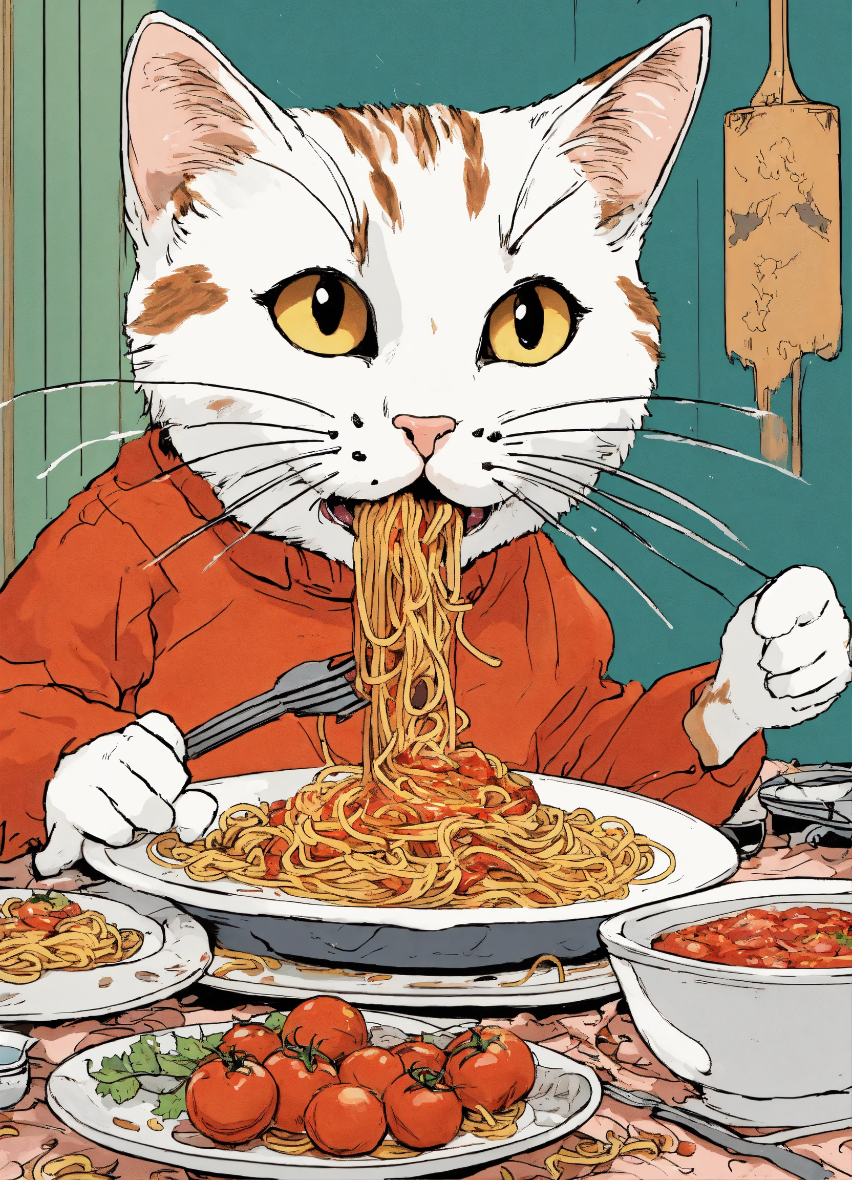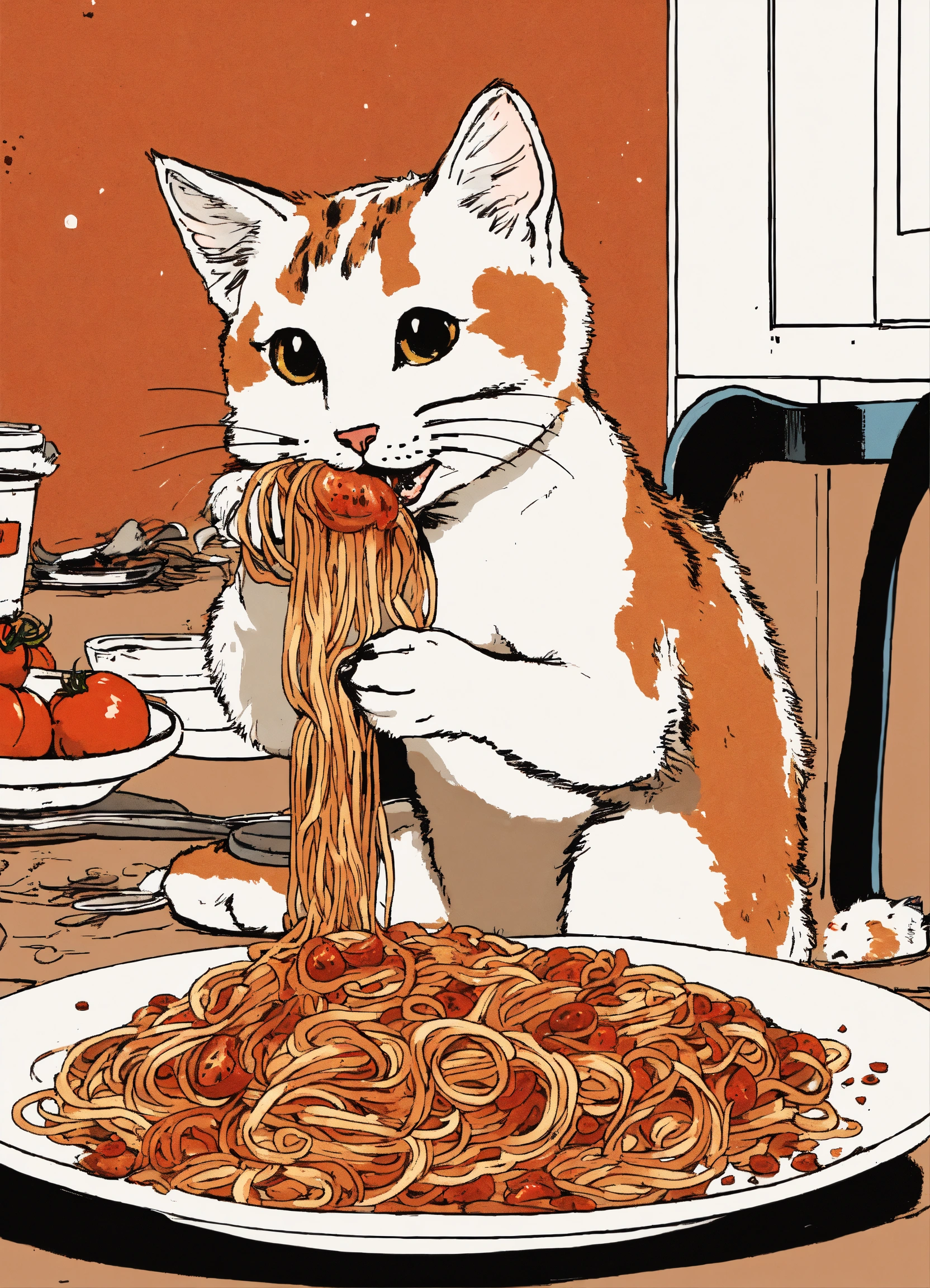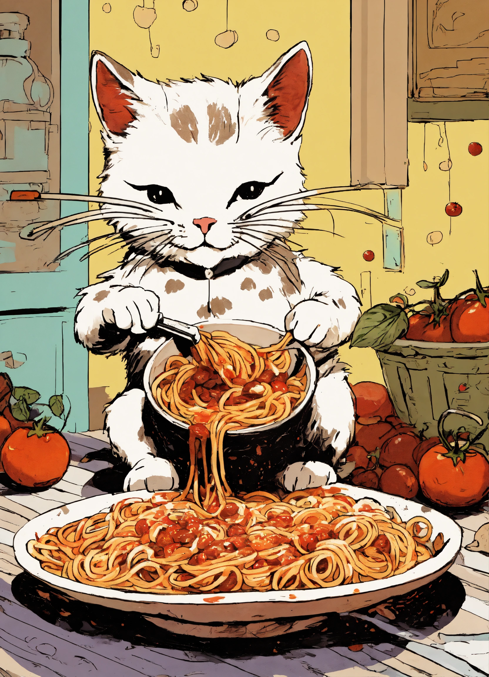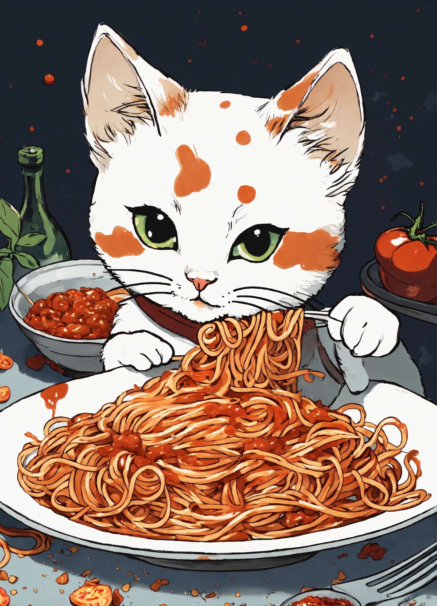 A cute white with brown spots cat eating messy spaghetti with tomato sauce, illustration by hergé, stunning color scheme, masterpiece, manga style, black and white