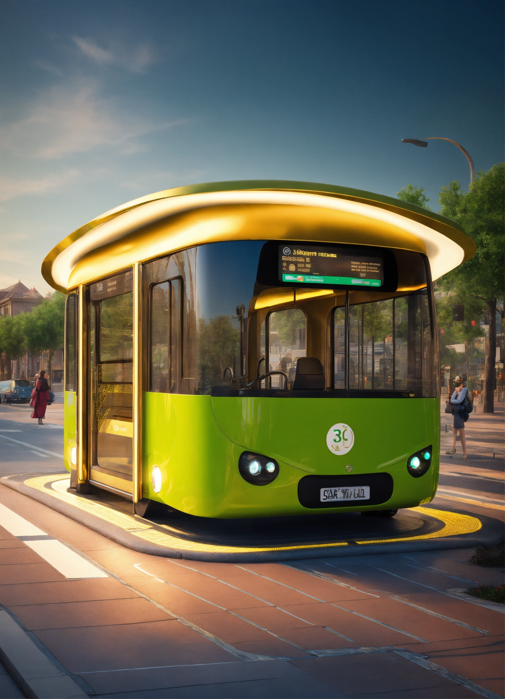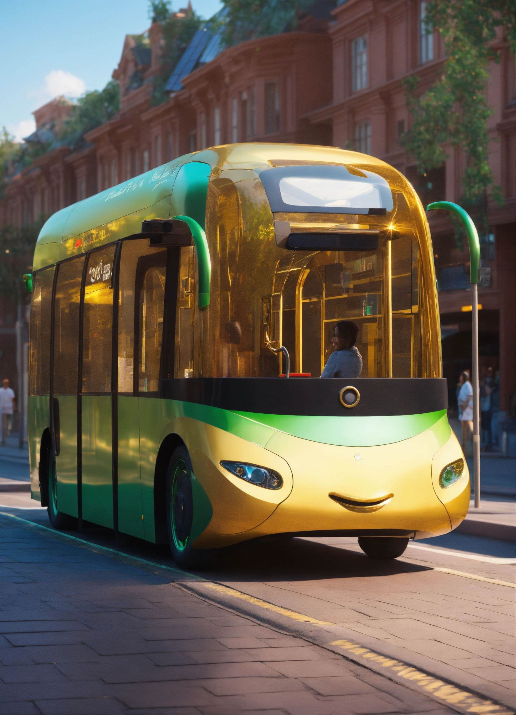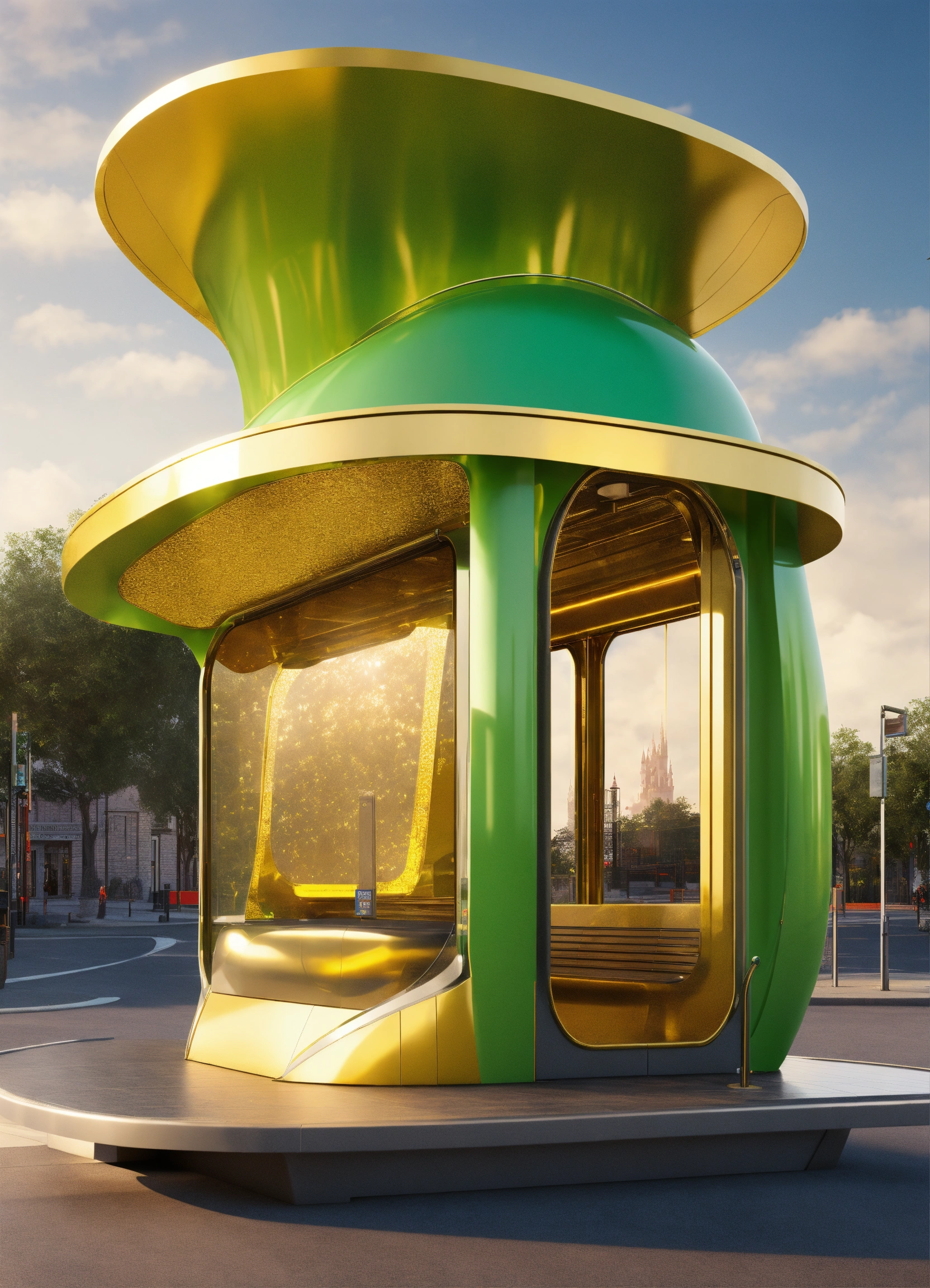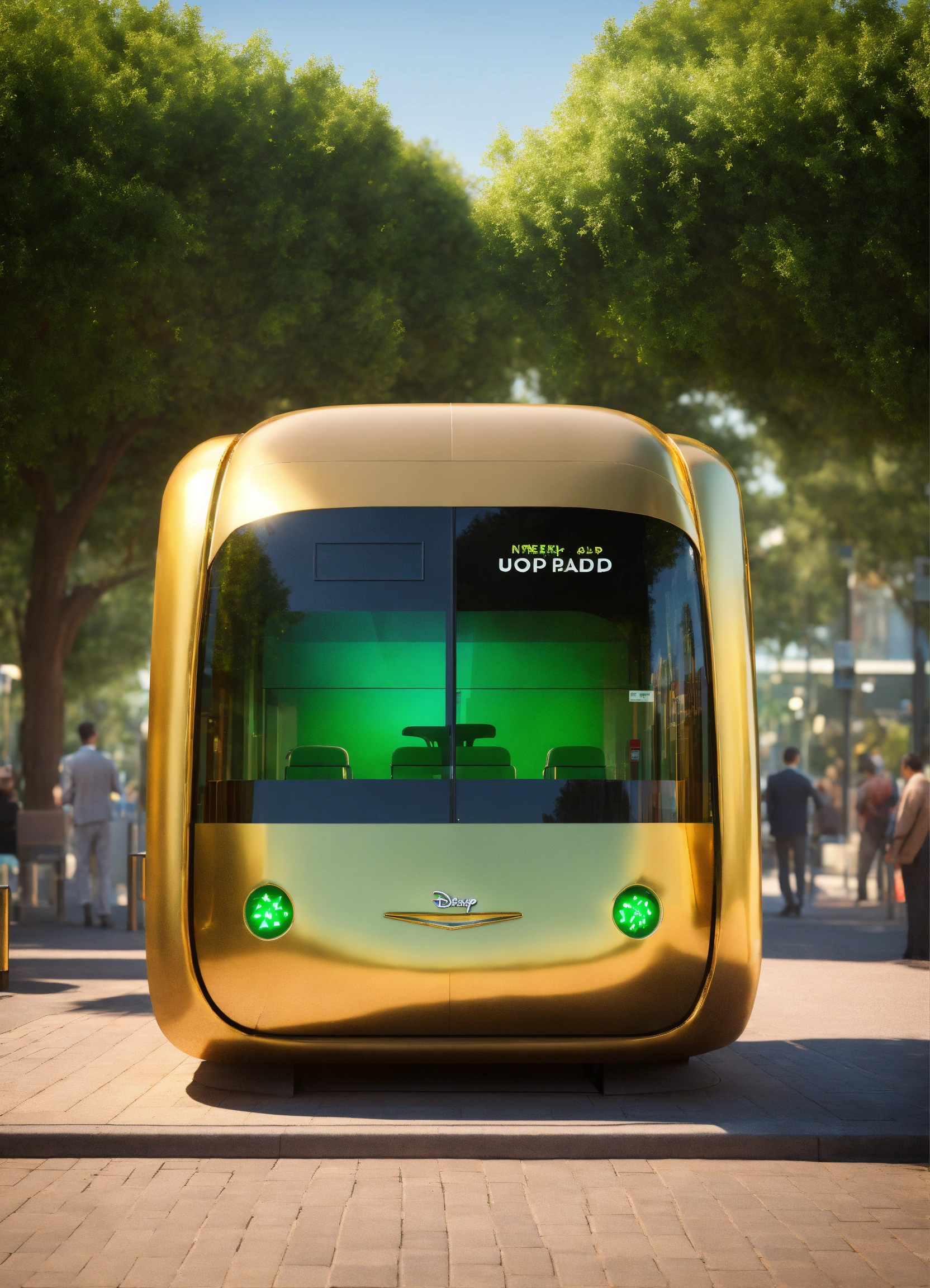 A bus stop with an unusual streamlined shape with gold panels and solar panels on the back, with bright green eyes and a friendly smile, 3d style, disney