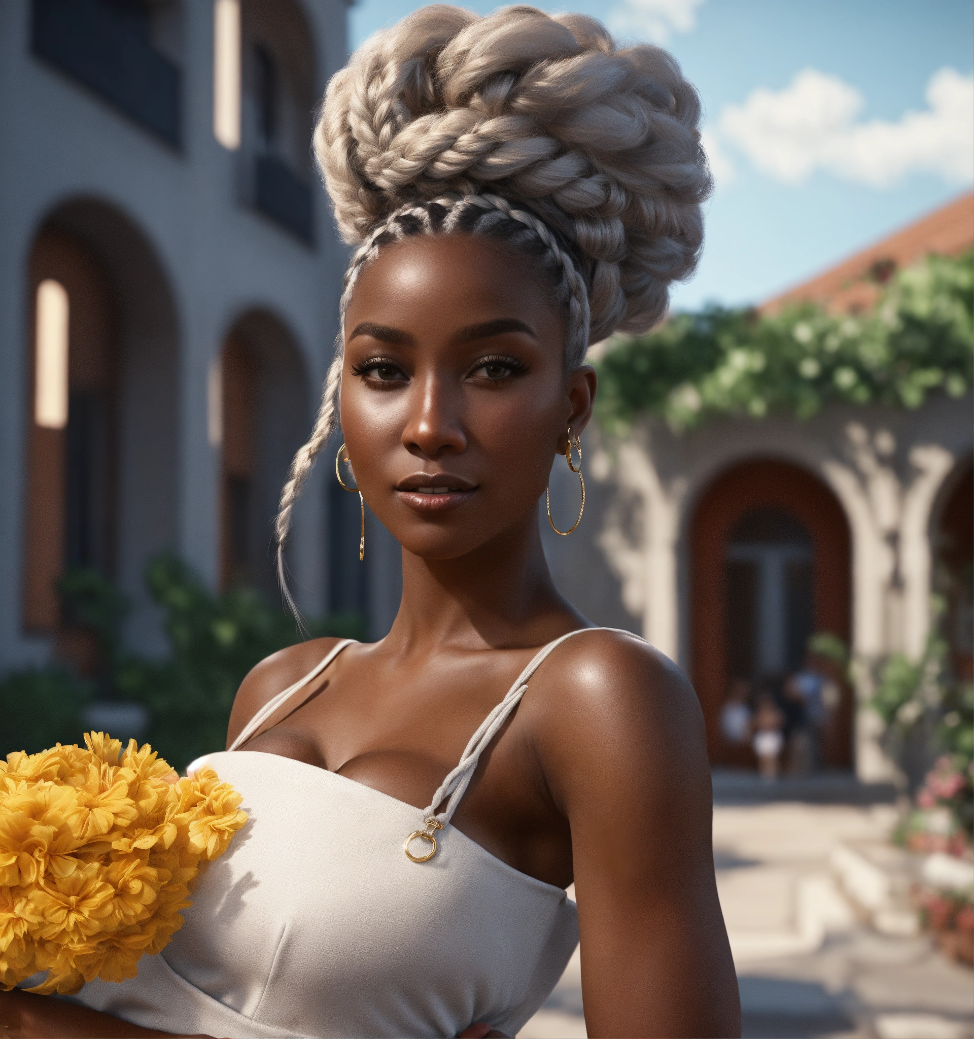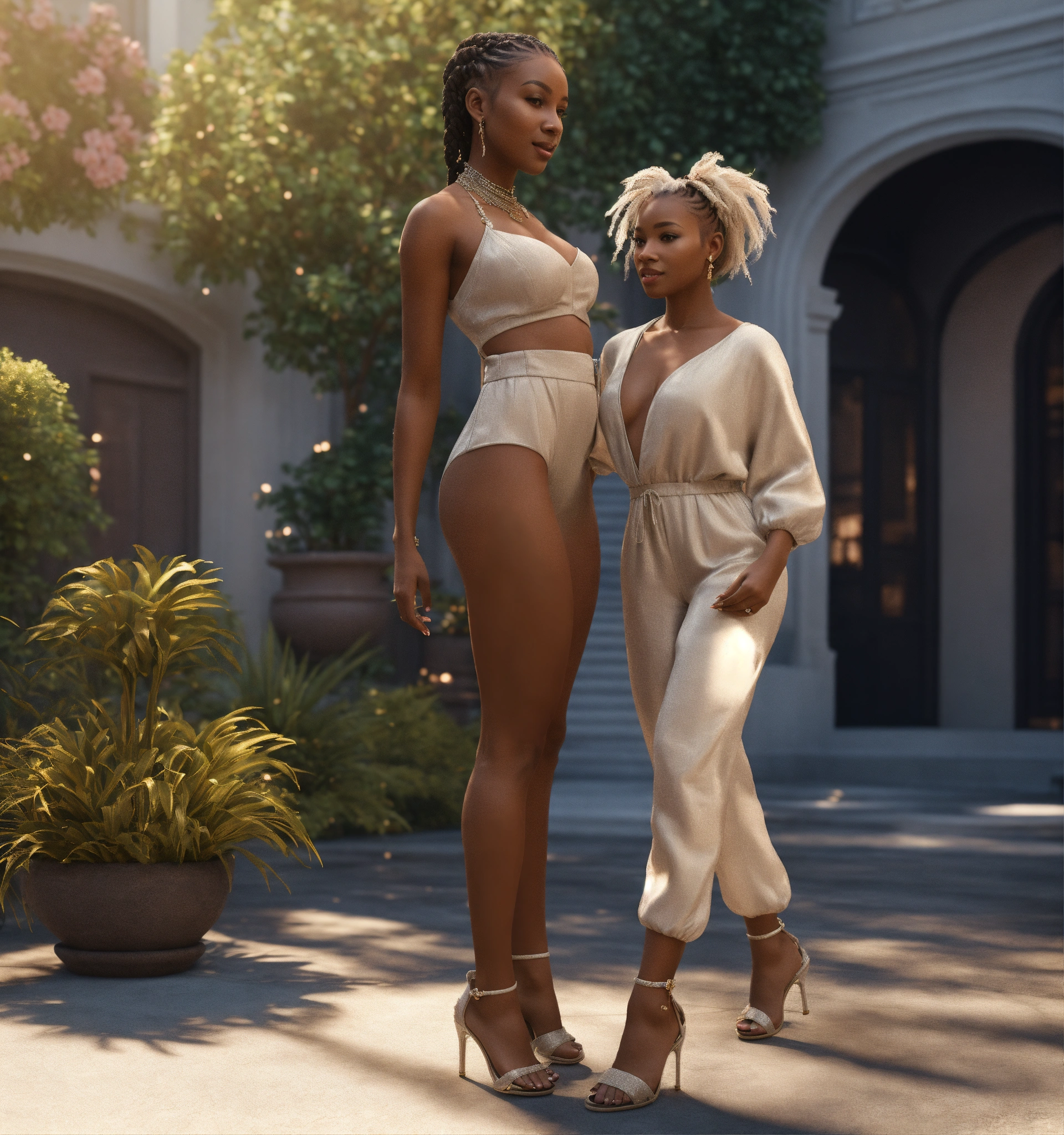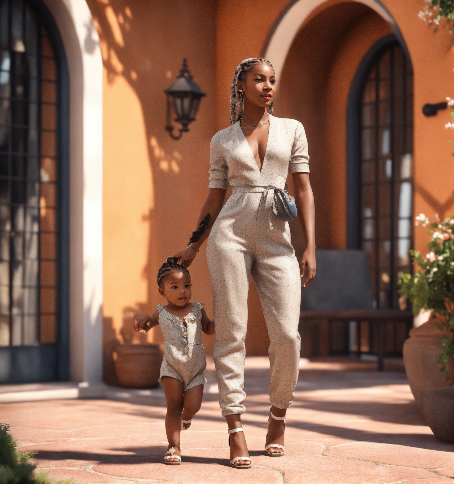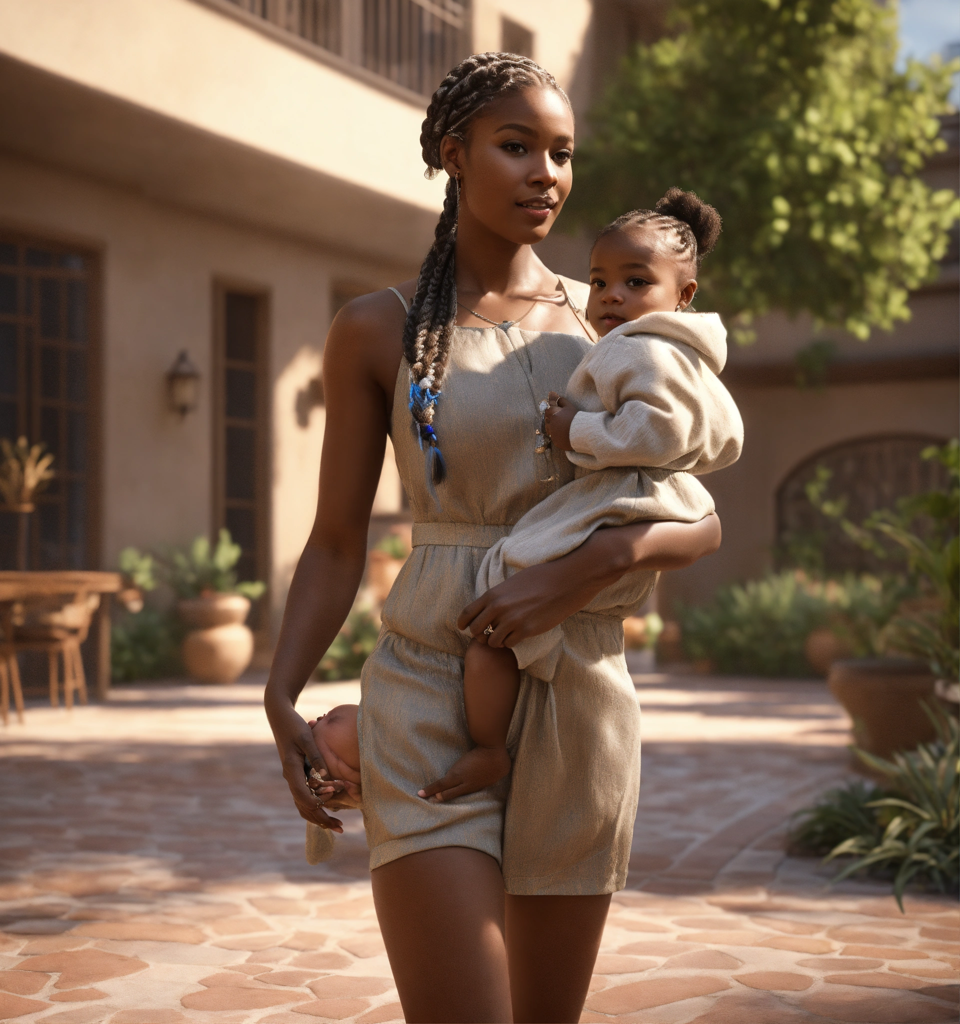 Thirty-year-old dark-skin female with braids, dressed in a haute couture romper and heel sandals, holding a baby with white hair, daytime, standing in courtyard, happy persona, cinematic style, high detail, realistic physics, photorealistic, unreal engine, hdr, 8k