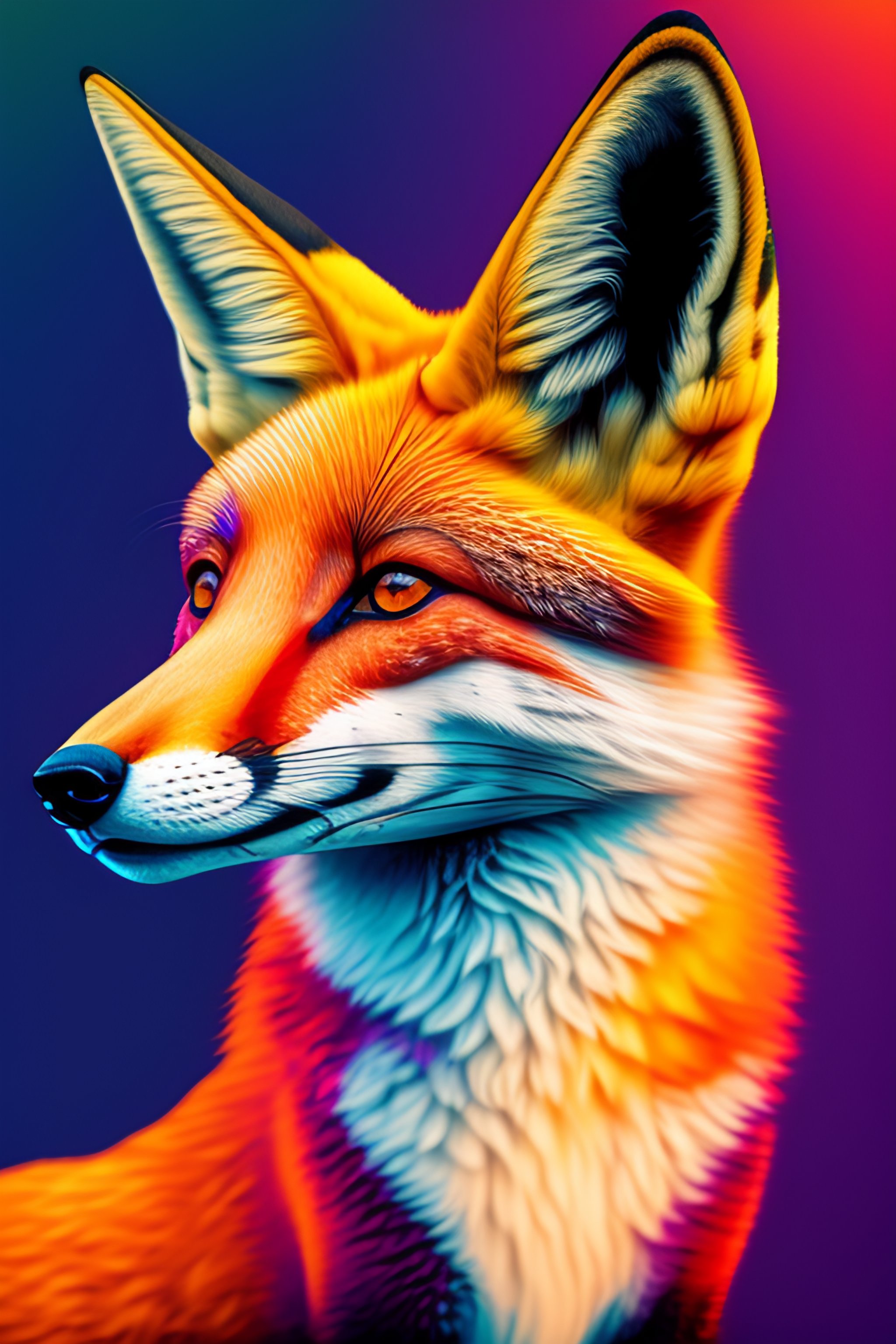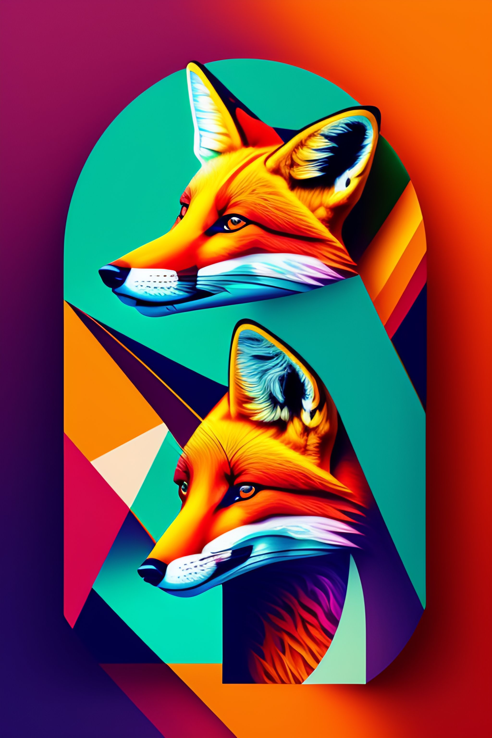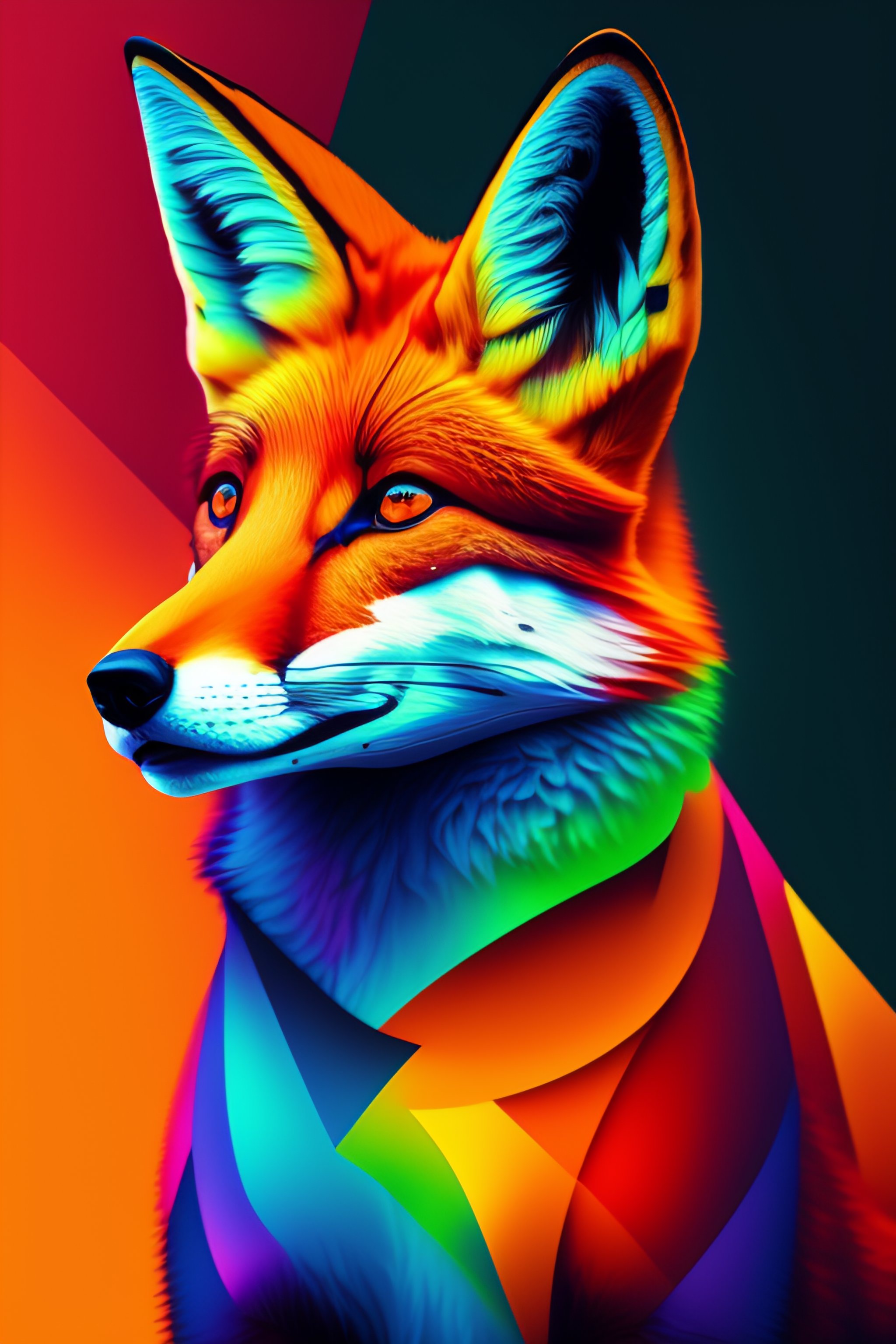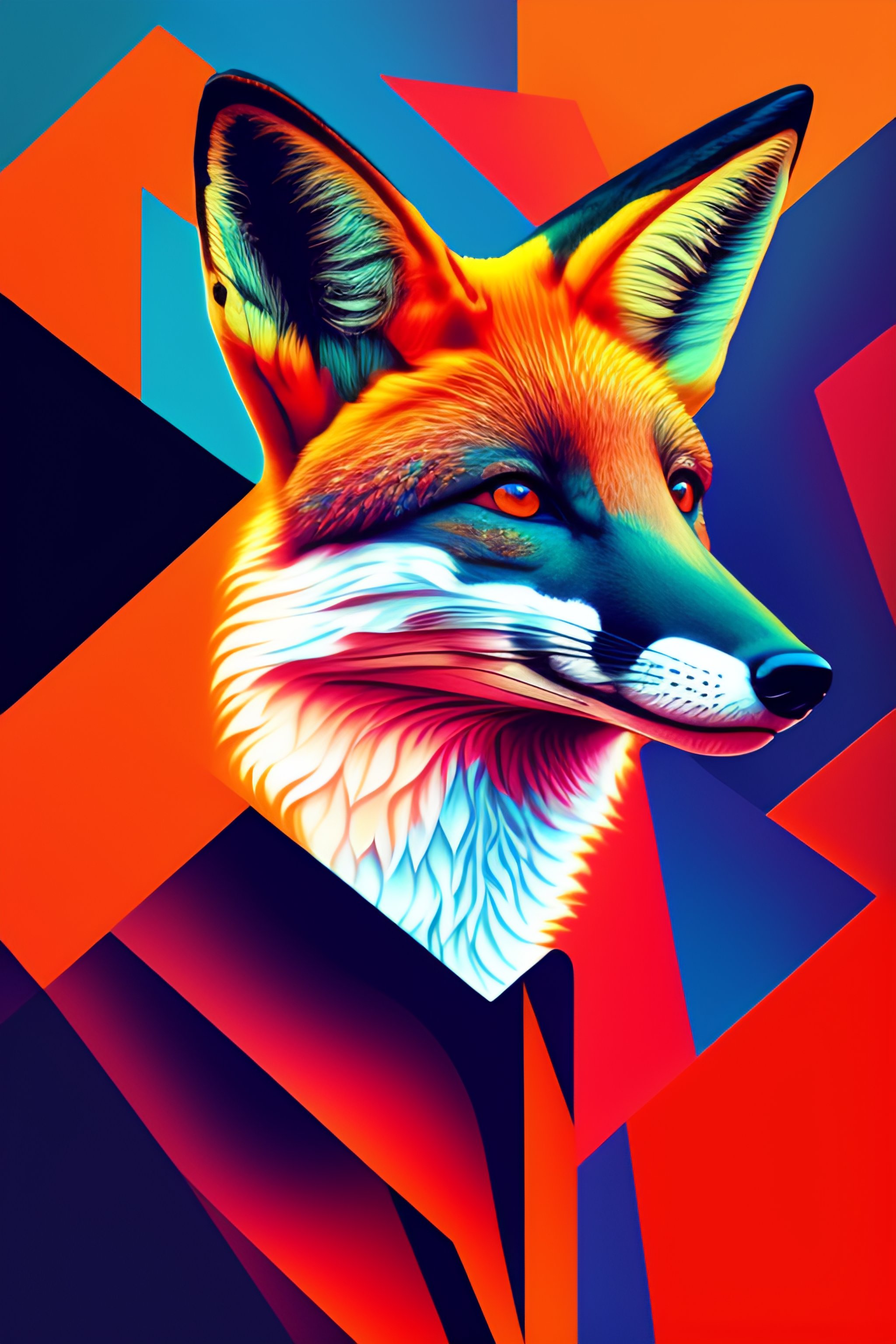 Portrait of a fox, splash colours, complementary colours, cubism, vector art, electric lighting, street level view, abstract expressionism, prisms, retro