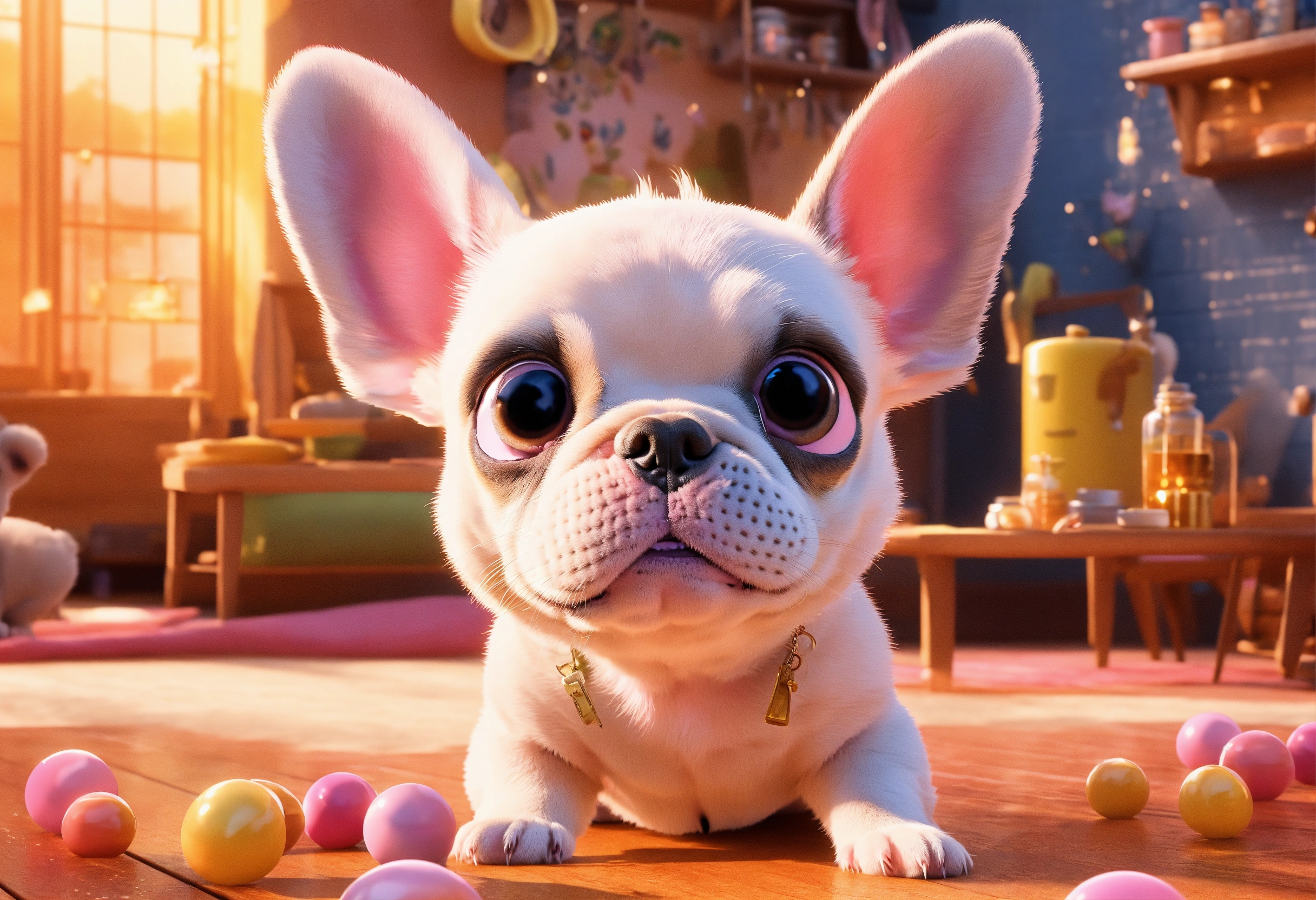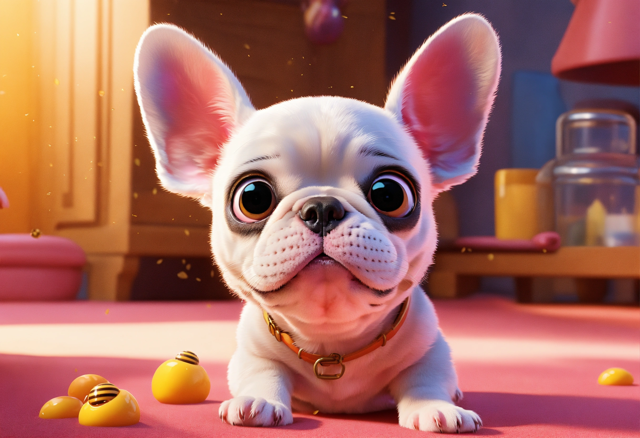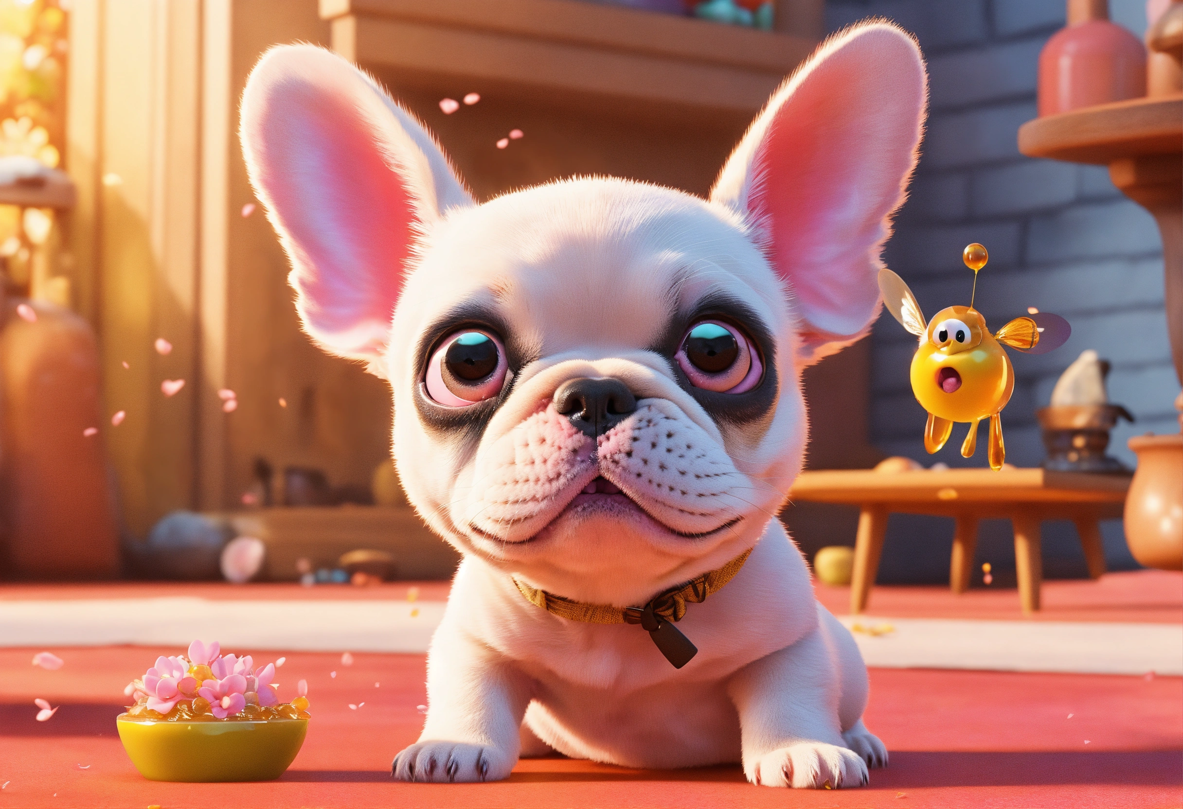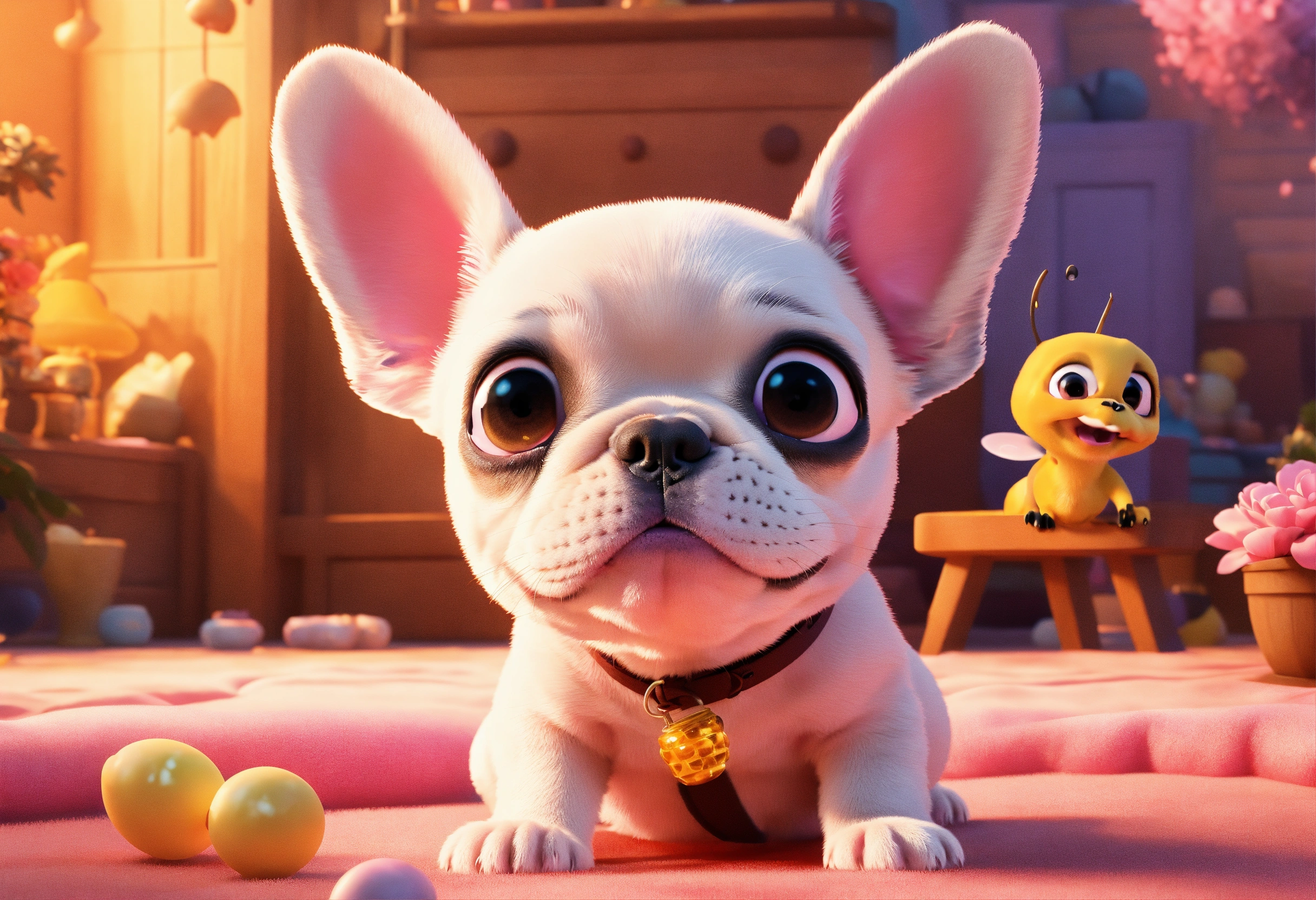 A disney pixar inspired movie poster 3d render, cinematic with a baby white french bulldog puppy with brown eyes, with beehive with honey, and pink hues. the scene should be in pixar's digital art style, emphasizing the characters expressions, bright colours, and detailed characteristics of their animations.