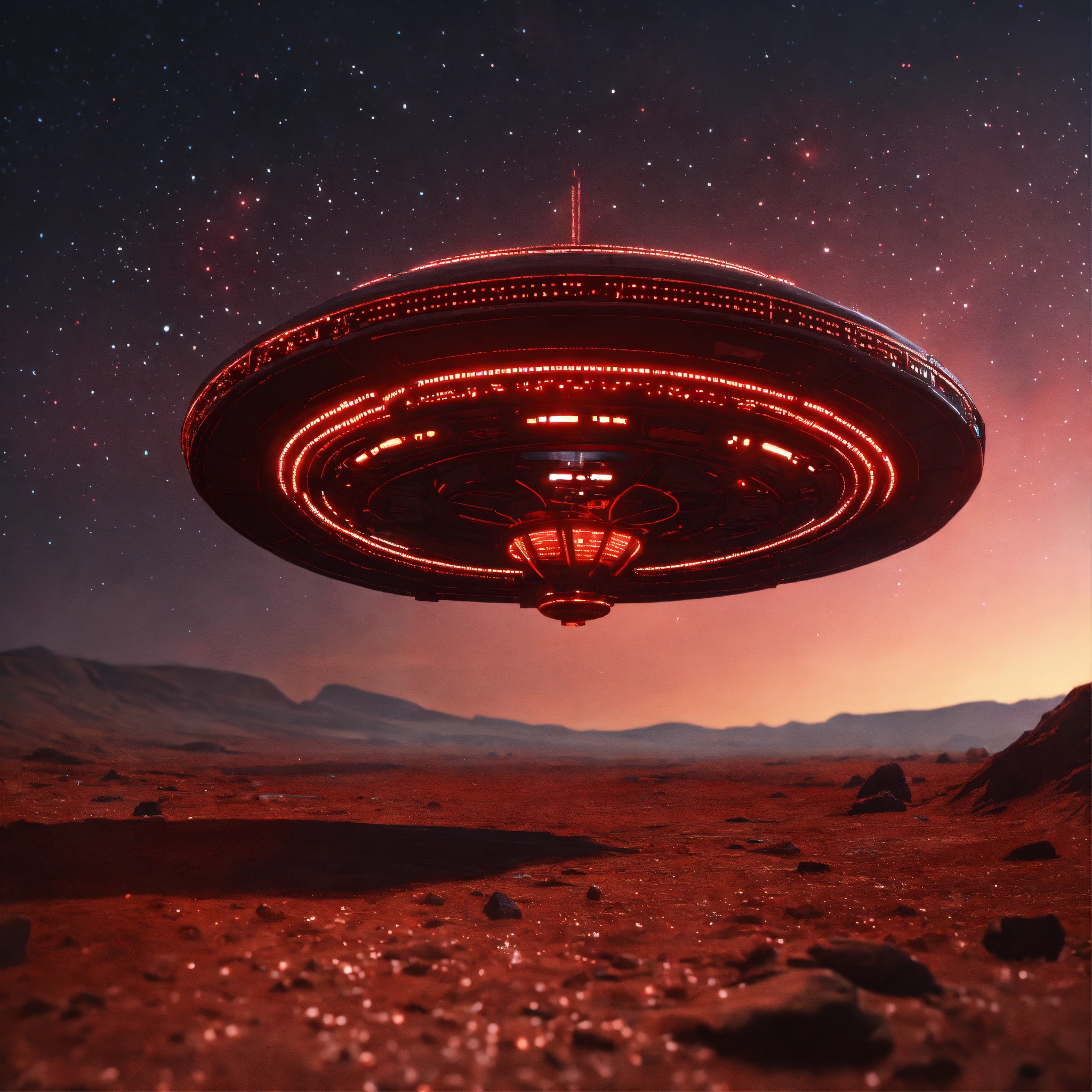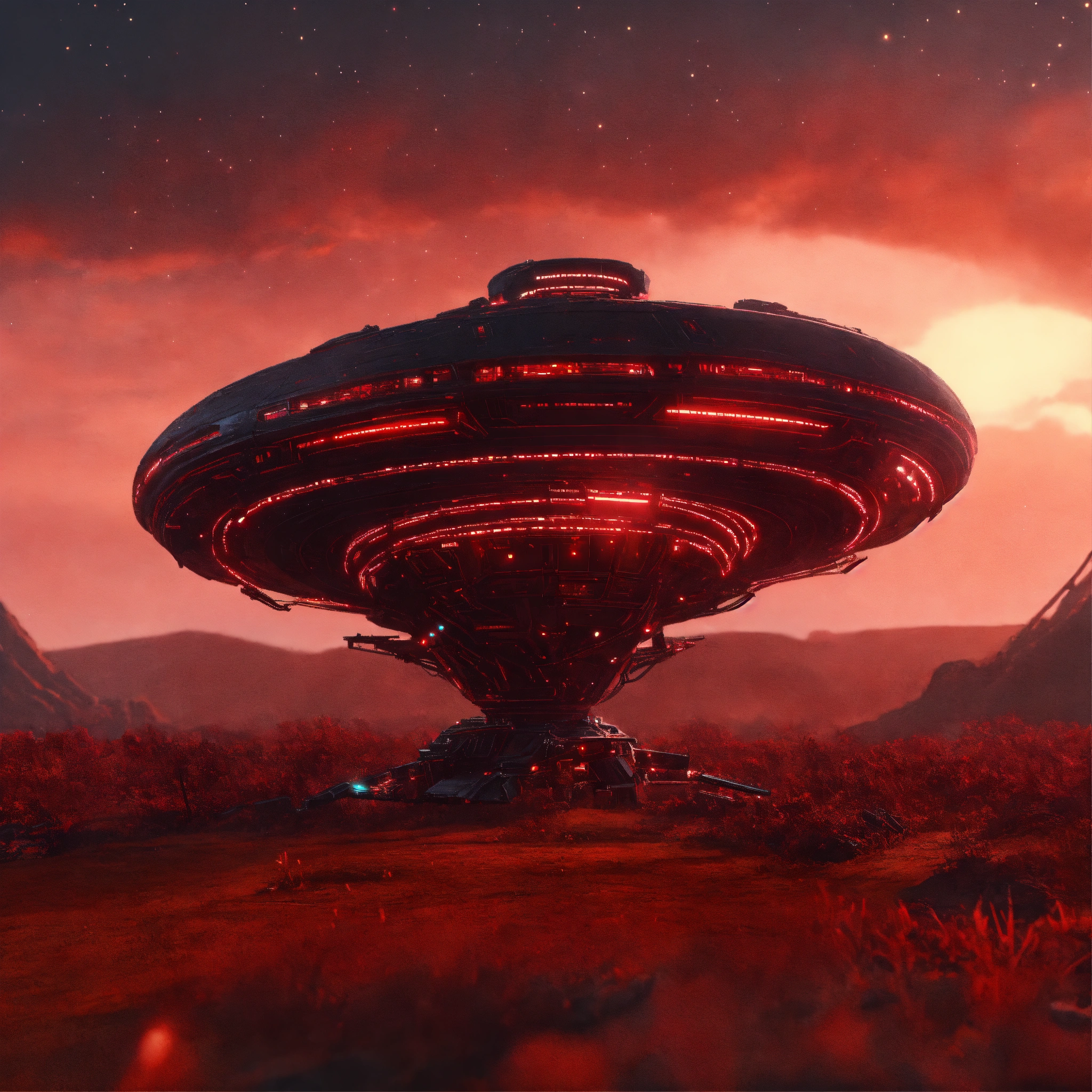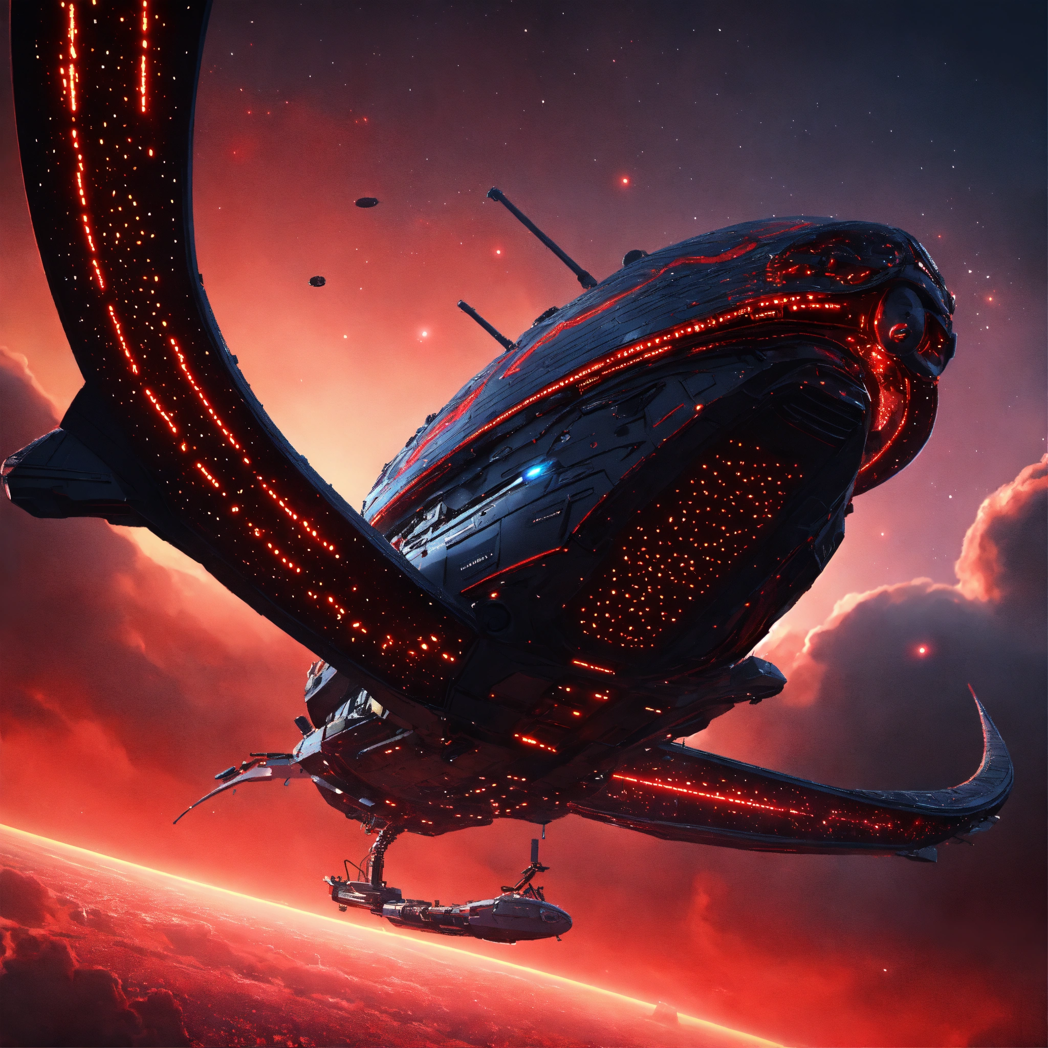 Long black worm like alien bio-robotic beam ship with red circuitry and markings appear in the sky from hyperspace, realistic, 8k, unreal engine, pixar