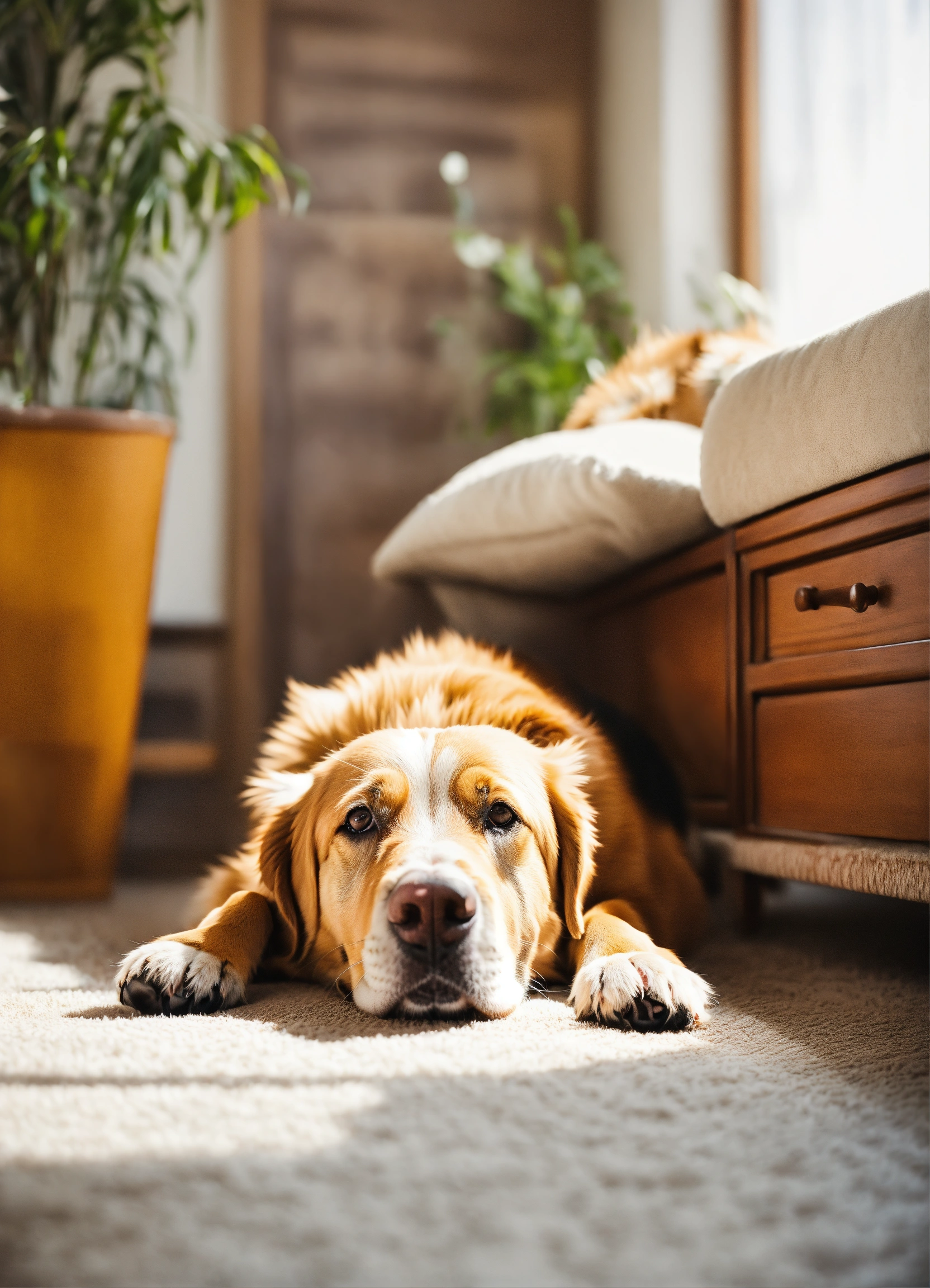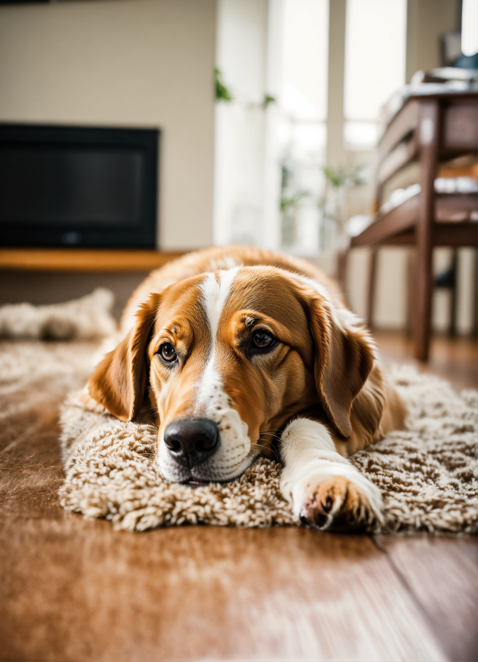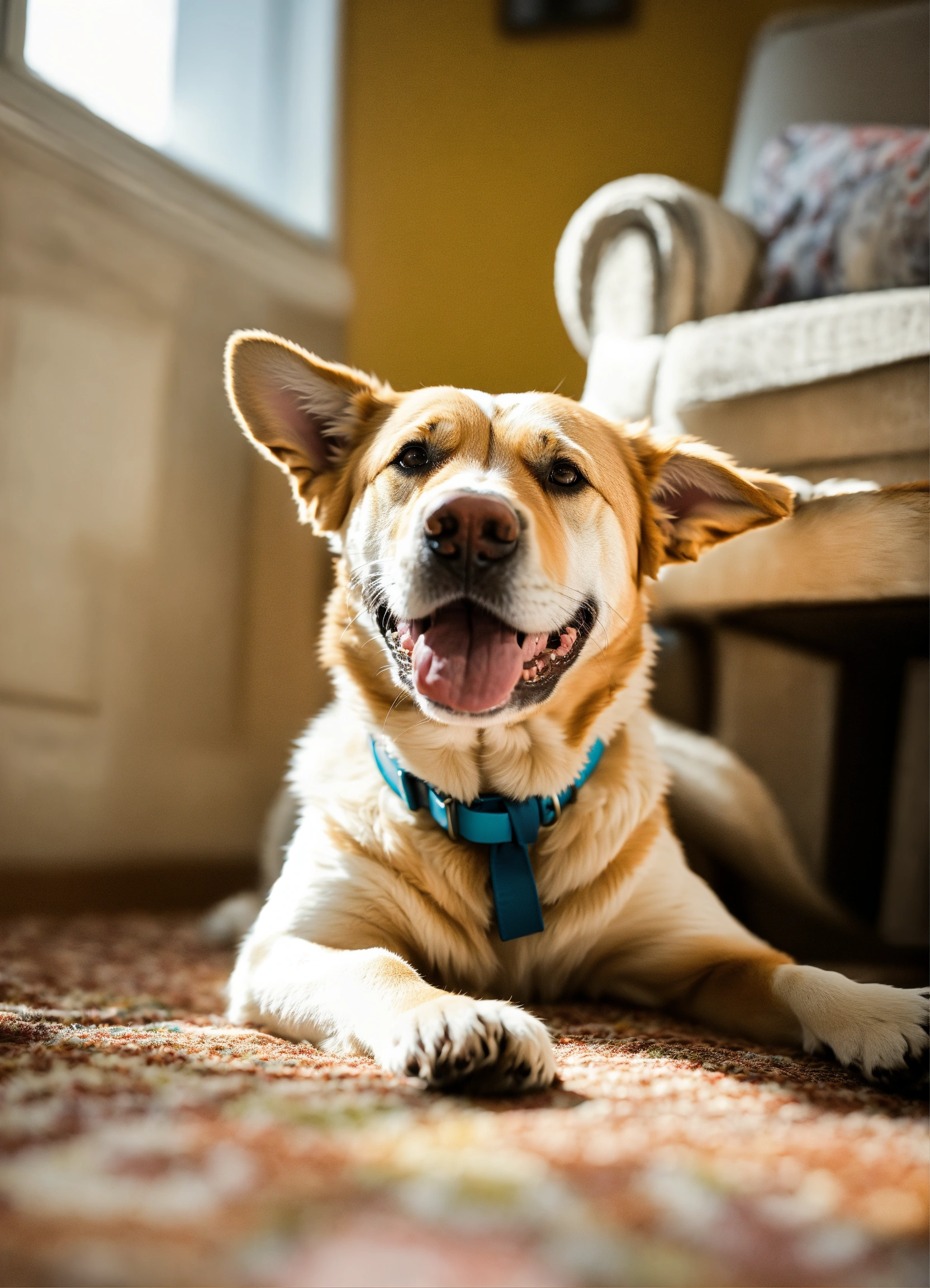 Happy dog lying on his back at home