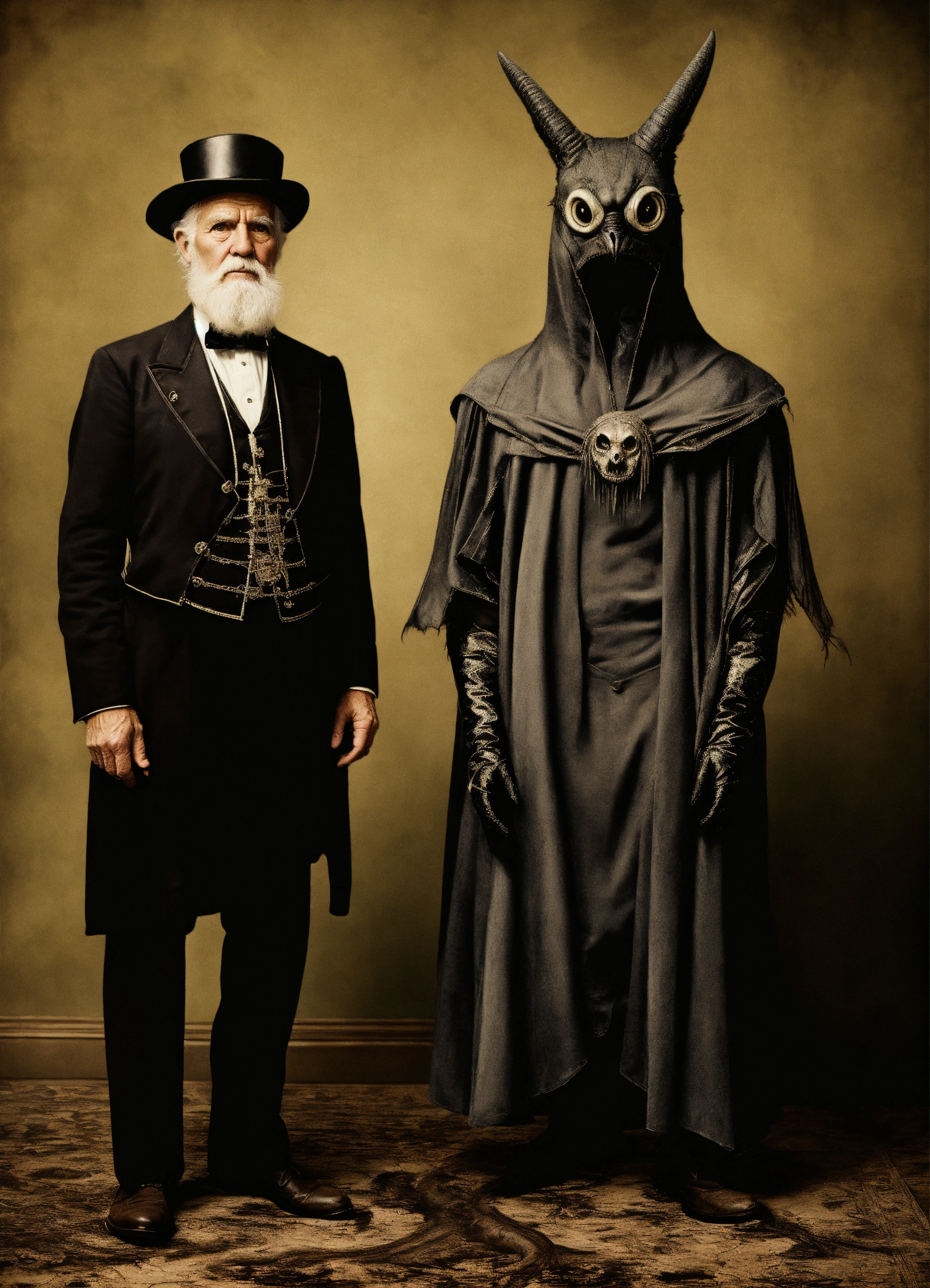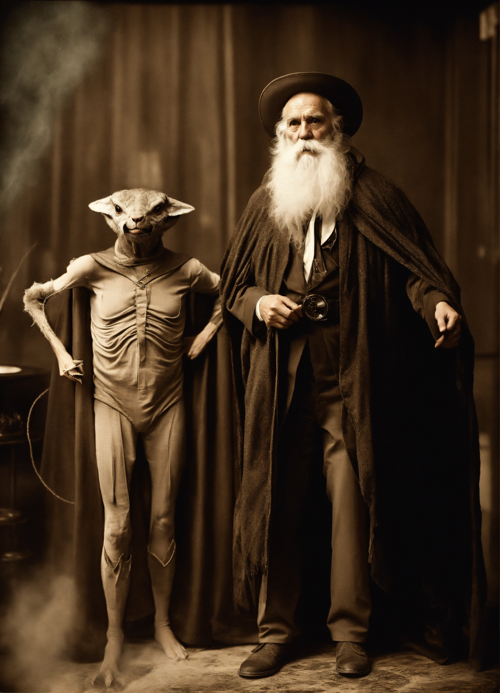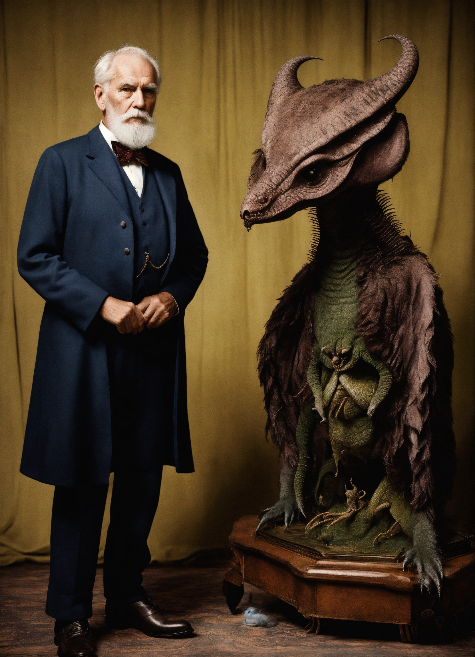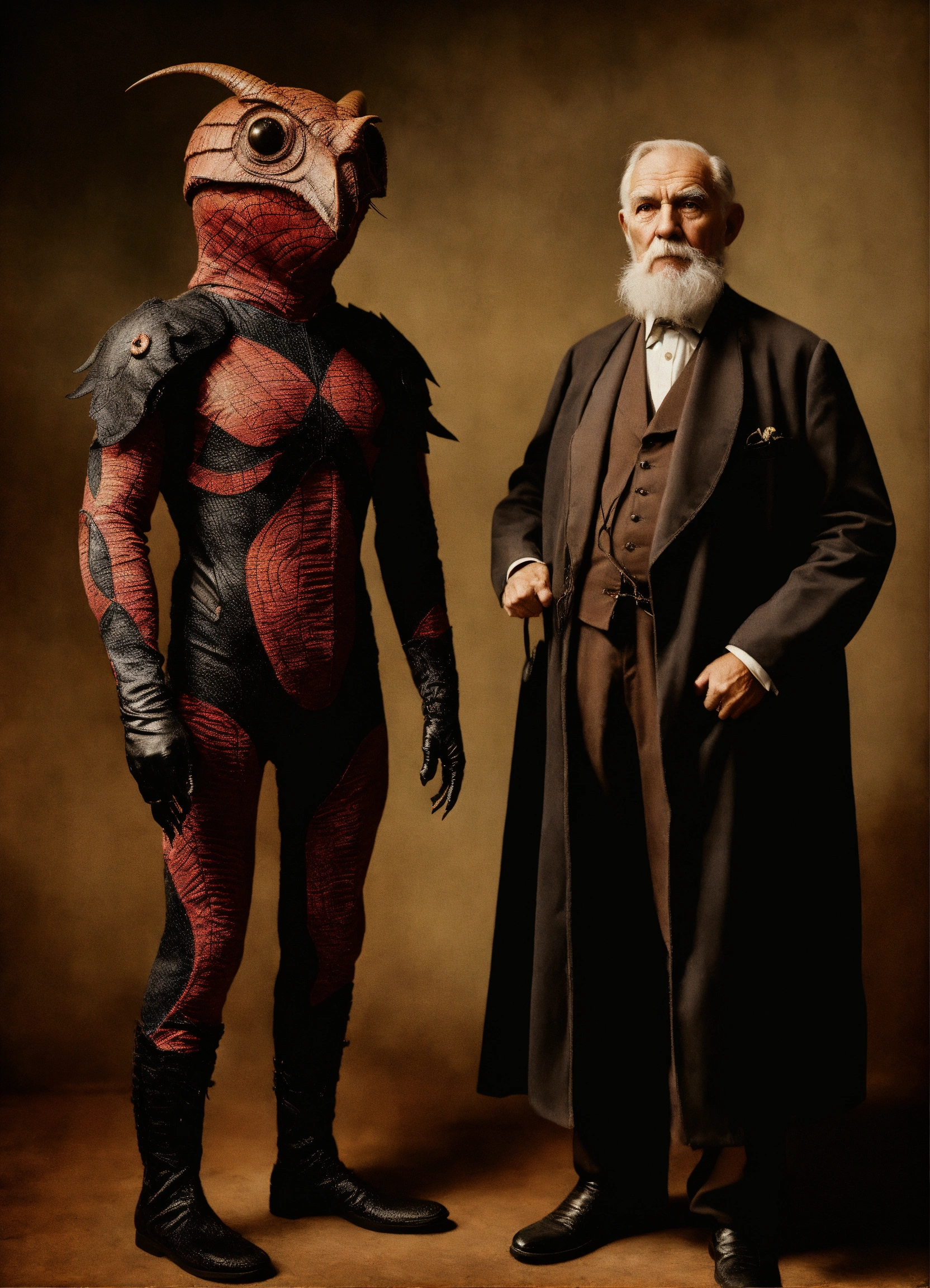 Old man wearing a superhero costume standing next to anstrange creature, in the style of contemporary vintage photography, necronomicon illustrations, tabletop photography, 1890, hyperrealistic animal portraits, ghostly presence, whirring contrivances