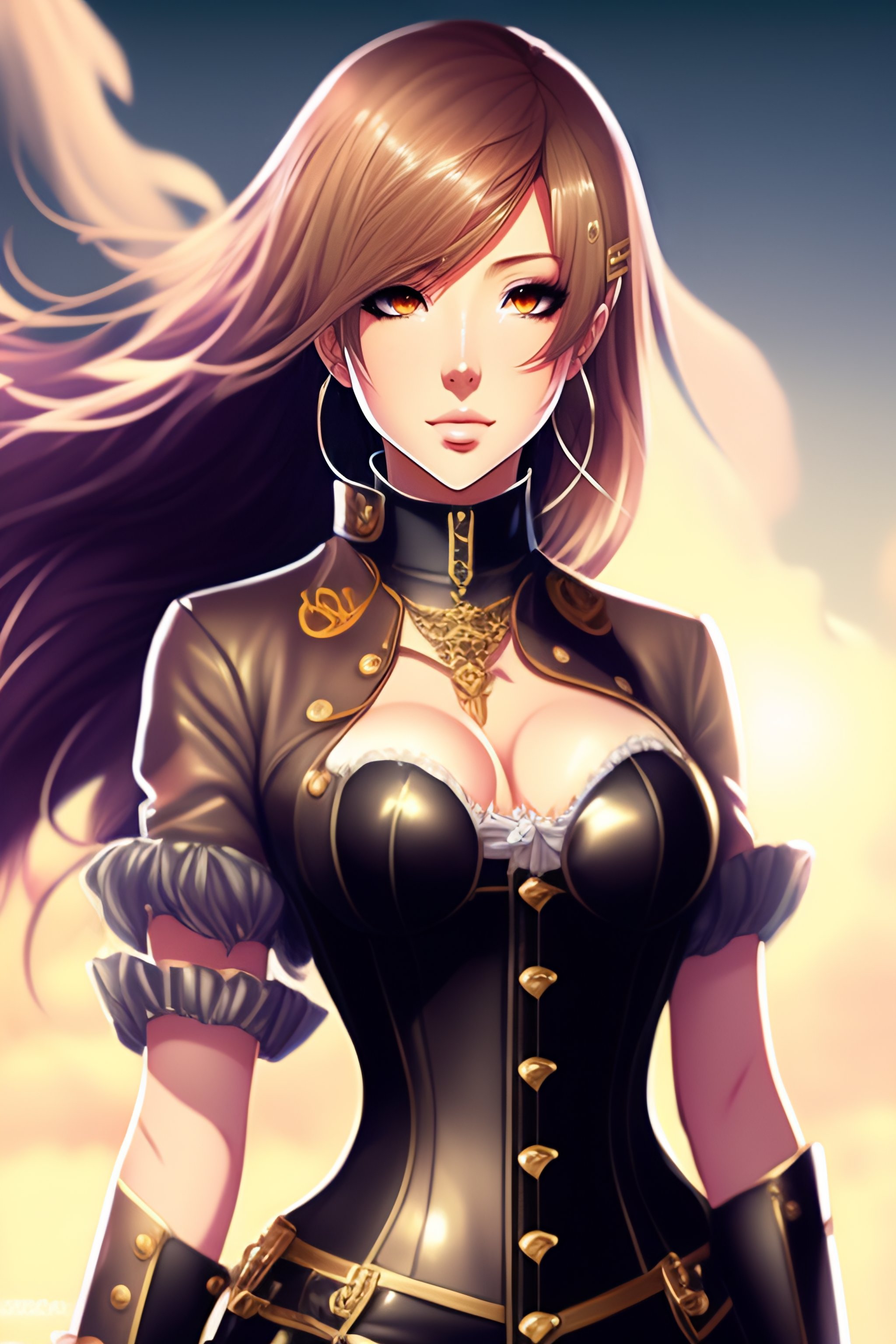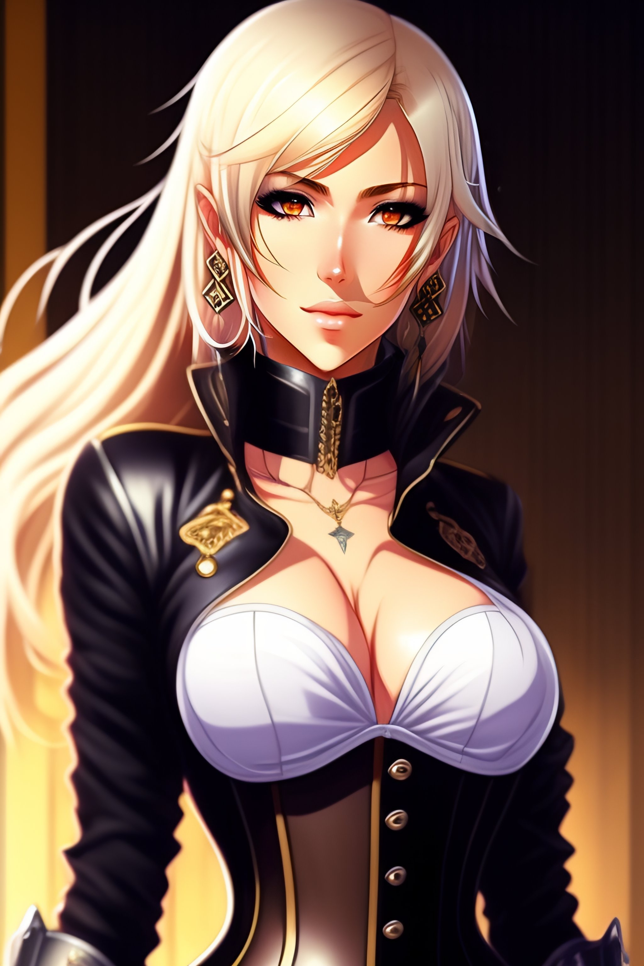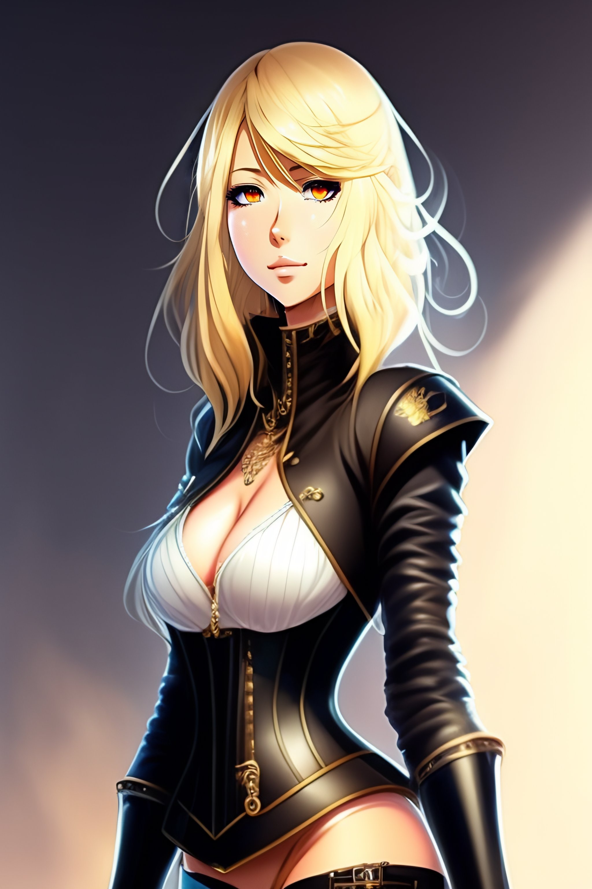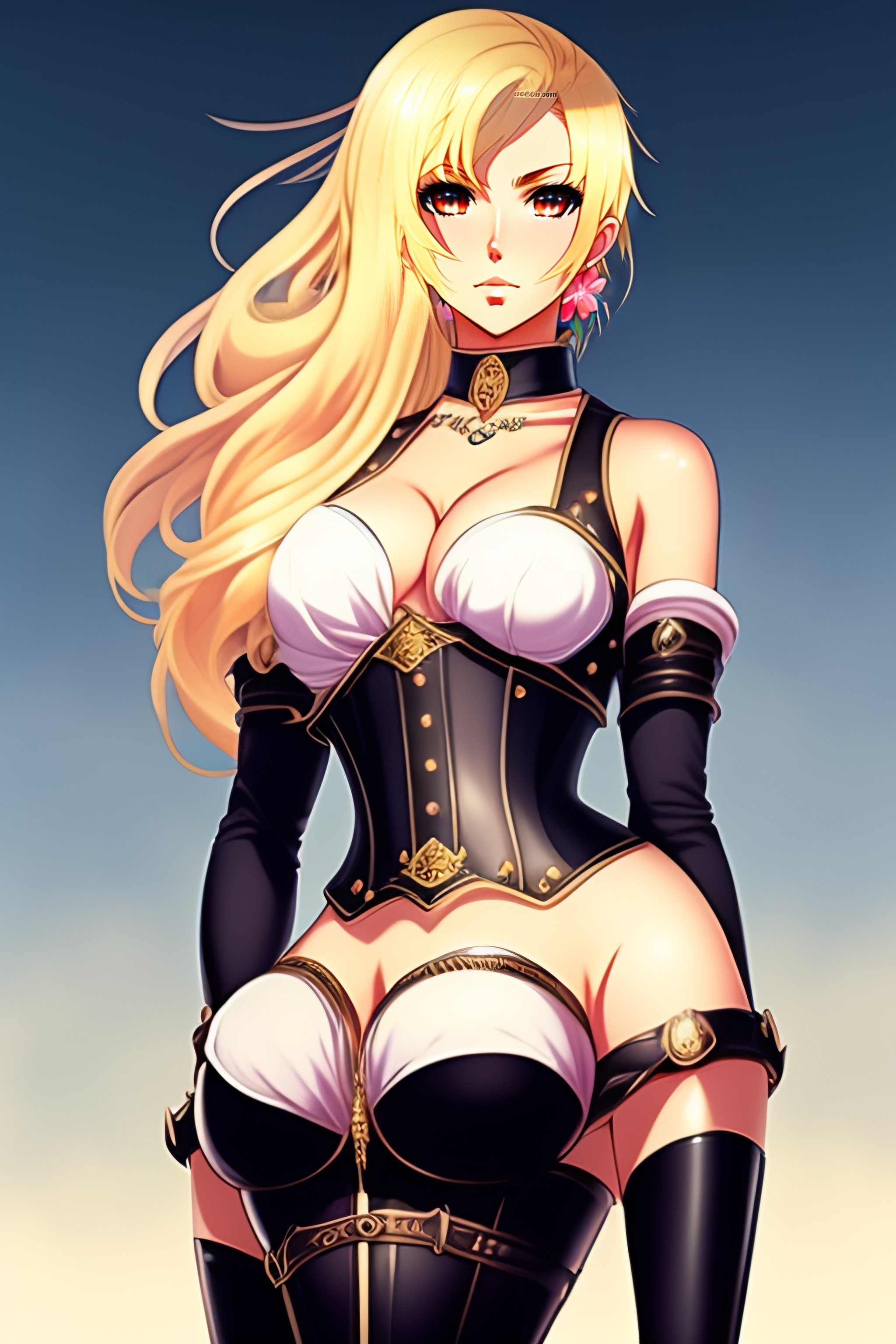 Anime drawing of a woman, full body, straight hair, short hair, leather corset, tall leather boots, blonde hair, very tall, short bob hairstyle